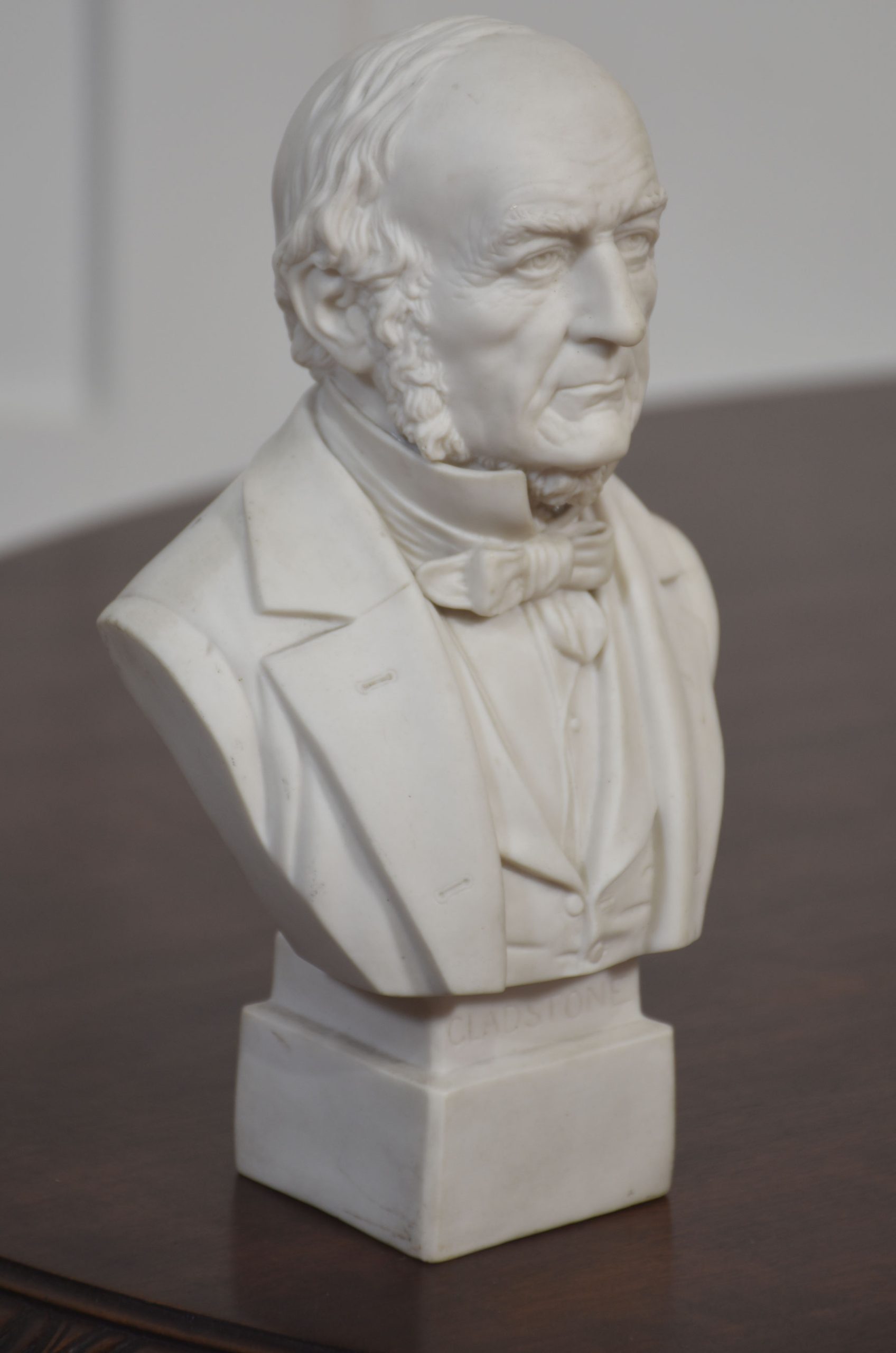 A finely modelled Parian bust depicting William Ewart Gladstone, shown in later life with a high forehead, deeply set eyes, and pronounced sideburns. The sitter is portrayed wearing a formal Victorian jacket, waistcoat, and bow tie, with crisp detailing to the costume and sensitive modelling of the facial features. The bust is raised on an integral square Parian socle, the front inscribed “GLADSTONE.”