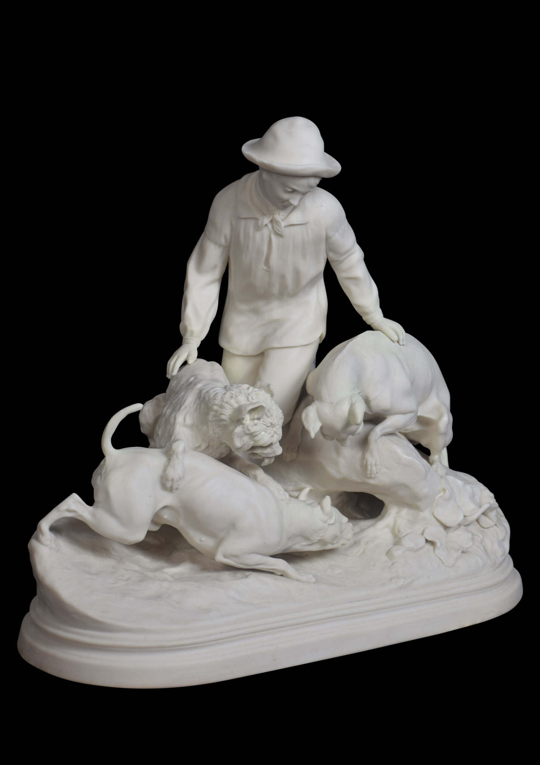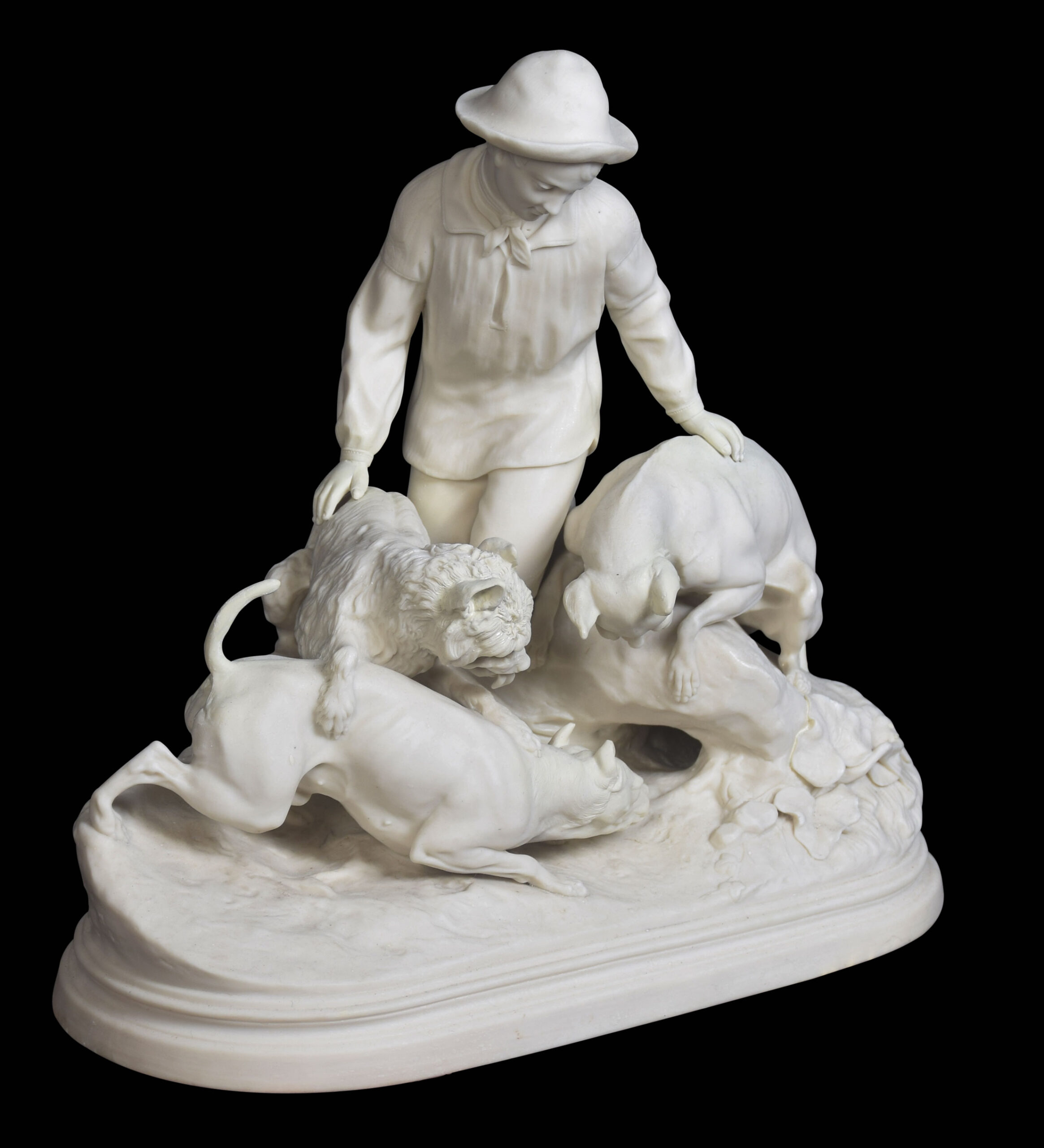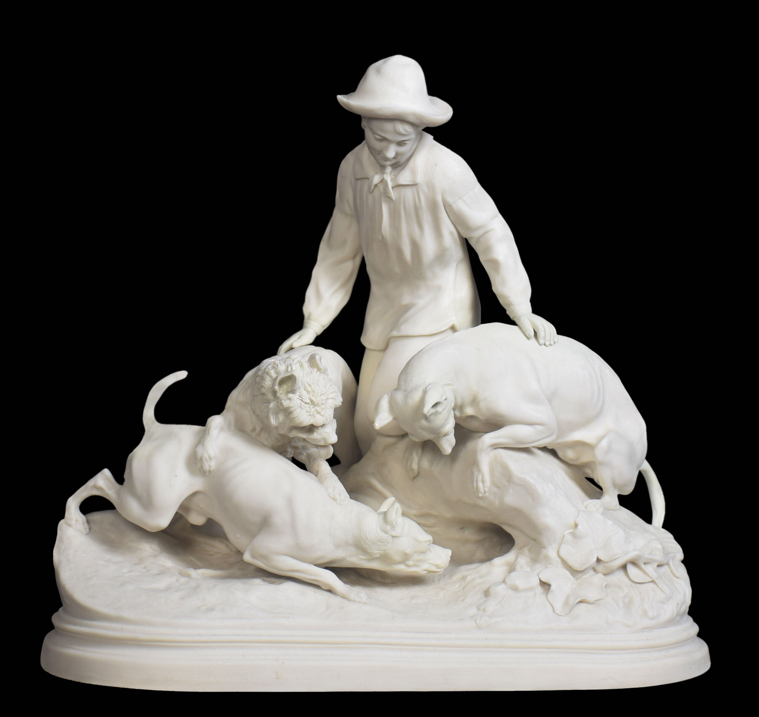 Parian group of a hunting scene depicting a man kneeling on a fallen tree with his dogs looking at a burrow.