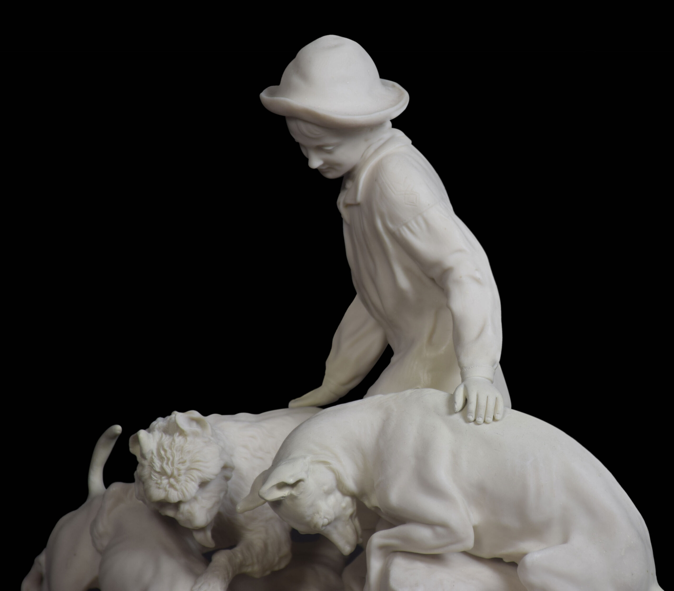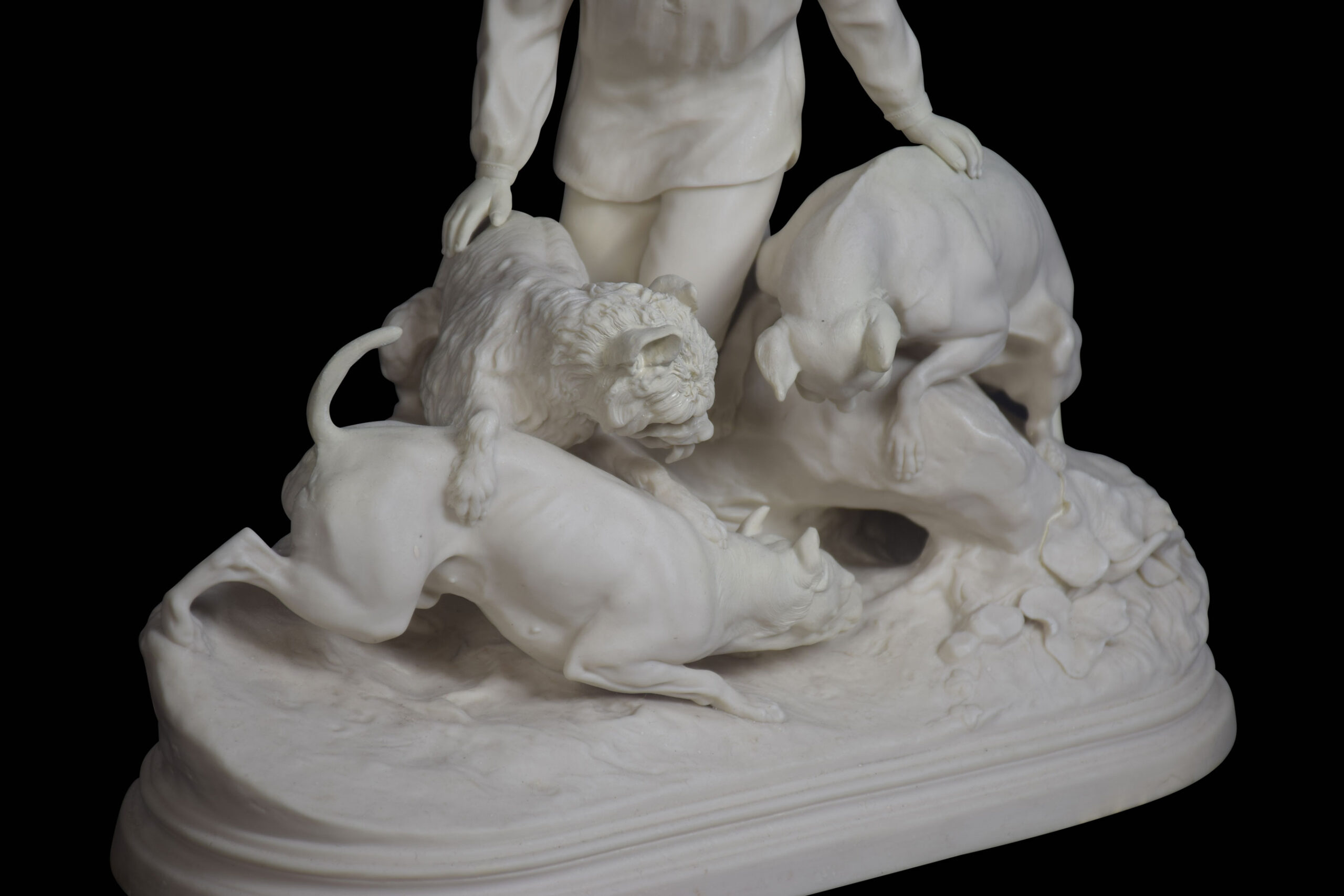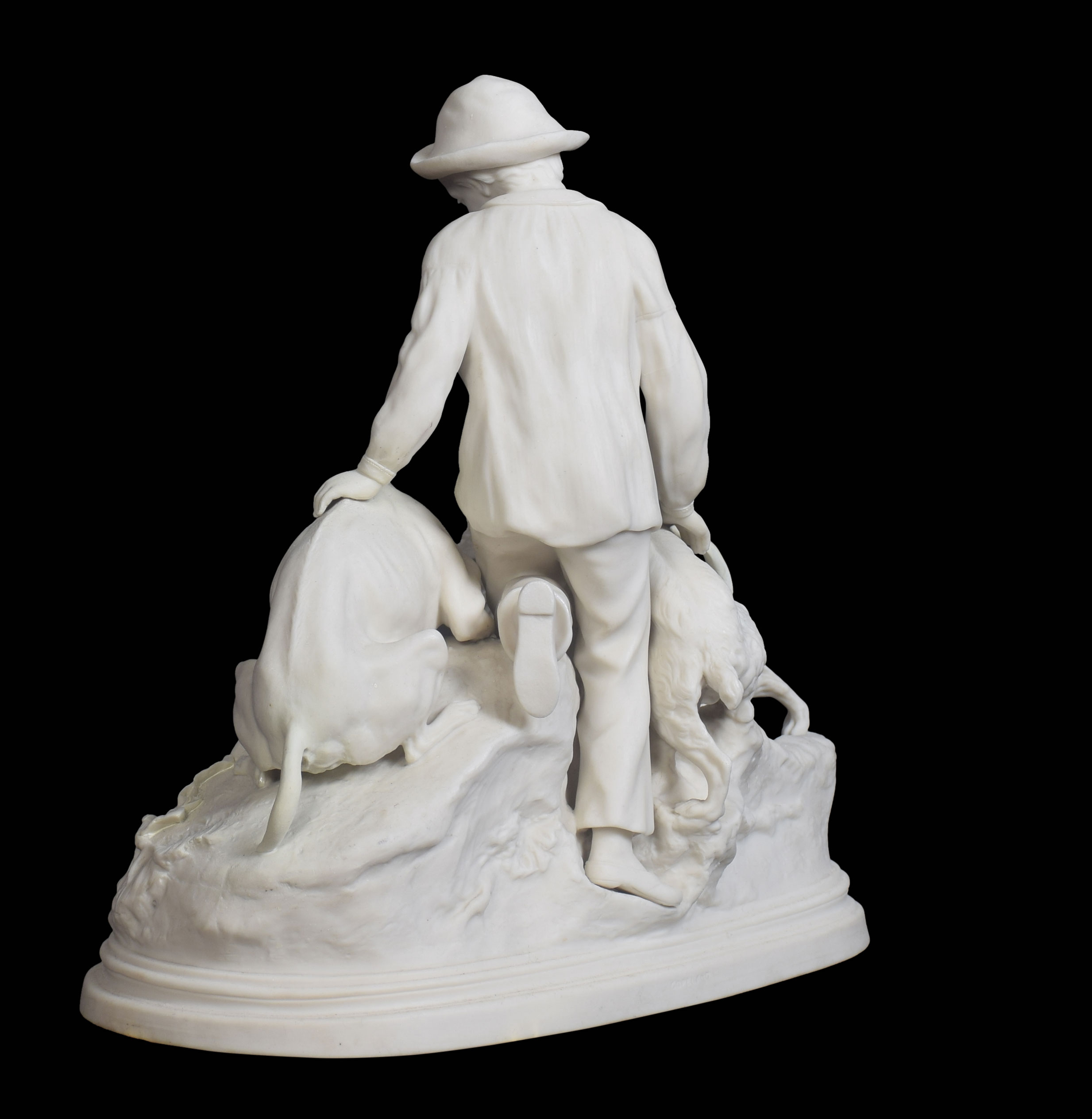 Parian group of a hunting scene depicting a man kneeling on a fallen tree with his dogs looking at a burrow.