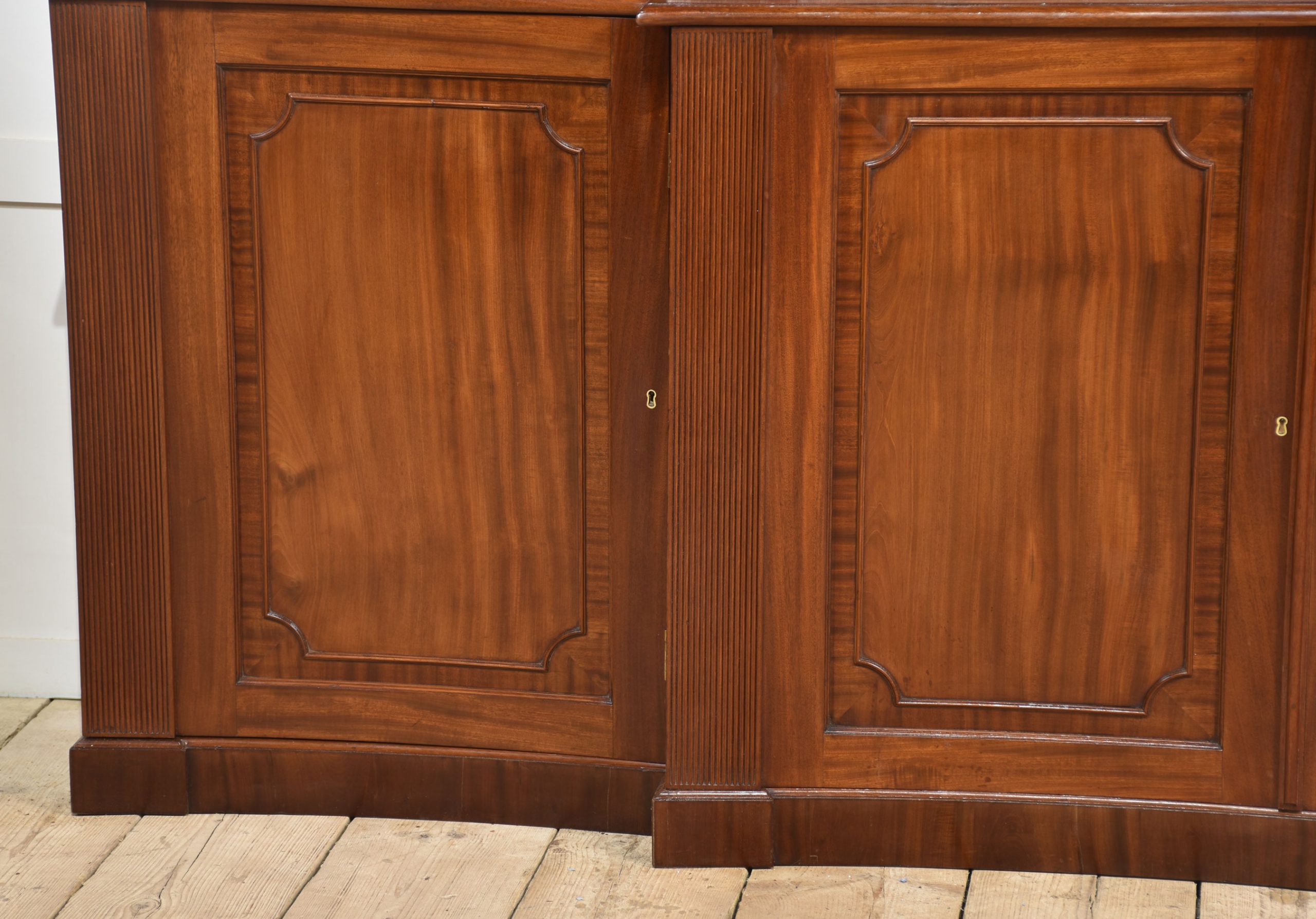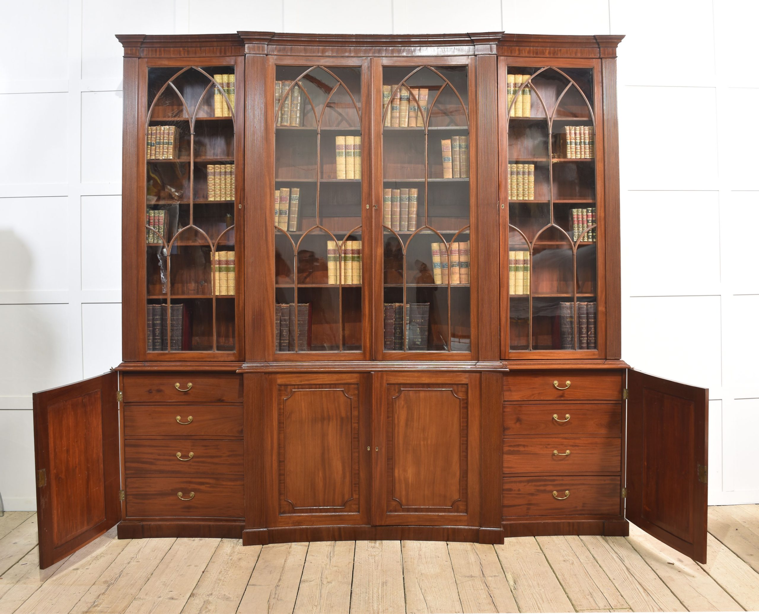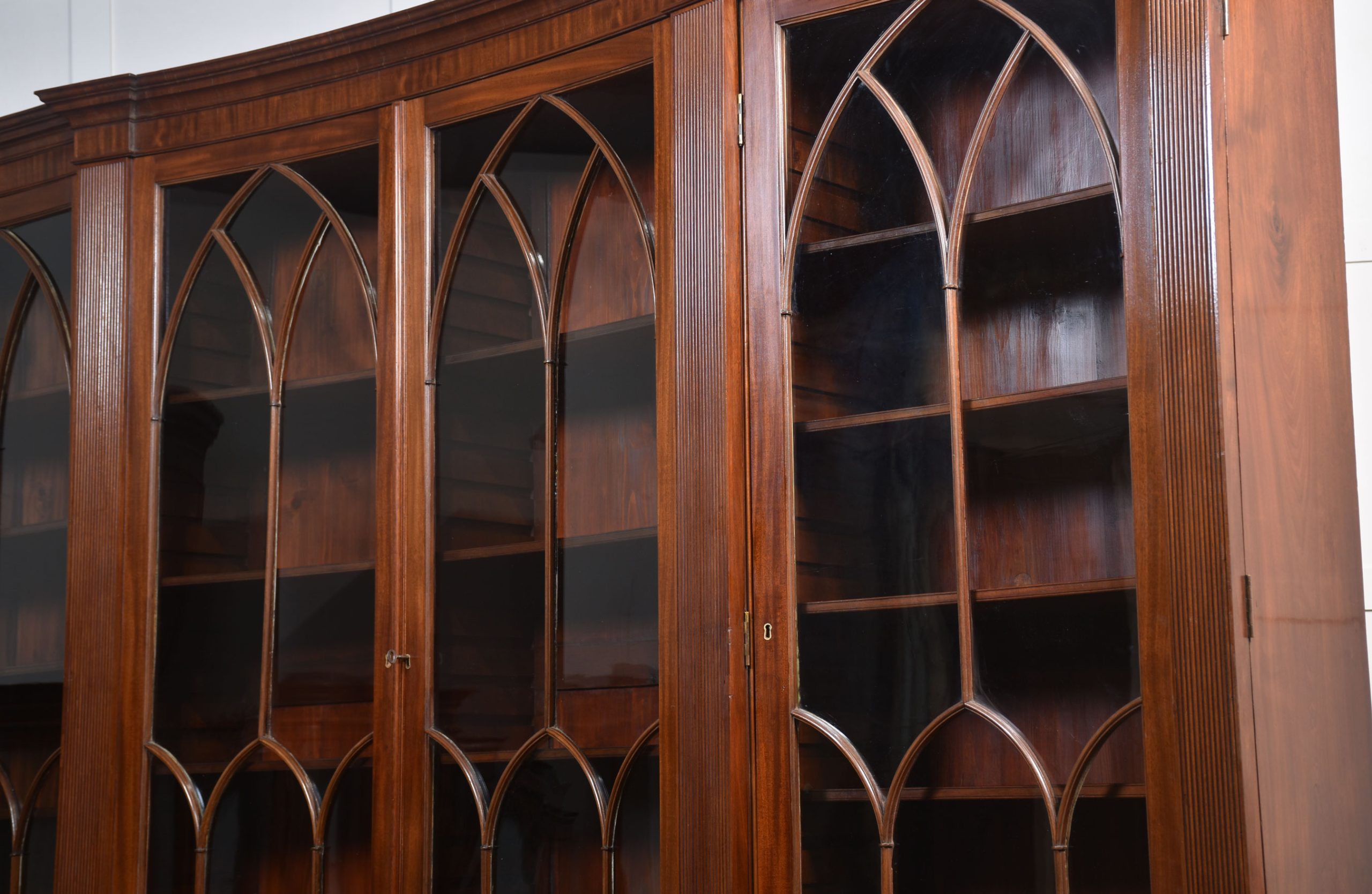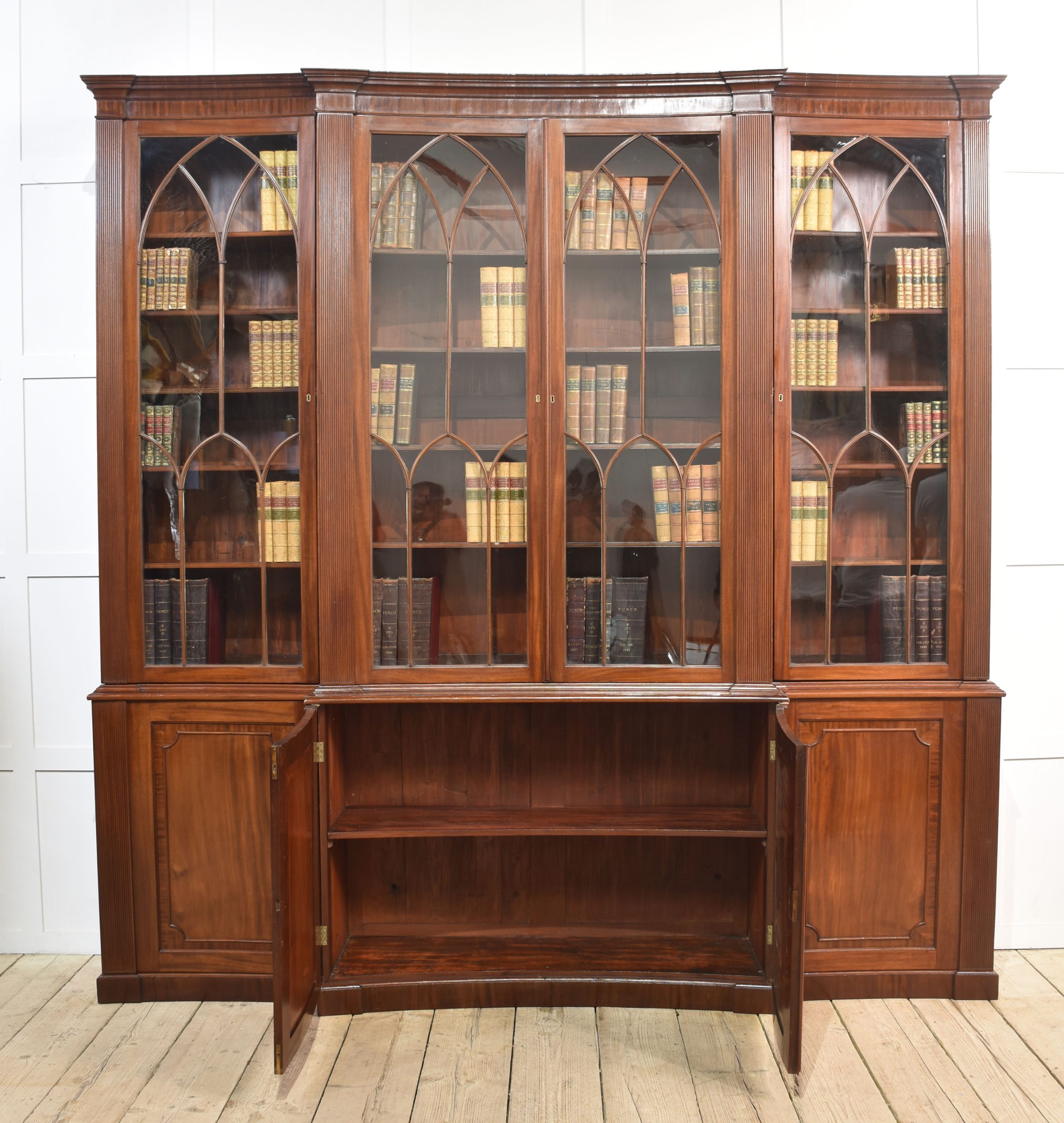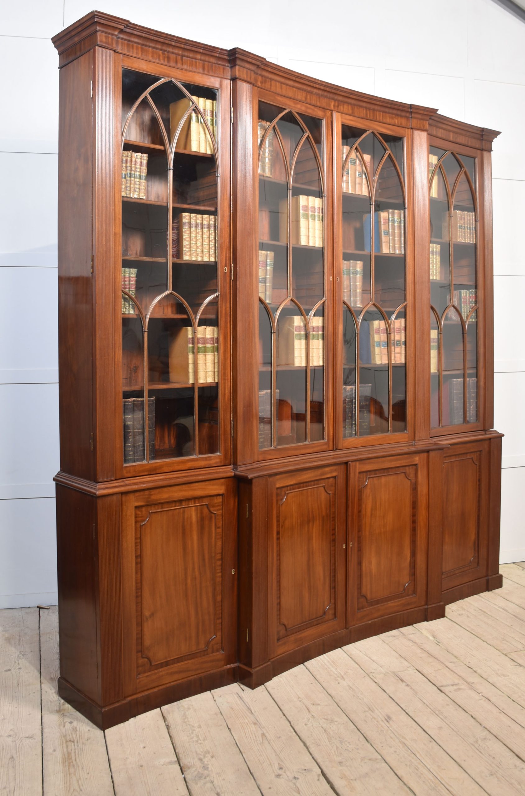 Mahogany breakfront library bookcase, the concaved moulded cornice, above four large curved astragal glazed doors opening to reveal an adjustable shelved interior flanked by reeded columns. The base section is fitted with central panelled doors opening to reveal a large cupboard. Flanked by further panelled doors opening to reveal four graduated drawers. All raised on a plinth base.