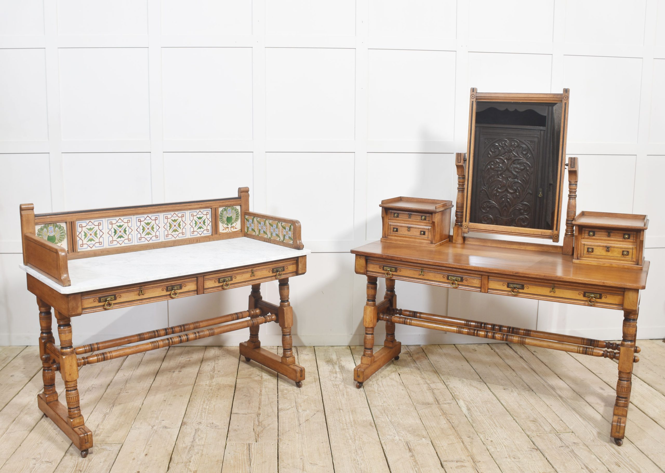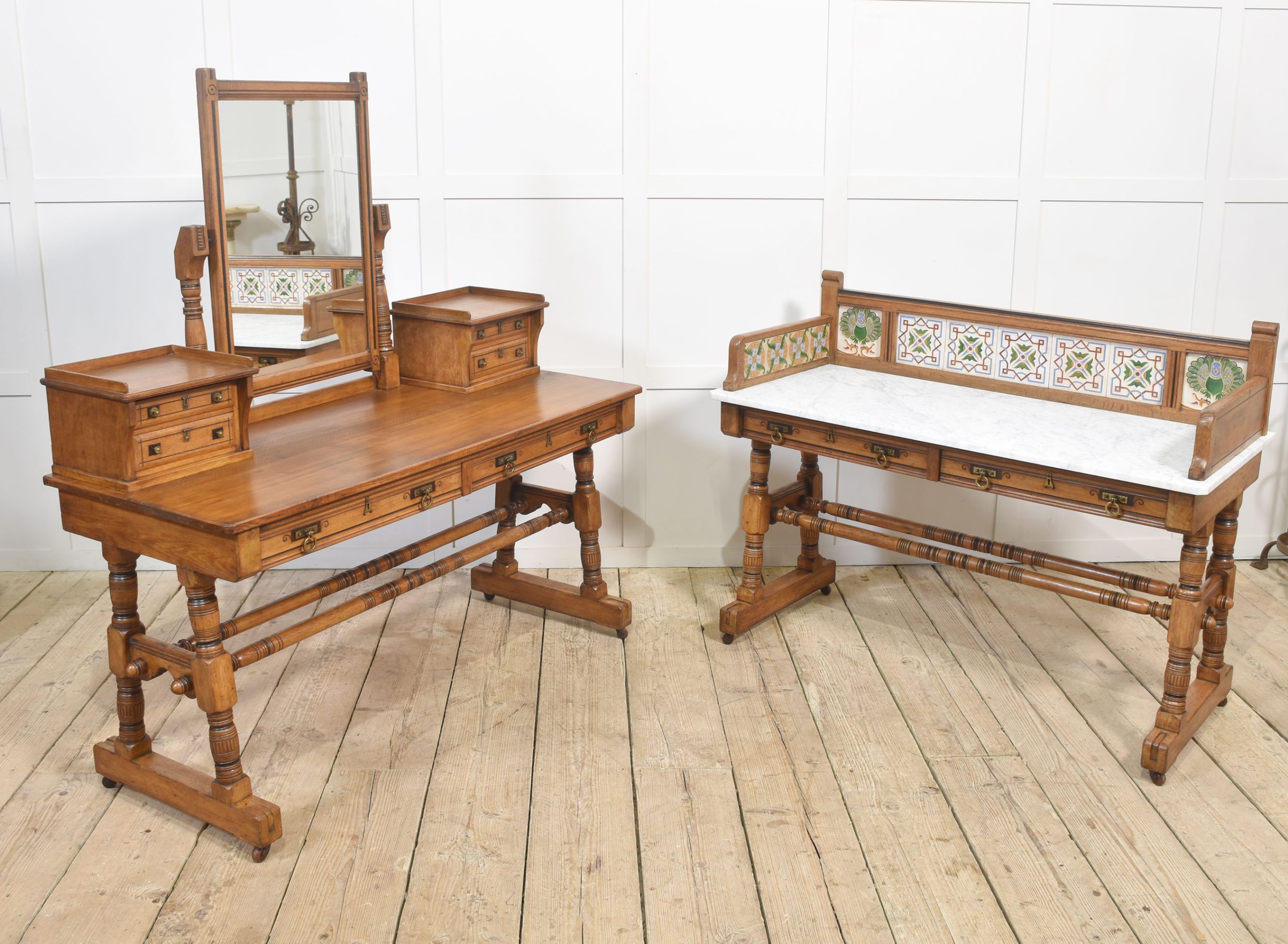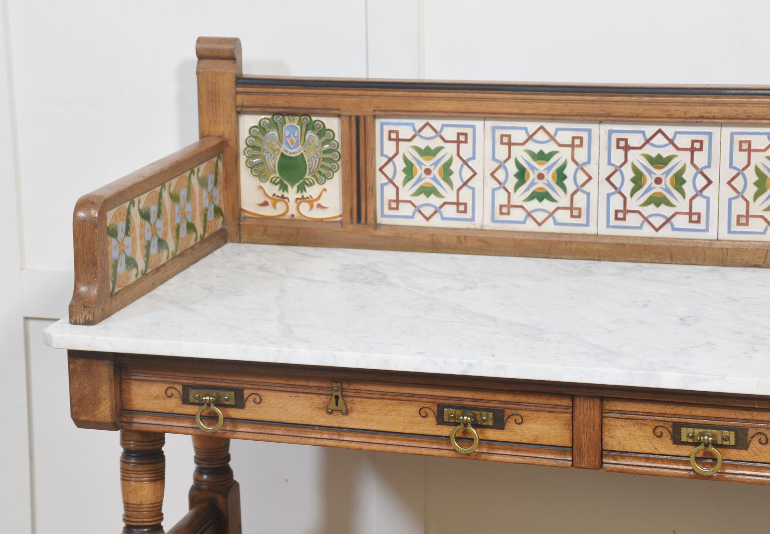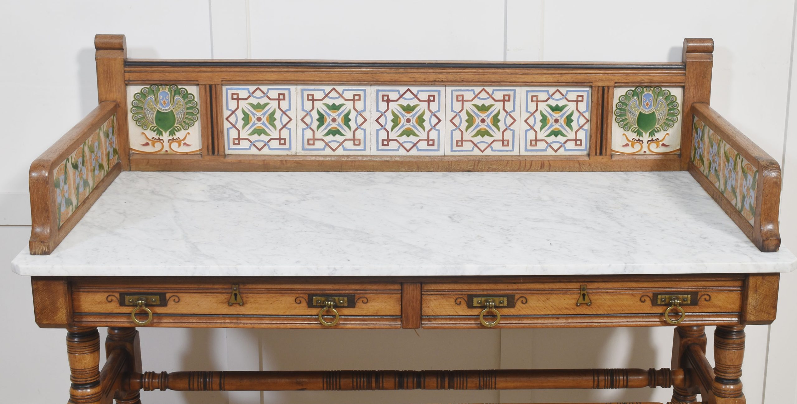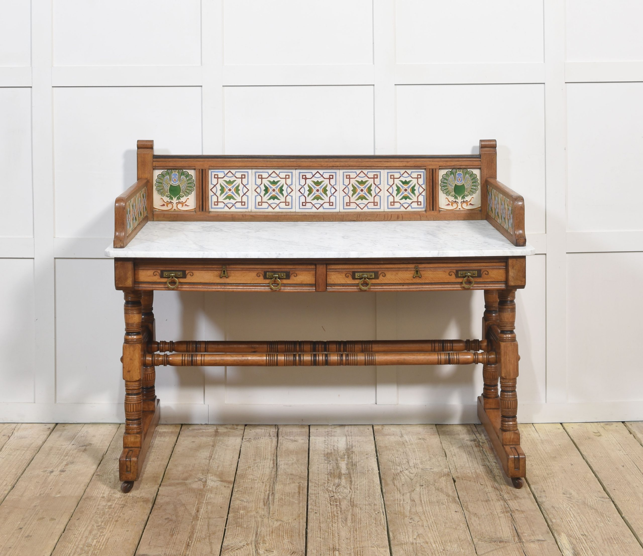 Oak washstand, the raised gallery with inset tiles by Maw and Co, to the rectangular marble top above two long freeze drawers with stylised brass handles. All raised on four turned supports united by stretchers terminating in castors.