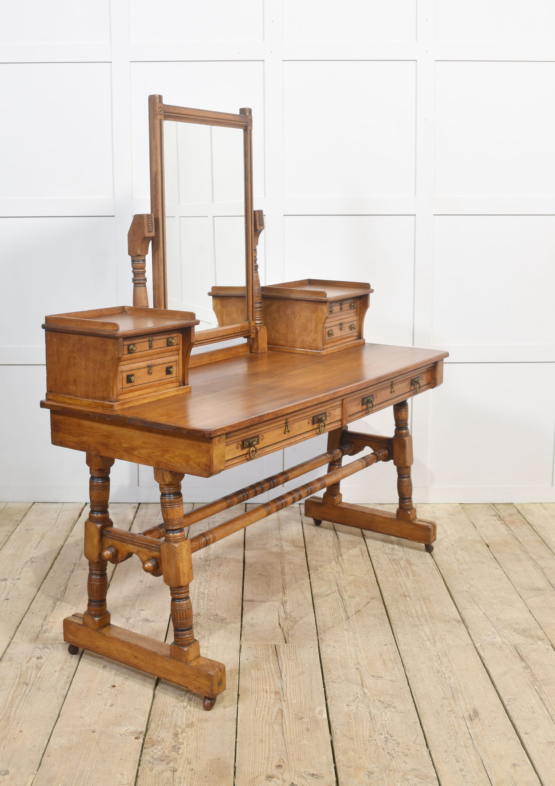 Oak dressing table, the central adjustable mirror supported on architectural supports above two banks of drawers. To the rectangular top above two long freeze drawers with stylised brass handles. All raised on four turned supports united by stretchers terminating in castors.