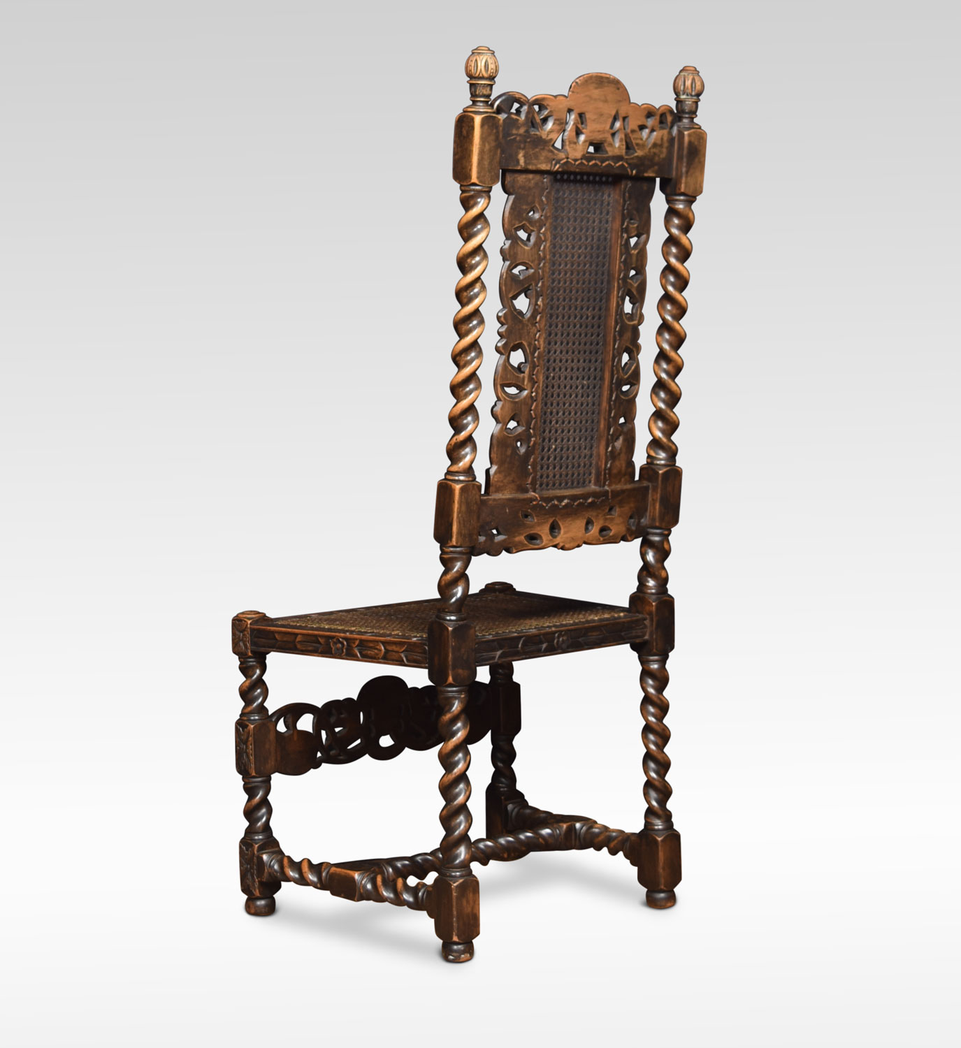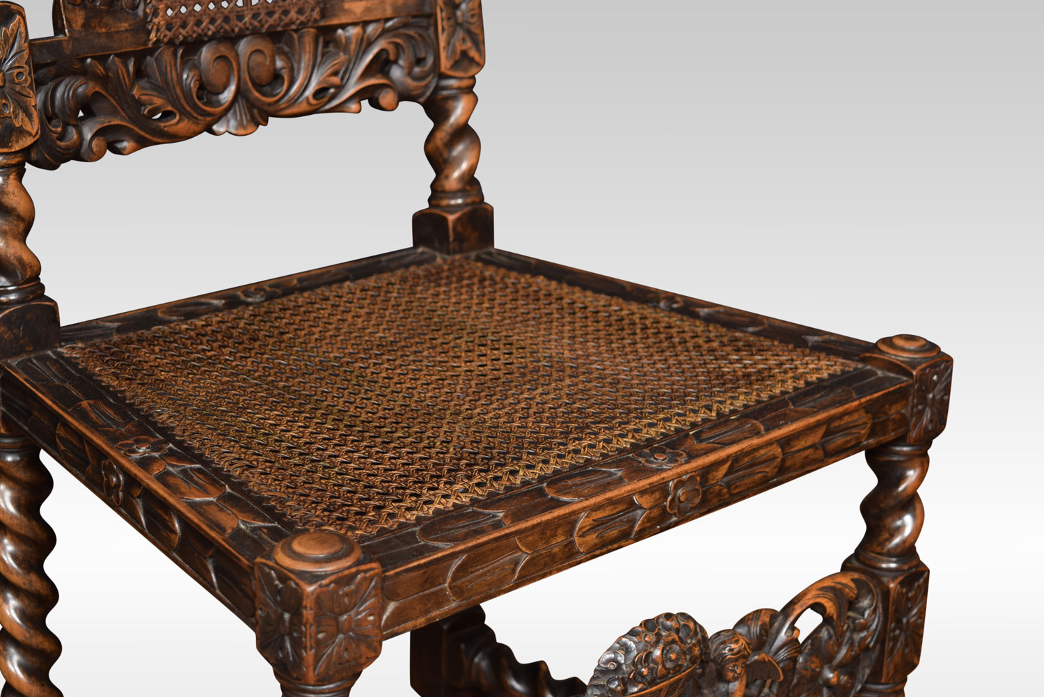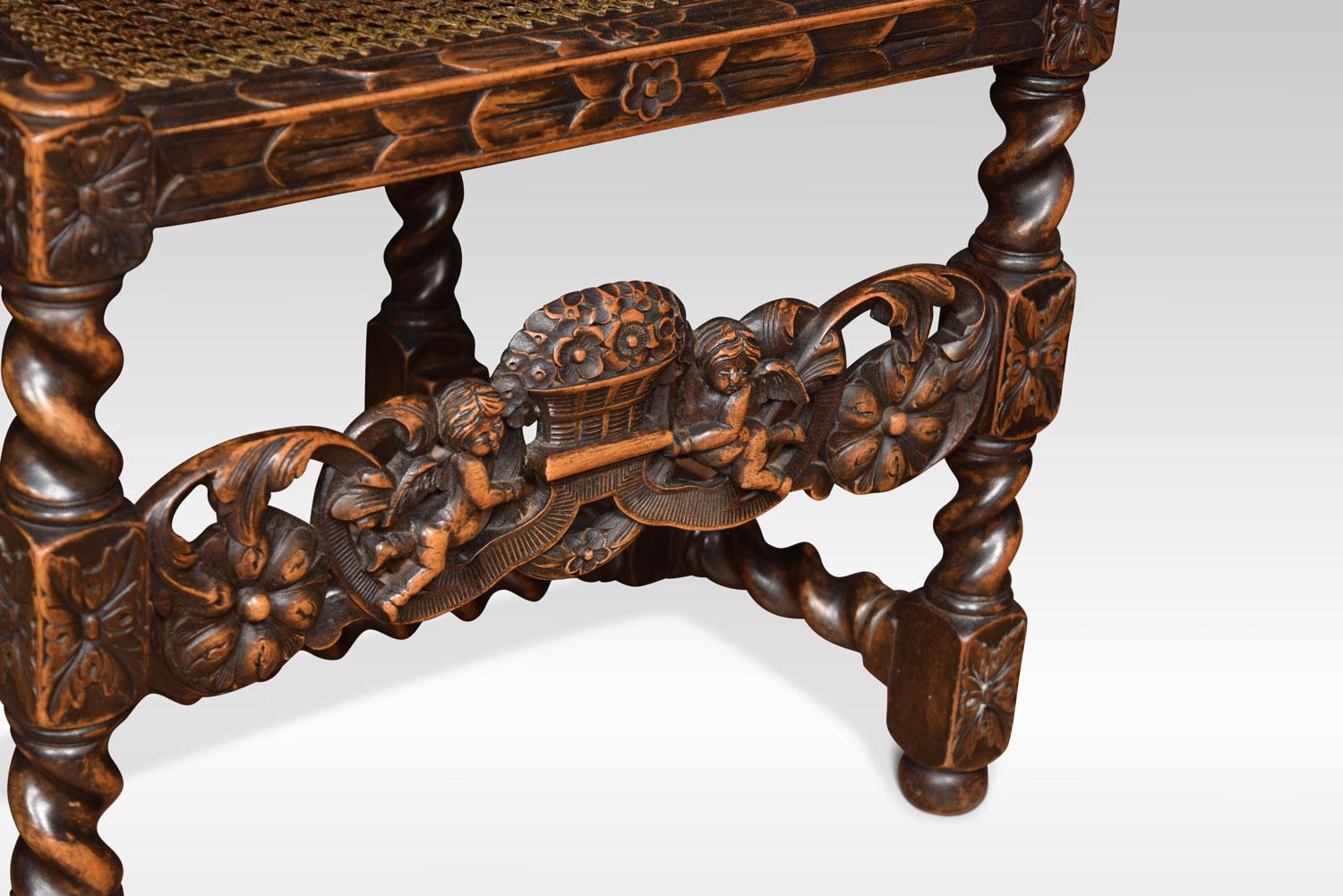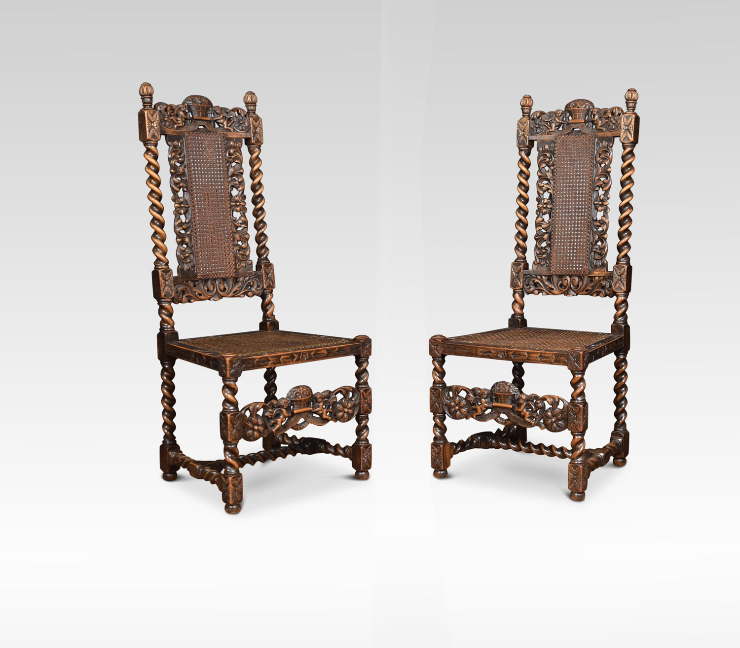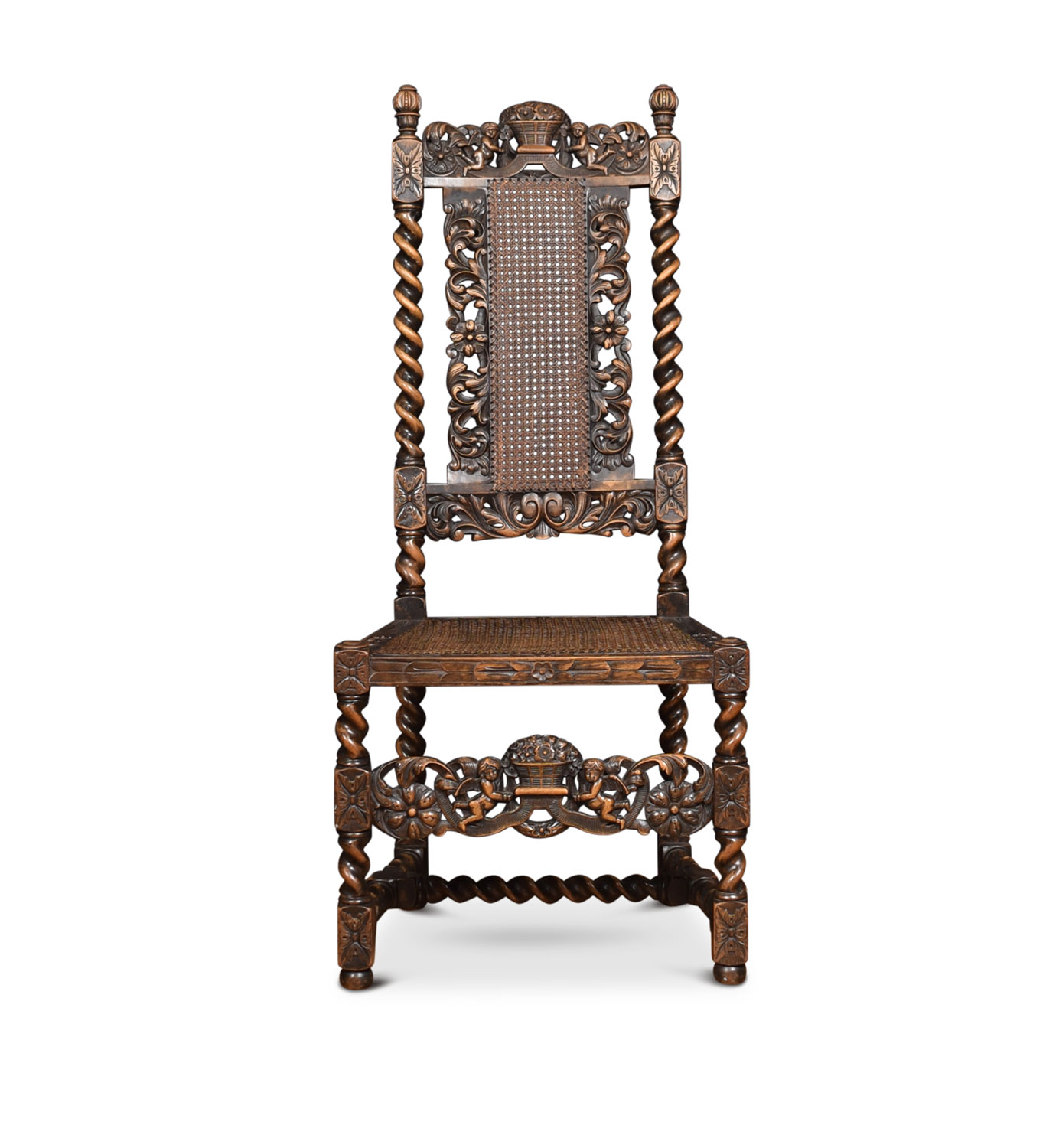 Set of four 17th century-style oak chairs, the high backs with caned panel surmounted by crest rails carved with flowers in a basket, the turned uprights above caned seats within carved foliate rails on barley twist legs, linked by a conforming carved stretcher with similar flowers and cherubs.