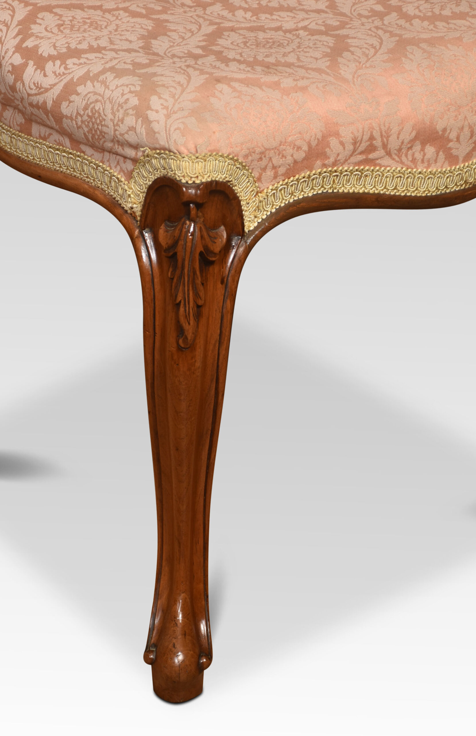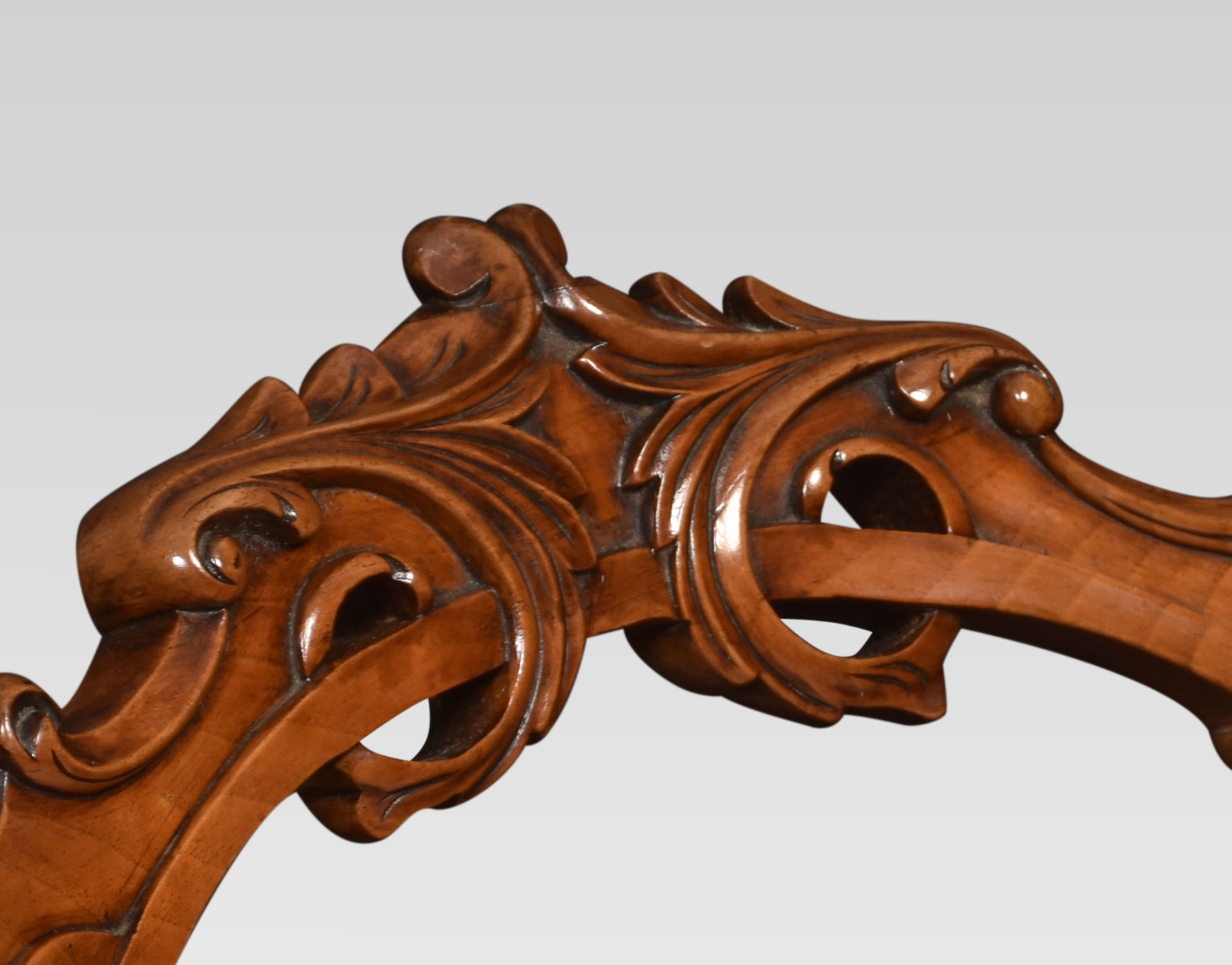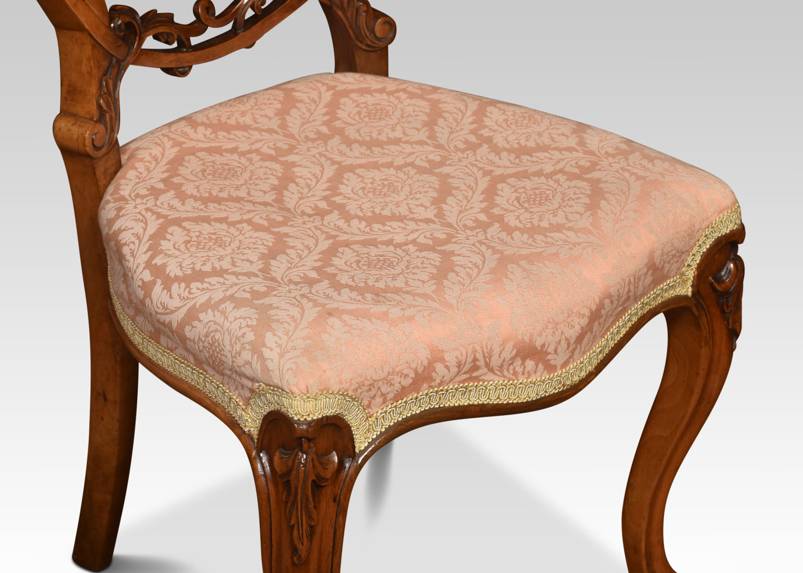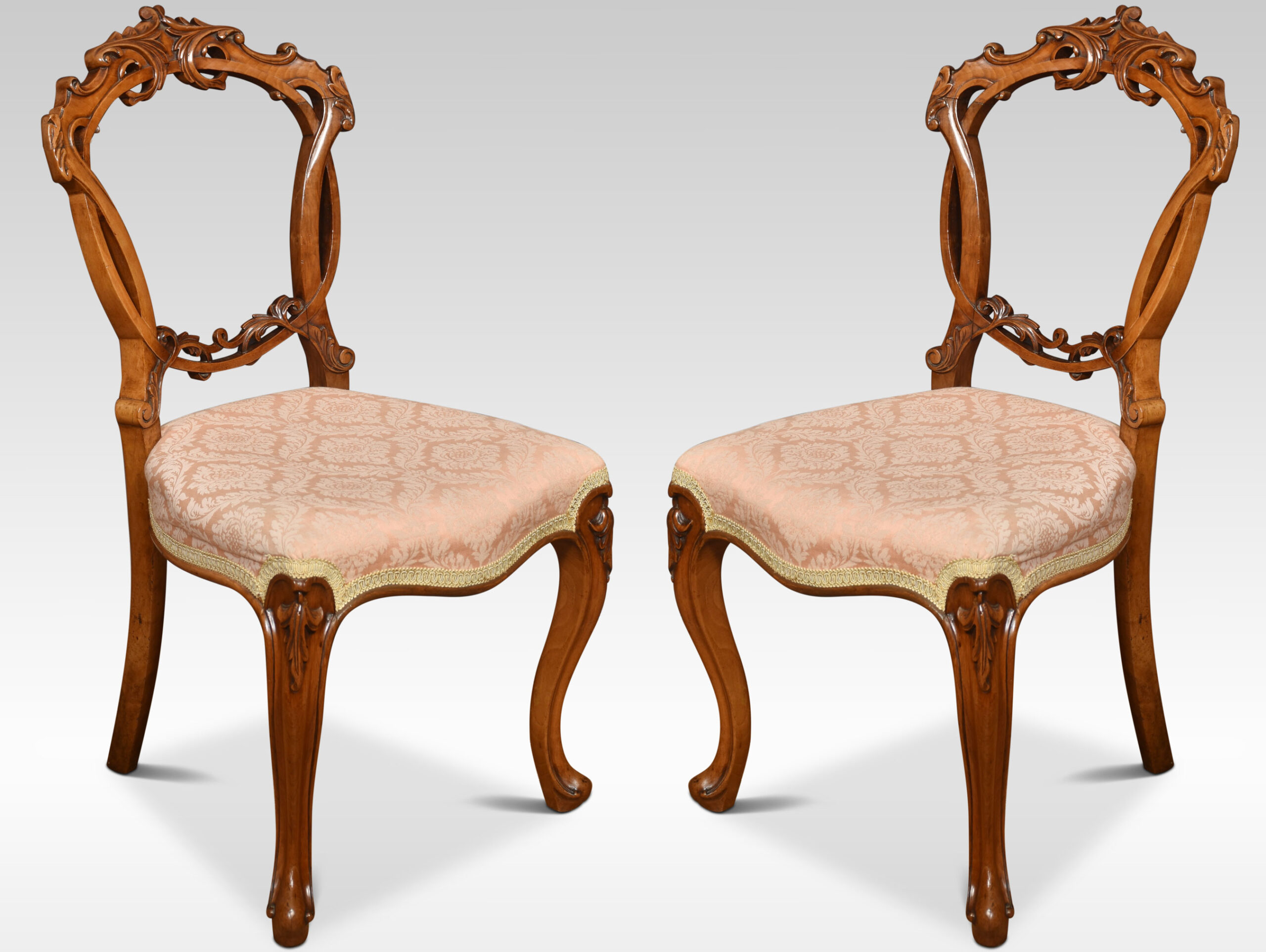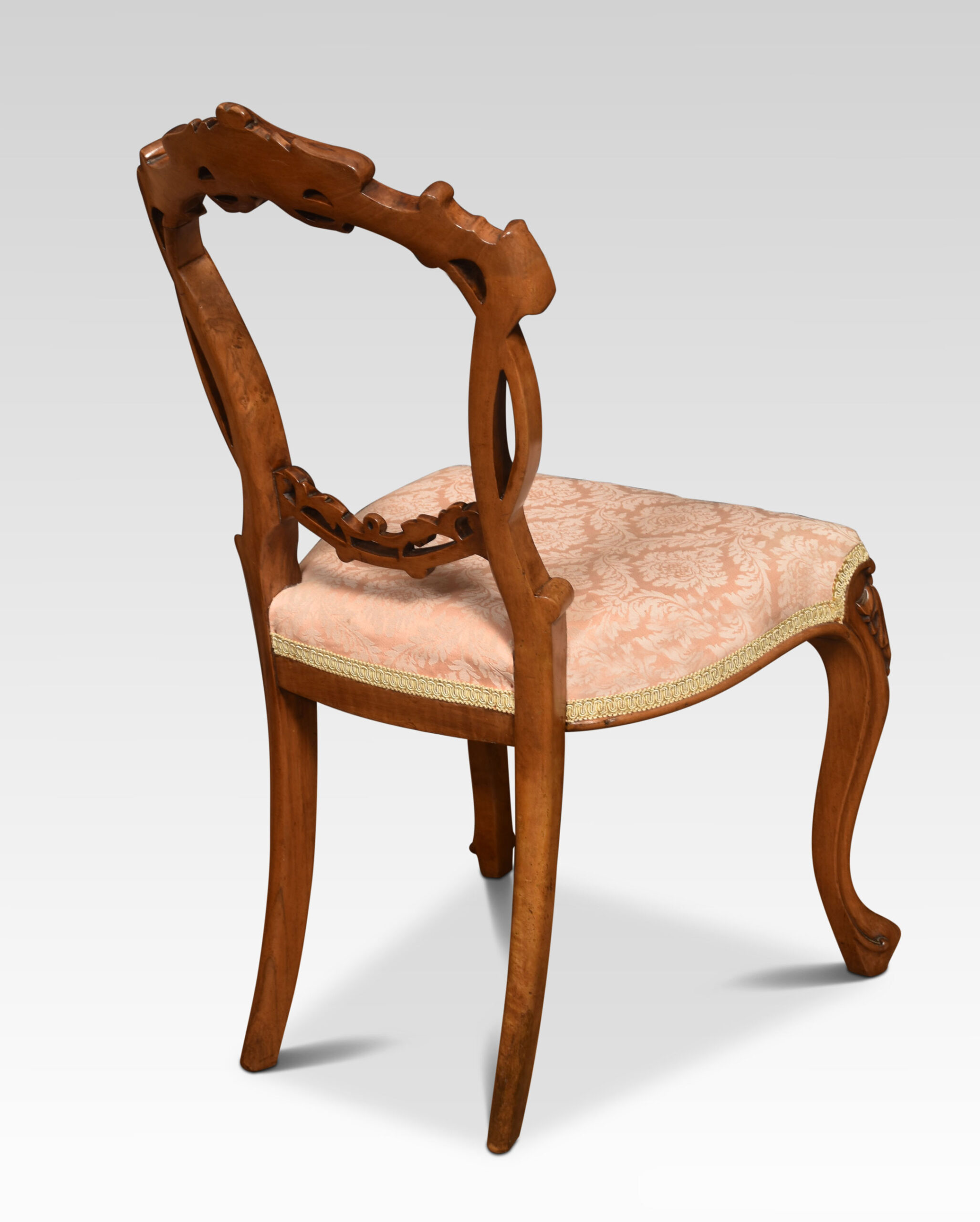 Set of four walnut balloon back dining chairs, each chair with an openwork ring back interlaced with carved scrolling foliate detail, above the overstuffed serpentine seat, raised up on cabriole front legs.
