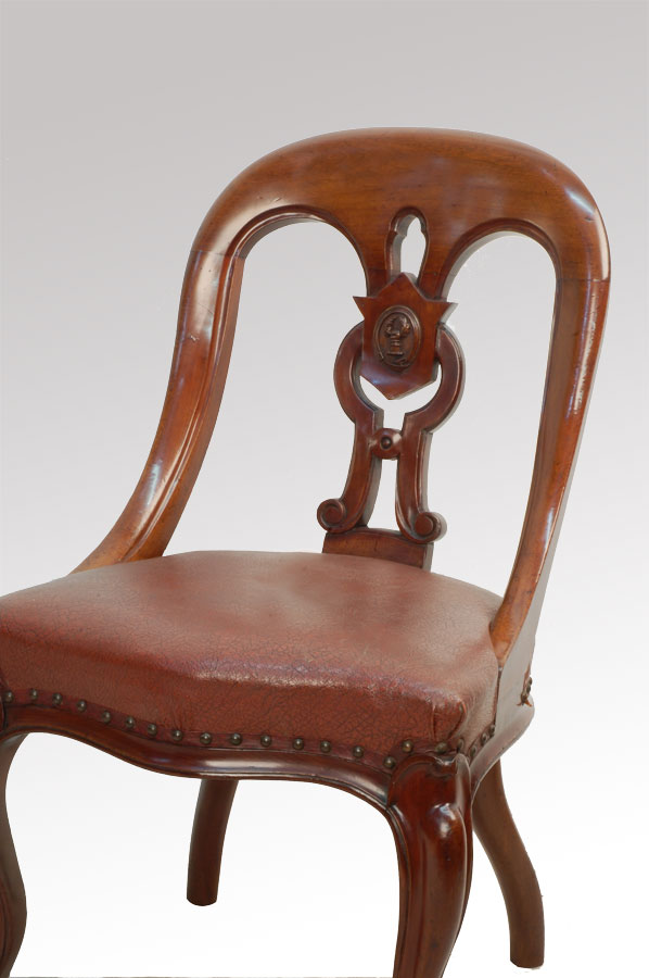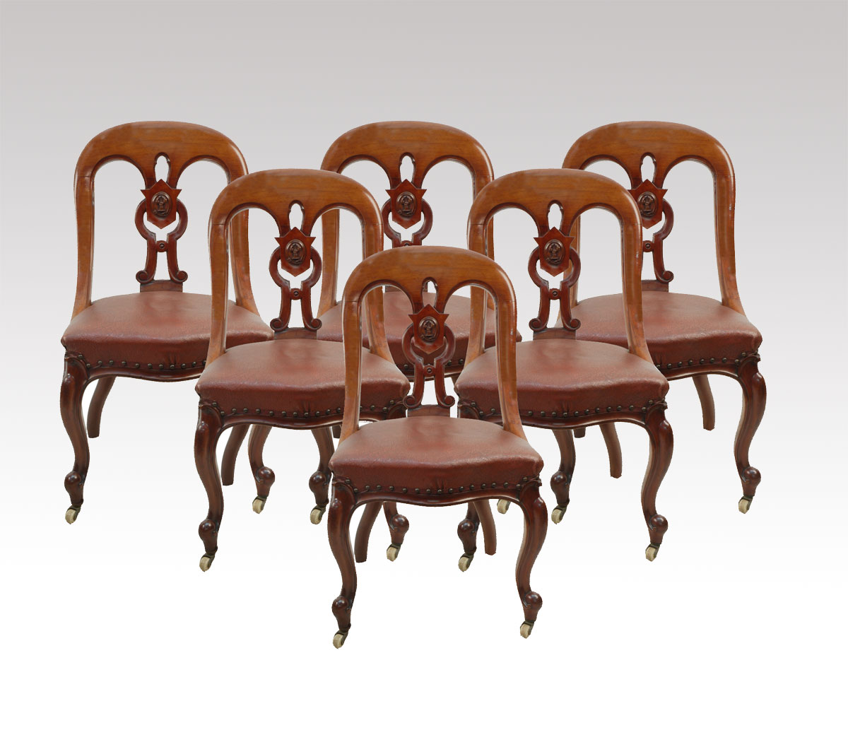 A set of six mahogany open curved back dining chairs with pierced carved splat depicting a fist holding a lorral leaf, upholstered stuff over serpentine seats, raised up on cabriole front legs with ceramic castors.