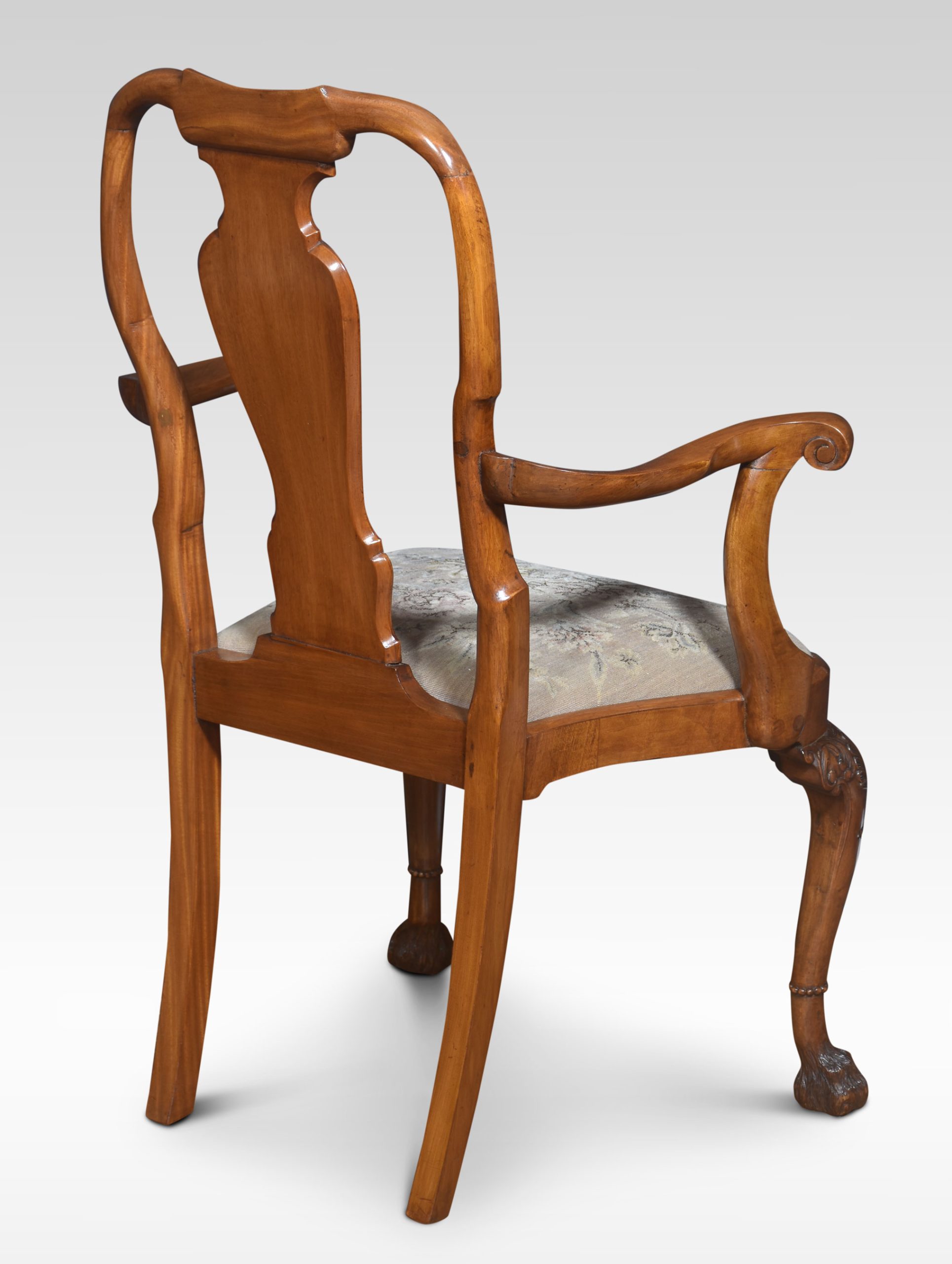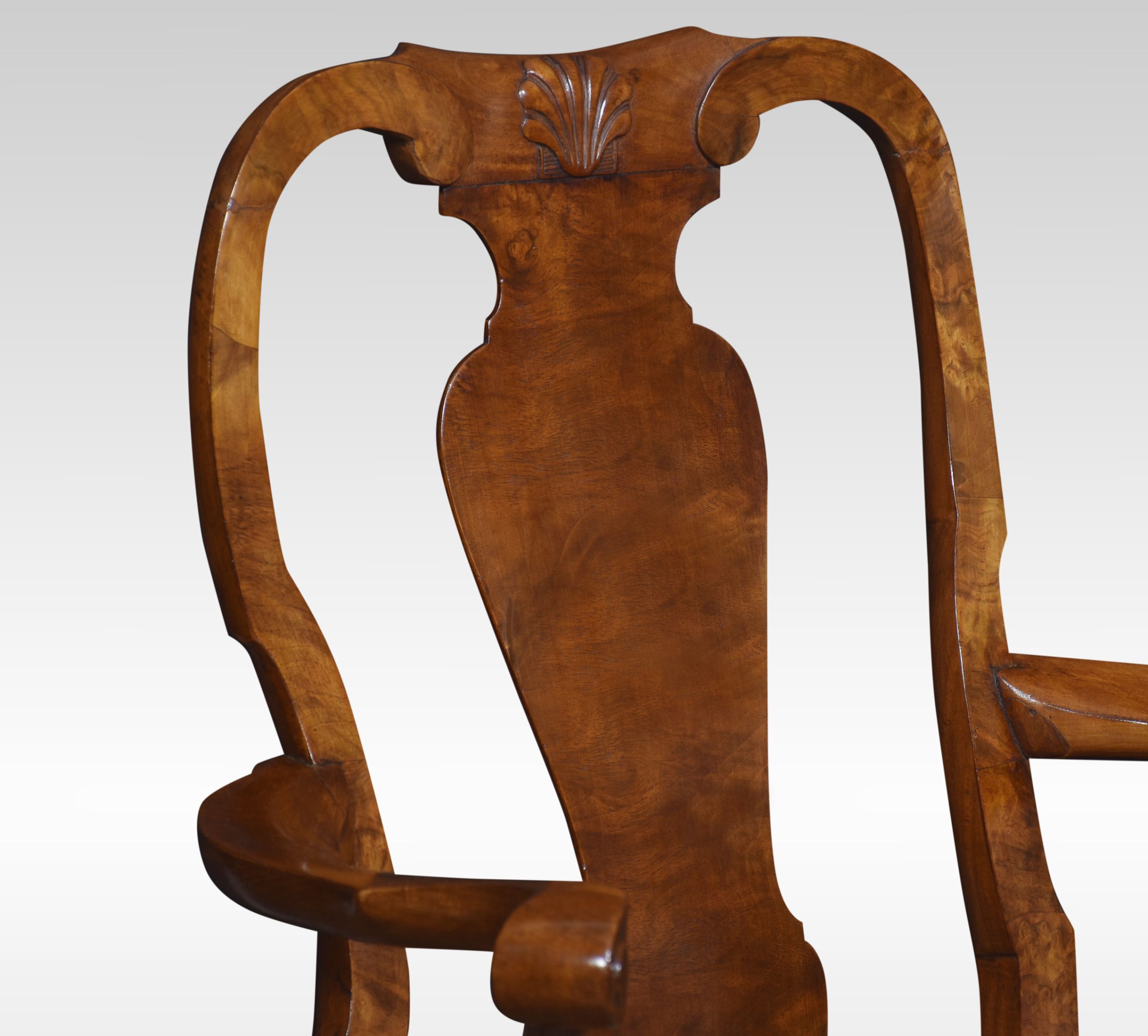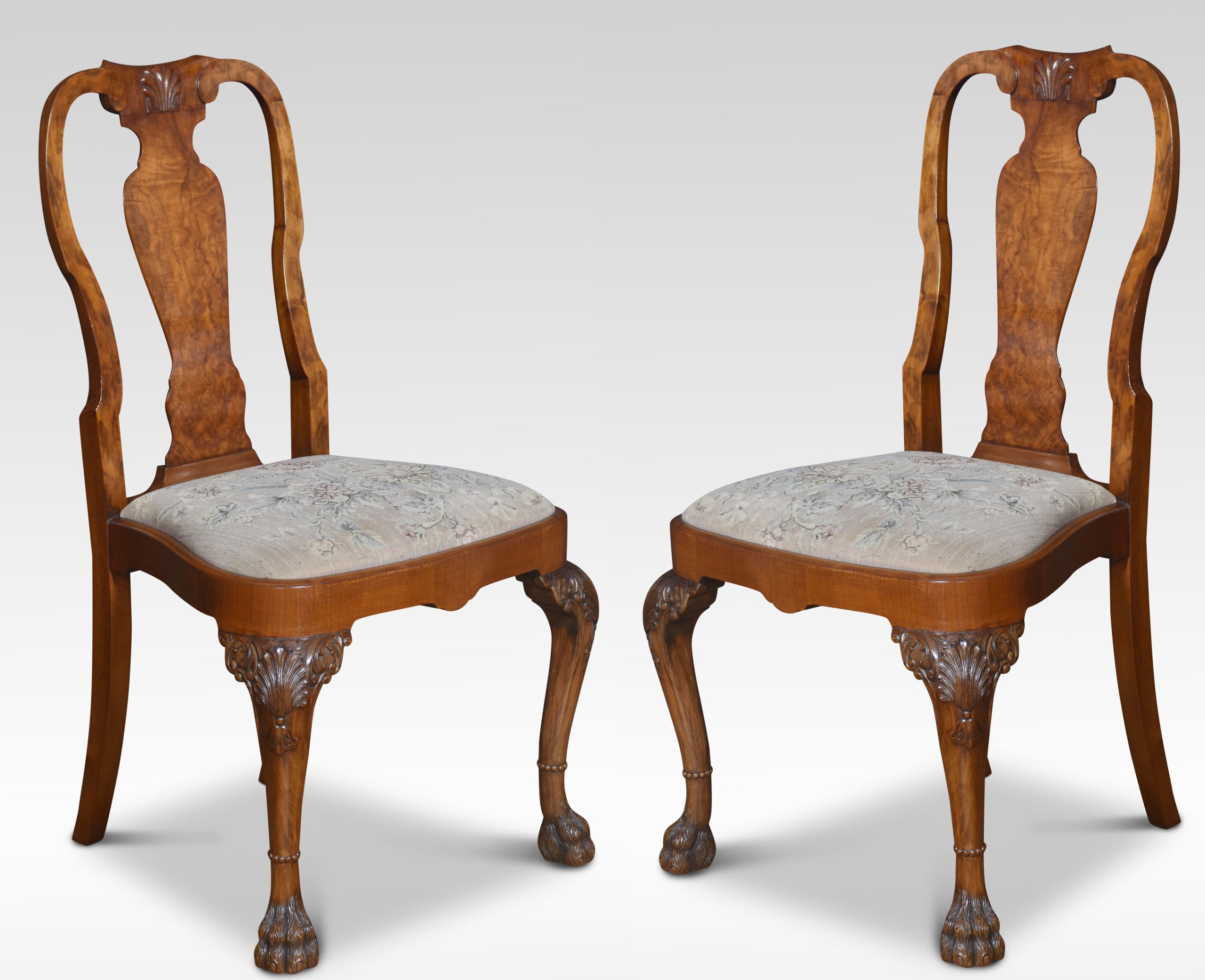 set of ten walnut dining chairs comprising of, two armchairs and eight chairs, each with shaped top rails above a vase-shaped vertical splat, with a drop-in seat above scallop-shell headed cabriole front legs terminating in hairy paw feet.