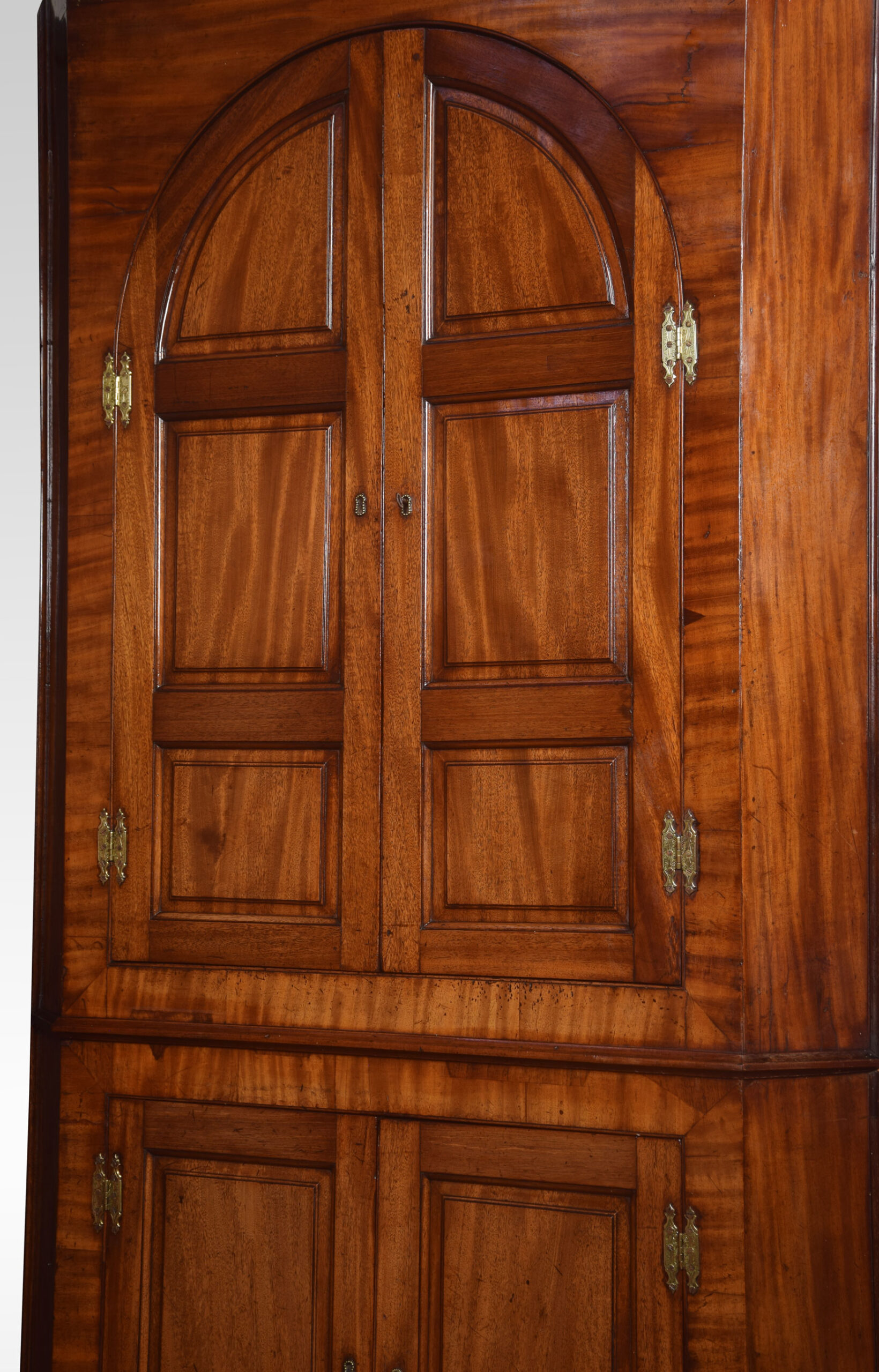 A substantial Country House mahogany floor standing corner cupboard. The molded cornice above a pair of arched fielded panel doors, enclosing shelved interior and three small drawers. The base section fitted with a pair of panel doors enclosing a further shelf. All raised up on bracket feet.