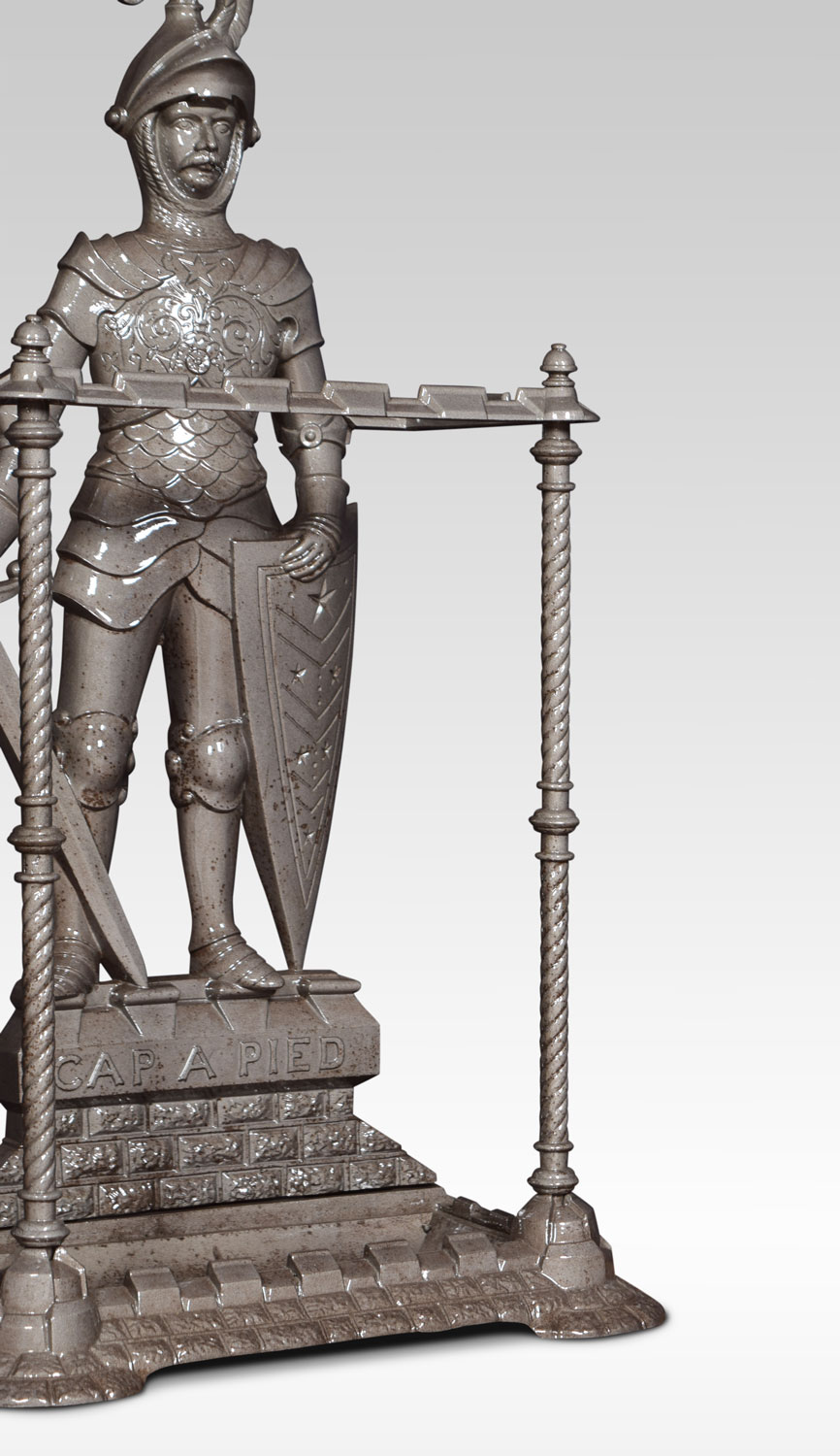 Victorian cast iron umbrella and stick stand, the back cast in the form of a knight in armour with shield and sword standing on a wall cast ‘CAP A PIED. The base fitted with drip tray.