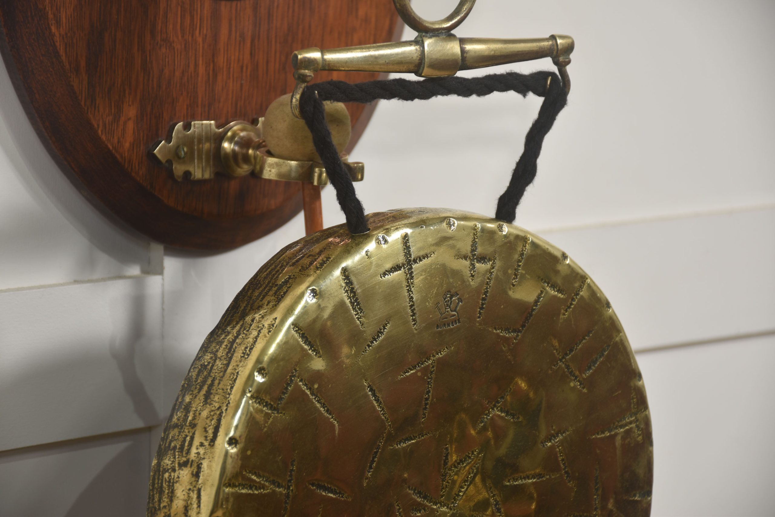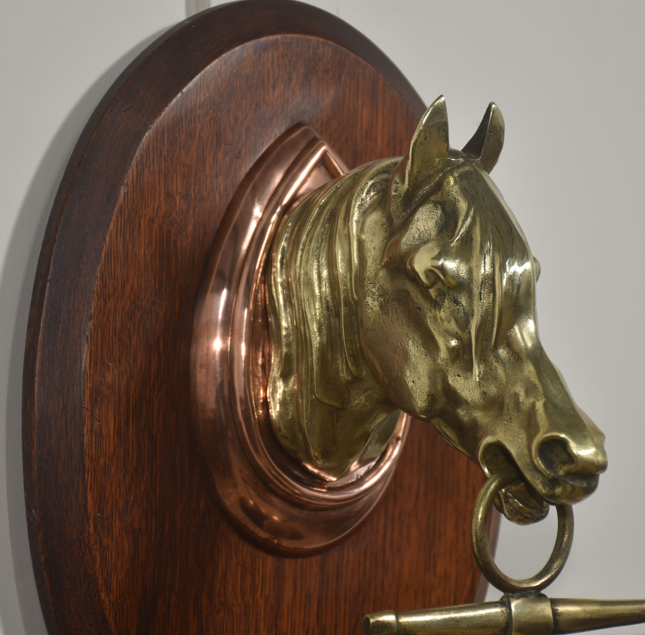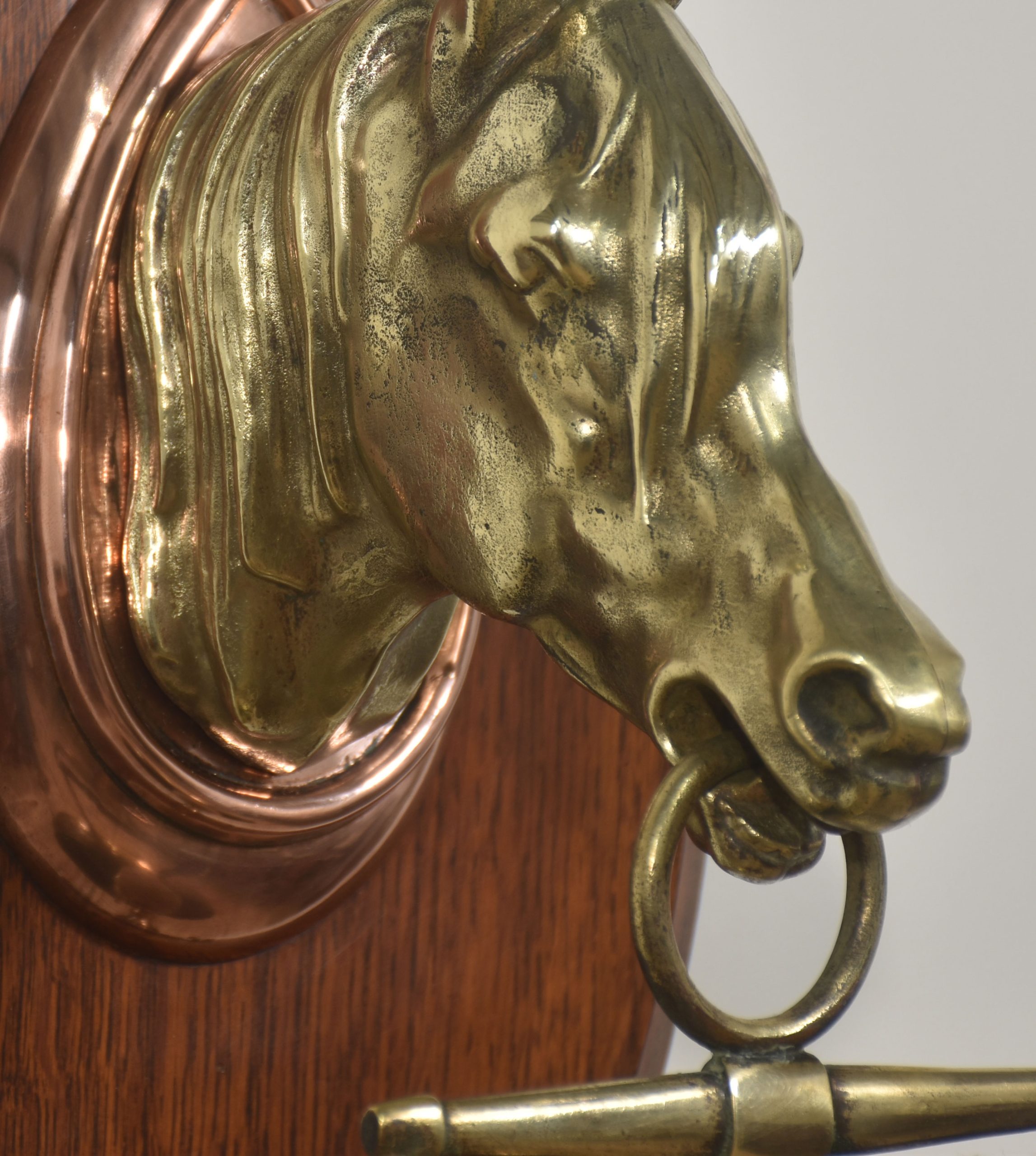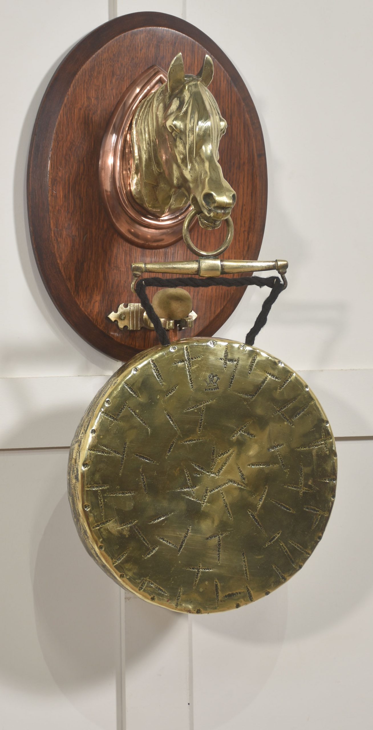 Wall-Hanging Oak Dinner Gong with Brass Horse Head Mount