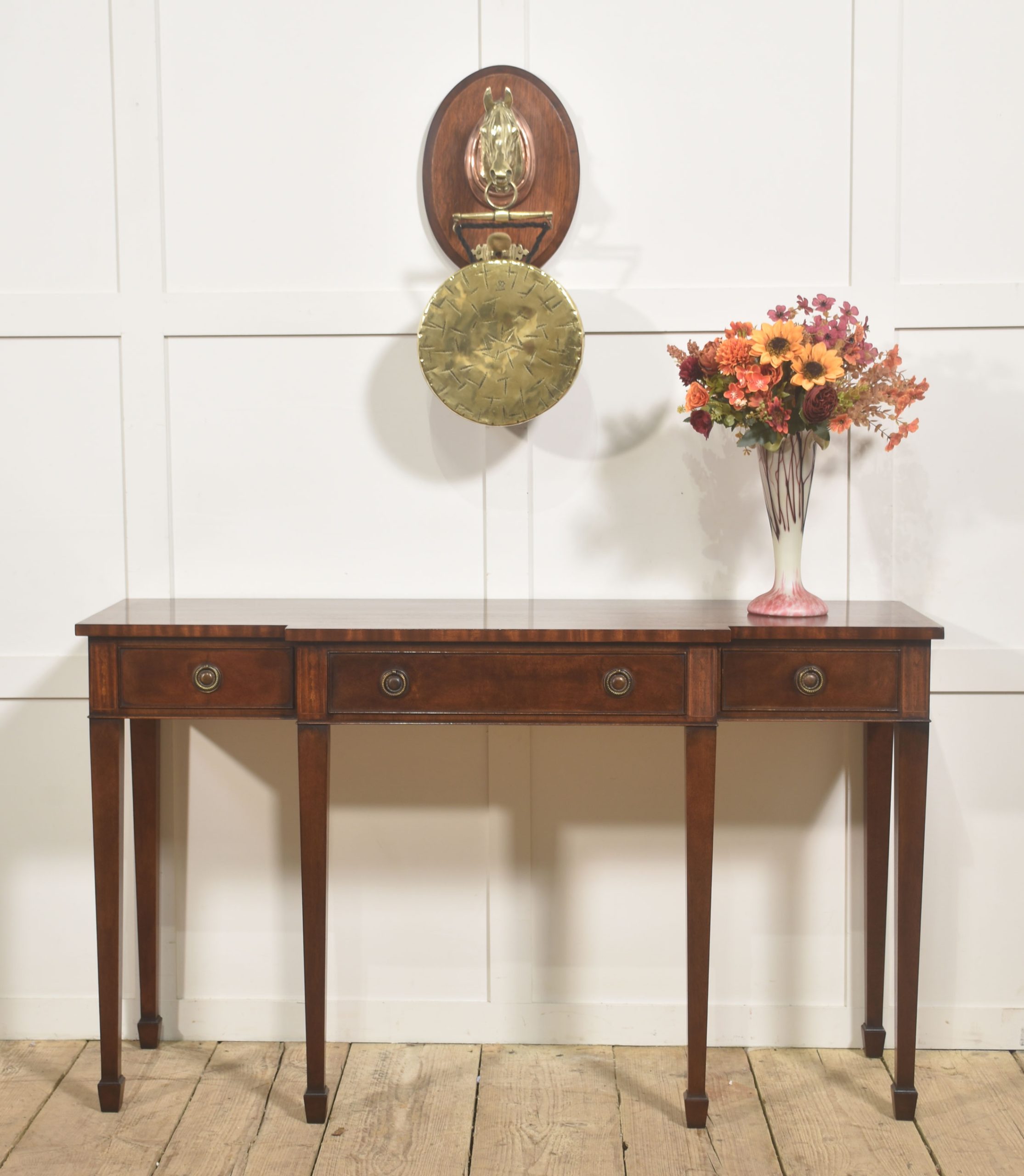 A traditional wall-mounted dinner gong featuring a sculptural cast brass horse head mounted to a solid oak oval backplate. Designed to summon guests to table, this striking piece blends equestrian character with classic country-house craftsmanship.