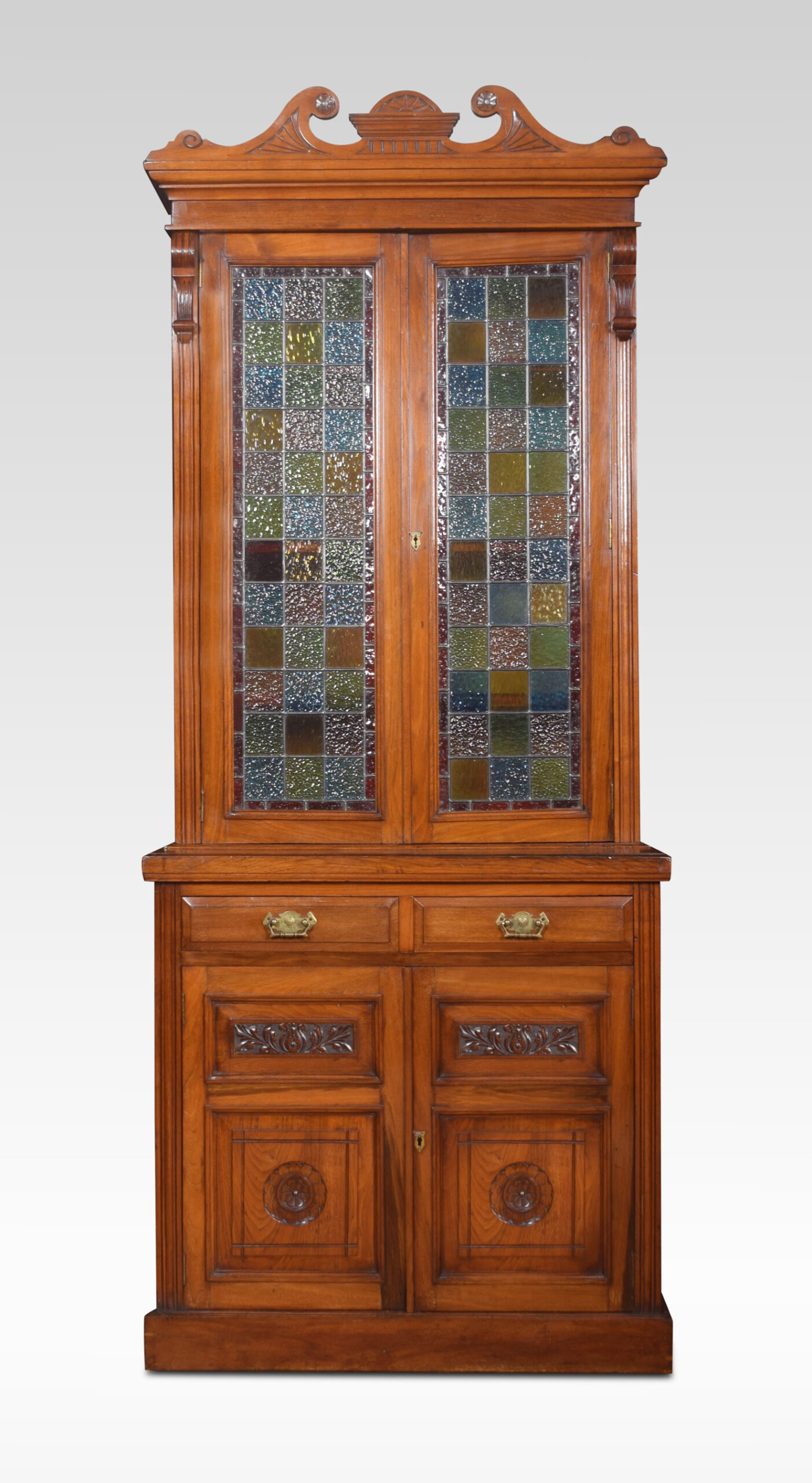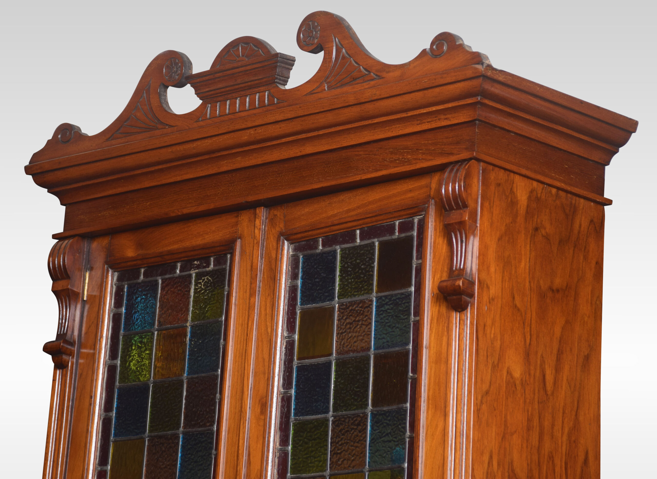 Walnut narrow bookcase of narrow proportions. The carved cornice above a pair of leaded stained glass door enclosing adjustable shelved interior. Flanked by reeded columns. To the base with two frieze drawer and a panelled cupboard doors below enclosing large storage area. All raised up on plinth base.