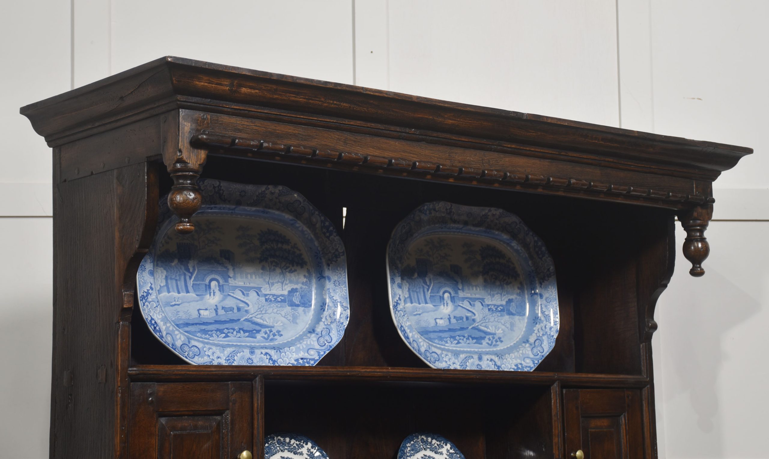 A substantial Welsh oak dresser and rack, probably South West Wales, dating from the late 18th or early 19th century. The rack is surmounted by a broad moulded cornice with dentil-style detailing and turned pendant drops, above open plate shelves with a boarded back. A central open compartment is flanked by small panelled cupboard doors, providing useful enclosed storage alongside display space.