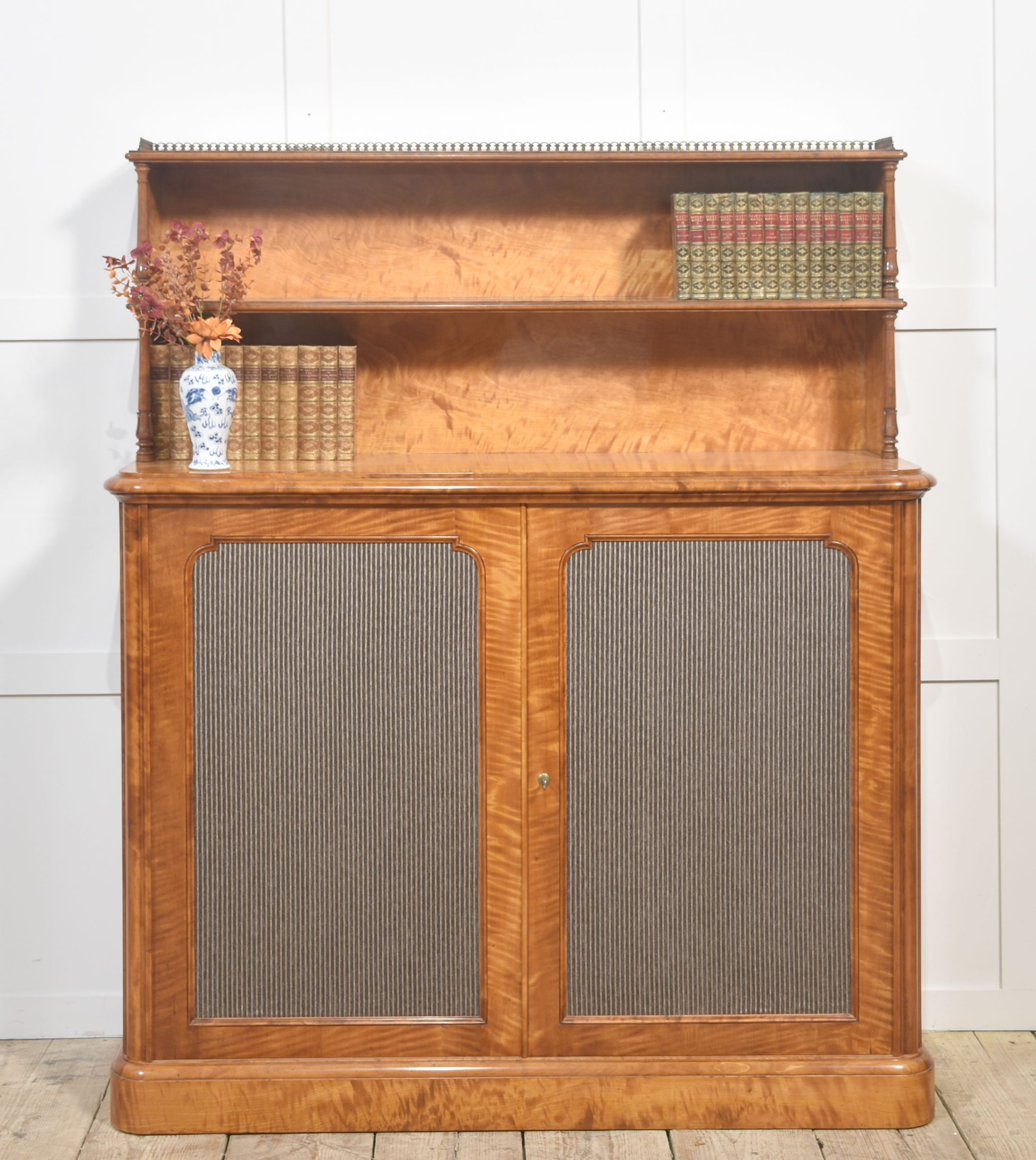 A superb William IV period chiffonier, beautifully crafted in richly figured maple with a lustrous hand-polished finish that enhances the natural depth and movement of the grain. The upper section features two open display shelves supported by elegant turned columns and finished with a fine brass gallery, ideal for displaying books or decorative objects.