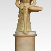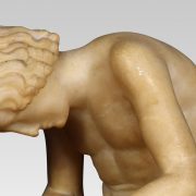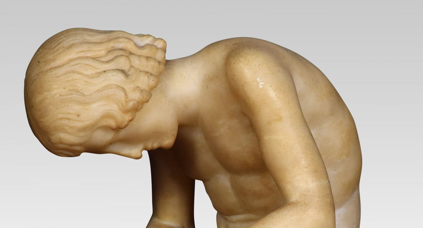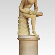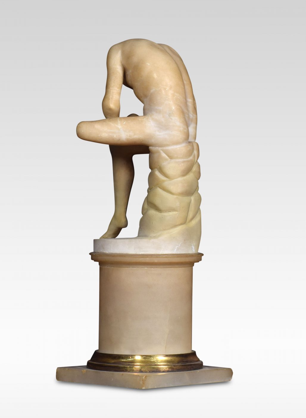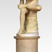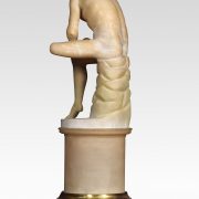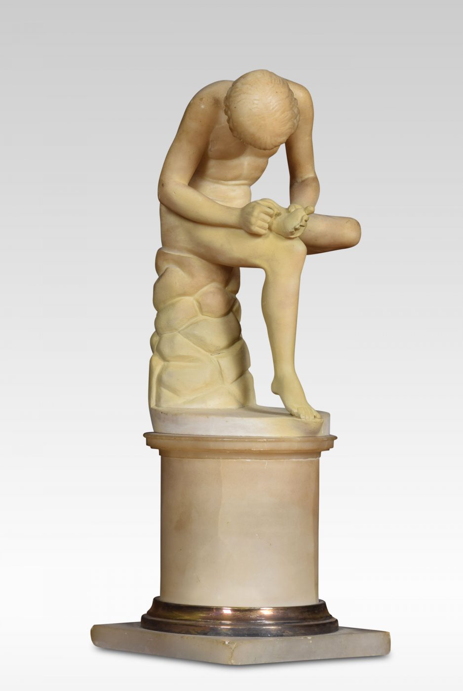 Alabaster sculpture, Spinario statue of a boy with a thorn in his foot on a yellow scagliola pedestal. He is based on an Antique bronze original which is in the Capitoline Museum Rome.