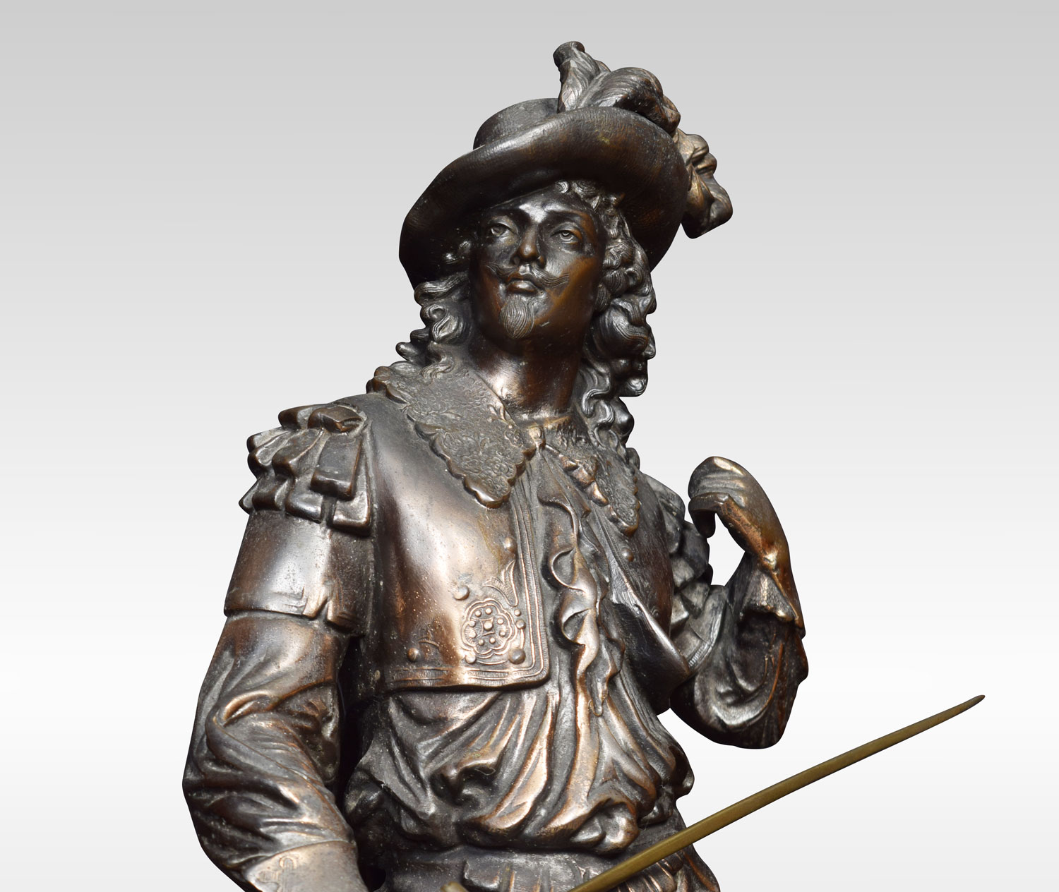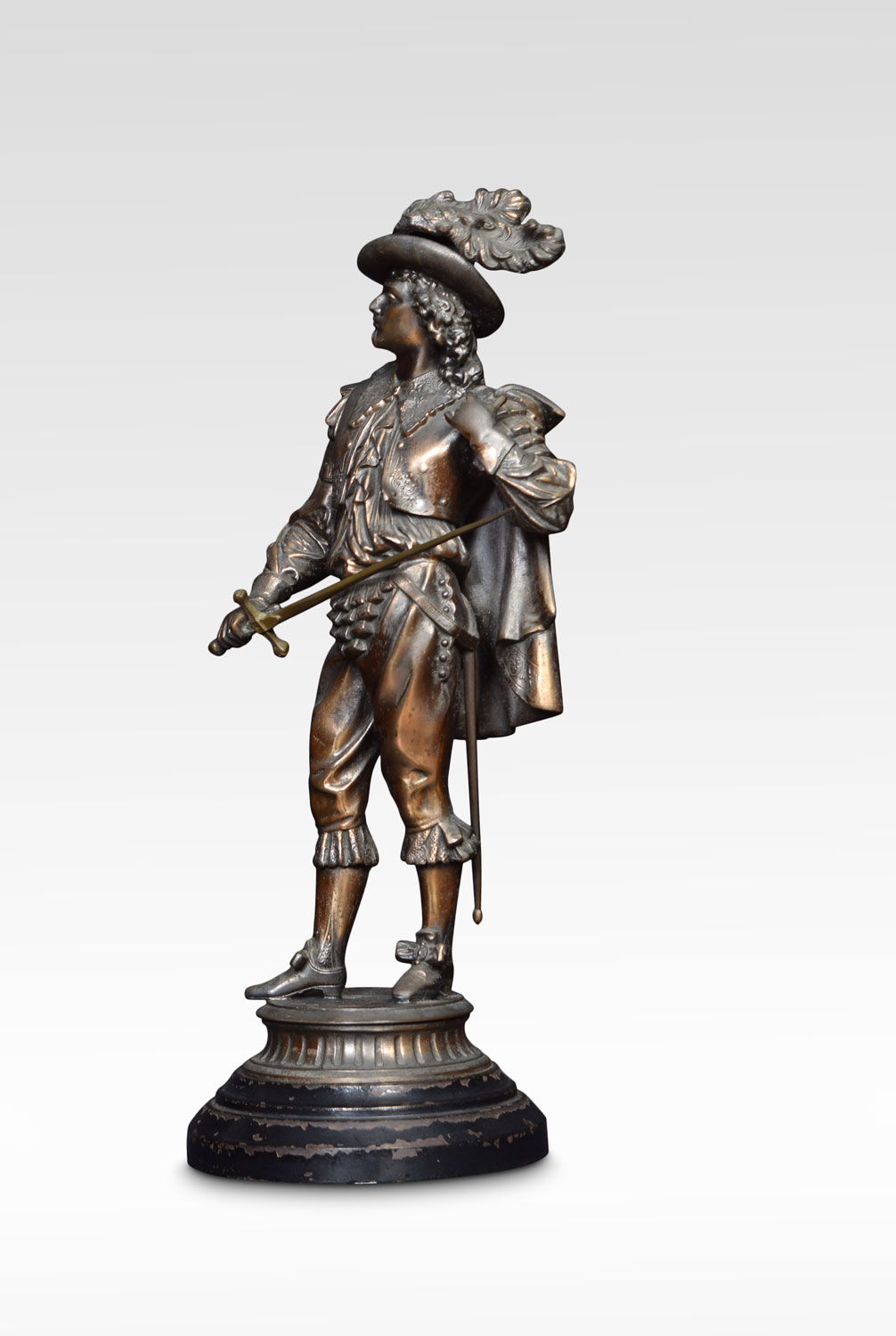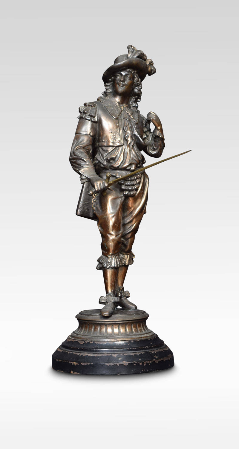 A 19th century bronzed figure of a Cavalier in traditional dress, holding a sword. Raised up on circular ebonized base.