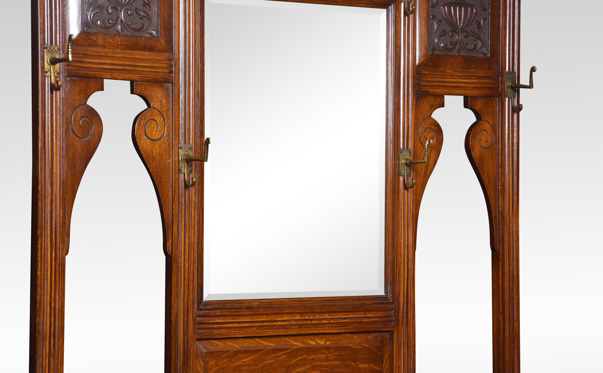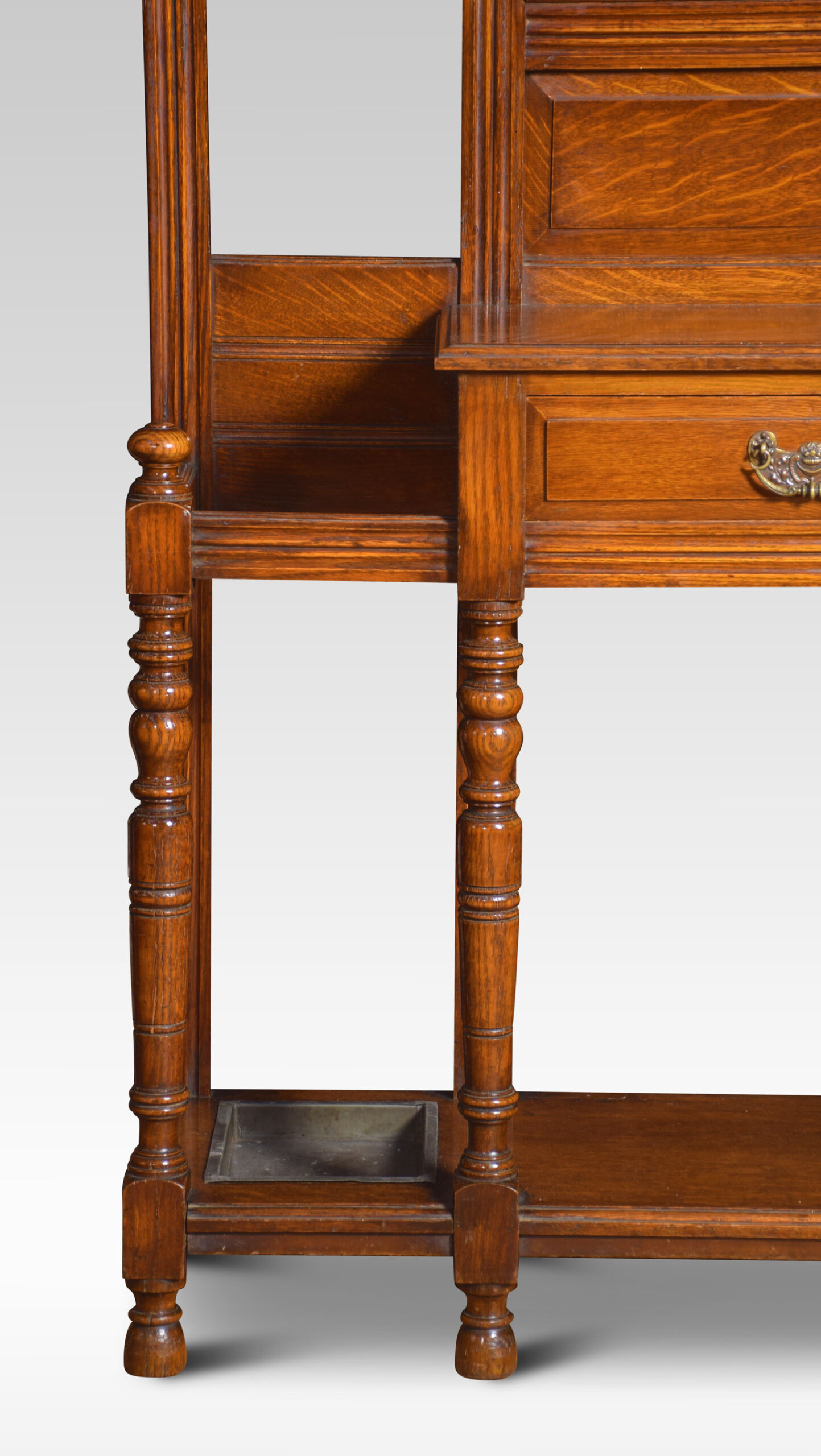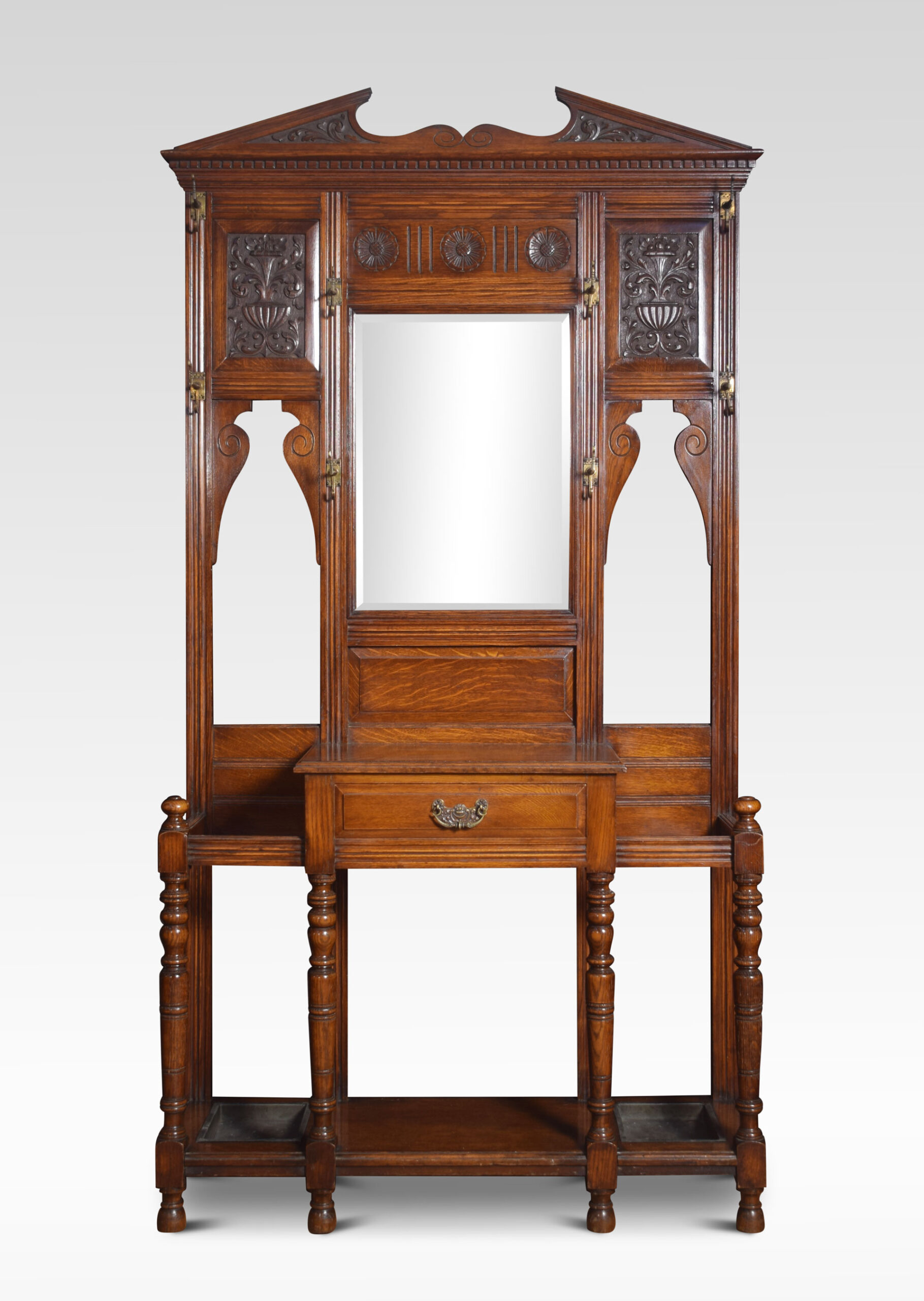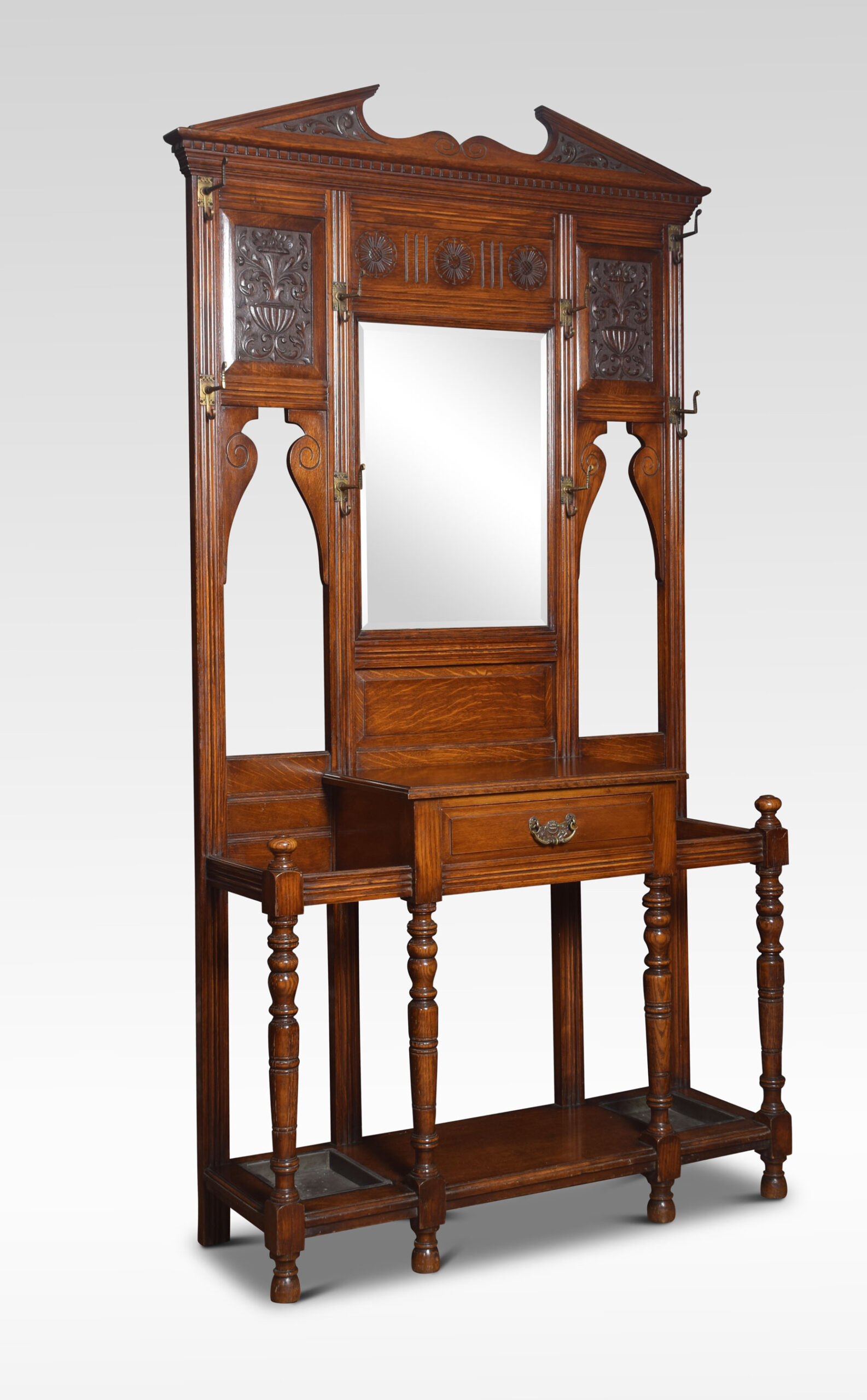 19th-century oak hall stand the projecting cornice above the original bevelled mirror plate. surrounded by scrolling hooks. The base section fitted with central draw having umbrella stands to either side with original drip trays. All raised up on bun feet.
