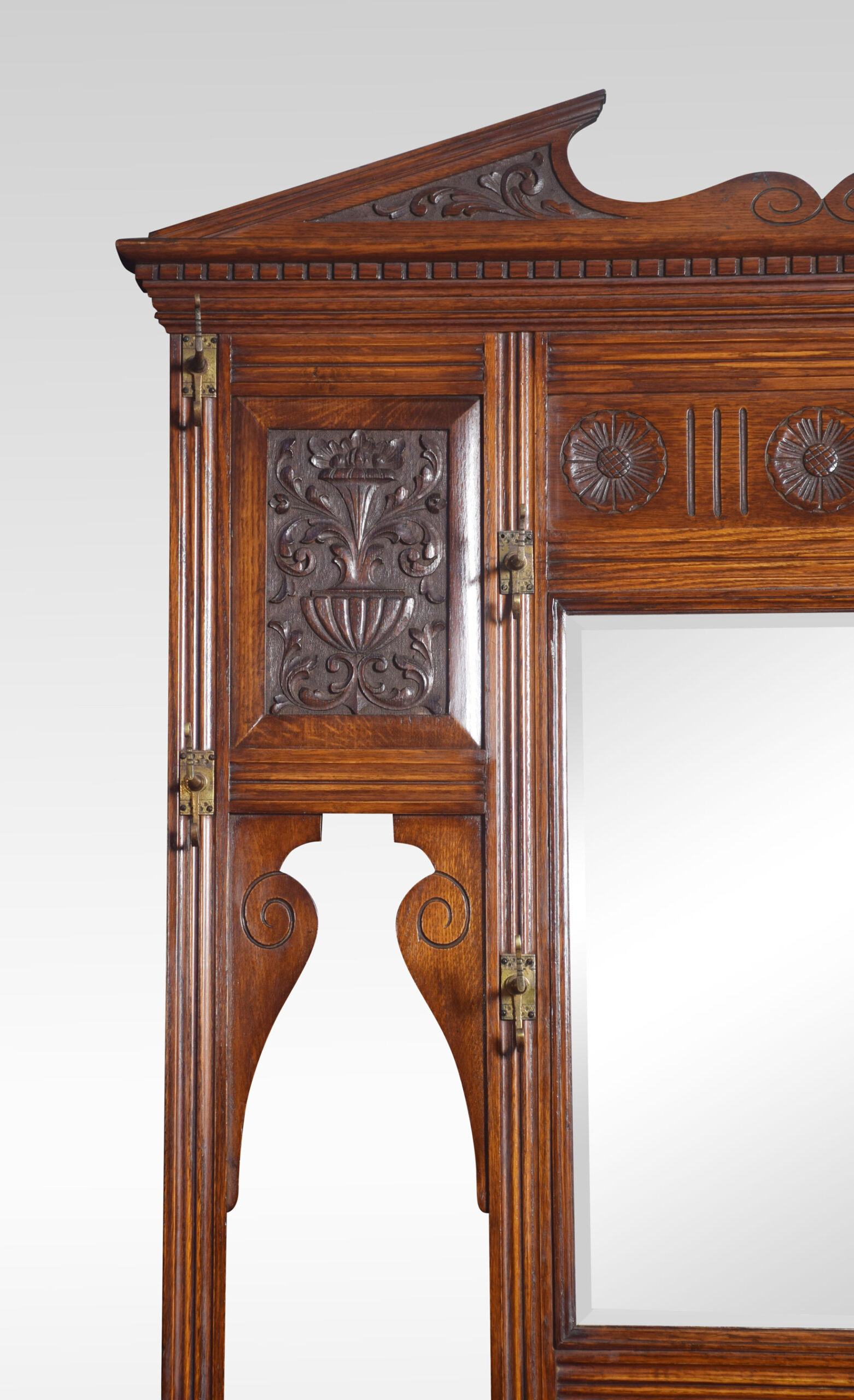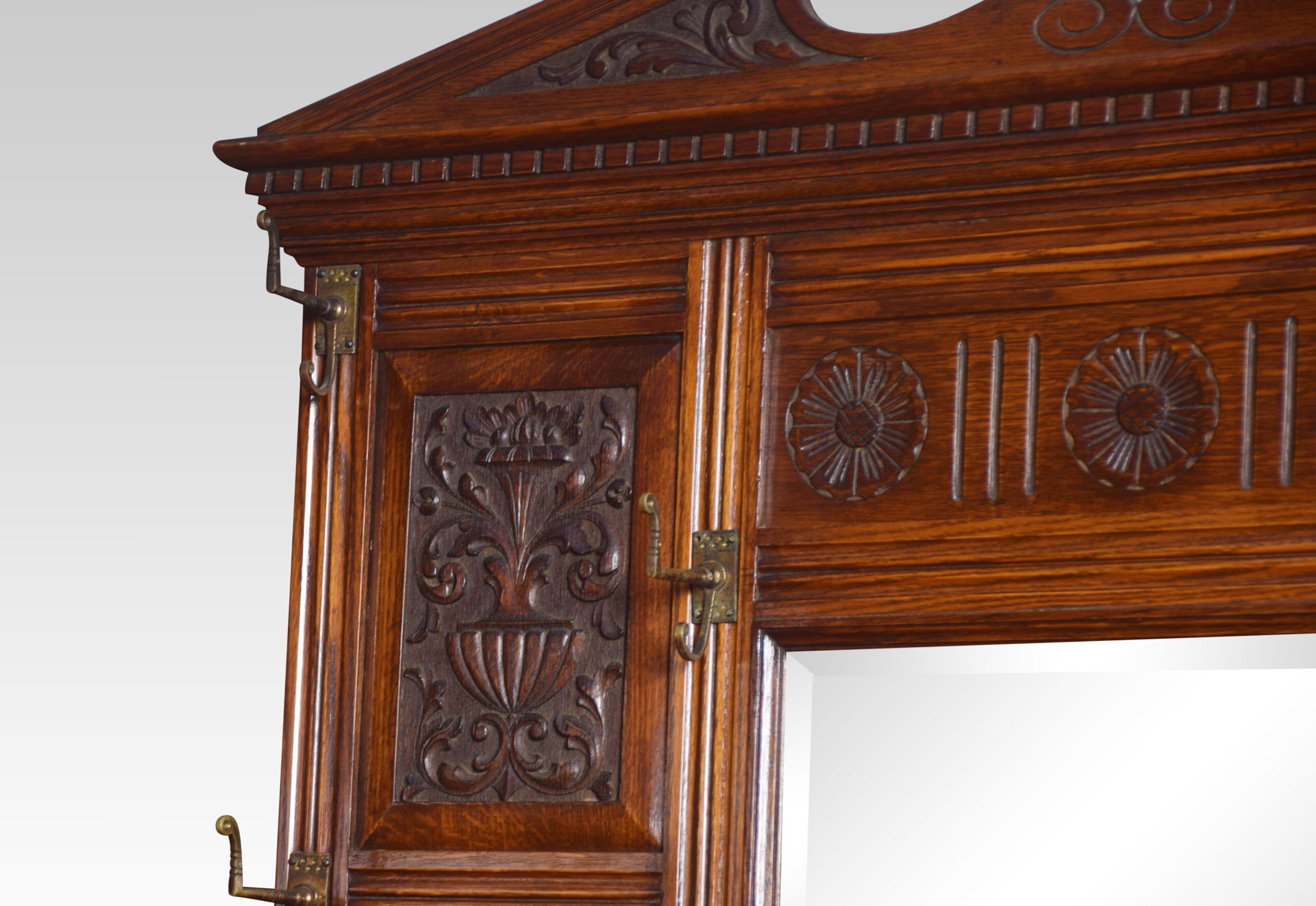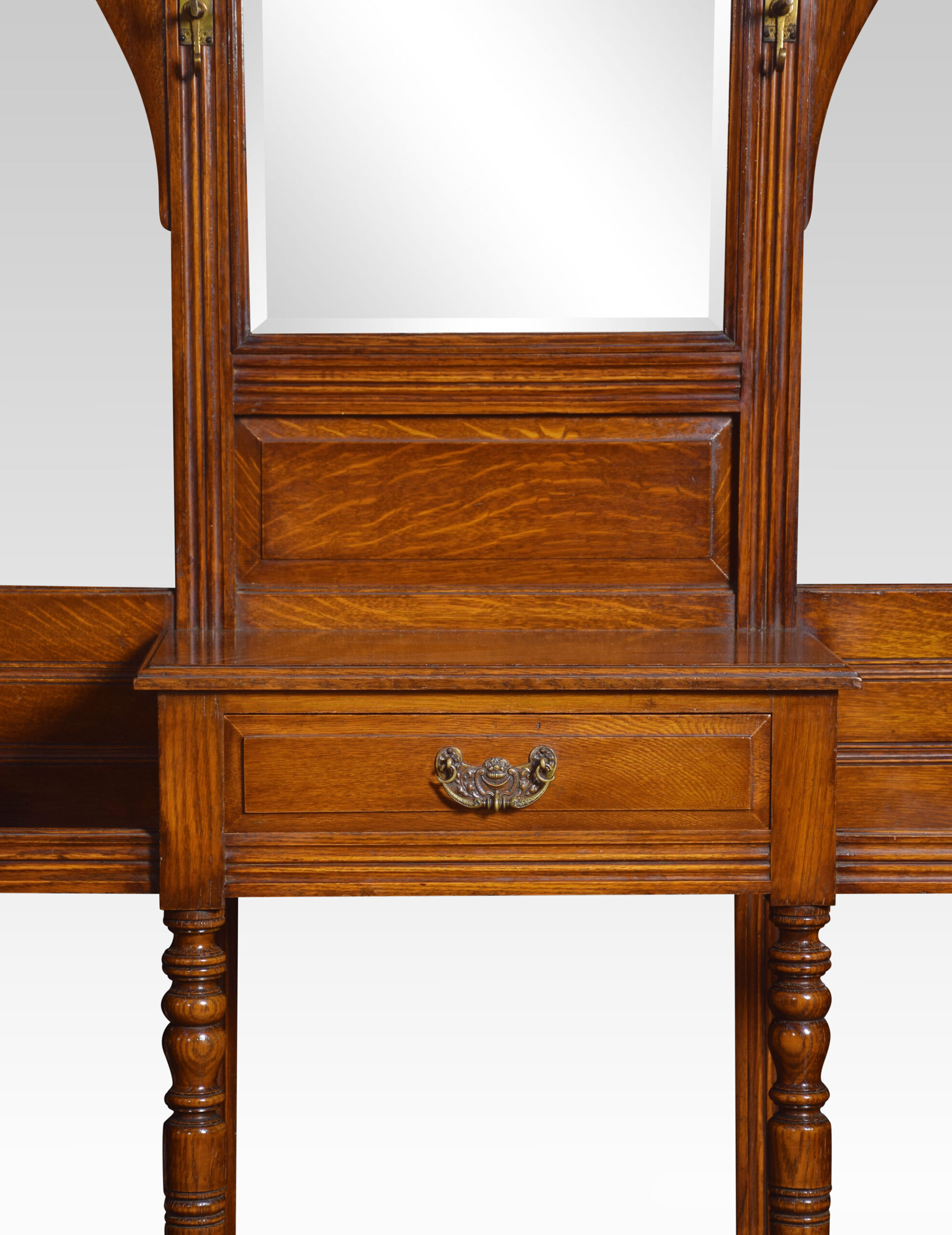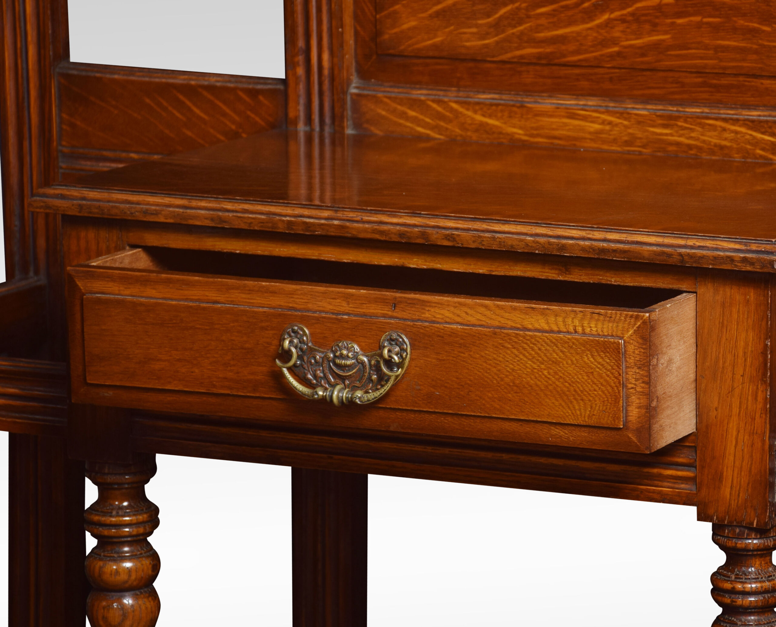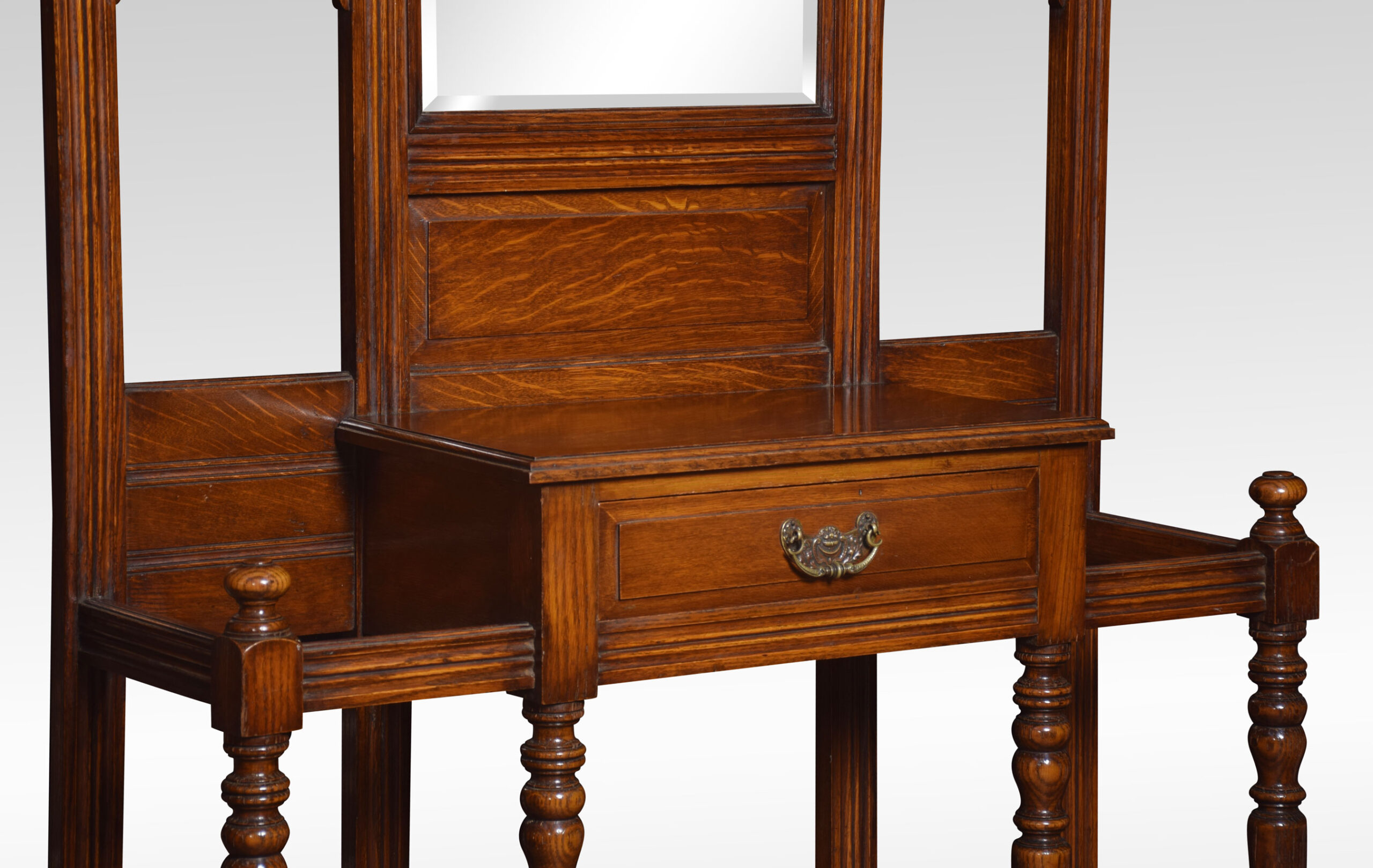 19th-century oak hall stand the projecting cornice above the original bevelled mirror plate. surrounded by scrolling hooks. The base section fitted with central draw having umbrella stands to either side with original drip trays. All raised up on bun feet.