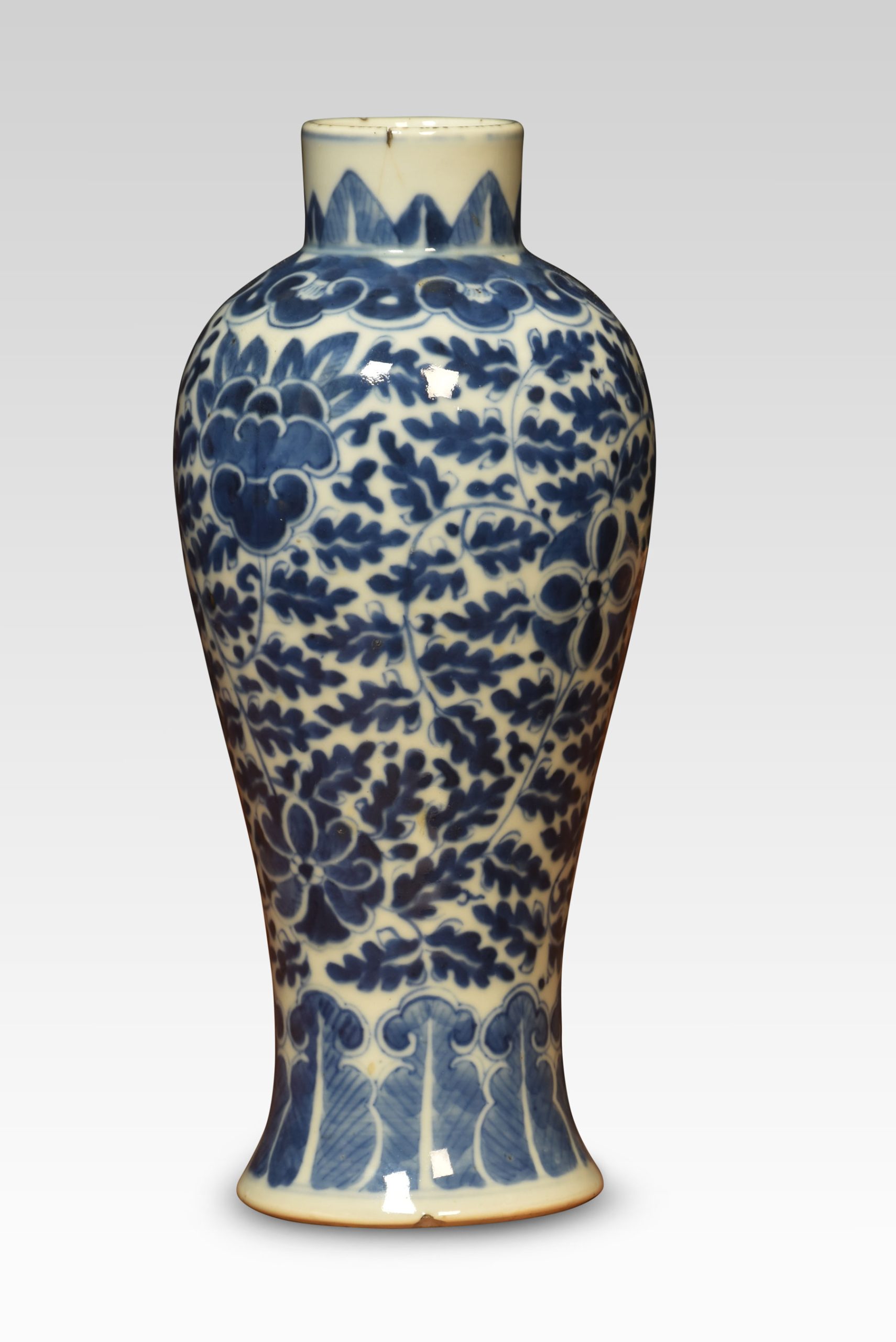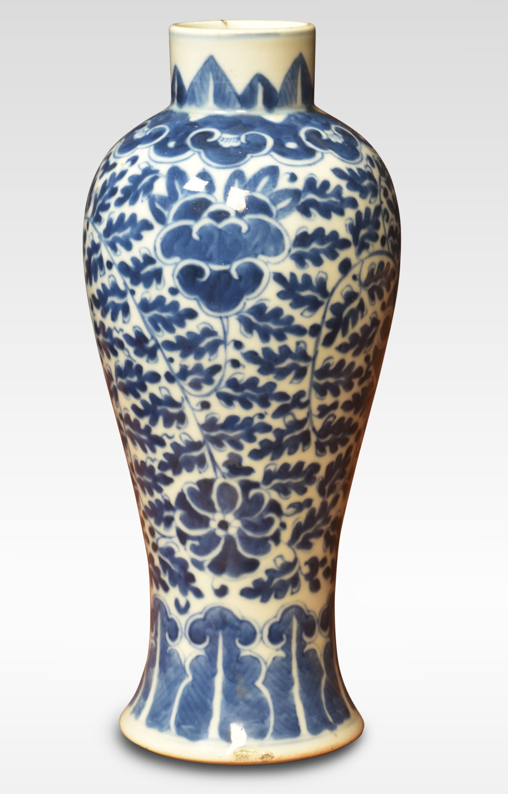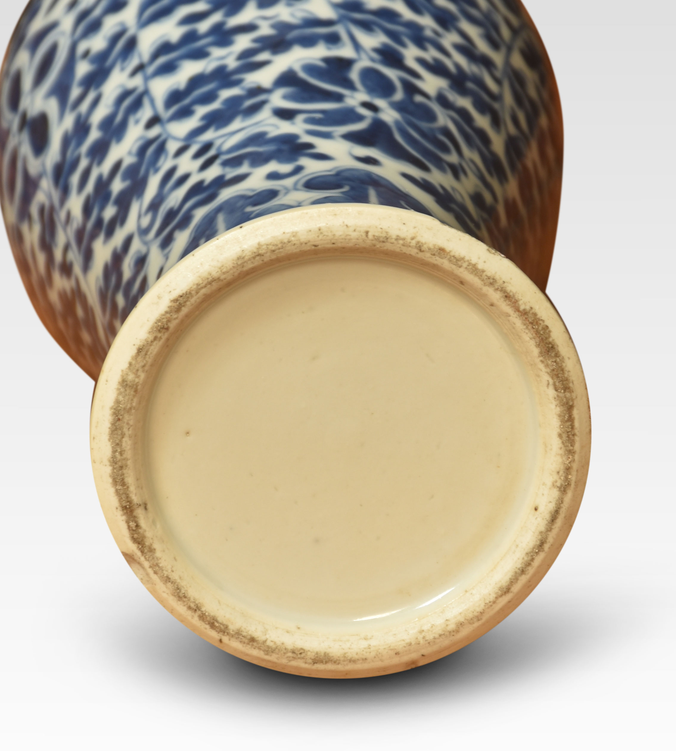 19th-century blue and white porcelain vase with leaf decoration on a circular base with some chips to the rim.