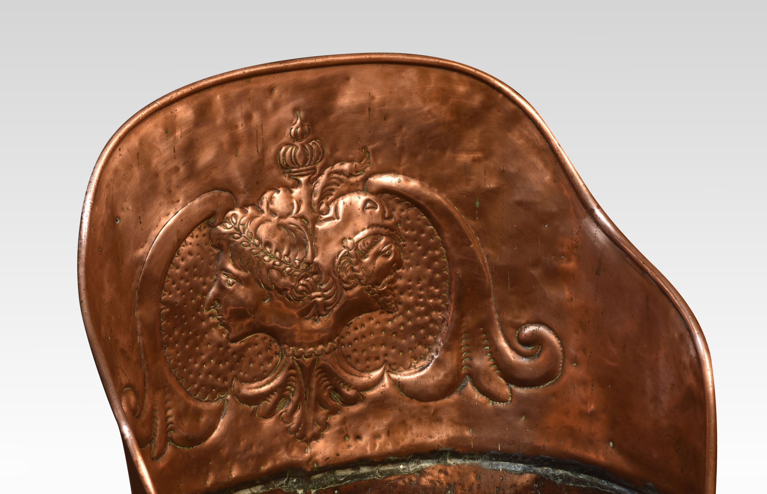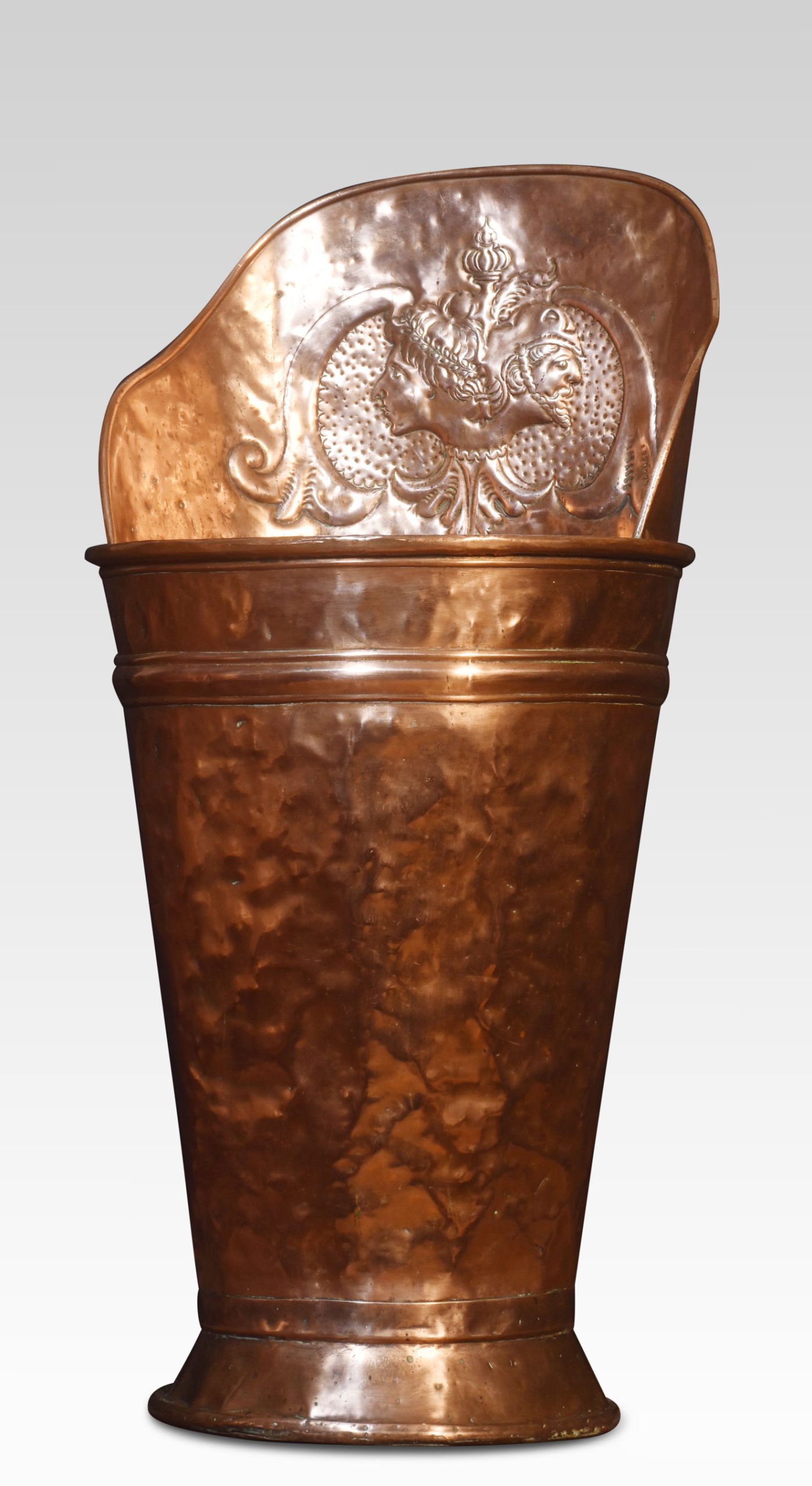 19th Century Large Copper grape hod with embossed floral decoration raised up on circular stepped base.