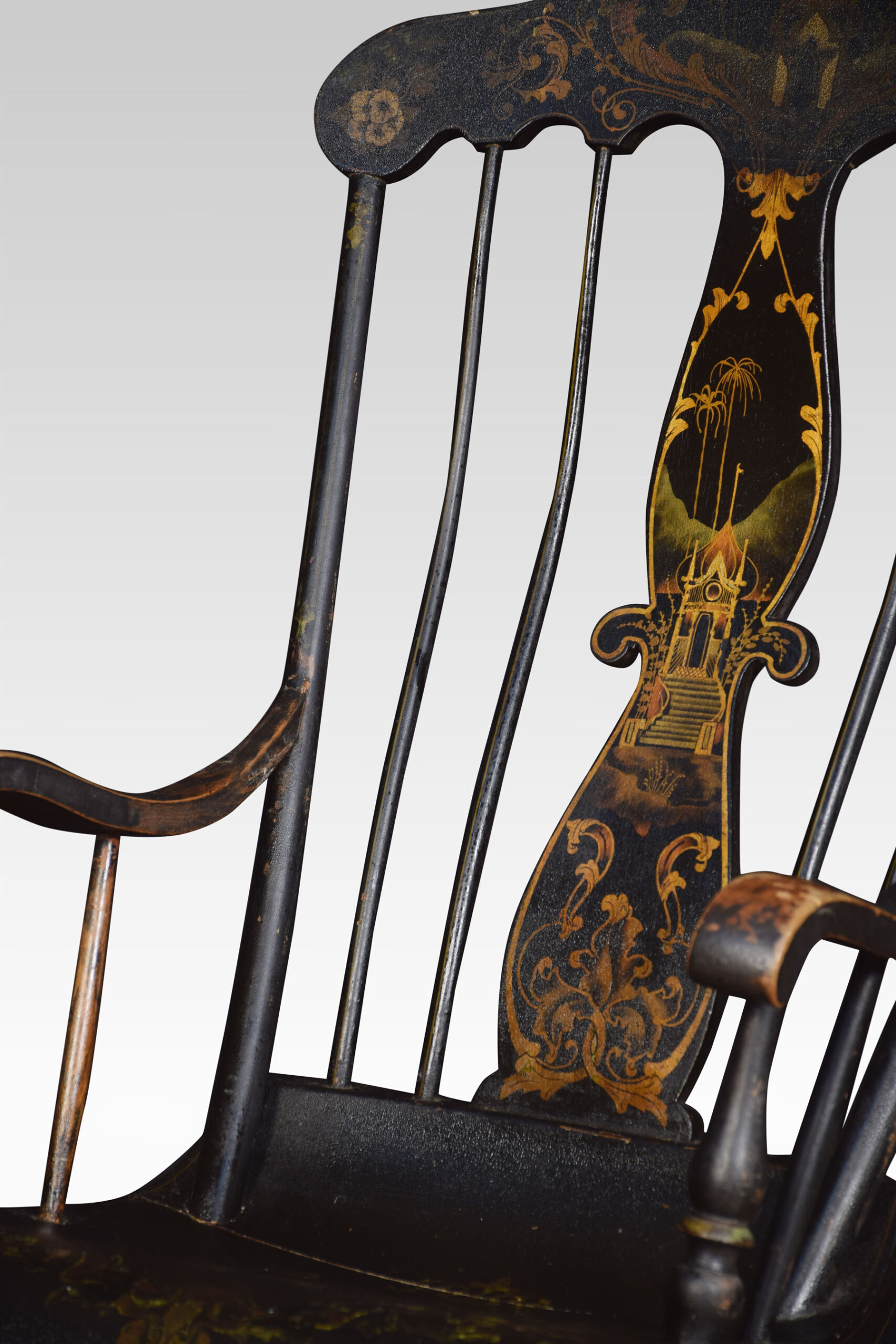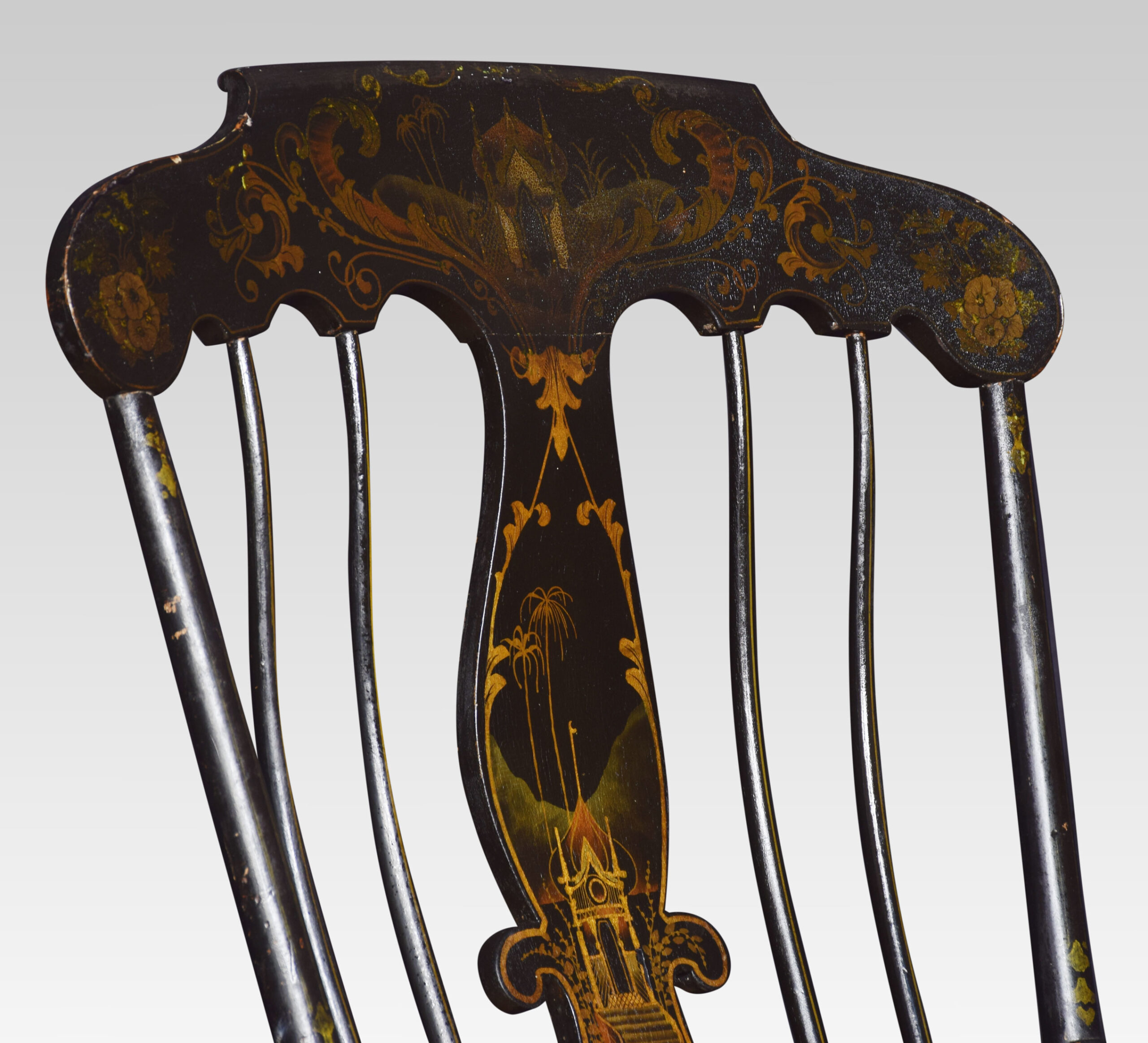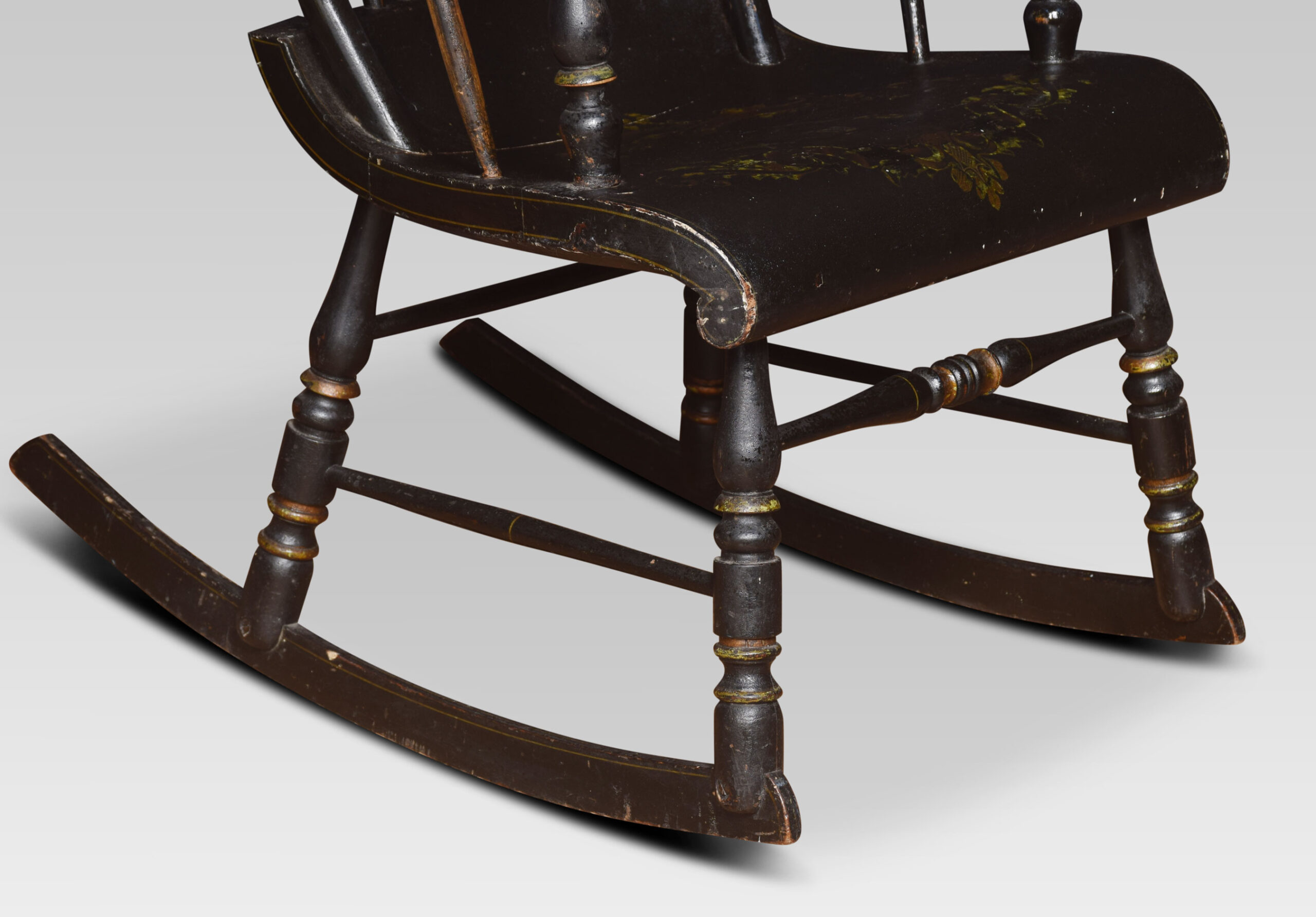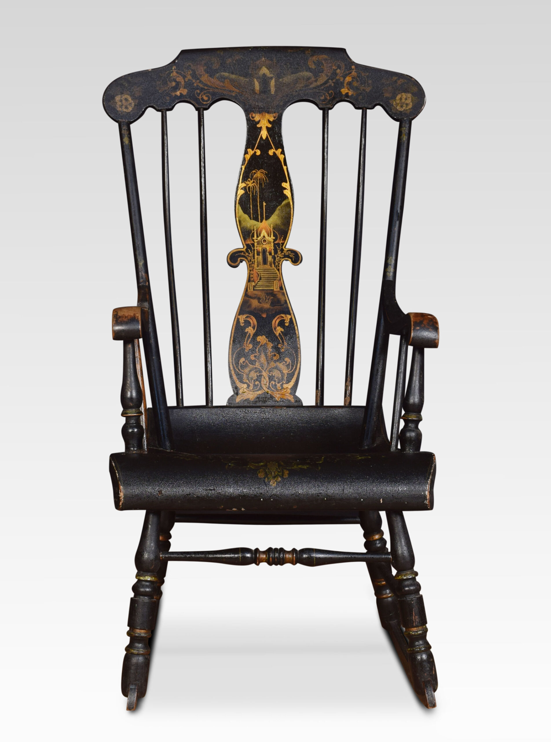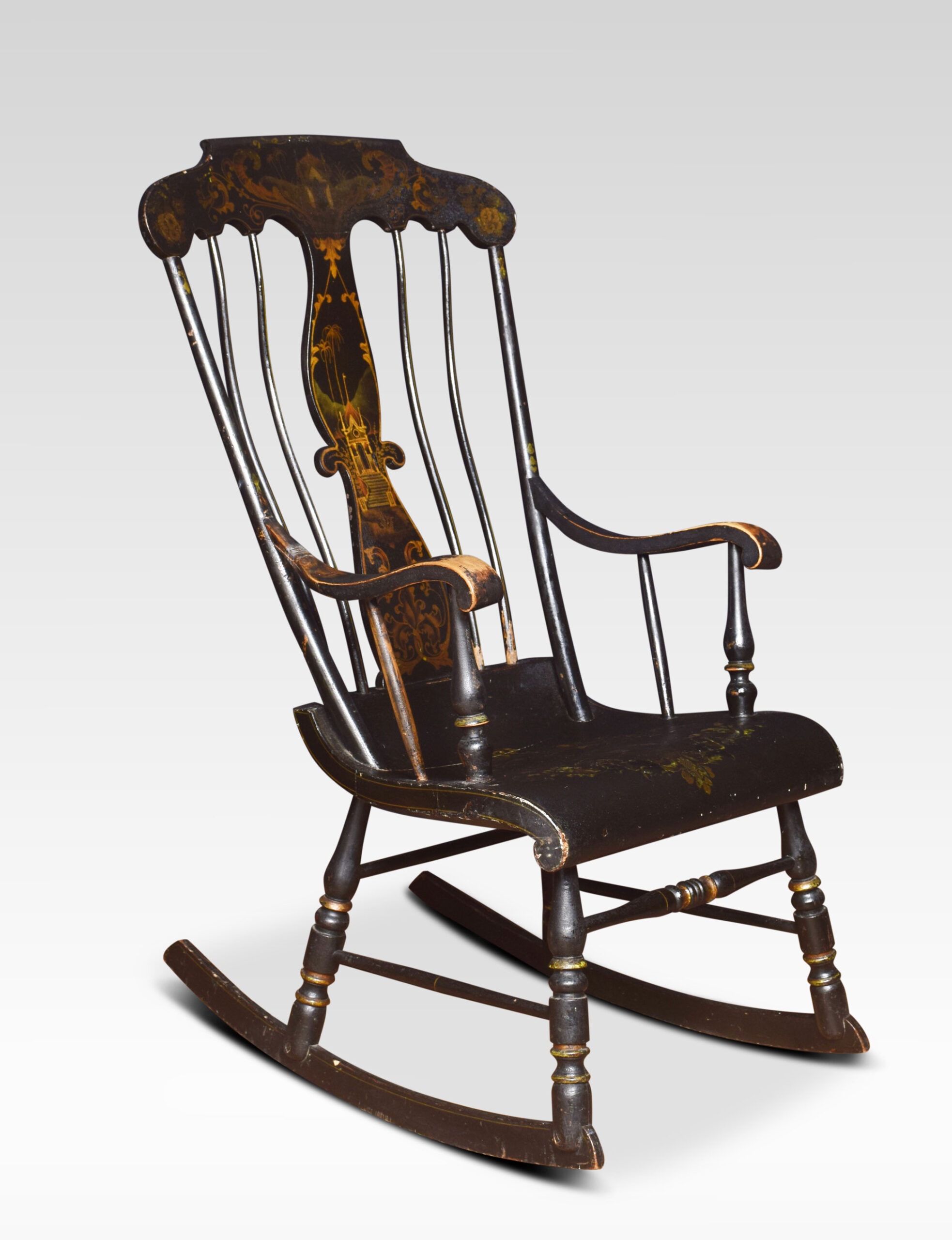 A 19th-century rocking chair, the cresting rail above spindle back to the floral decorated seat raised up on turned legs.