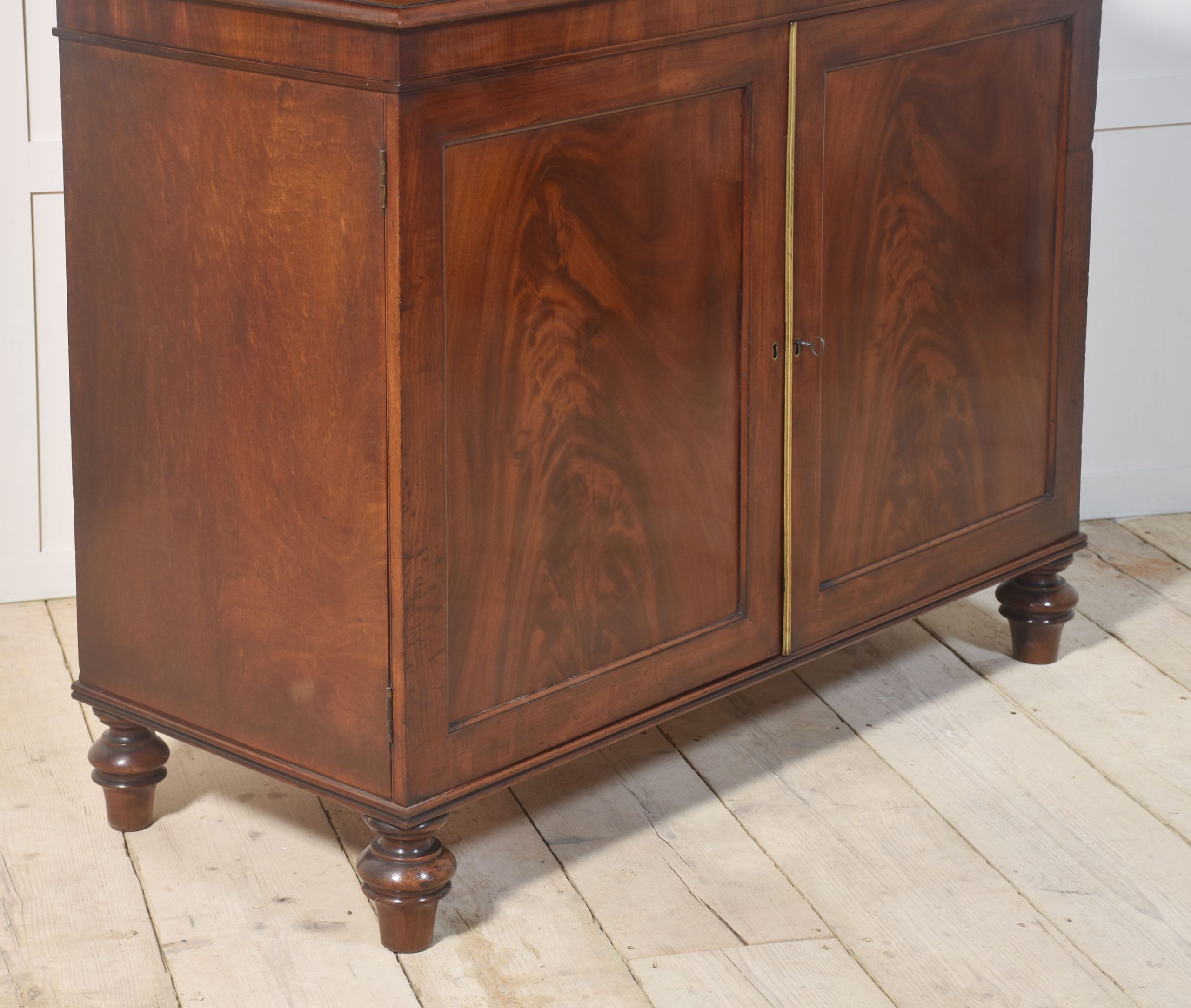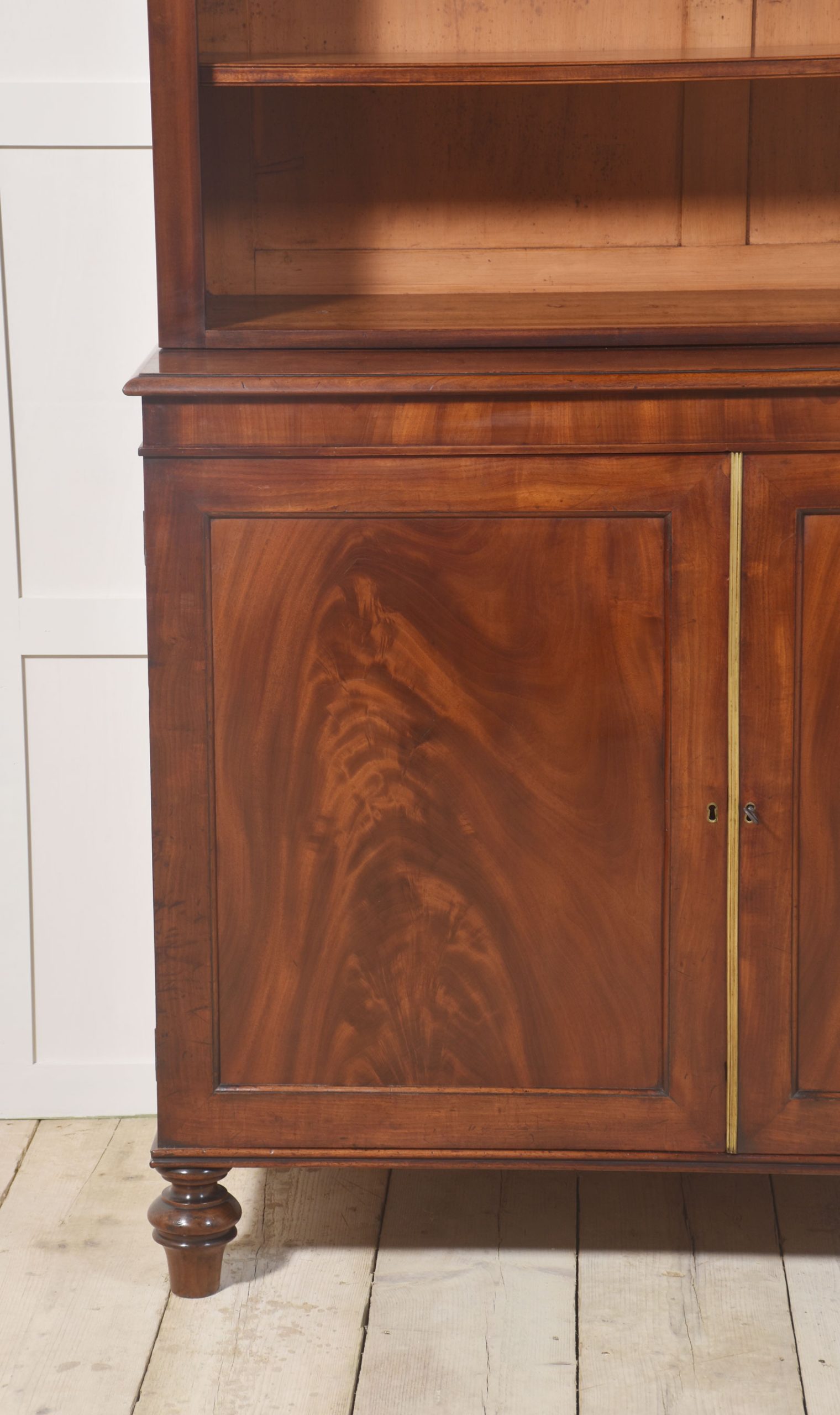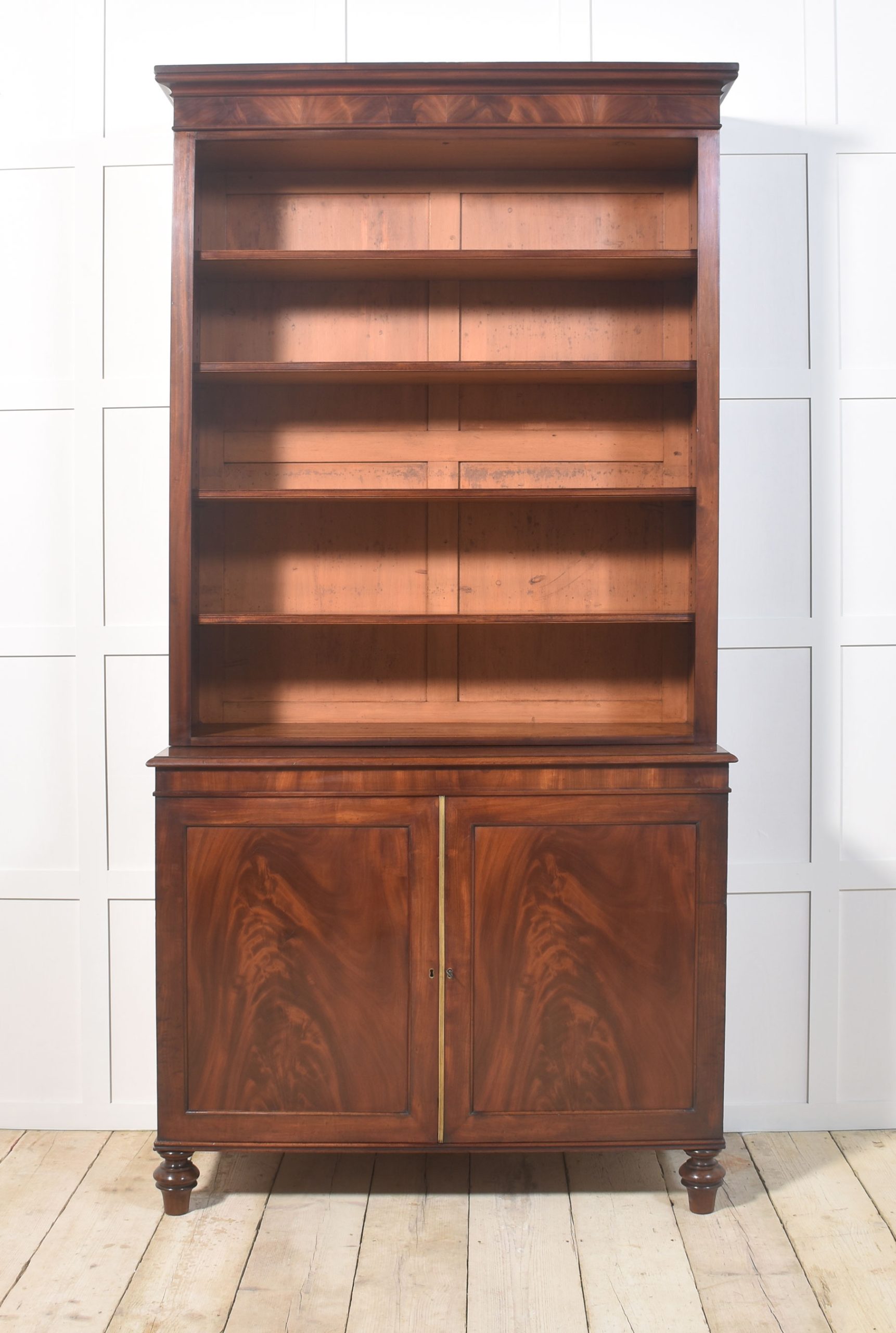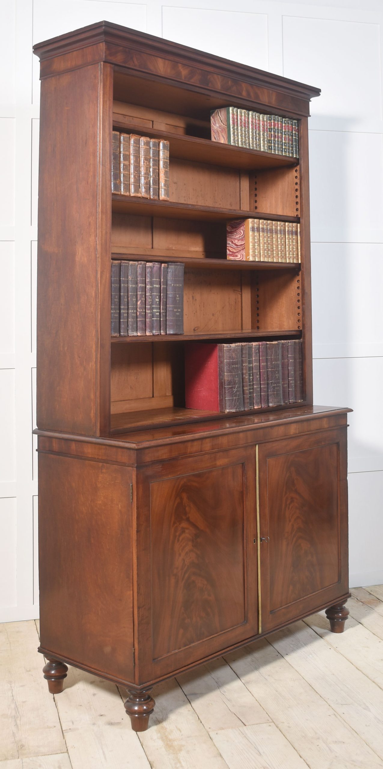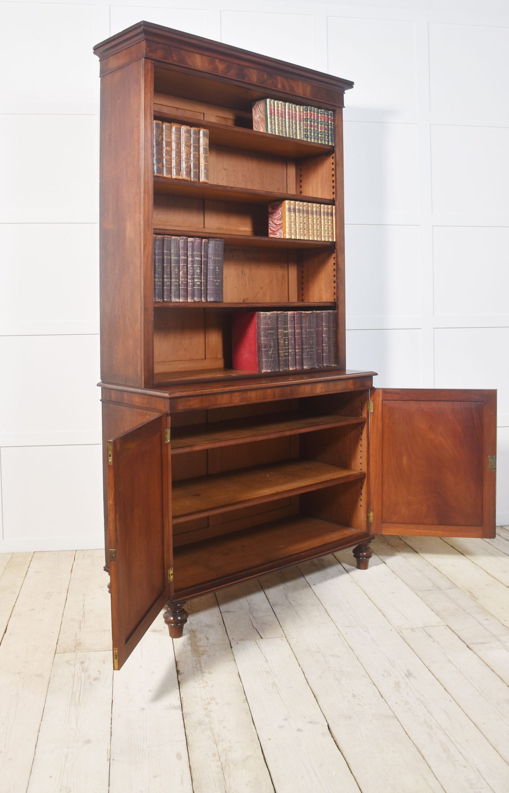 19th-century flame mahogany library bookcase, the moulded cornice above four adjustable shelves. The cupboard base formed with a pair of flame mahogany doors opening to reveal two shelves, all raised on turned feet.