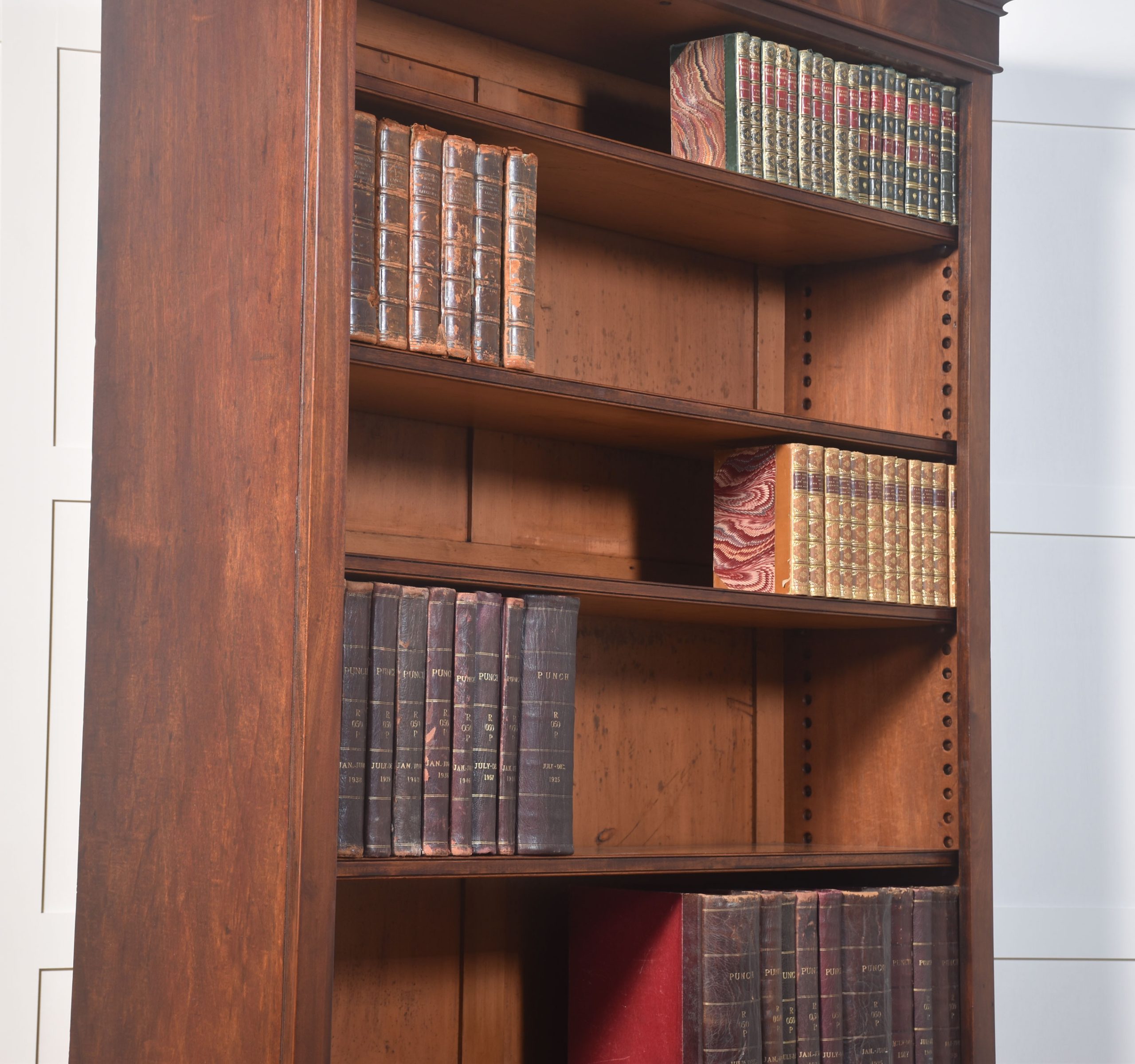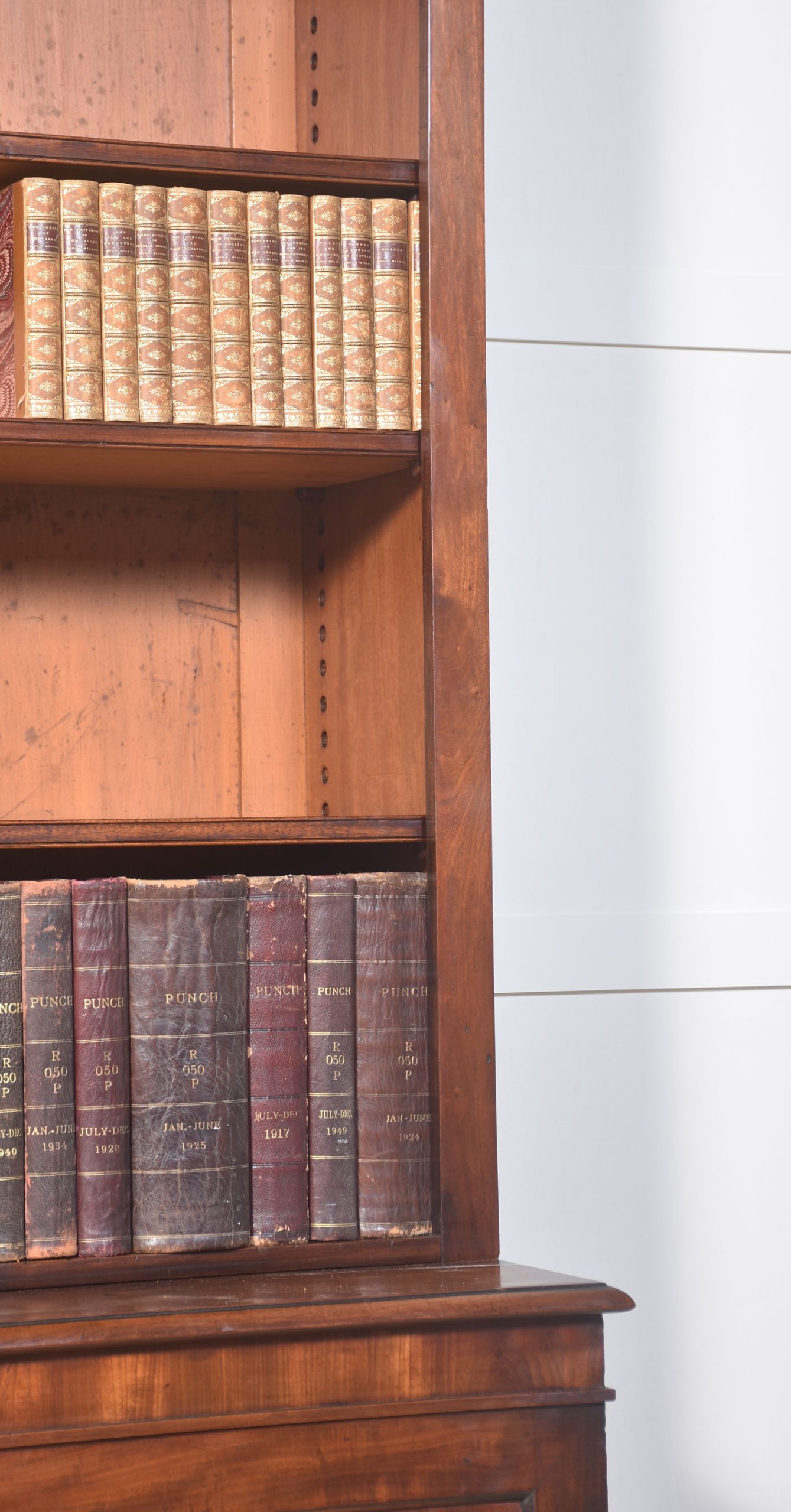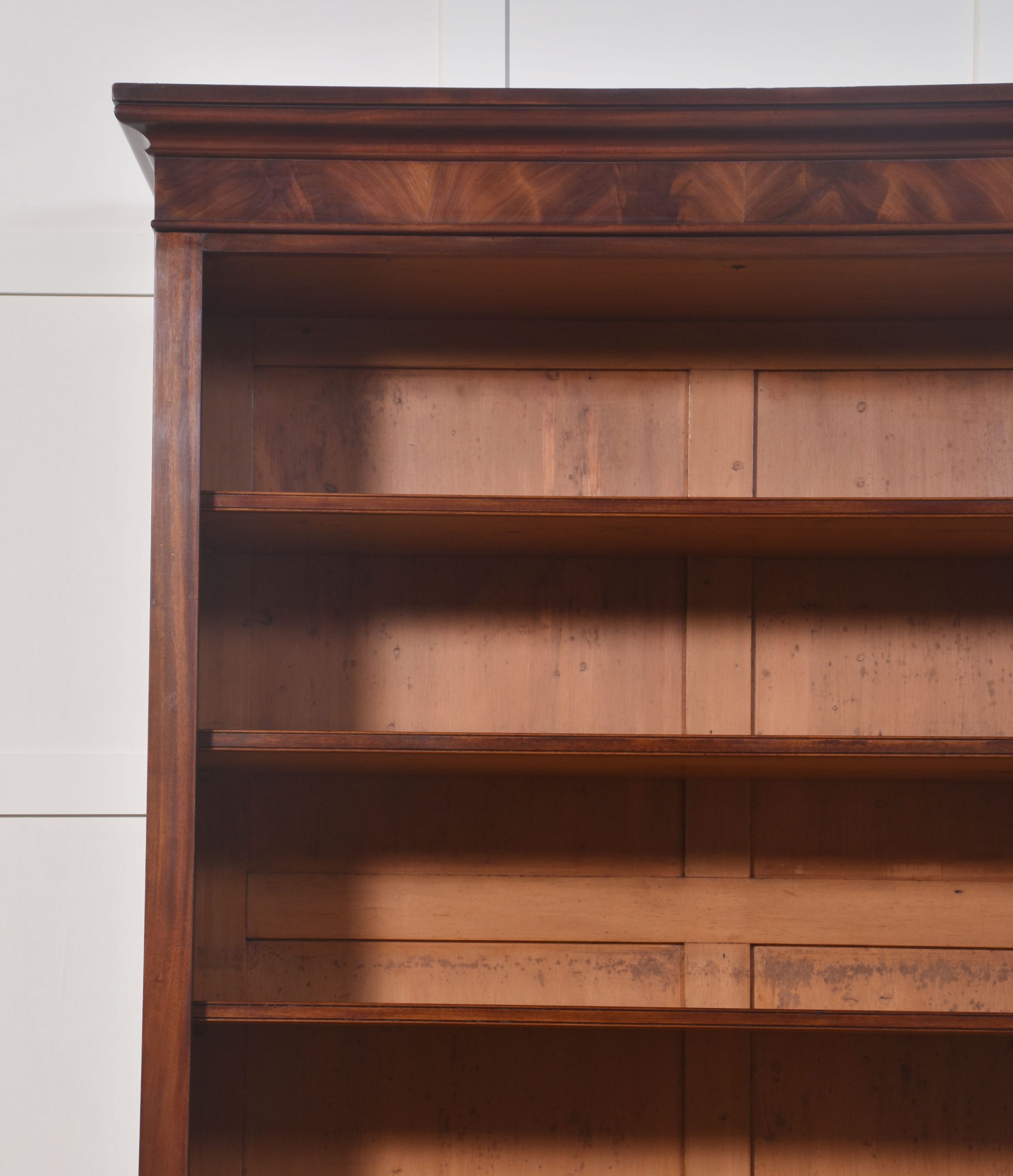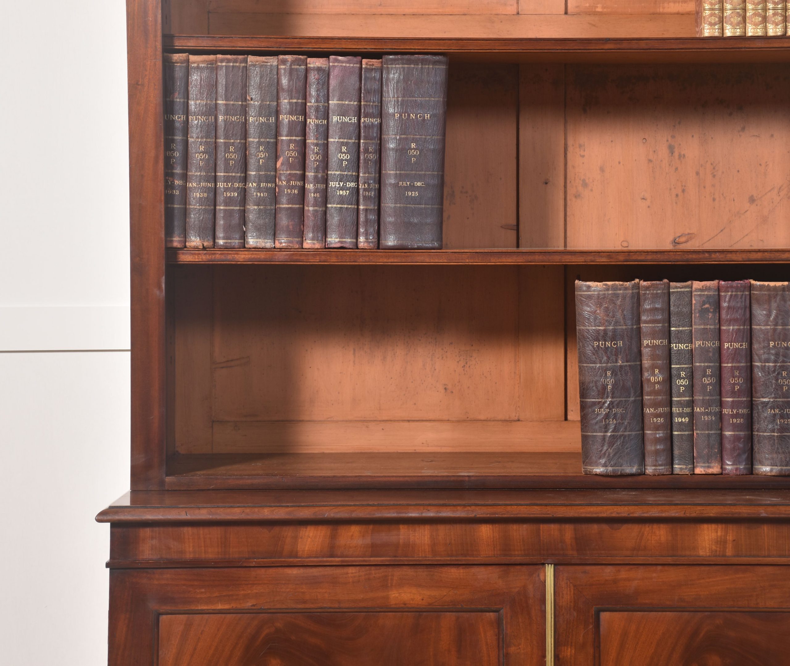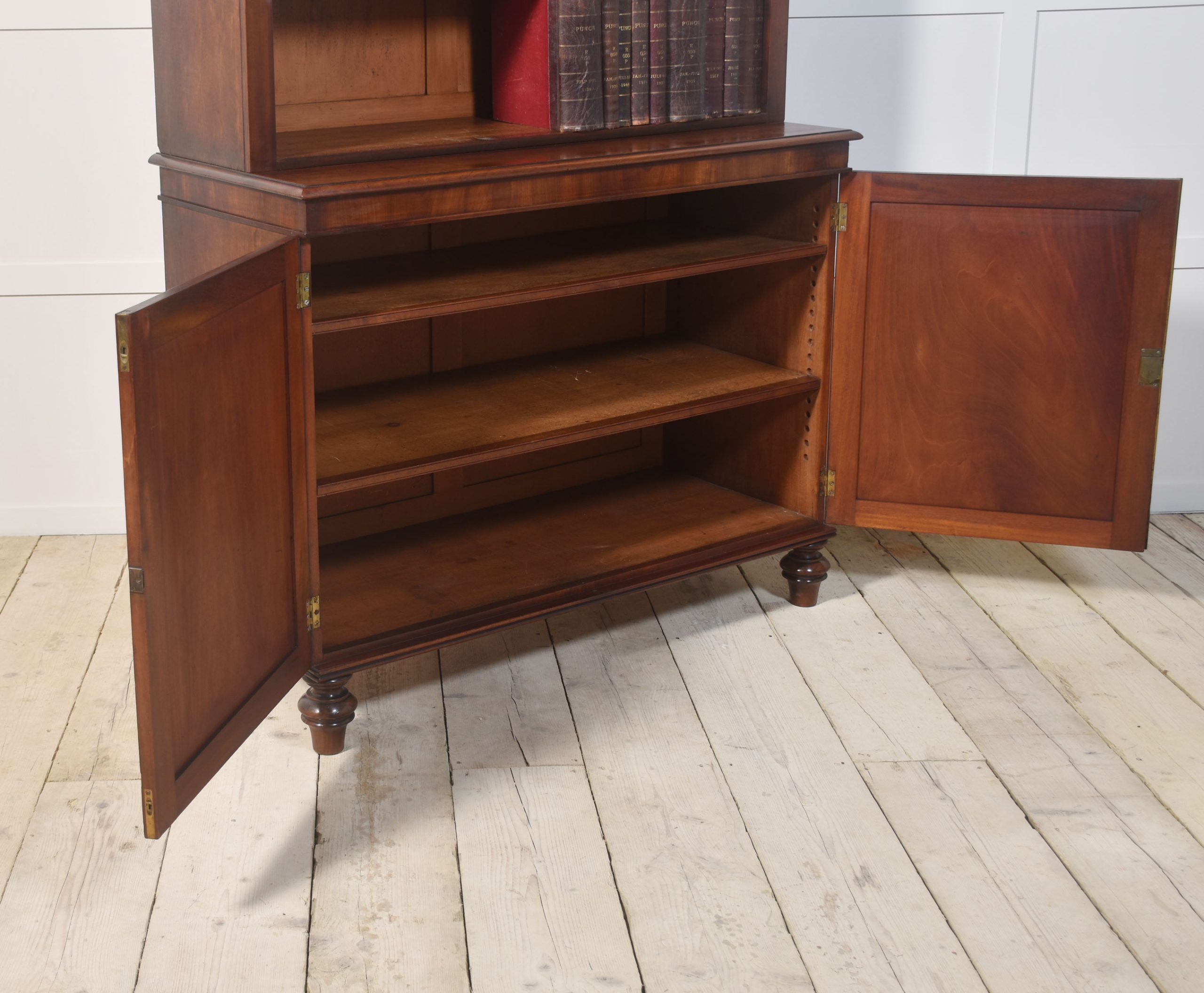 19th-century flame mahogany library bookcase, the moulded cornice above four adjustable shelves. The cupboard base formed with a pair of flame mahogany doors opening to reveal two shelves, all raised on turned feet.