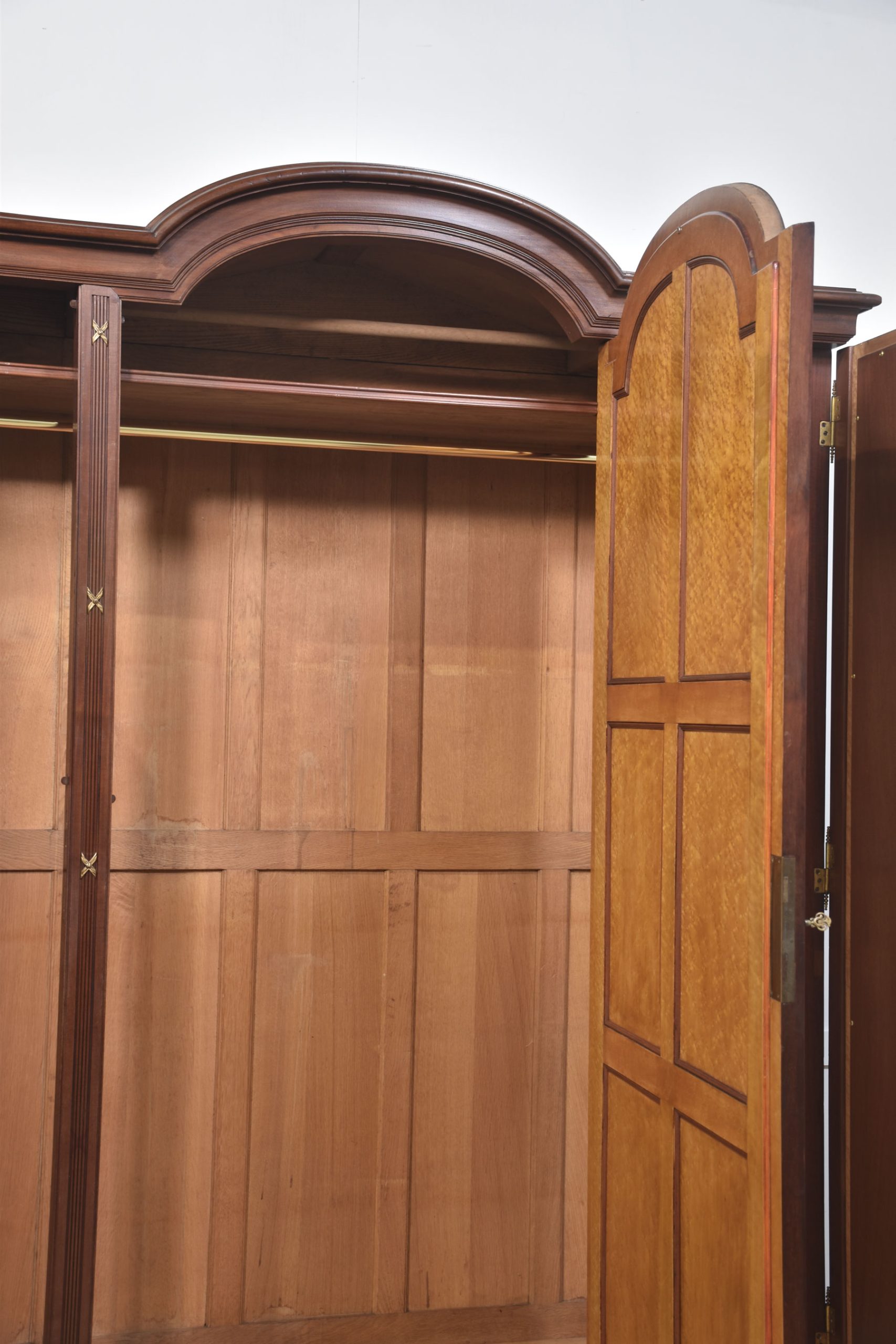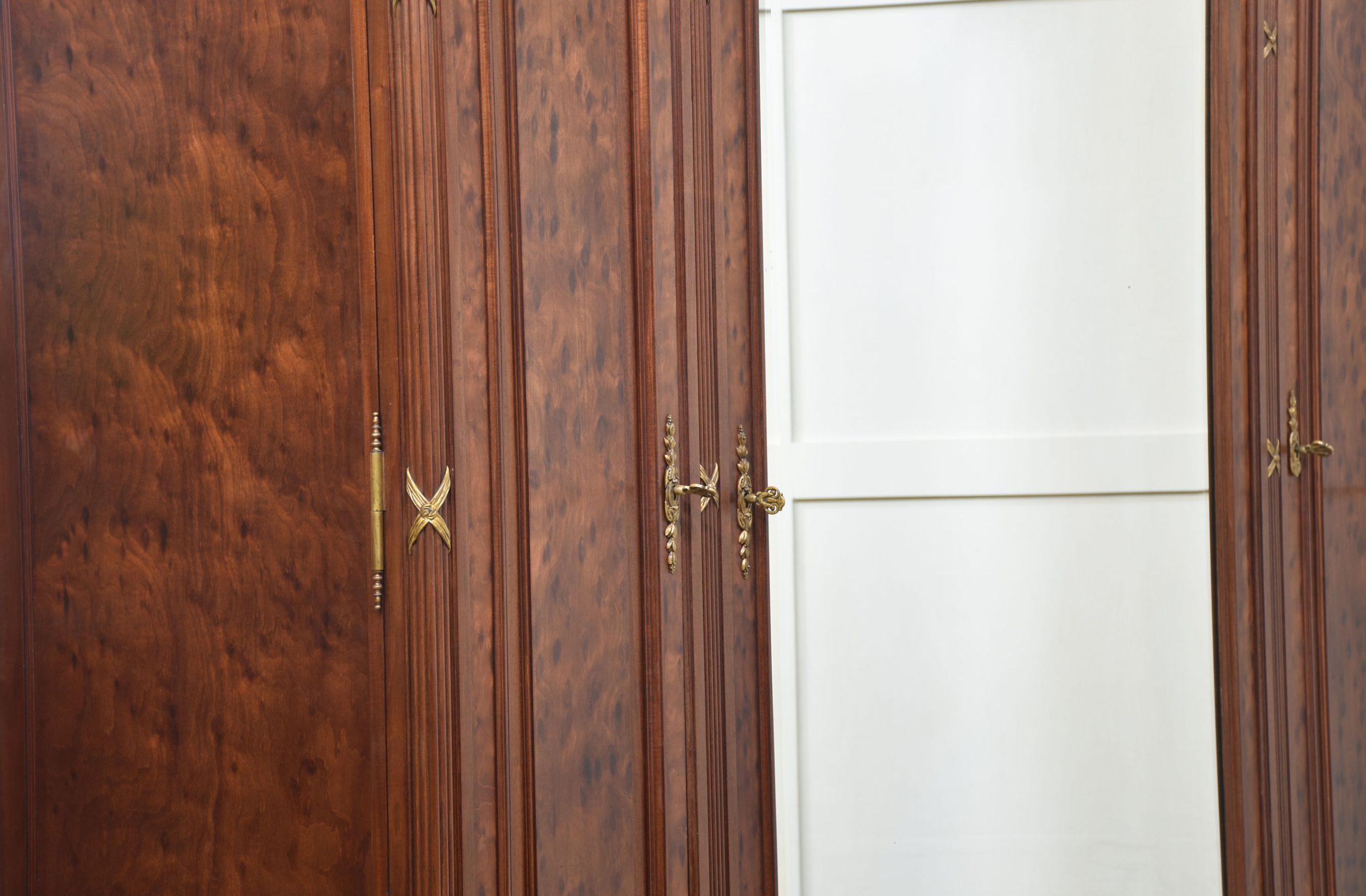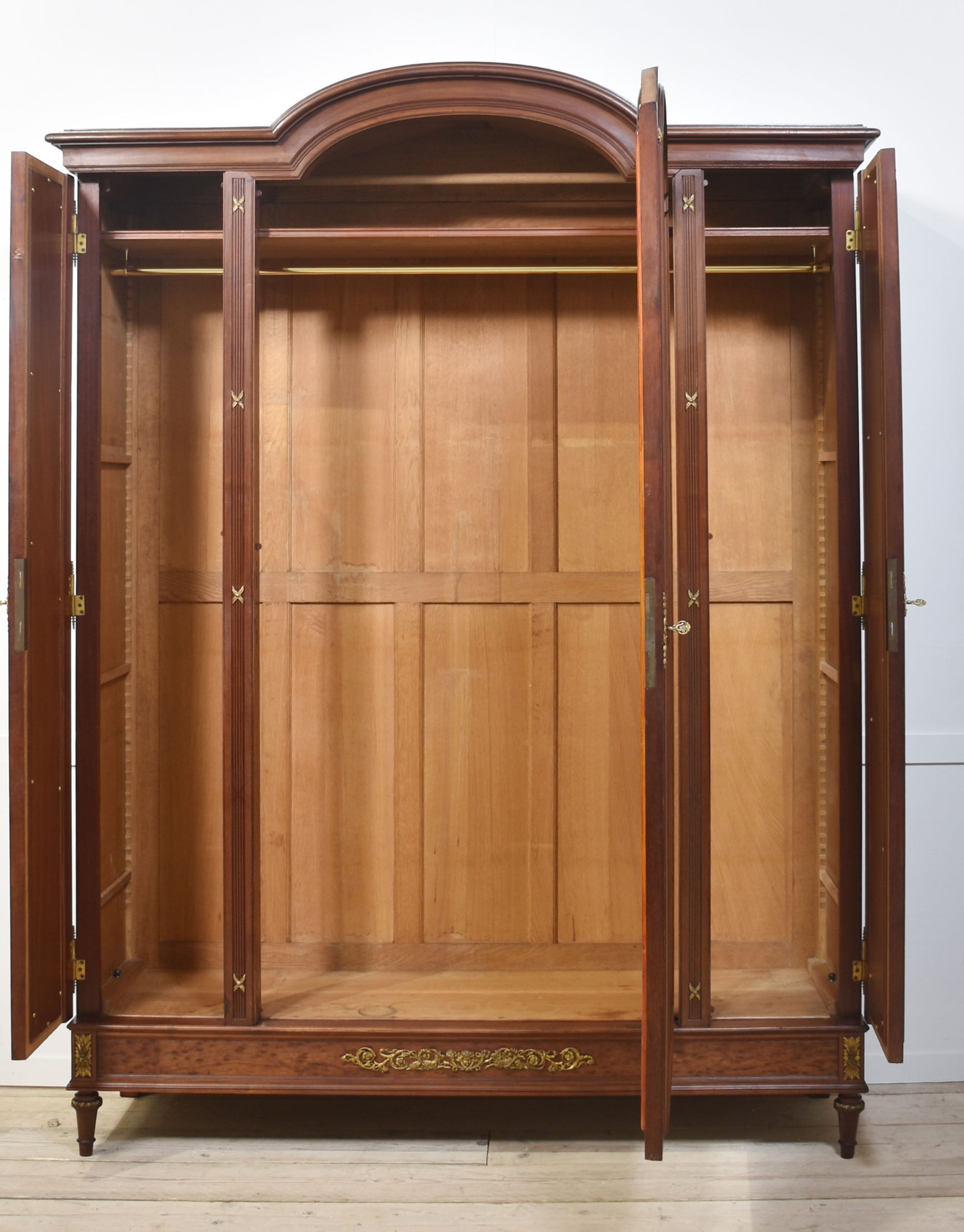 19th Century French Louis XVI Mahogany and Gilt Bronze Armoire, the dome top above a large central bevelled mirror door flanked by two narrow well-figure panelled doors. Opening to reveal a large adjustable shelved interior. The shelves can be removed to create a large hanging area. To the base with foliated bronze mounts all raised up on fluted front legs.