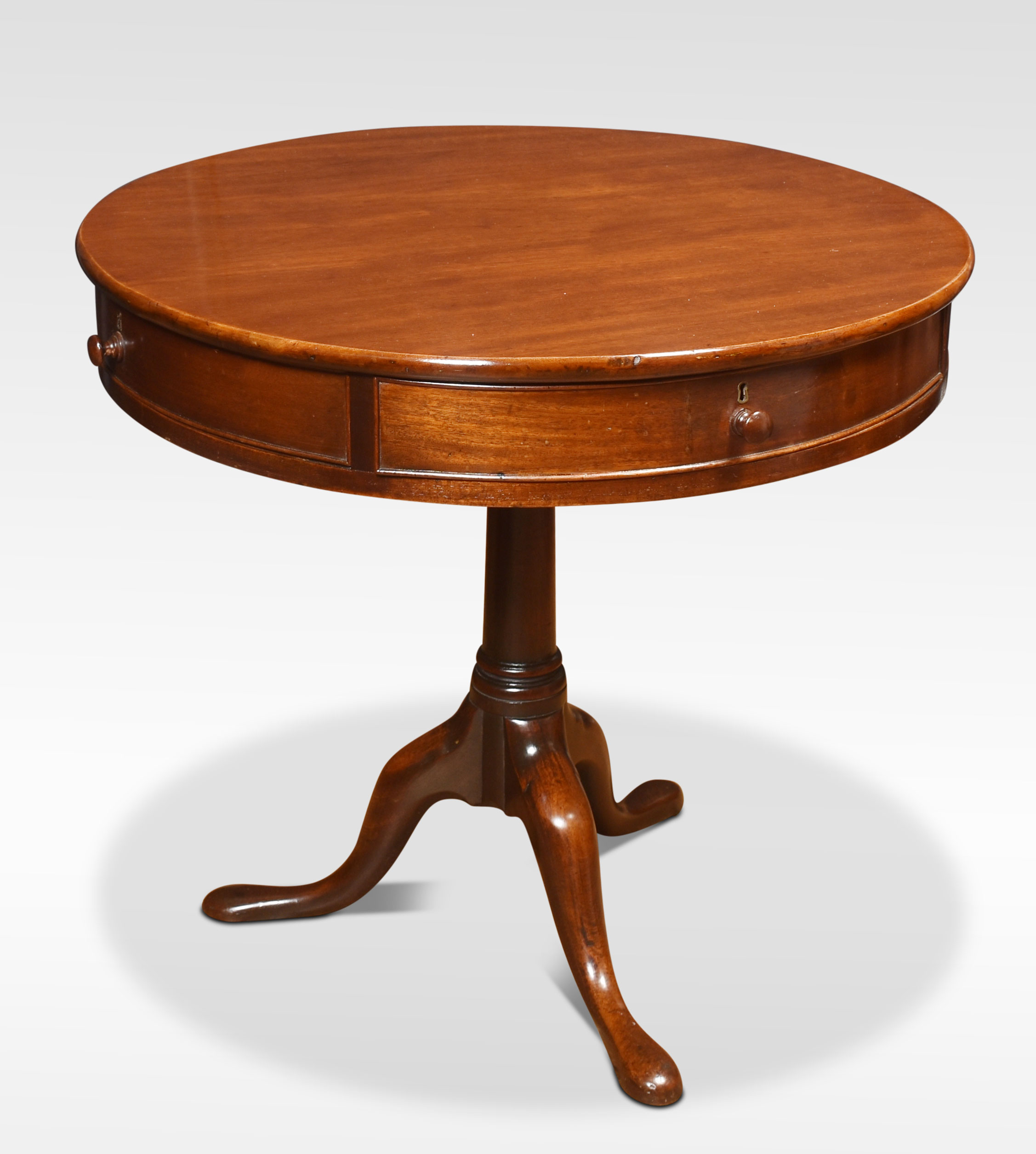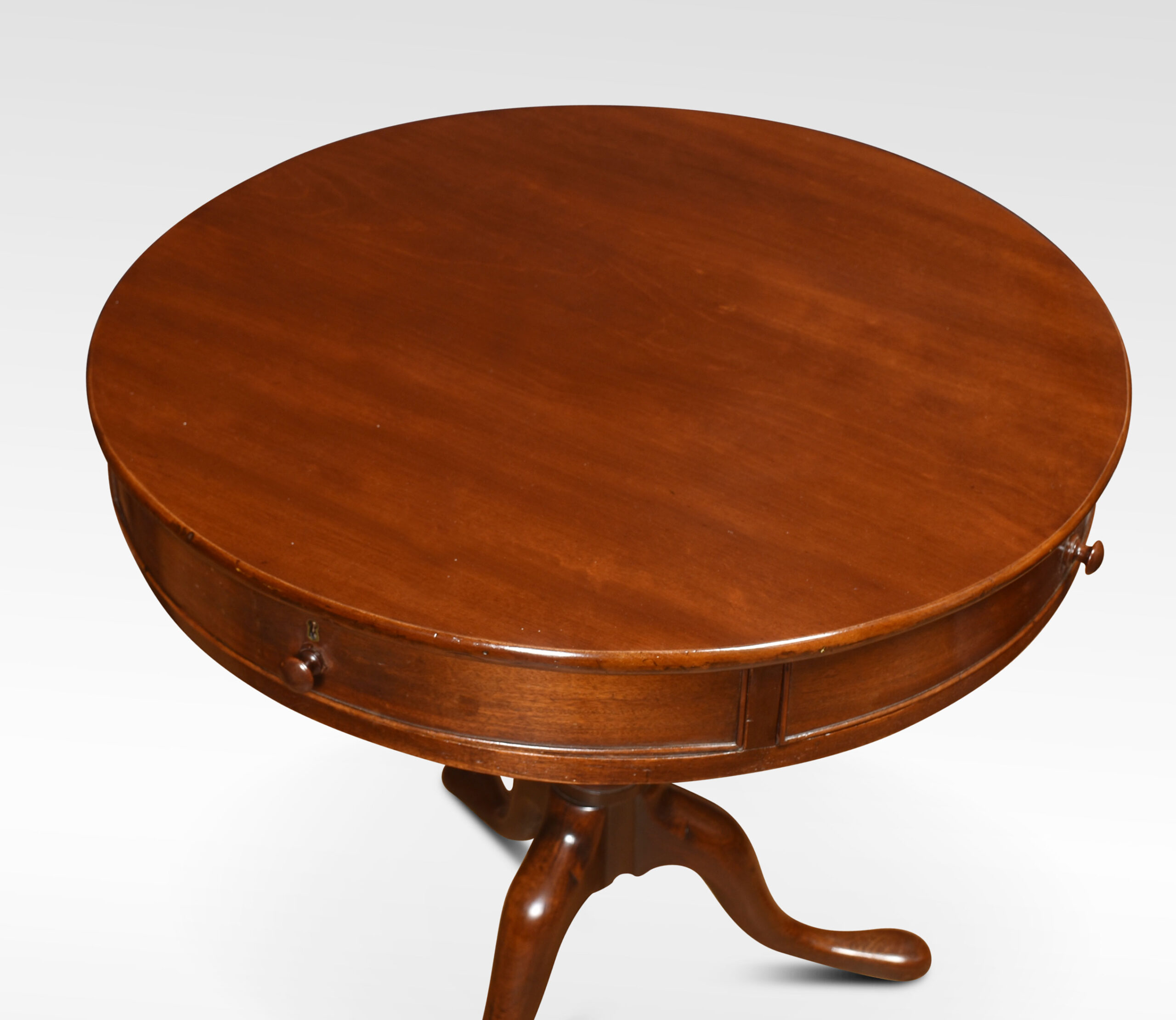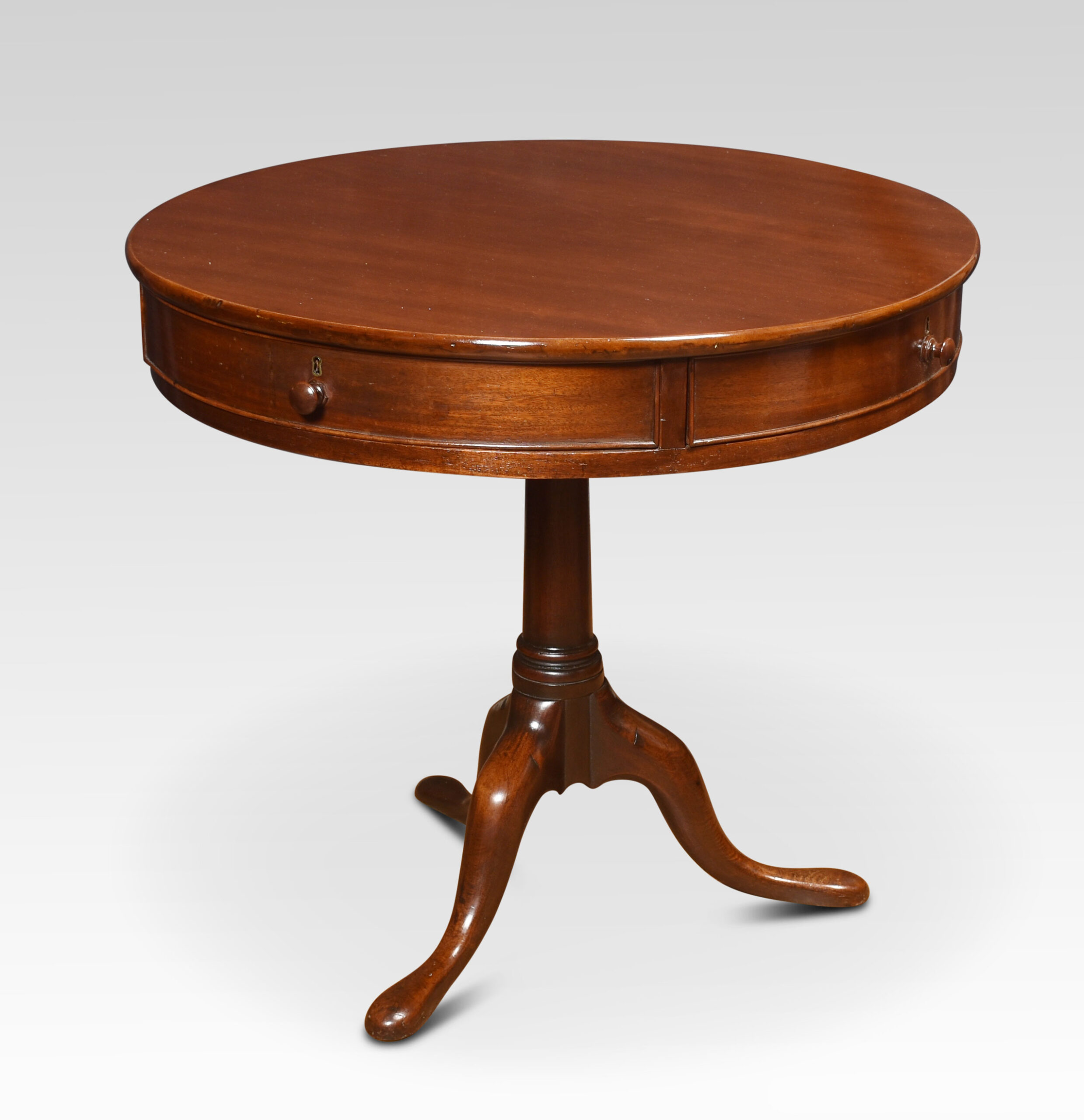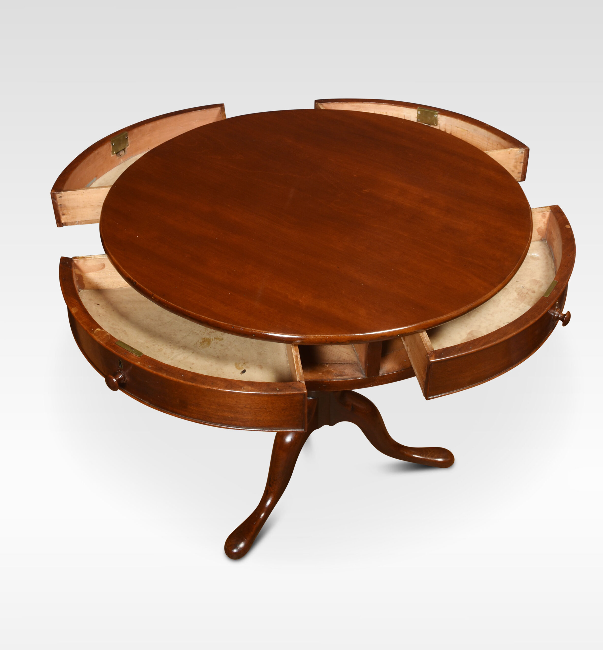 19th-century pedestal drum table. The circular mahogany top, above four frieze drawers with knob handles. All raised up on the turned stem and cabriole legs terminating in pad feet.