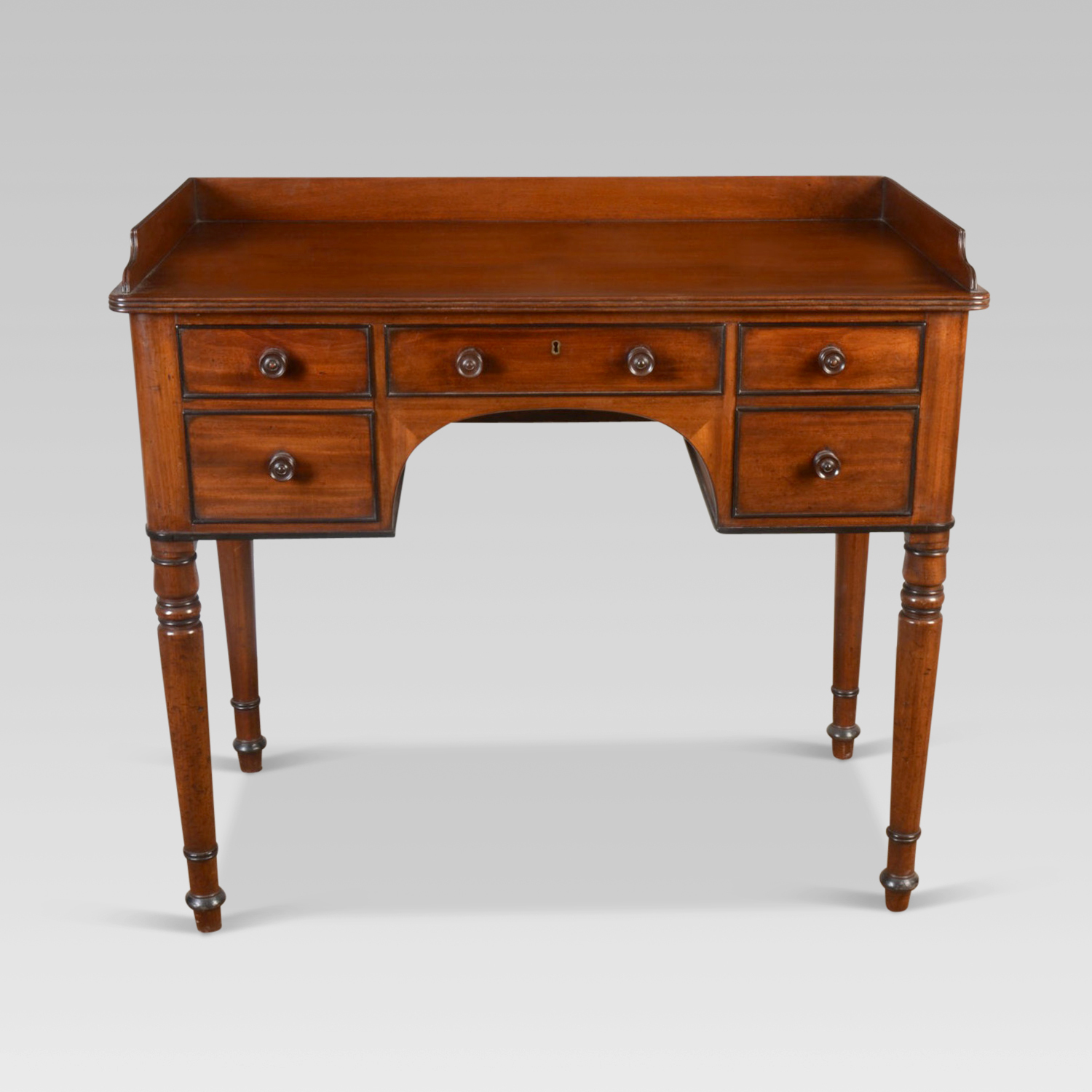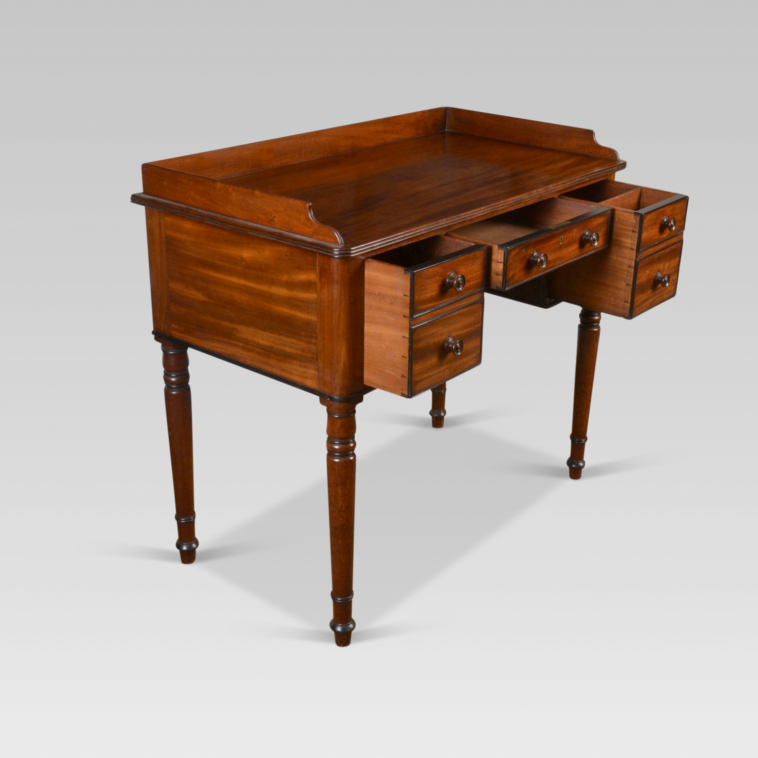 Mahogany and ebonised writing table / washstand. The rectangular top with reeded edge and low three-quarter gallery above a central short drawer, Flanked to either side by an arrangement of draws, with ebonised cock beading. All raised on four turned and tapering supports.