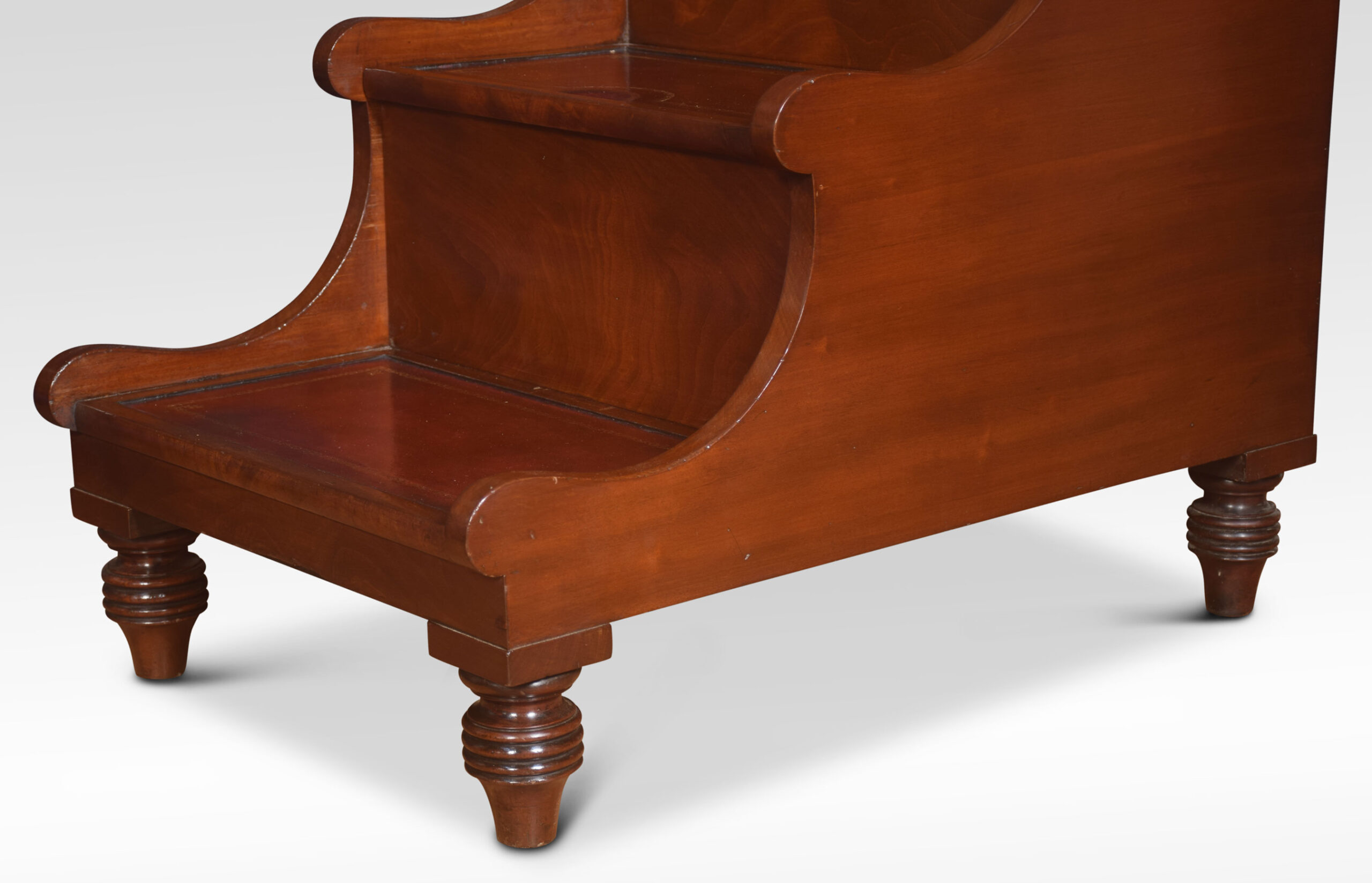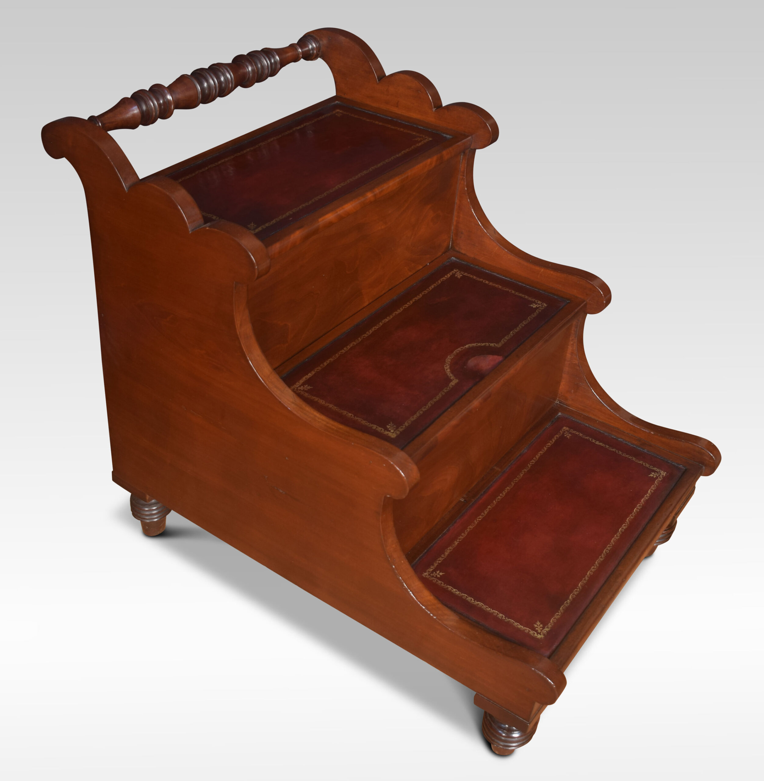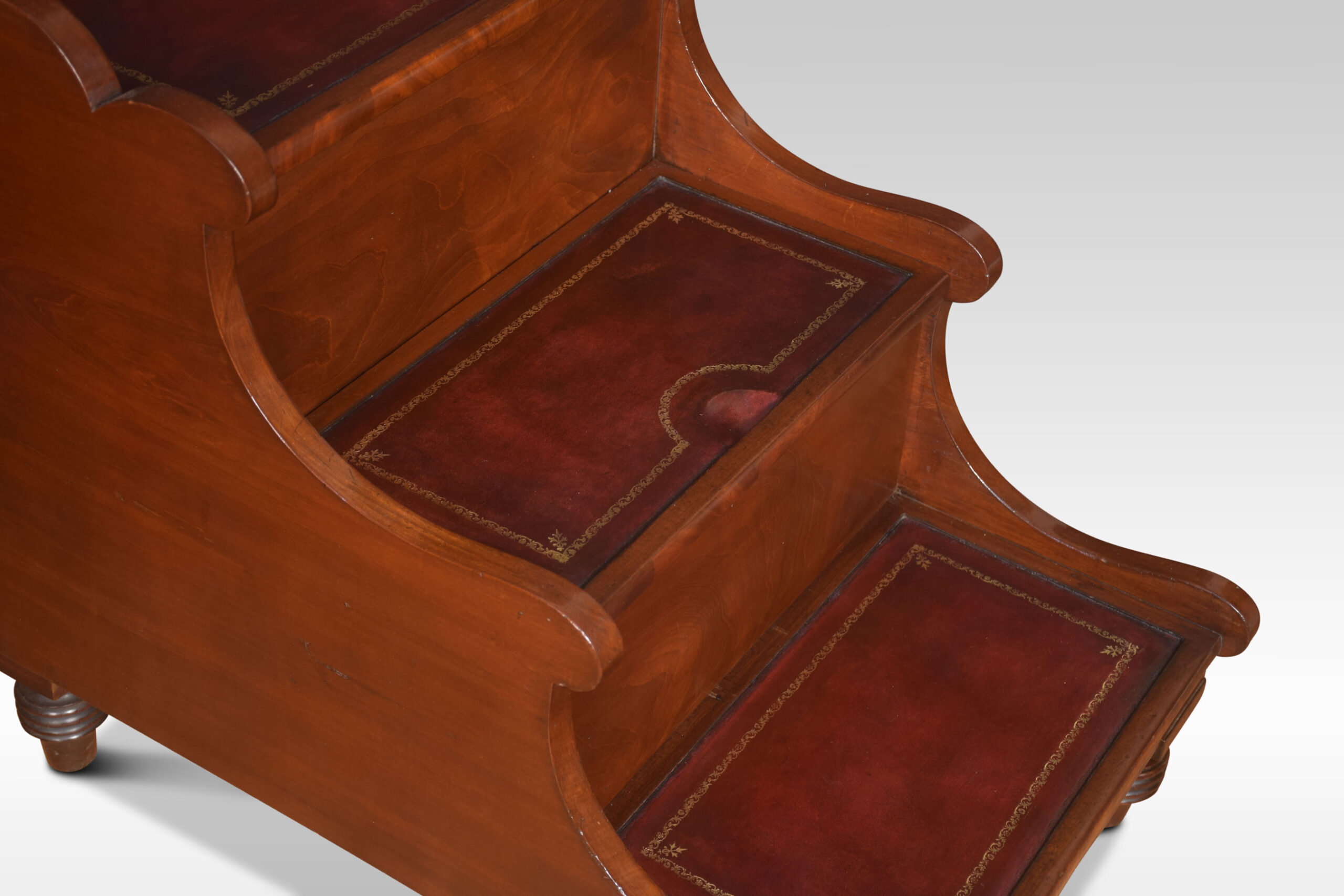 Set of substantial 19th-century mahogany bedside steps, the three treads inset with a replaced burgundy tooled hide. raised up on four mahogany-turned legs.