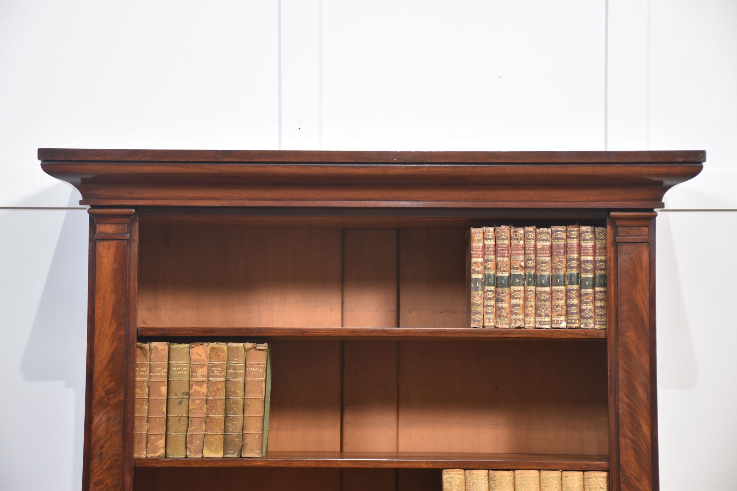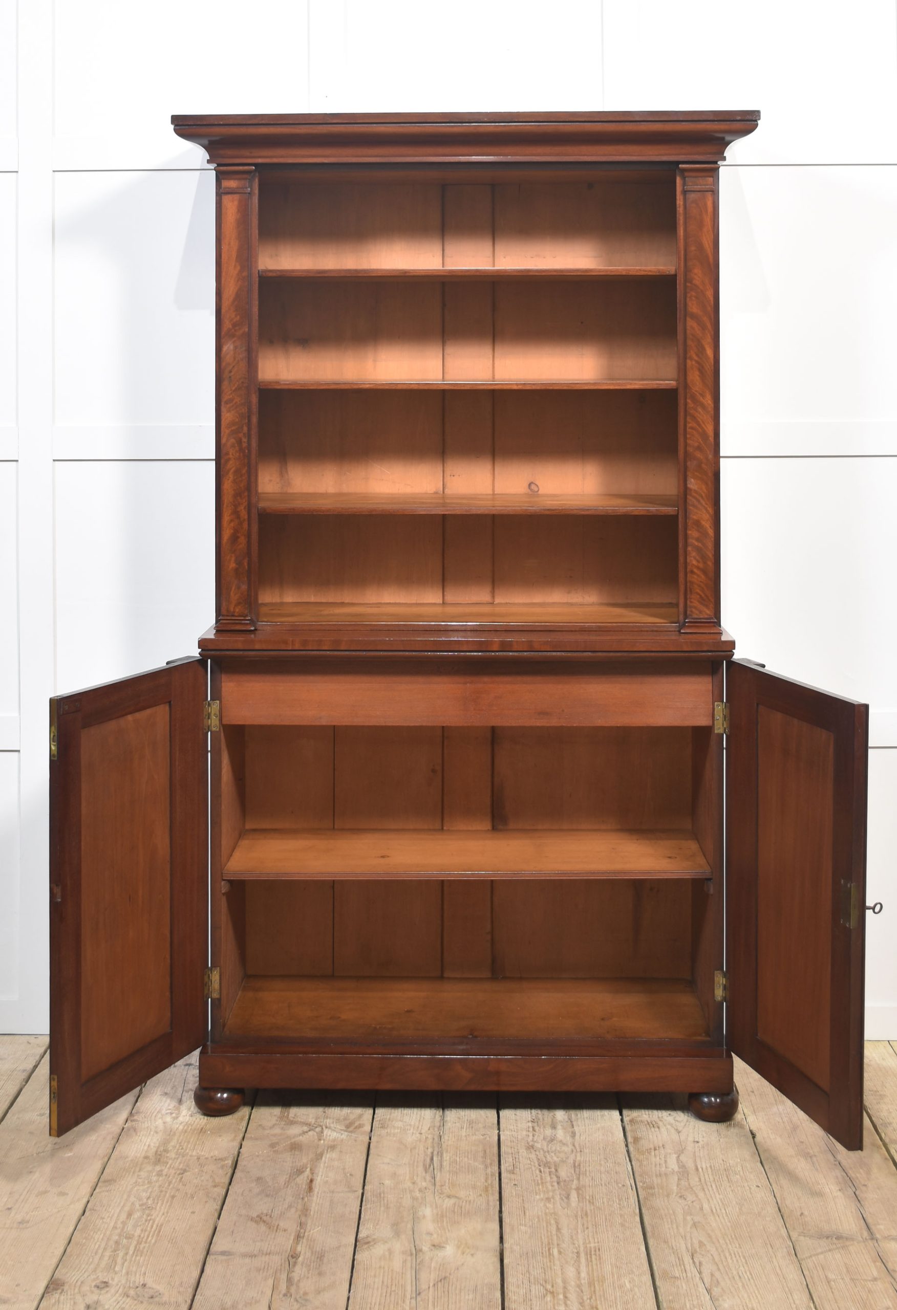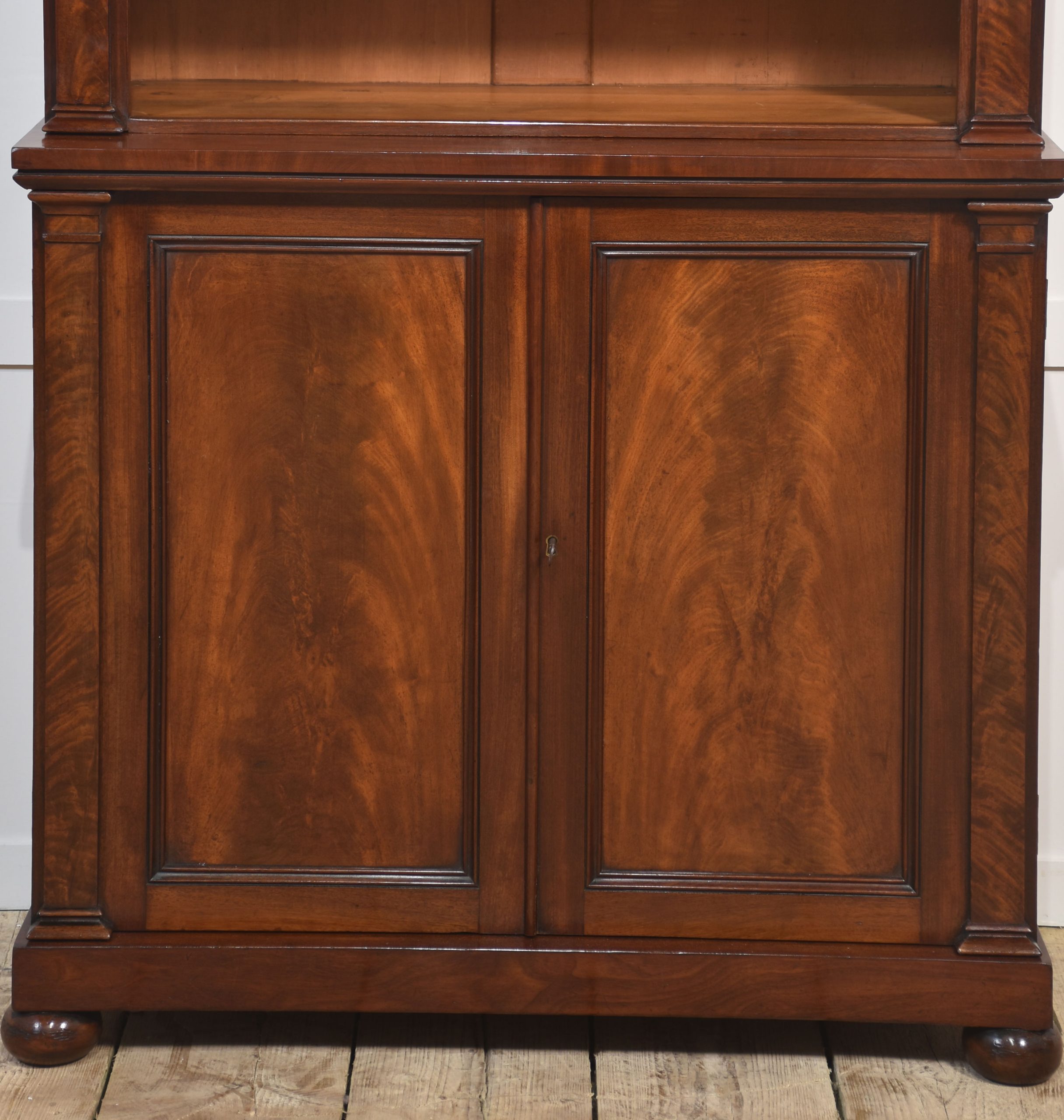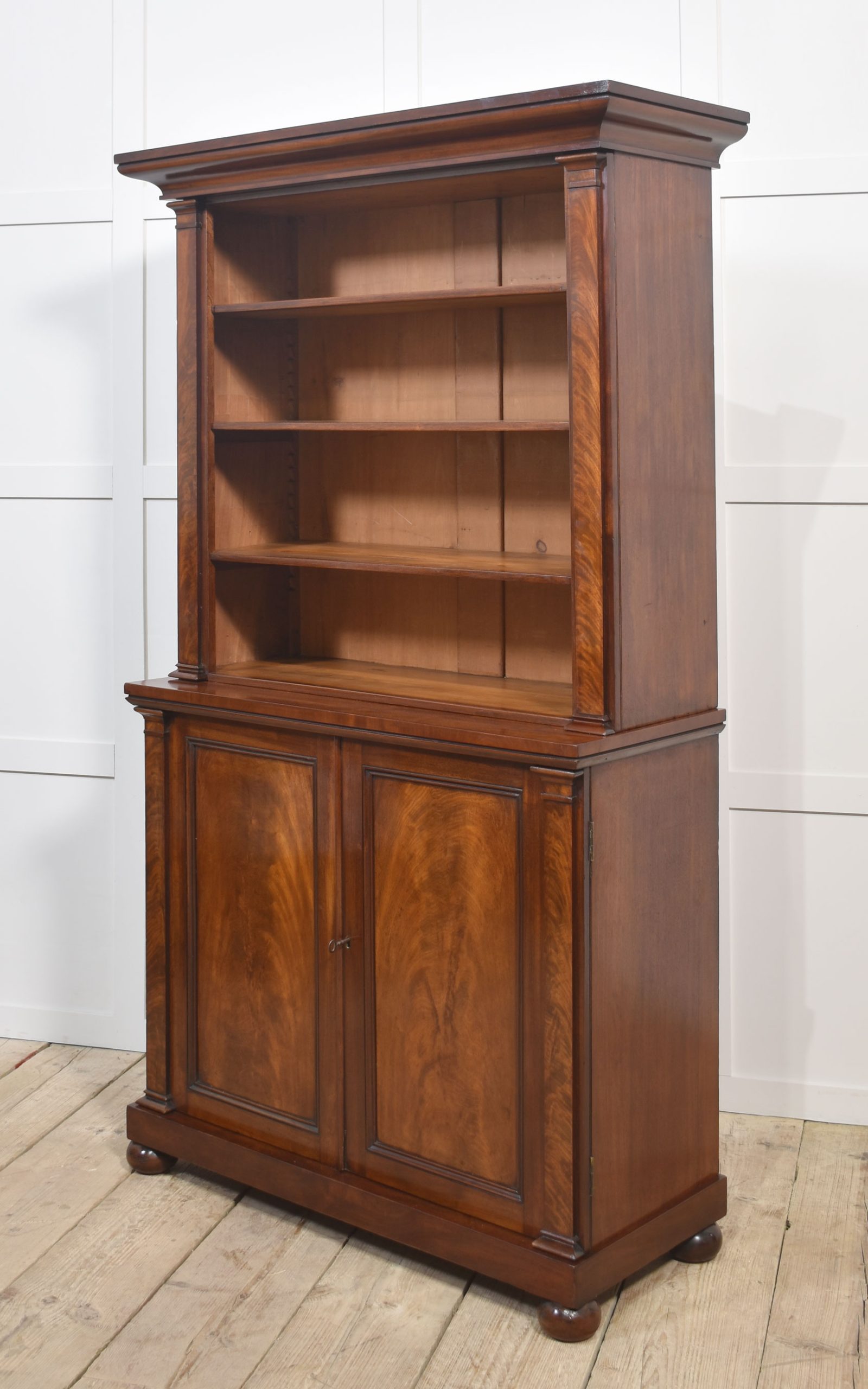 19th-century mahogany open bookcase, the rectangular top with moulded cornice above the adjustable shelved interior flanked by mahogany columns. To the base fitted with a pair of well-figured panelled doors opening to reveal a long drawer with a cupboard below fitted with a single fixed shelf. All raised up on bun feet.
