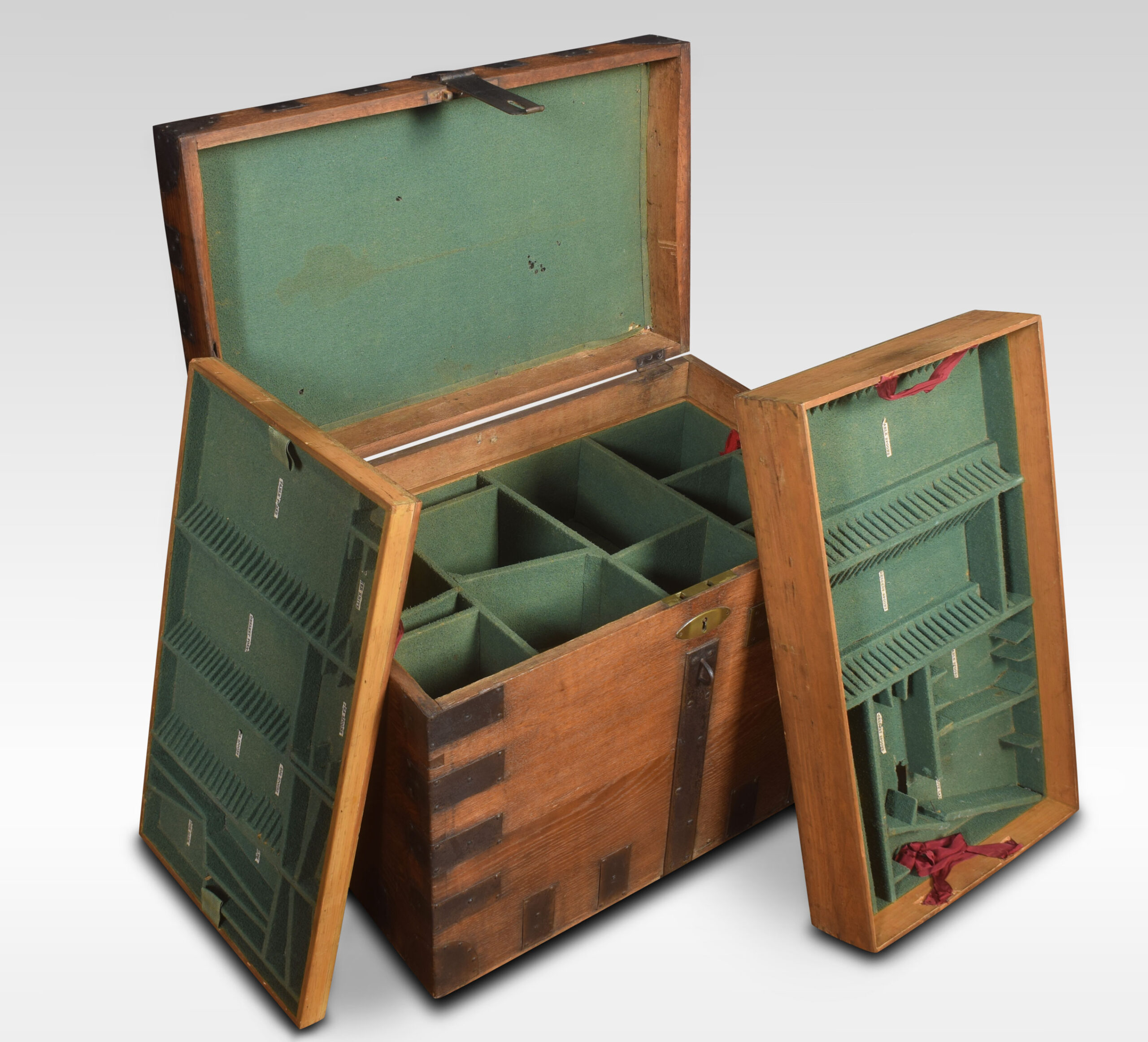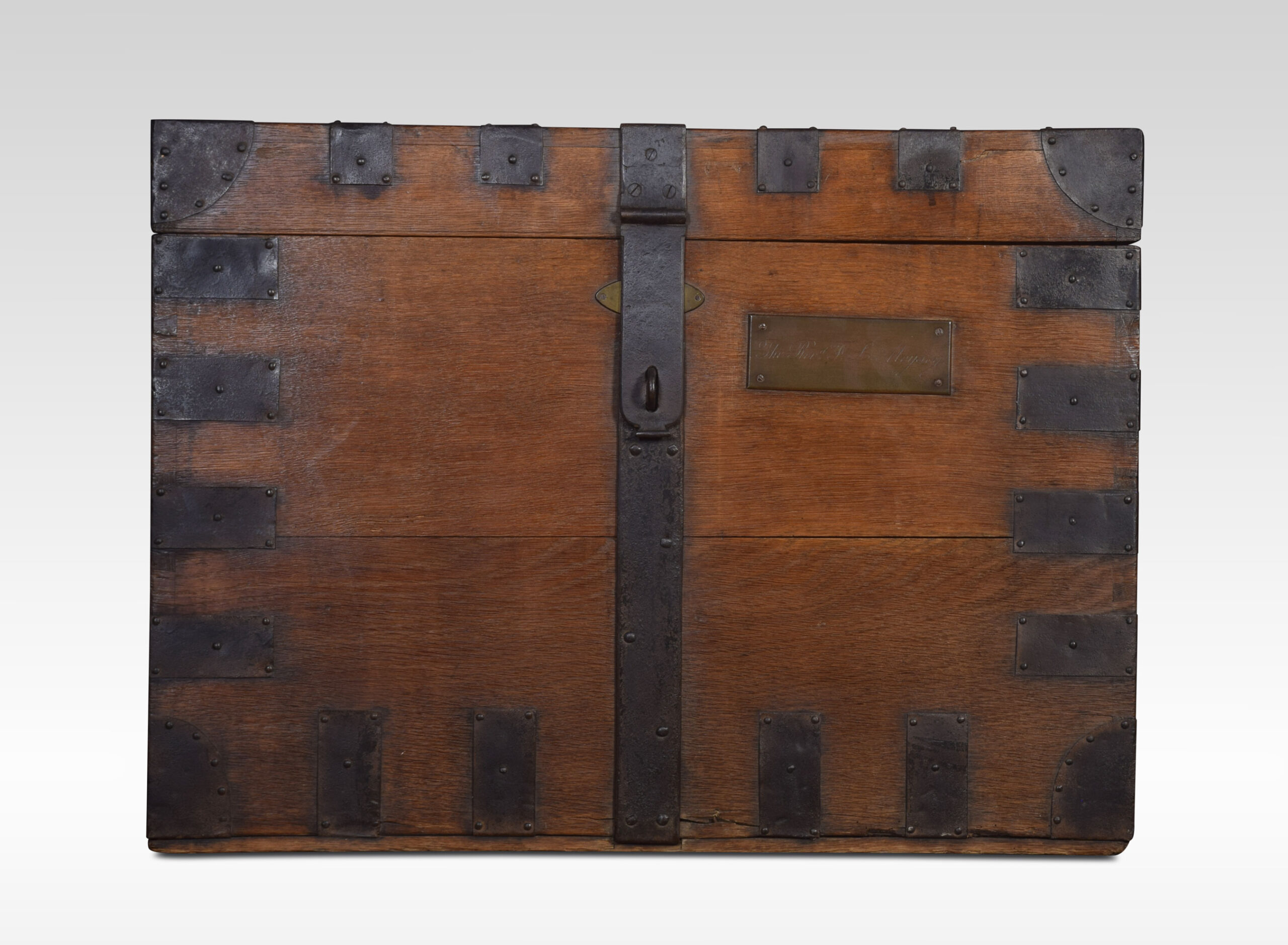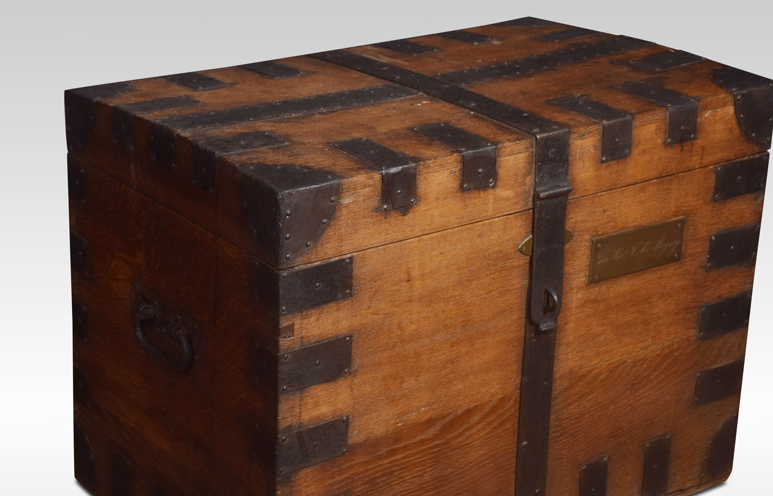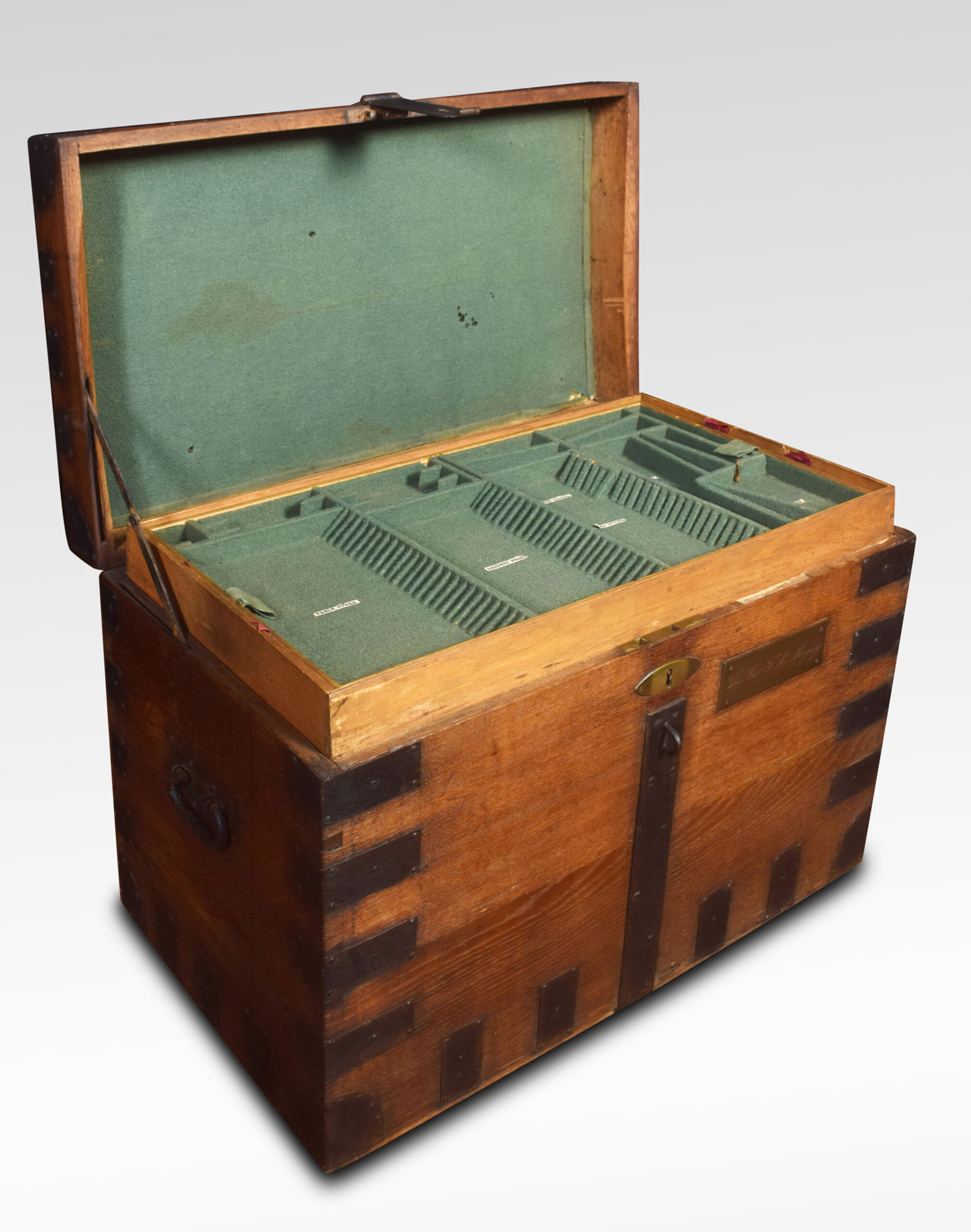 19th century oak and metal bound silver chest, applied with iron side swing handles and corner brackets, opening to an arrangement of four compartmentalised removable trays.