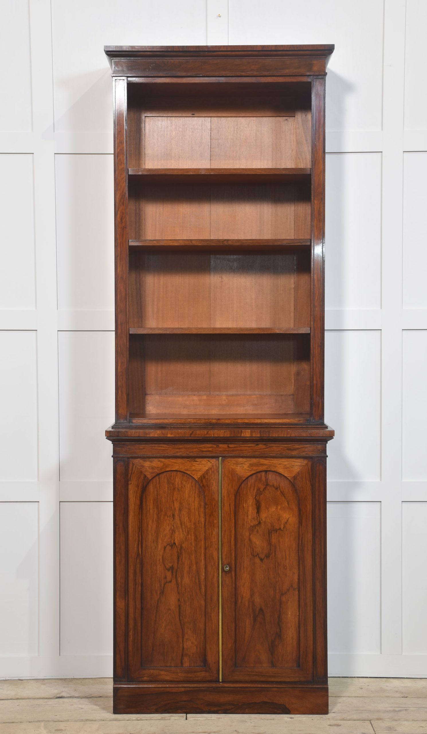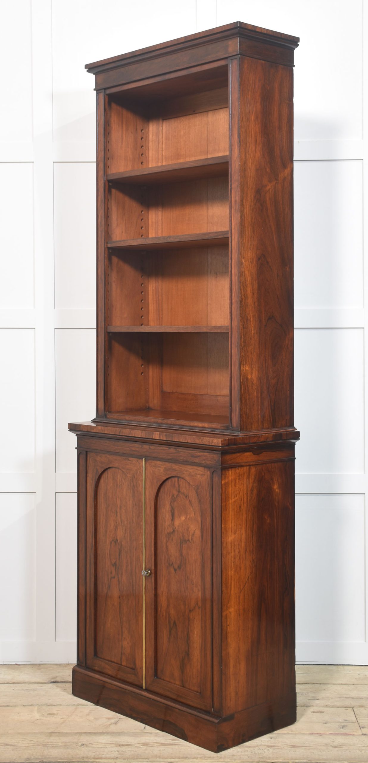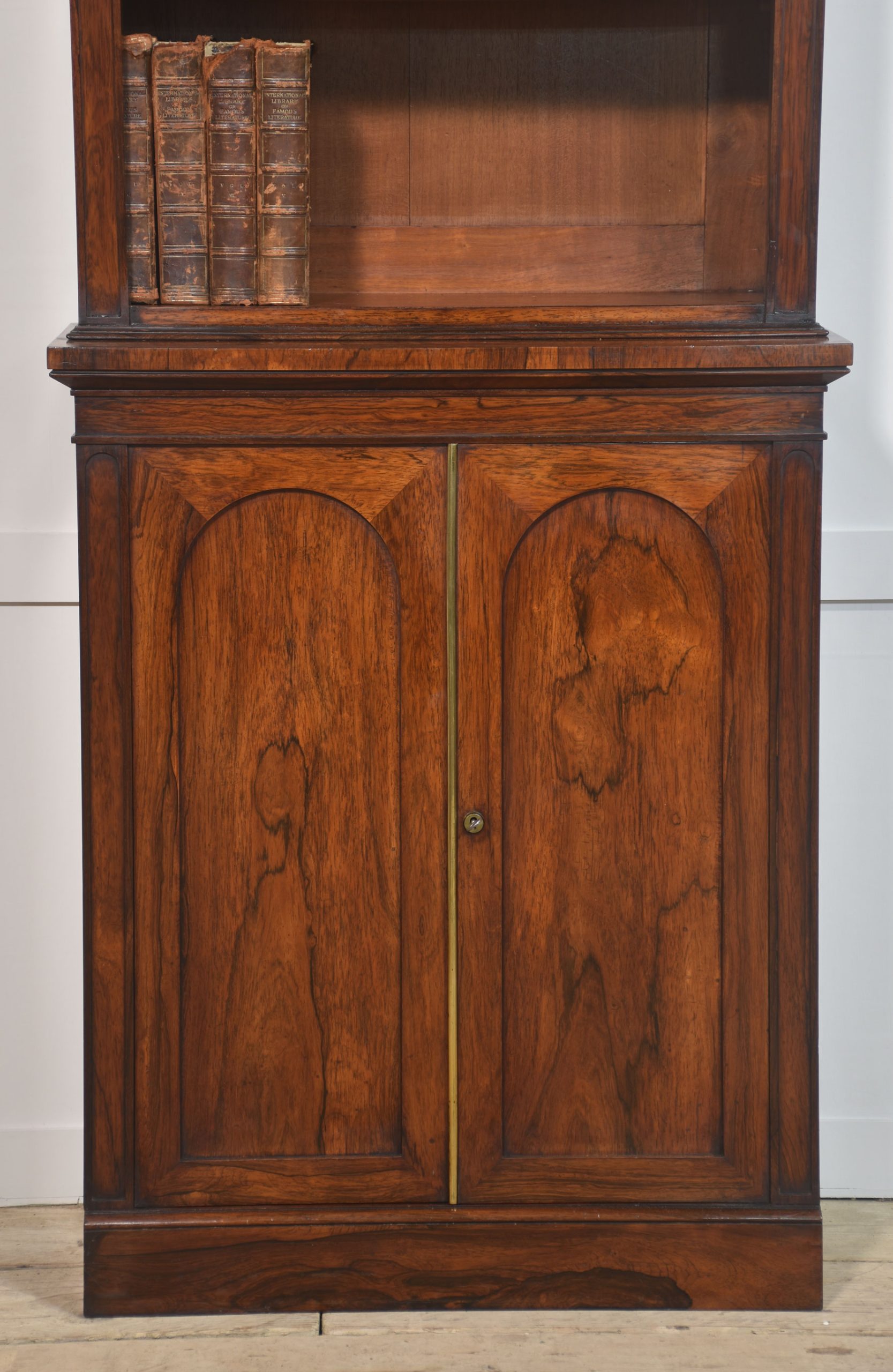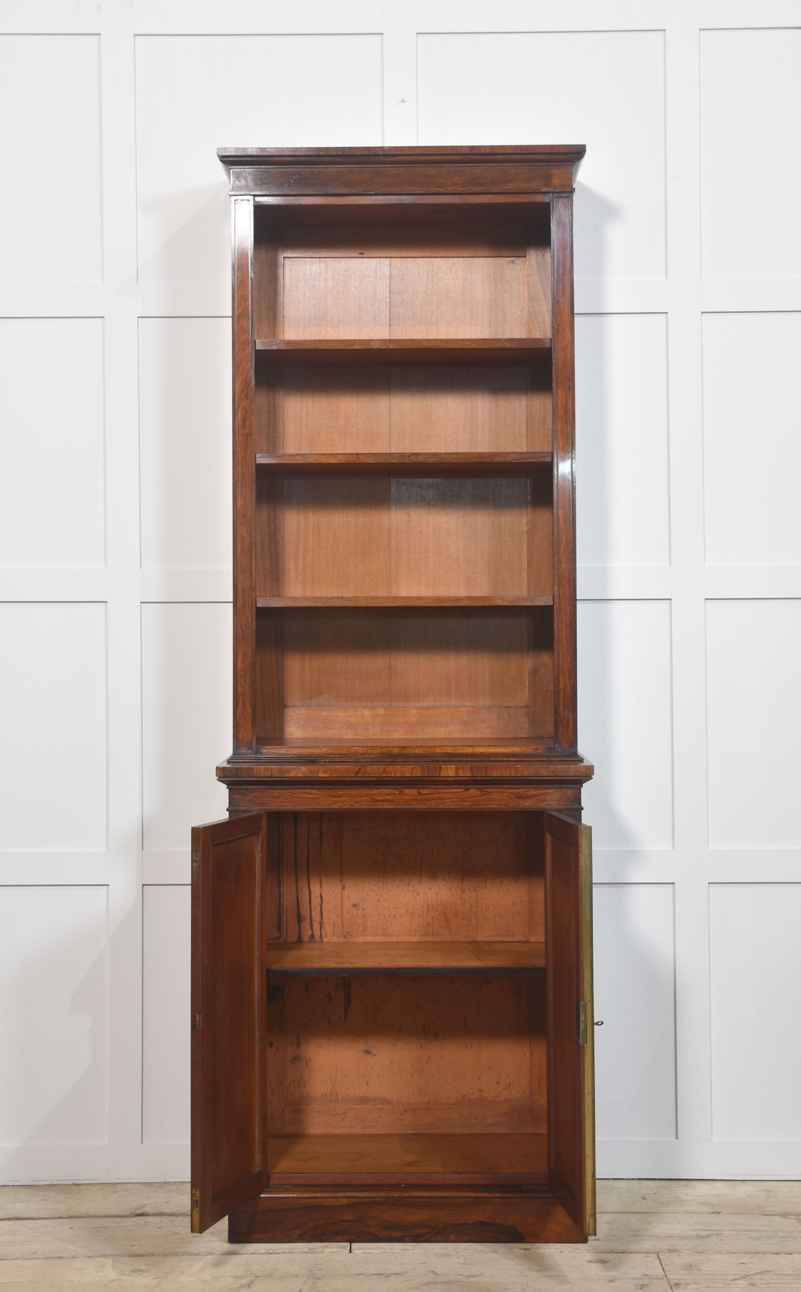 19th-century bookcase, the moulded cornice above the adjustable shelved interior encased by a rosewood frame. To the base fitted with well-figured panneled doors opening to reveal further storage. All raised on a plinth base.