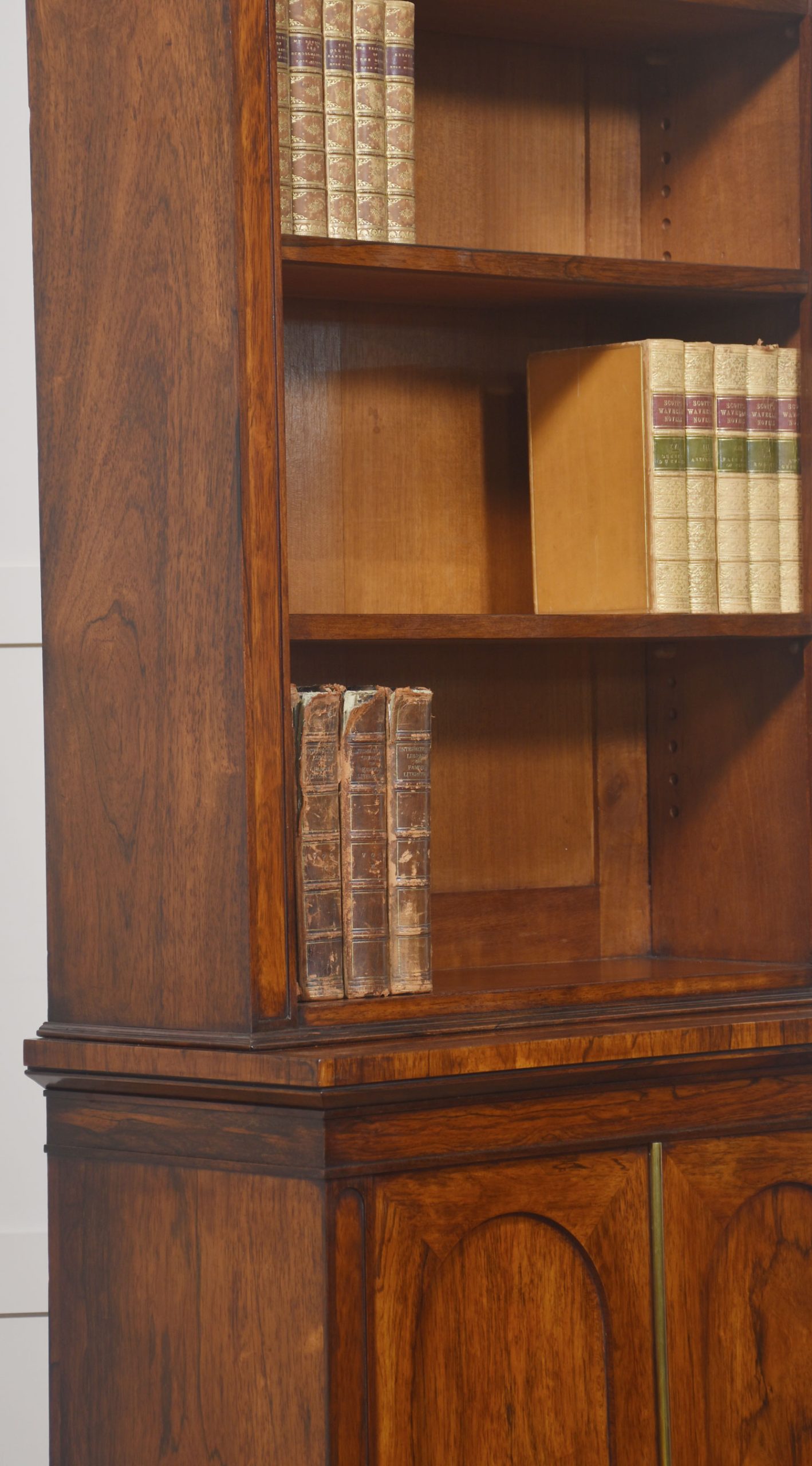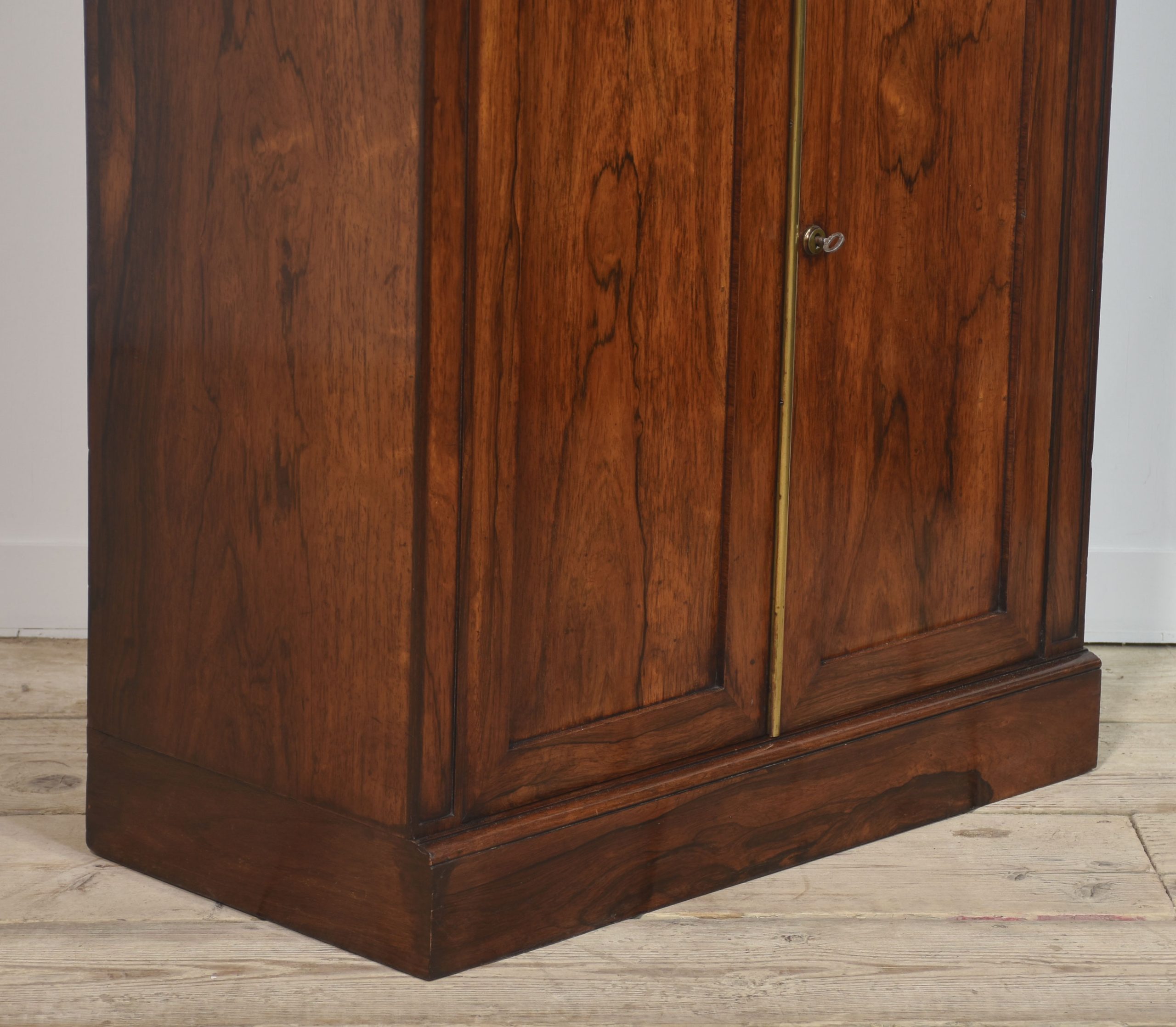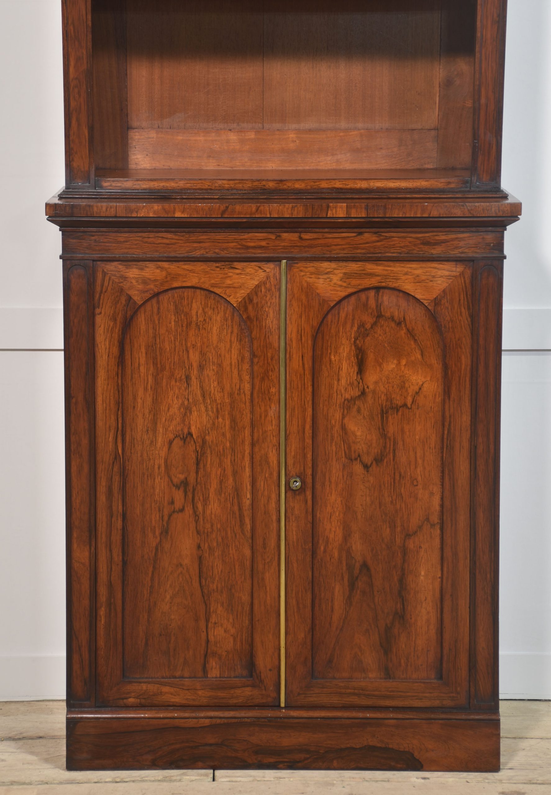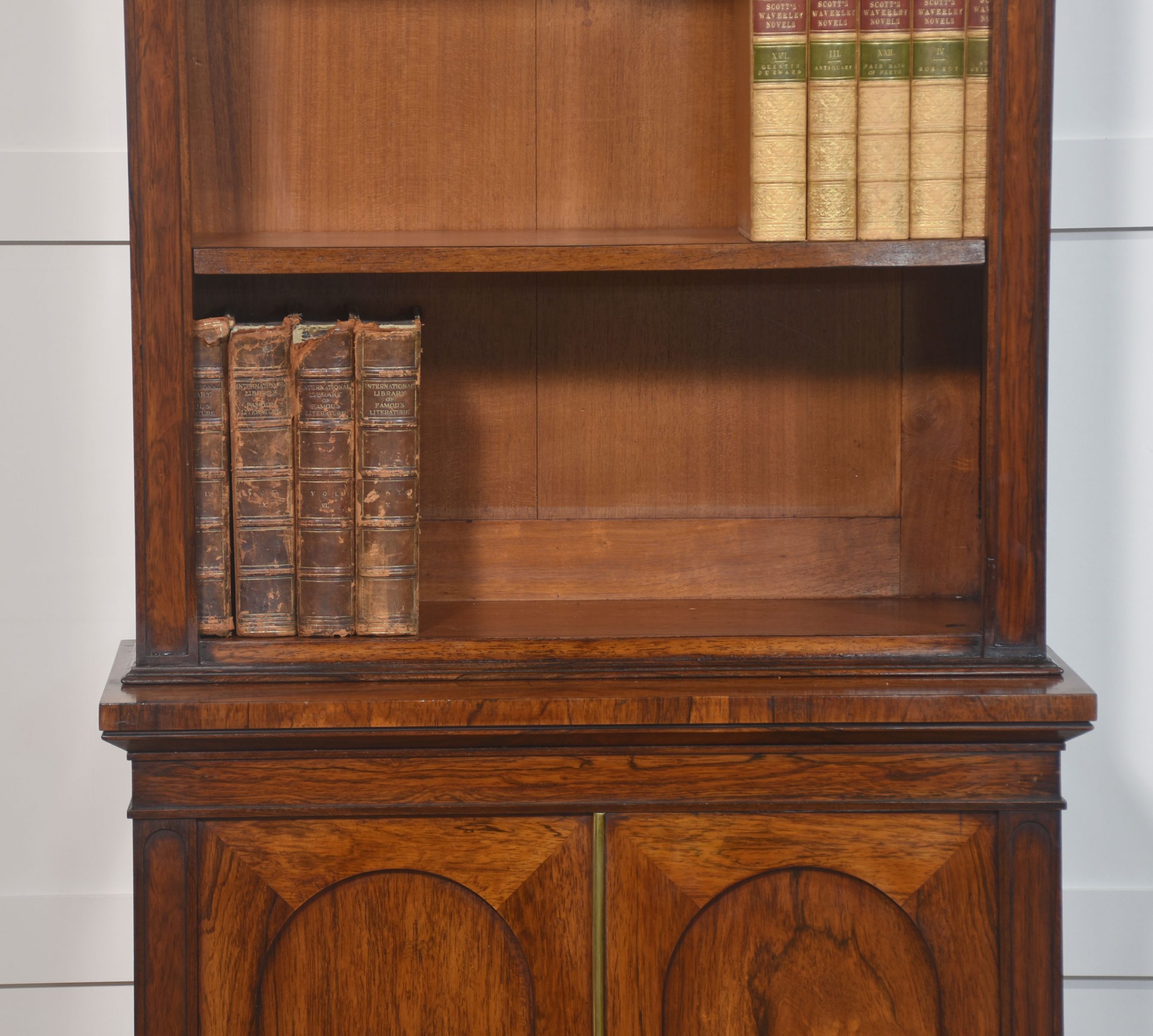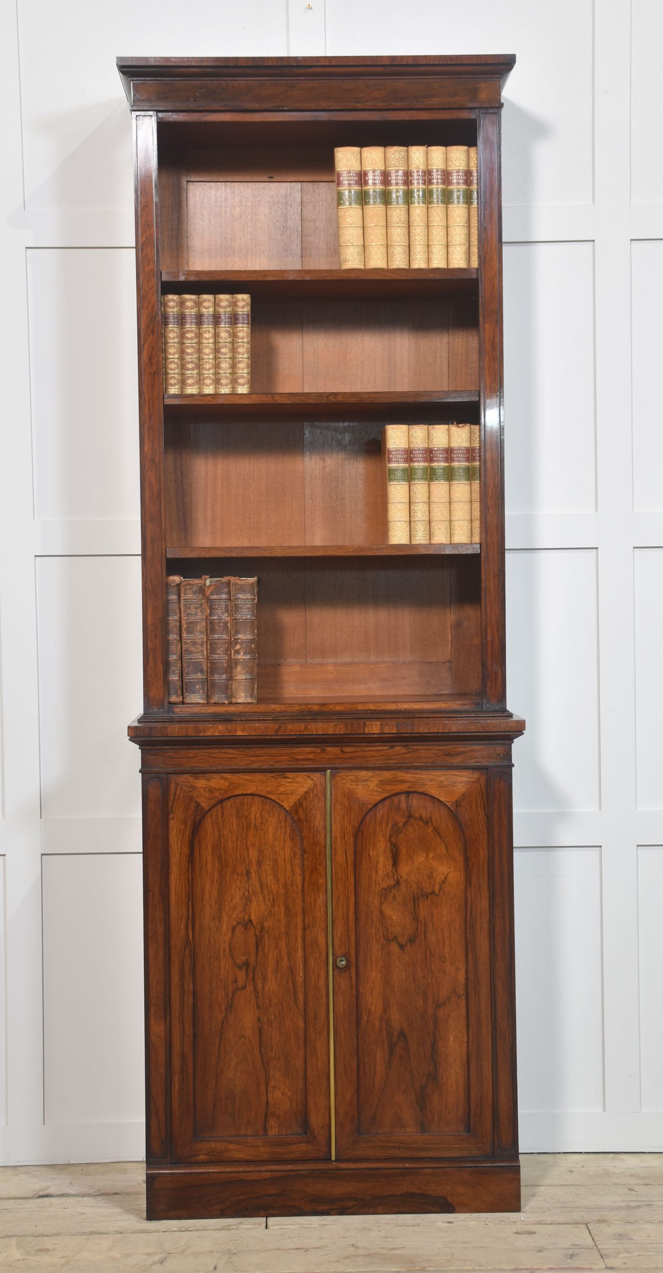 19th-century bookcase, the moulded cornice above the adjustable shelved interior encased by a rosewood frame. To the base fitted with well-figured panneled doors opening to reveal further storage. All raised on a plinth base.