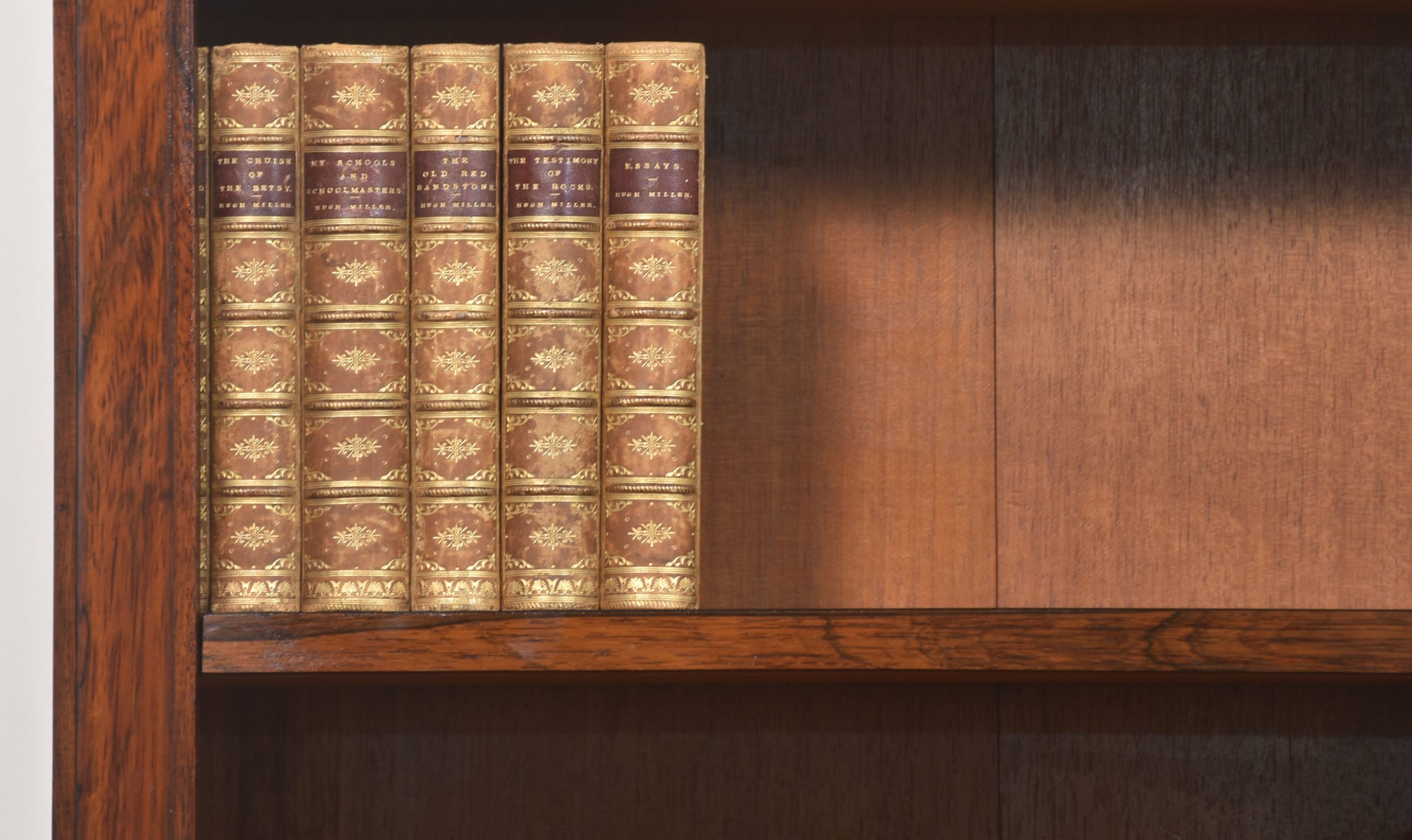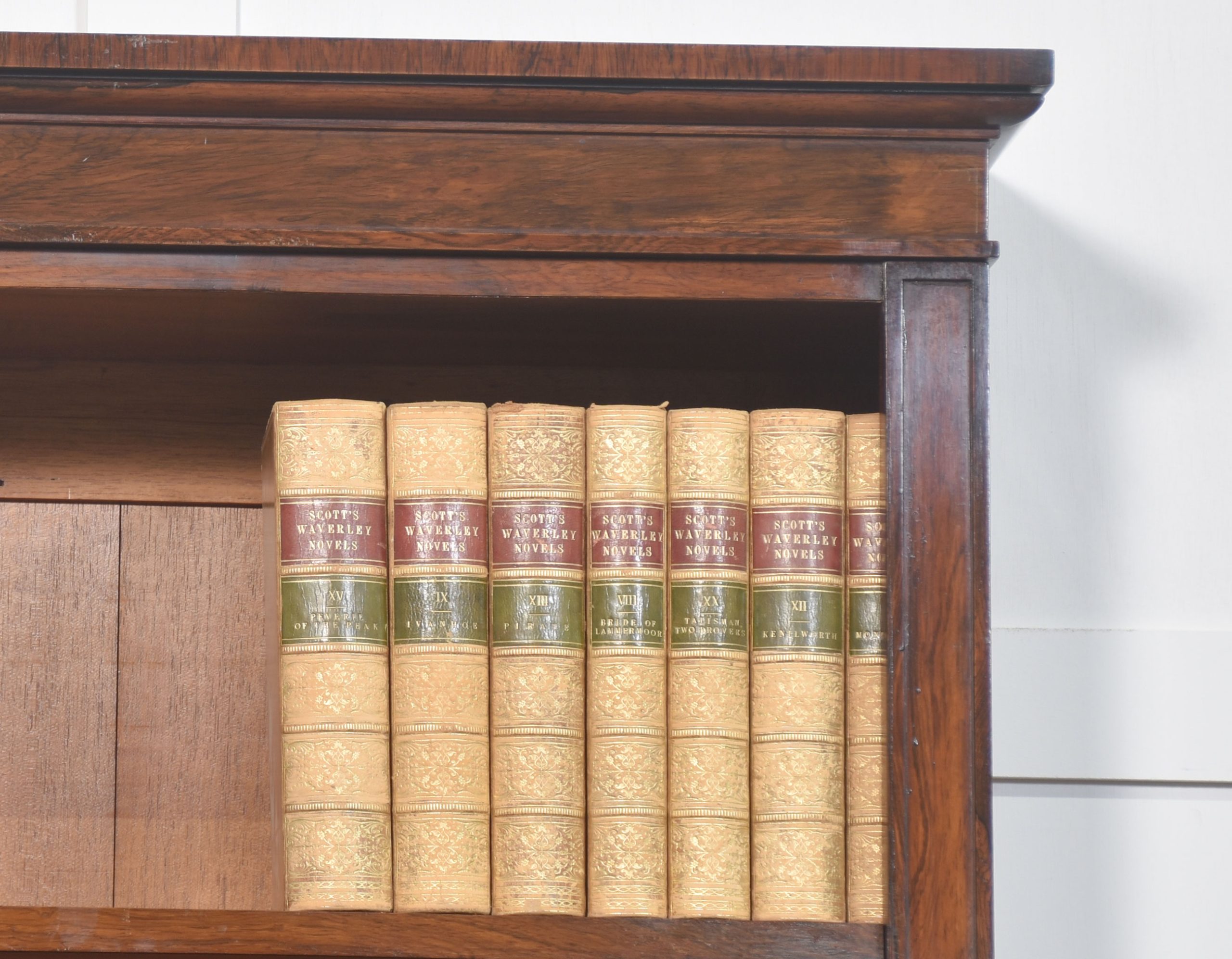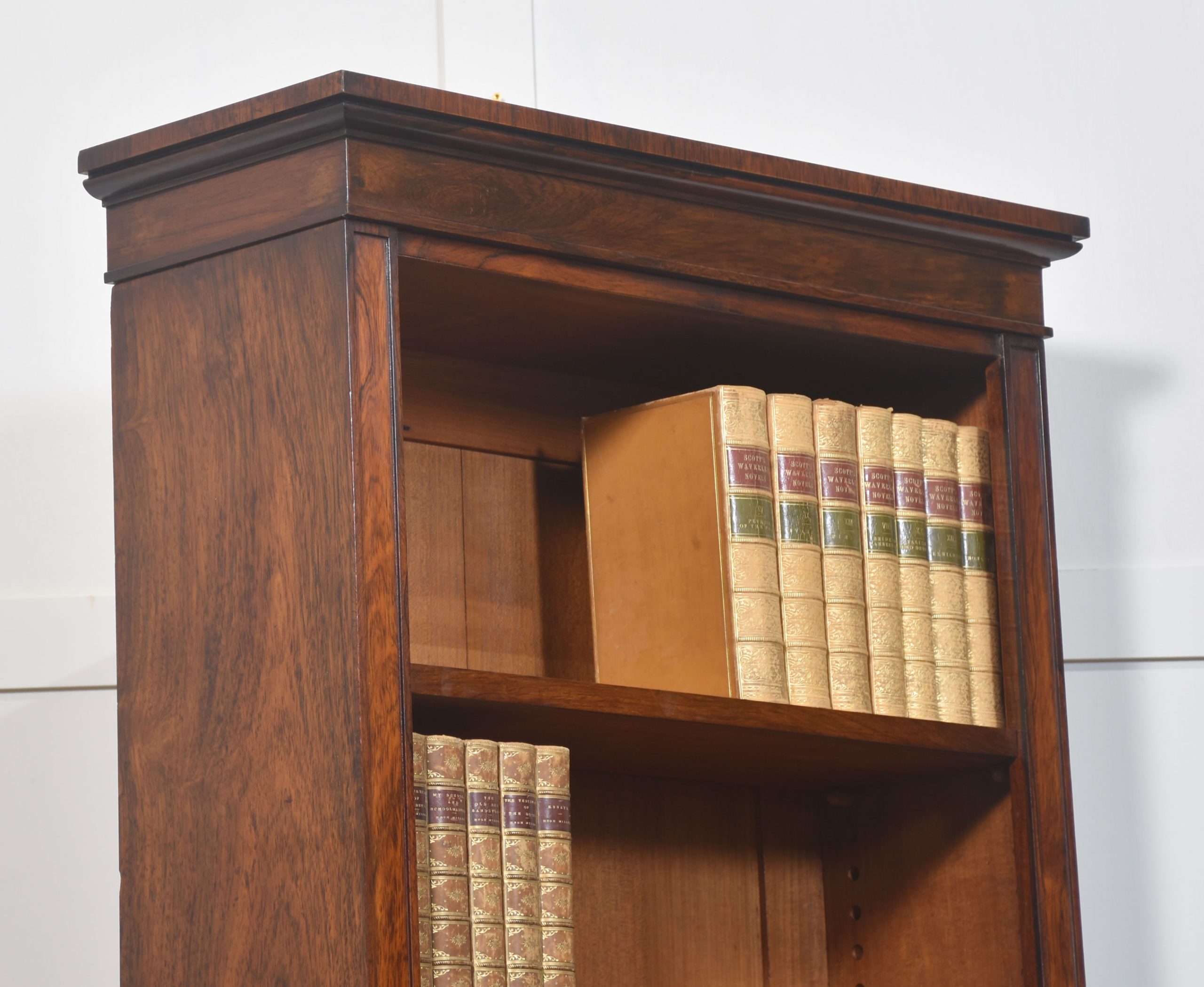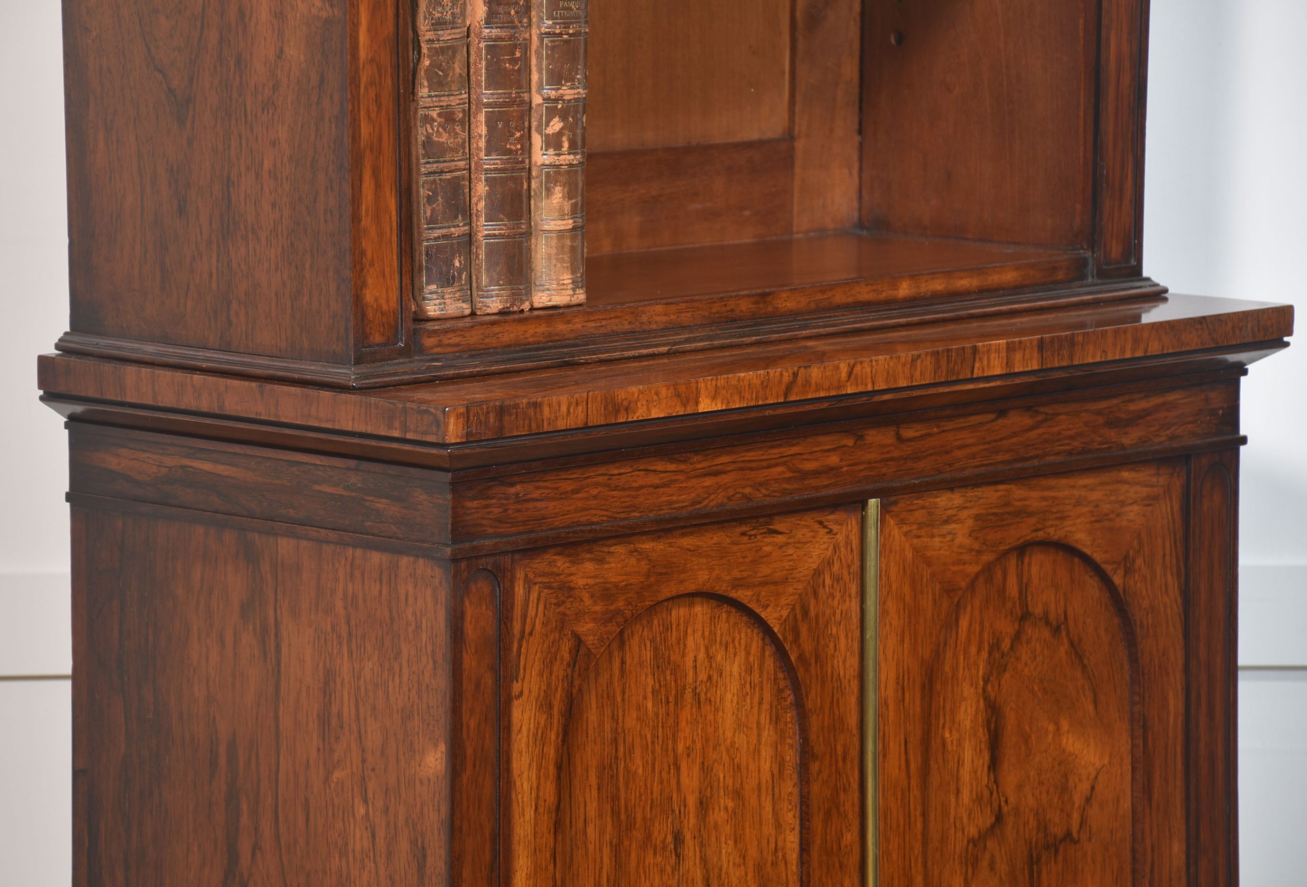 19th-century bookcase, the moulded cornice above the adjustable shelved interior encased by a rosewood frame. To the base fitted with well-figured panneled doors opening to reveal further storage. All raised on a plinth base.