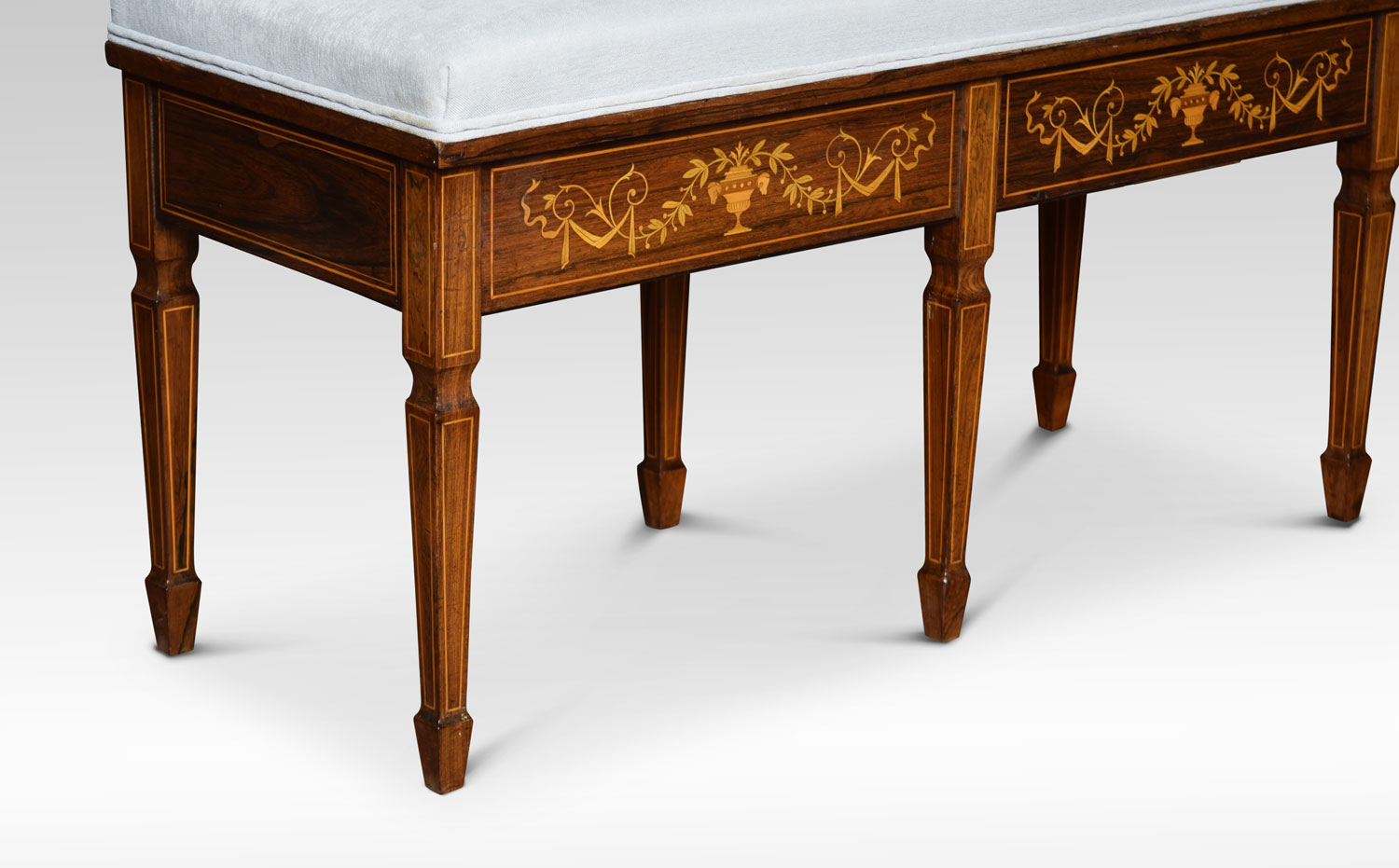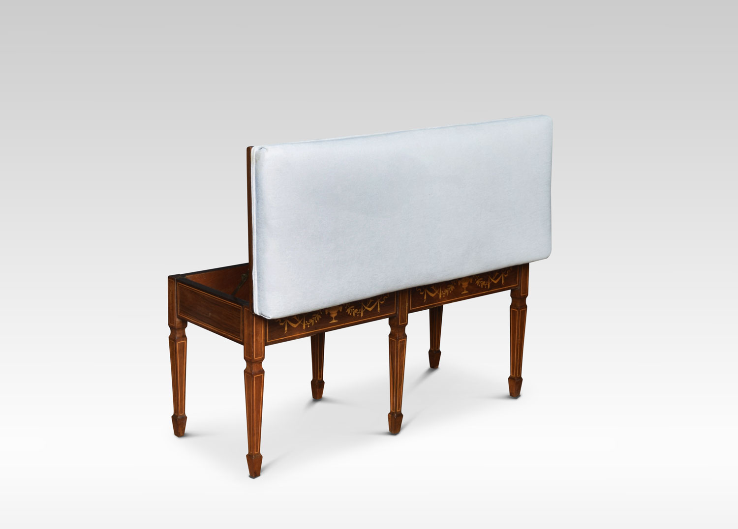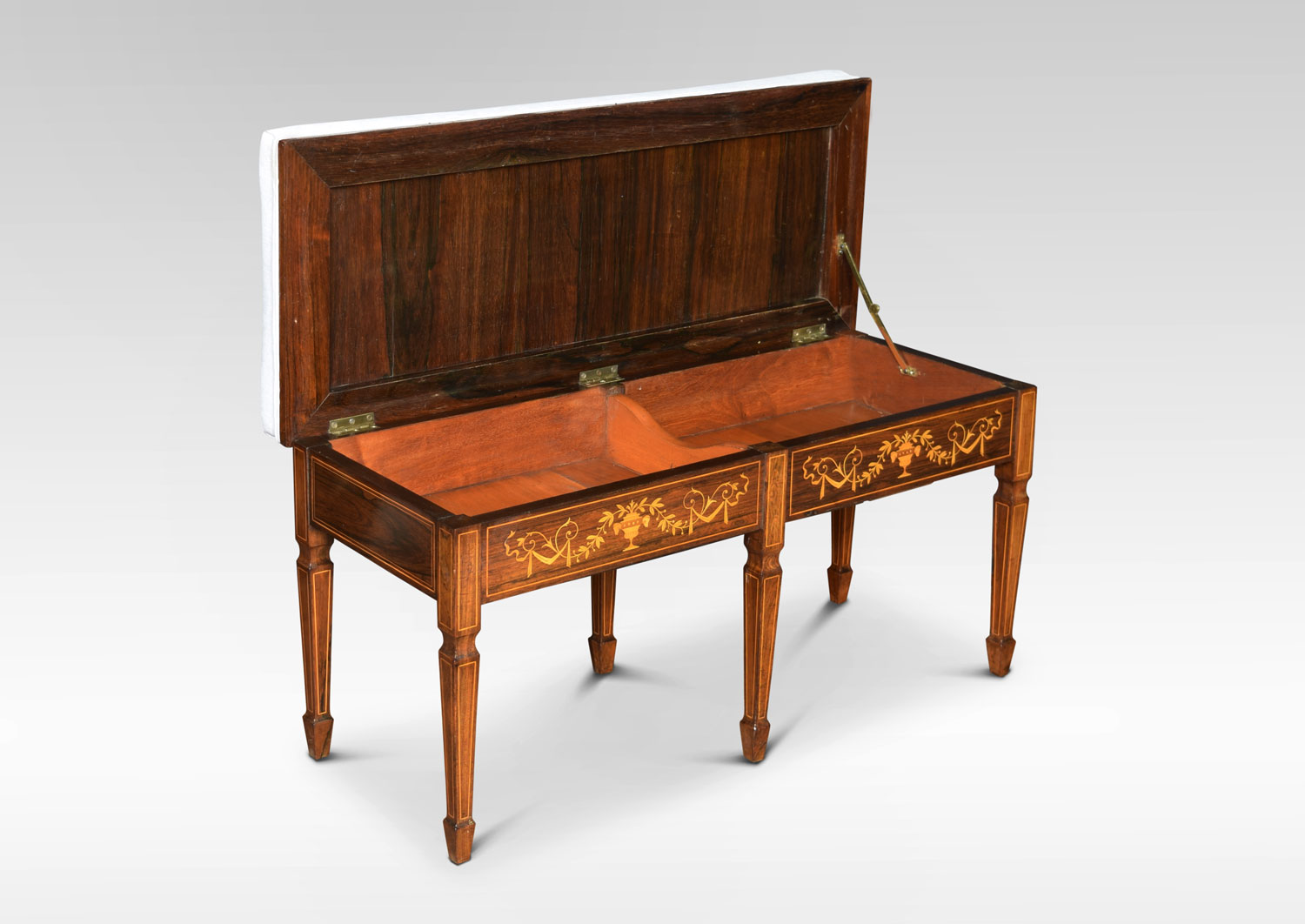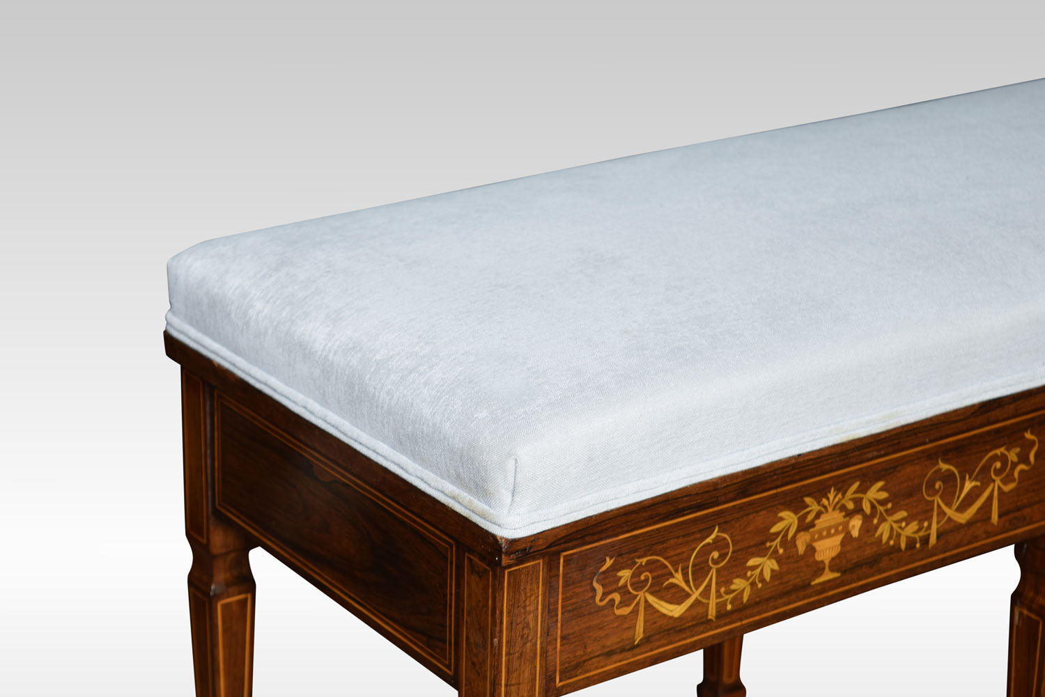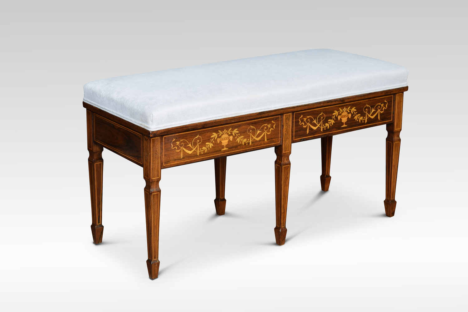 Rosewood inlaid duet piano stool, the rectangular French grey upholstered seat opening to reveal large storage area. To the freeze finely decorated in inlay, all raised up on six square tapering legs terminating in spade feet.