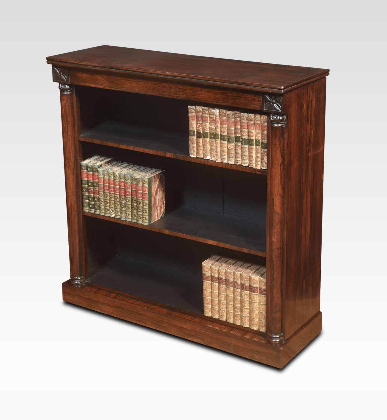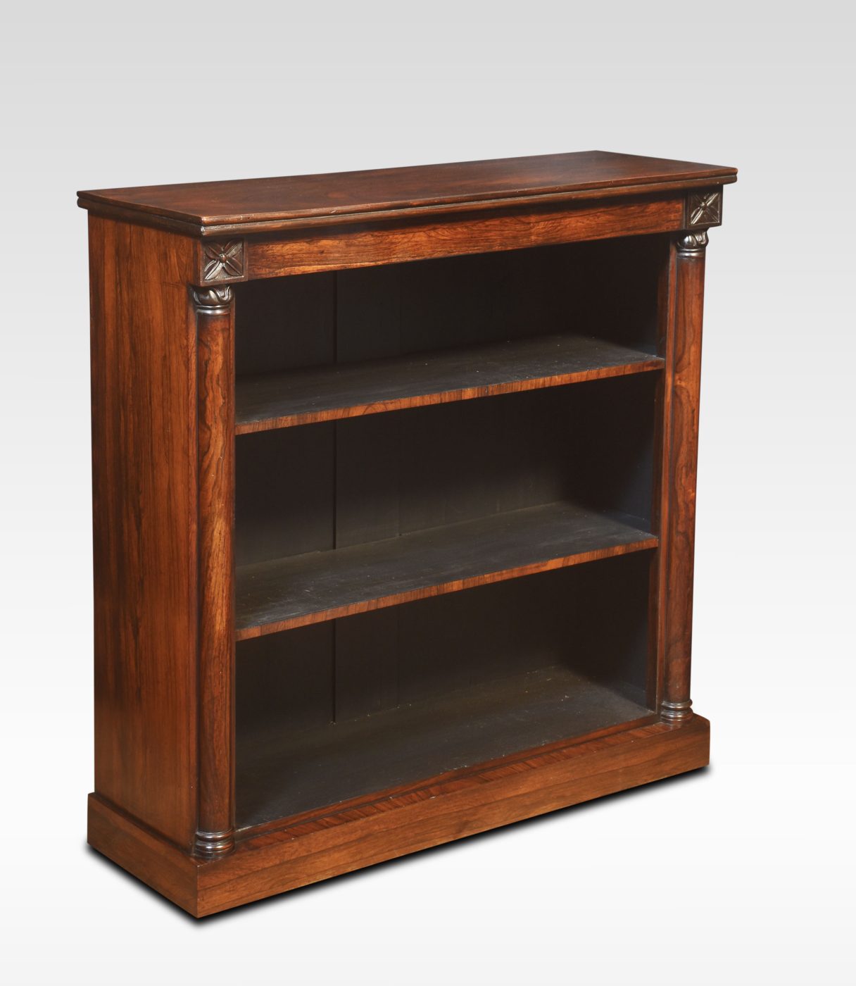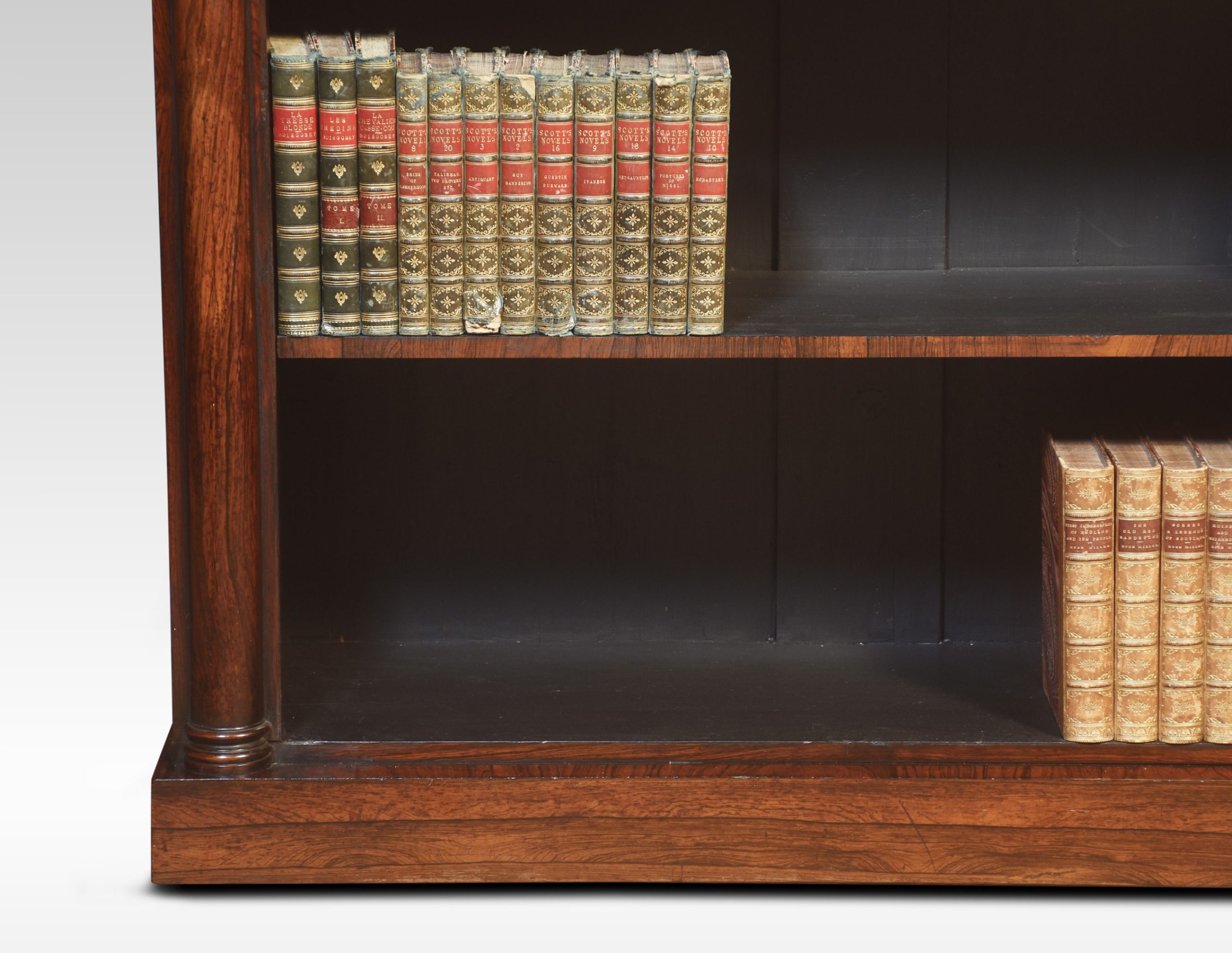 19th-century rosewood open bookcase, the rectangular well-figured top above-molded frieze supported on capped columns. Enclosing the adjustable shelved interior, all raised up on a plinth base.