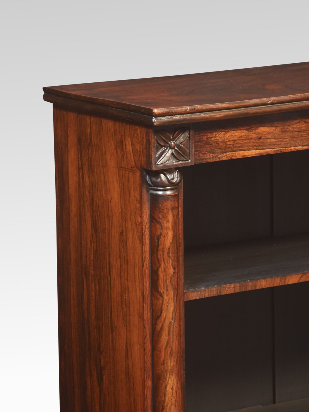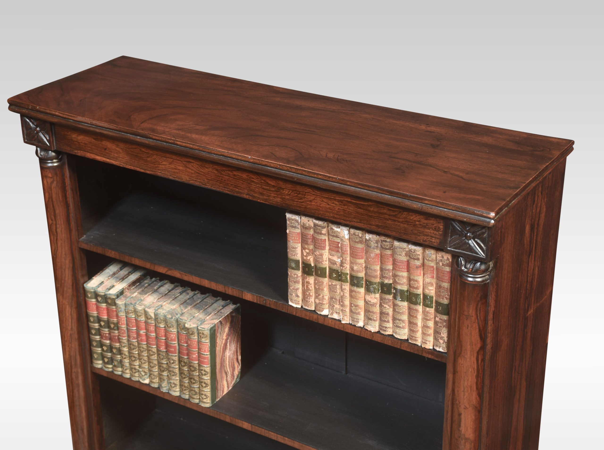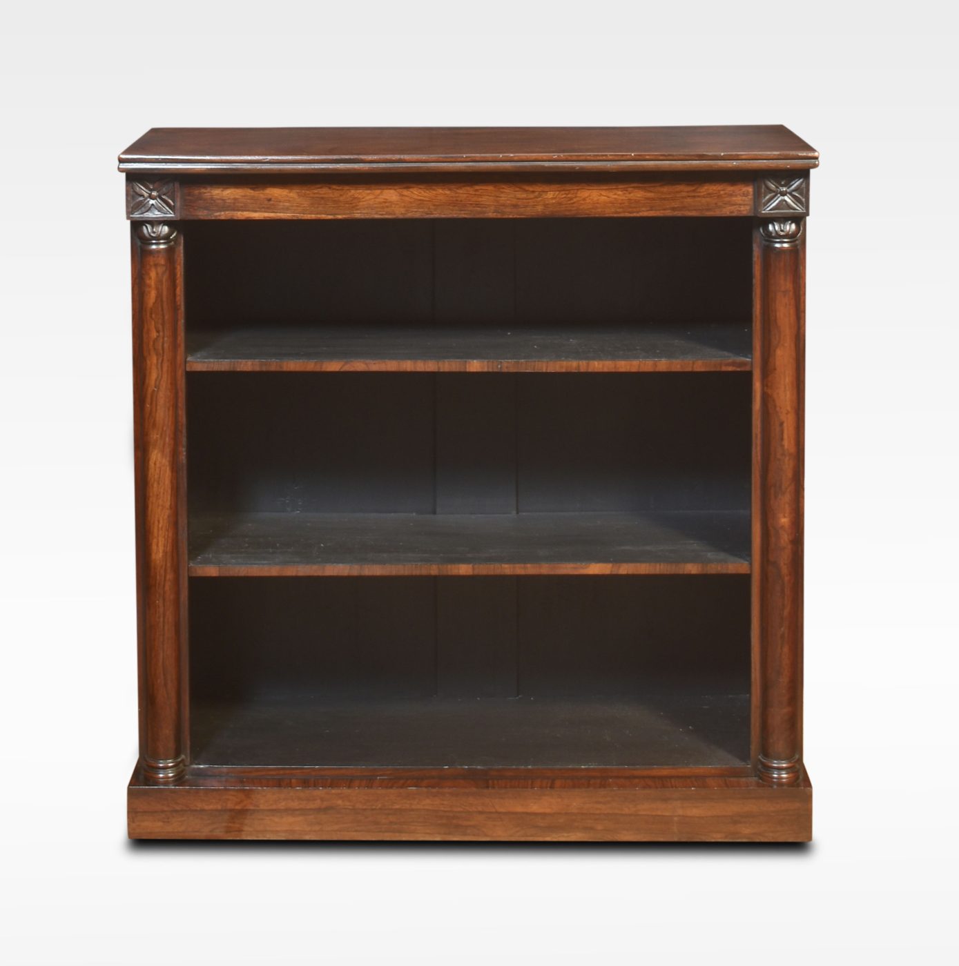 19th-century rosewood open bookcase, the rectangular well-figured top above-molded frieze supported on capped columns. Enclosing the adjustable shelved interior, all raised up on a plinth base.