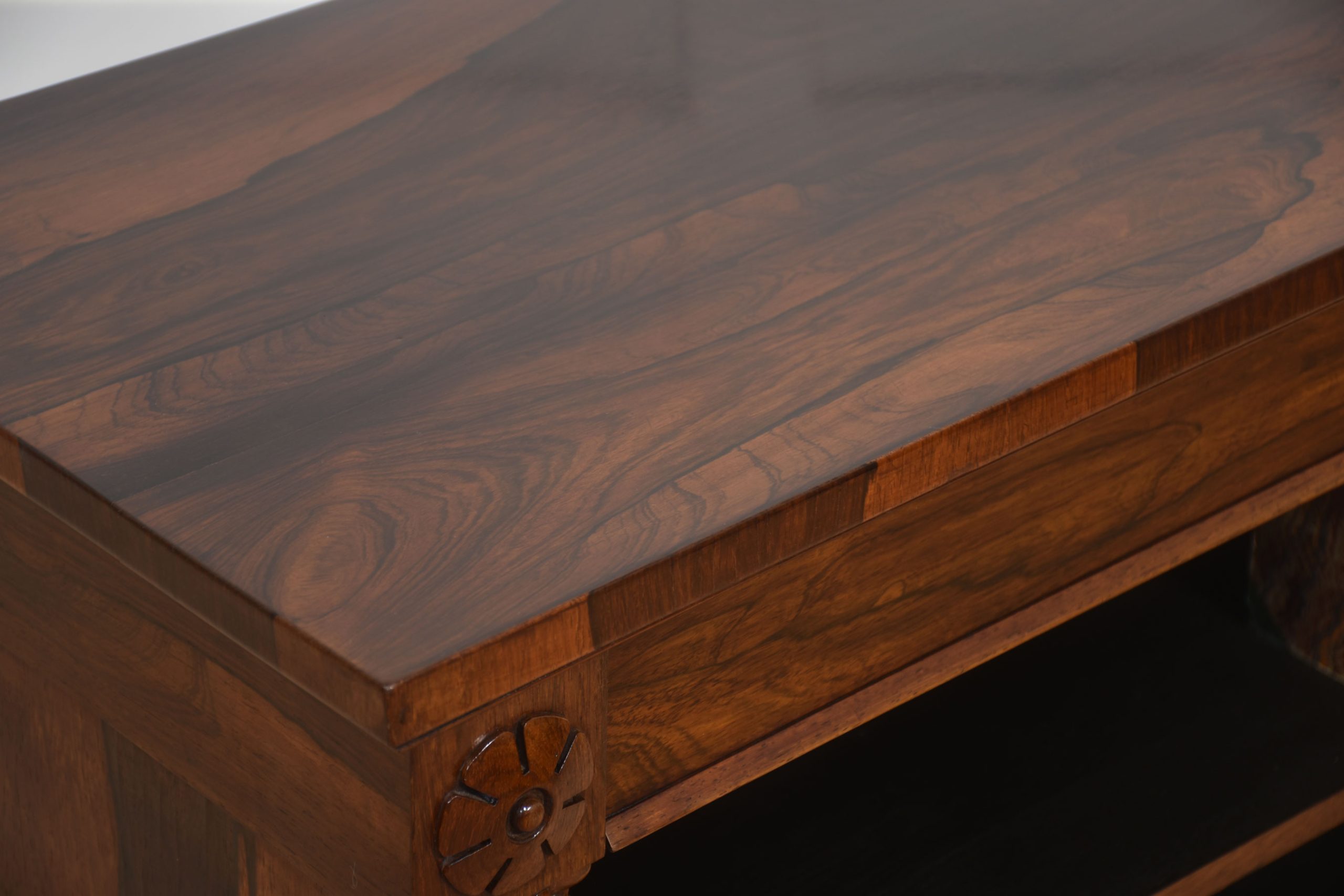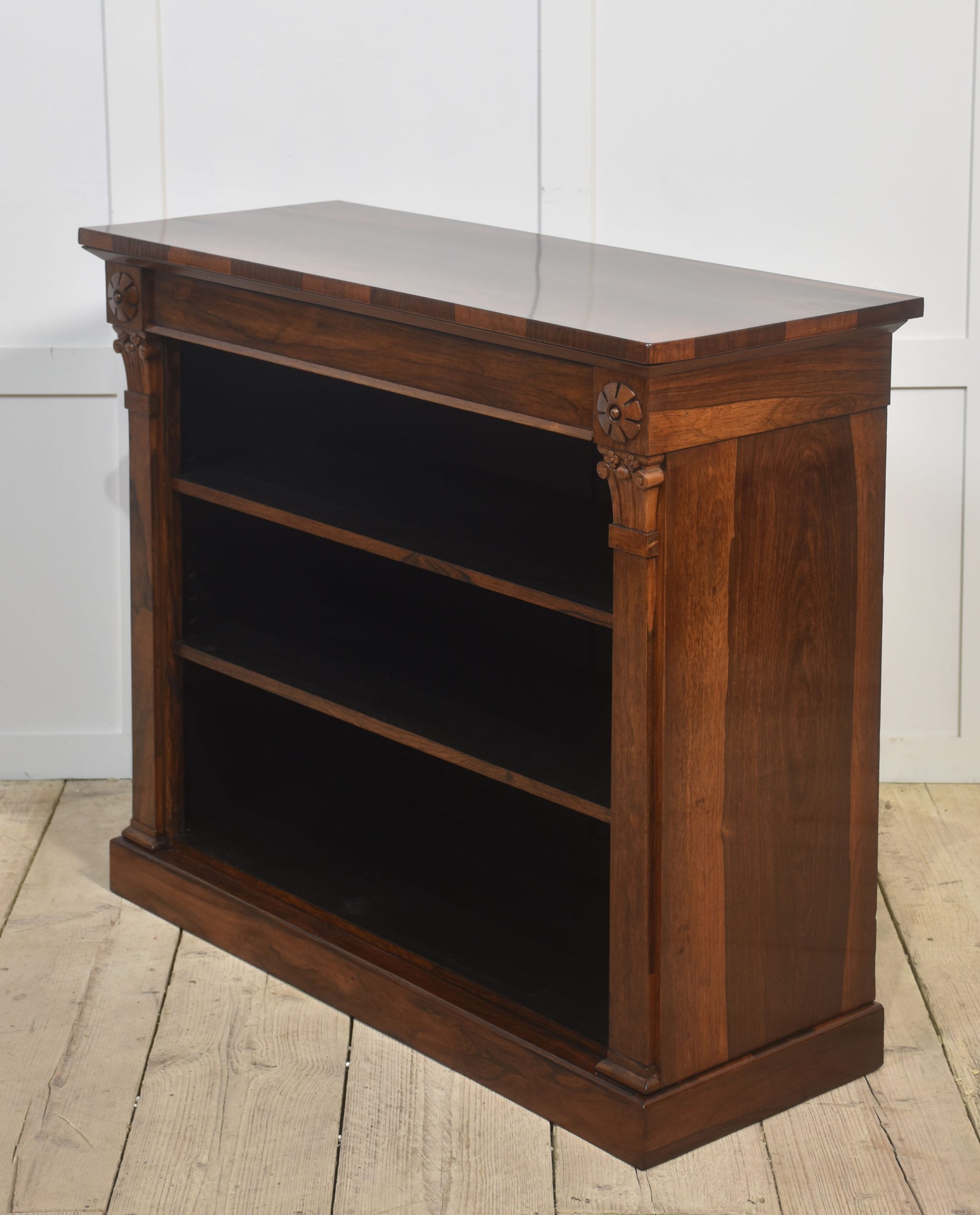 19th-century rosewood open bookcase, the rectangular well-figured top above a moulded frieze fitted with a drawer. Supported on capped columns flanking the adjustable shelved interior, all raised on a plinth base.