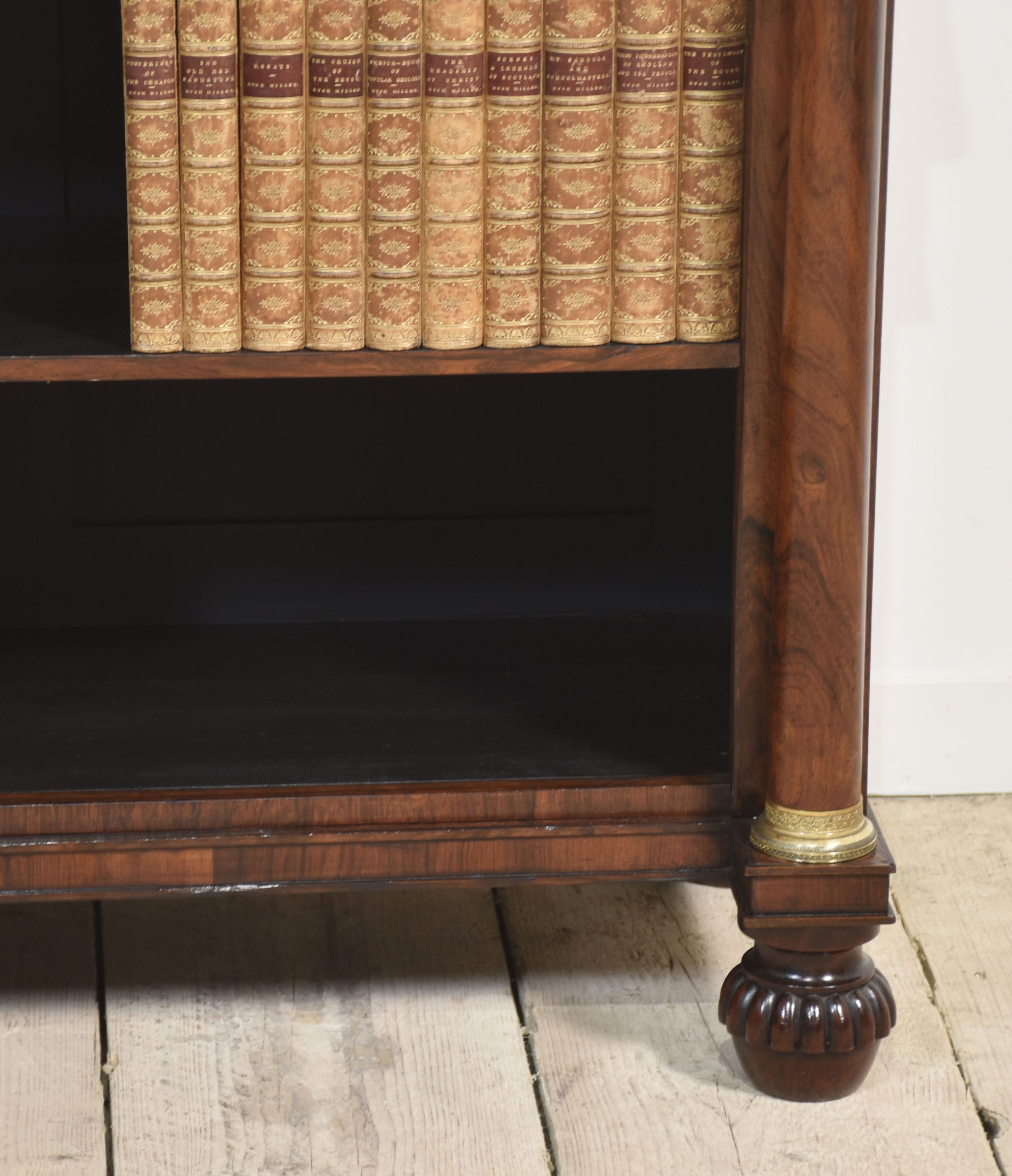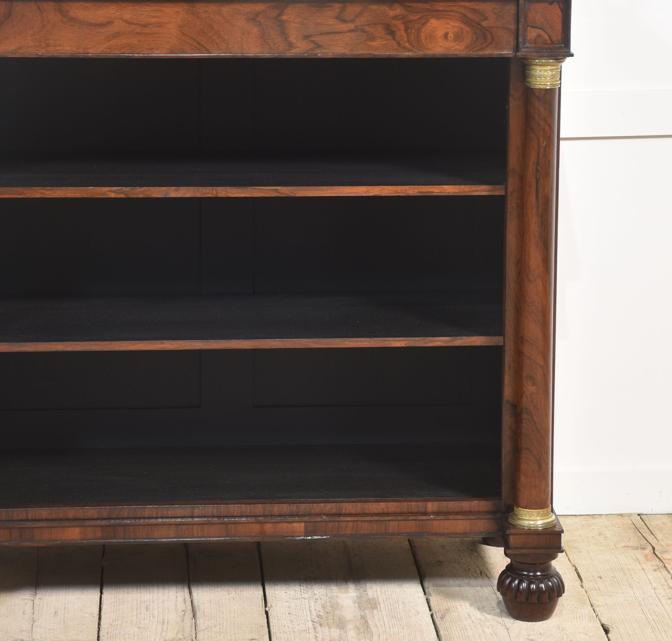 19th-century rosewood open bookcase, the unusual two-tier gallery supported on brass turned columns to the well-figured top having a frieze drawer below. Above the adjustable shelved interior flanked by turned columns. All raised up on carved feet.