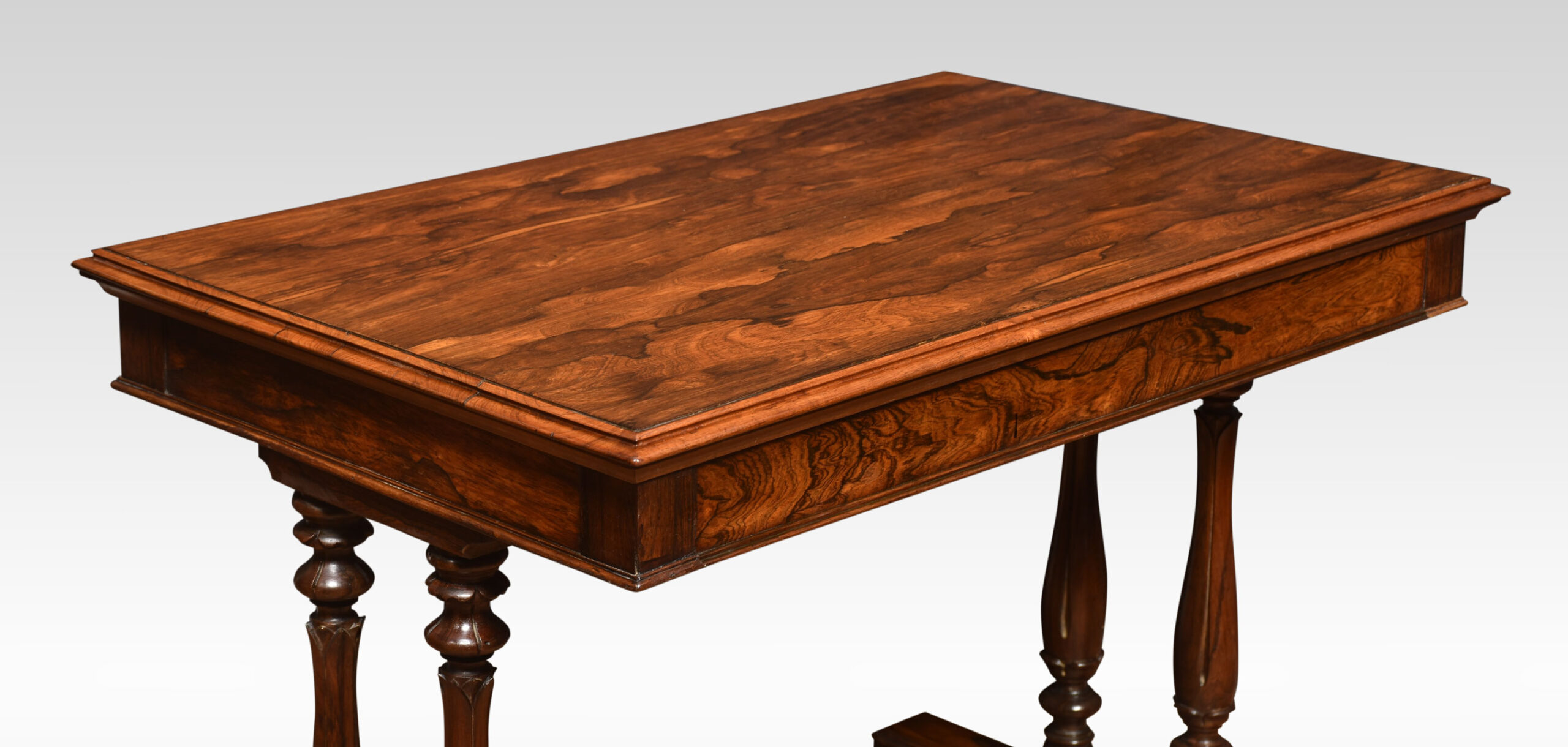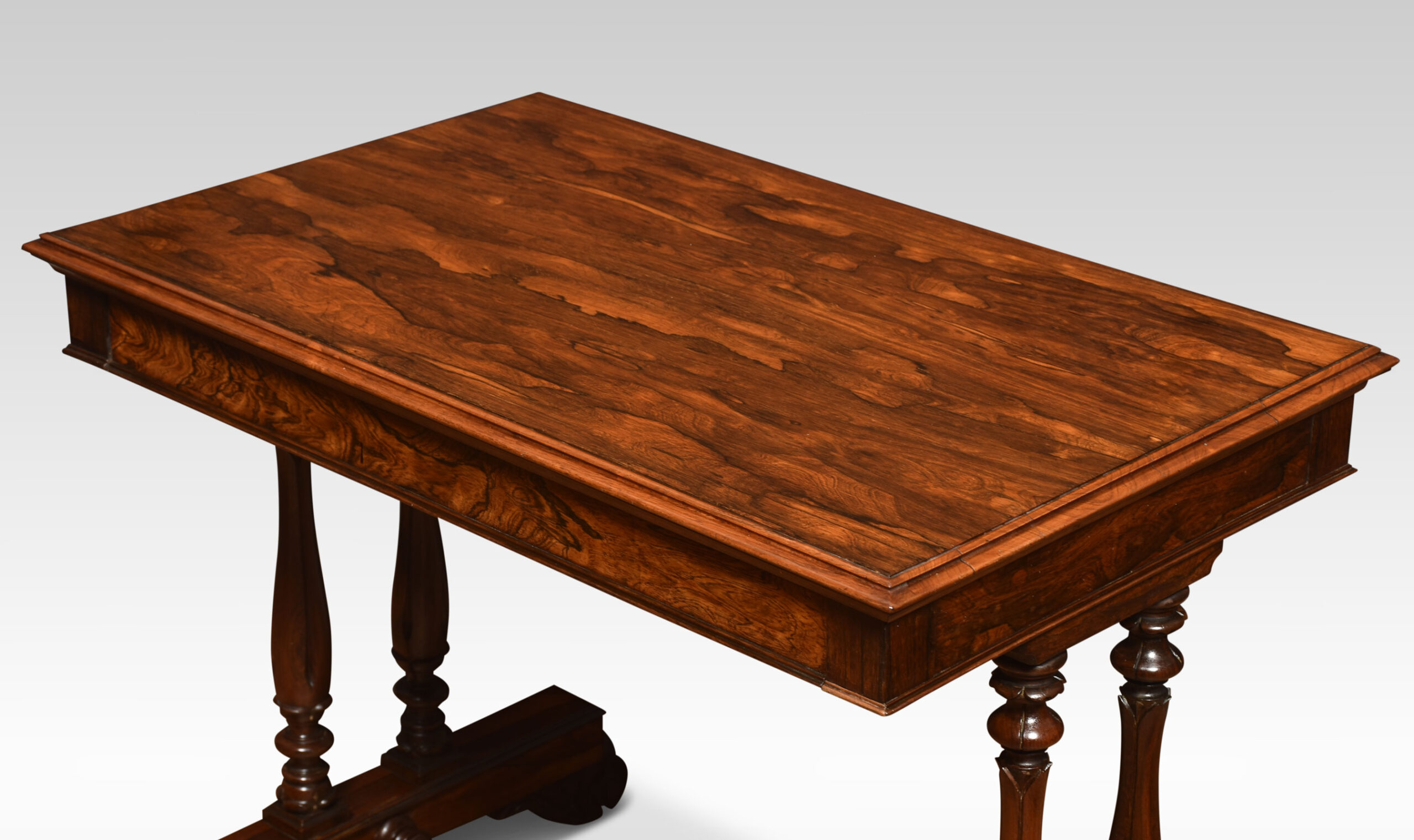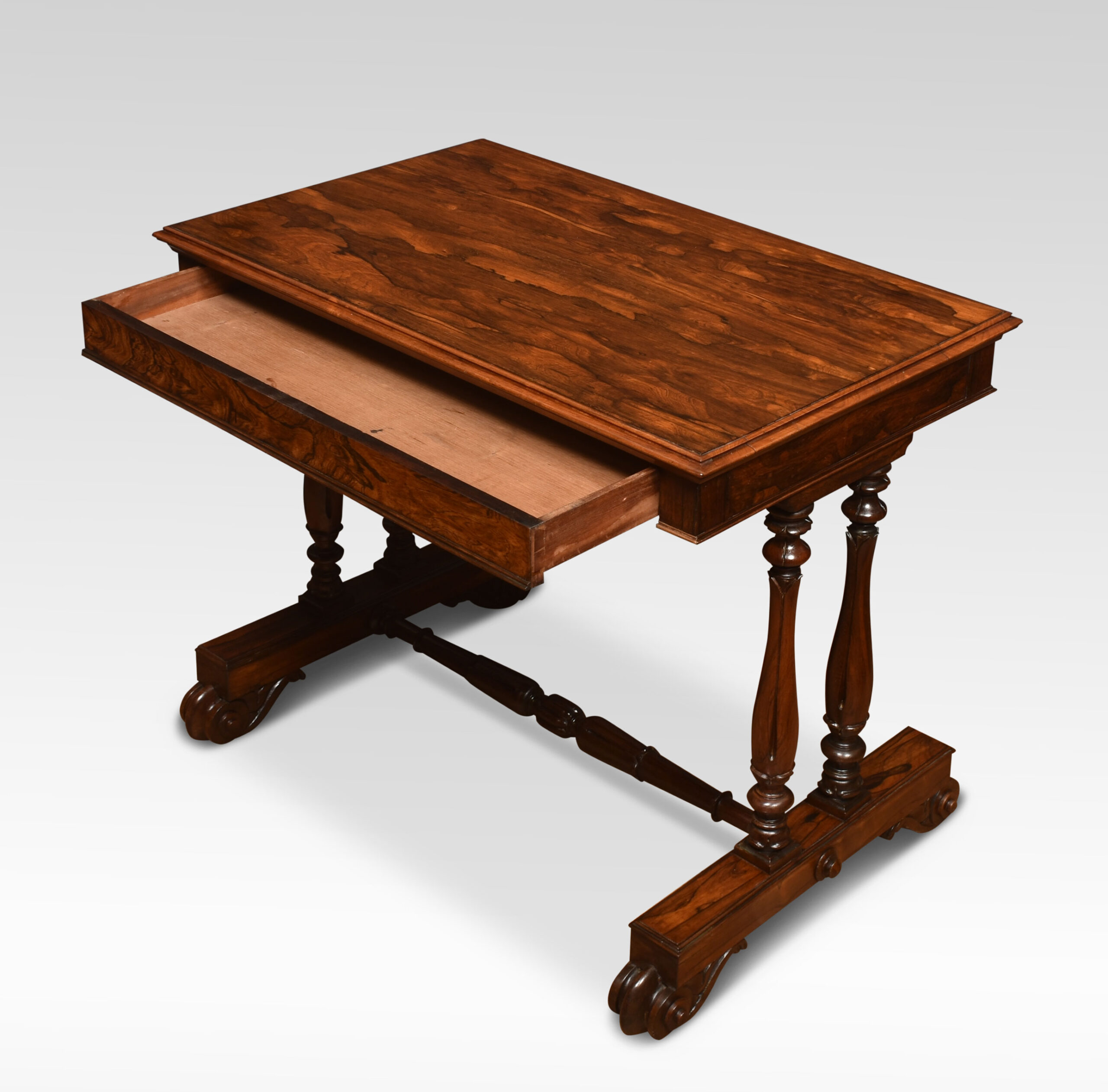 19th-century side table the rectangular well-figured rosewood top with molded edge above long freeze drawer. Supported on four turned supports above platform ends terminating in scrolling toes and recessed brass castors.