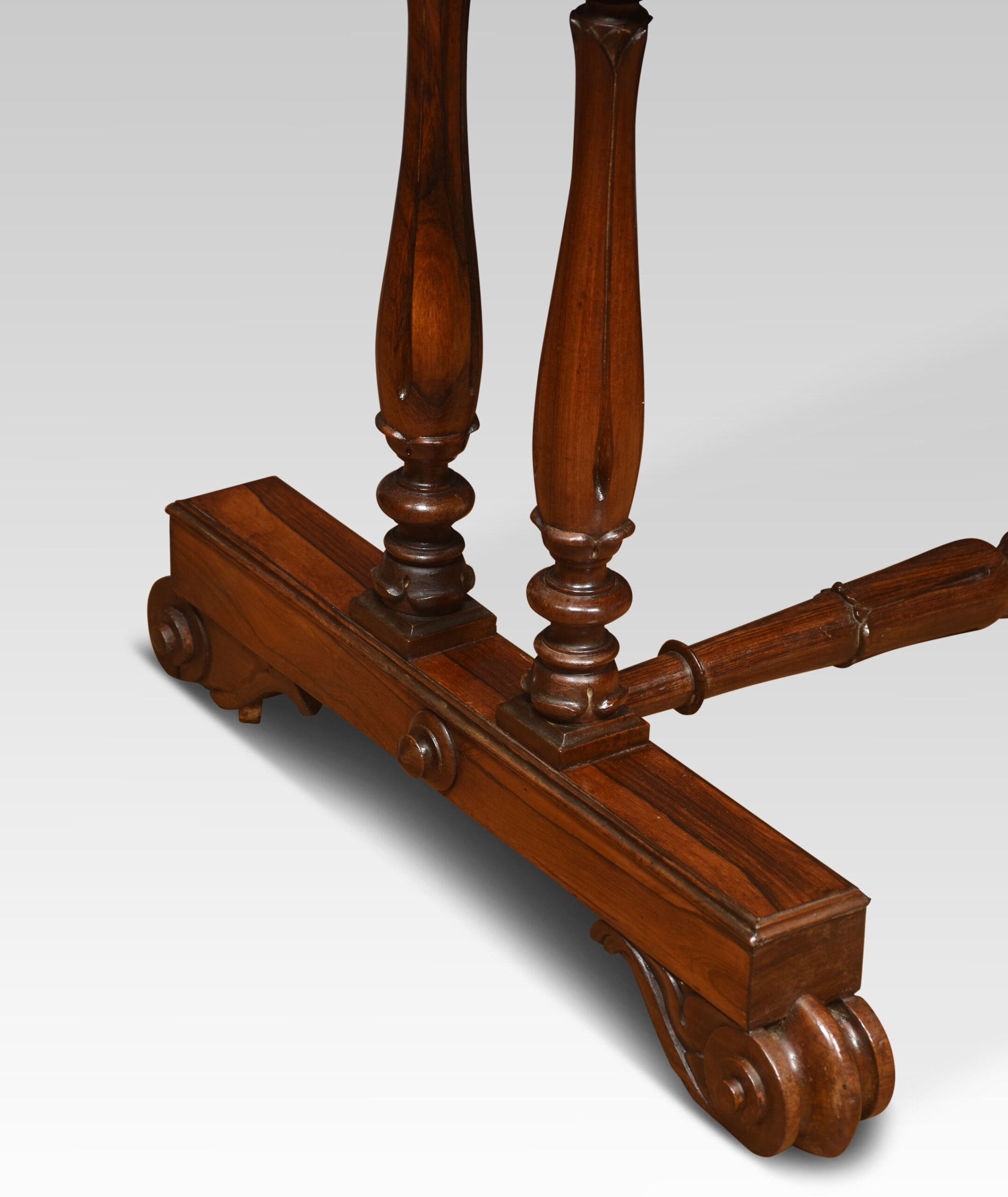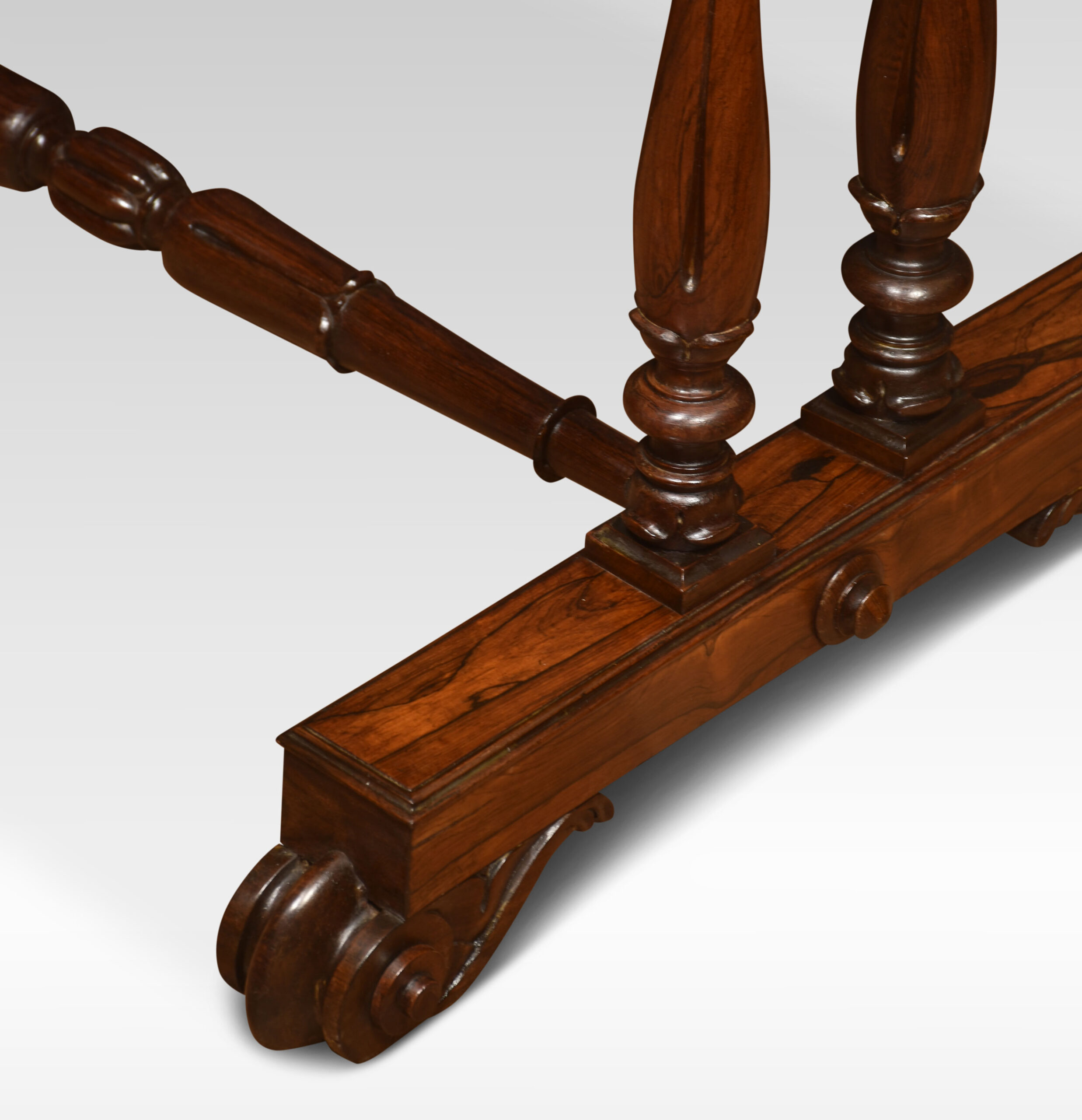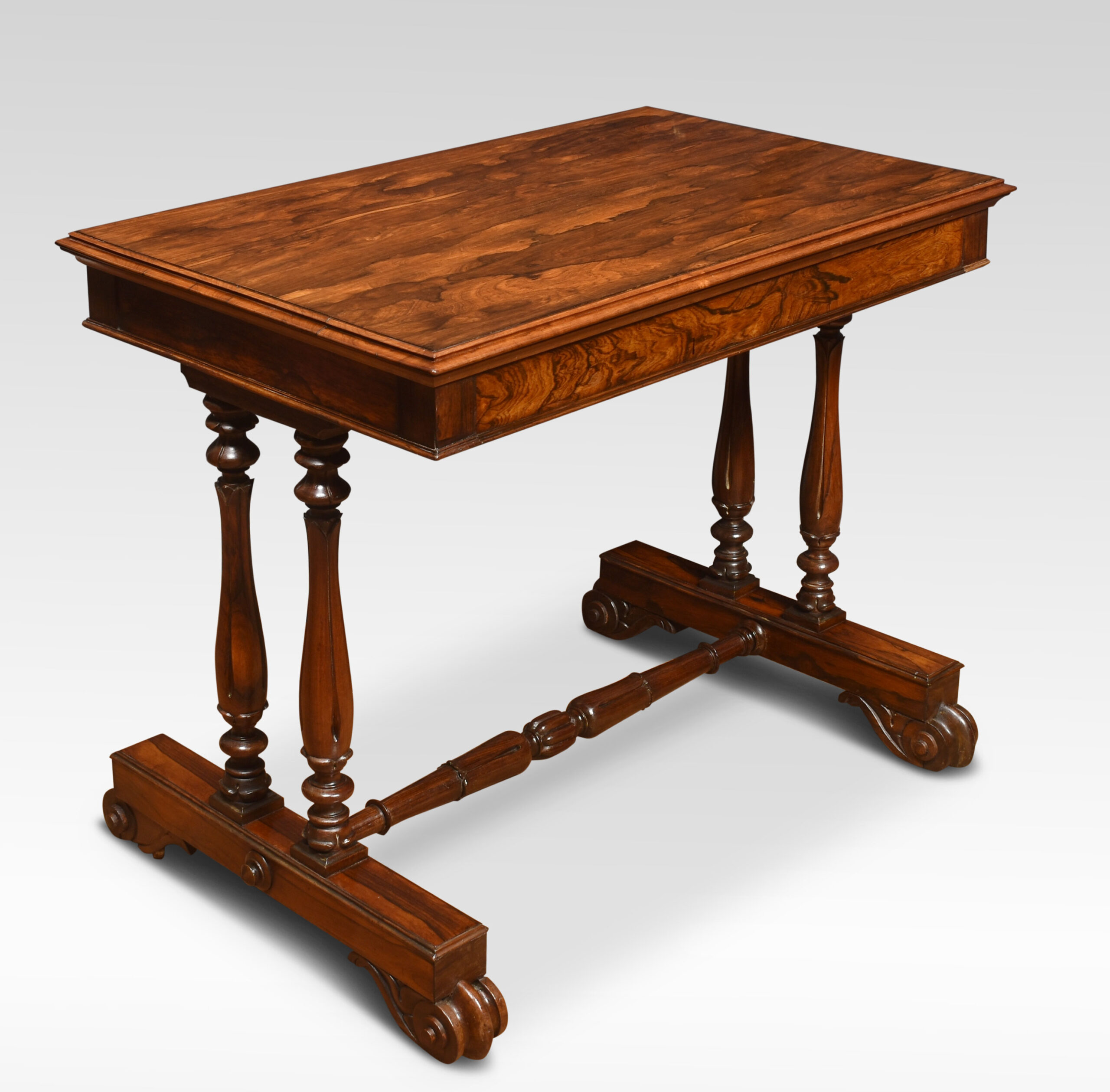 19th-century side table the rectangular well-figured rosewood top with molded edge above long freeze drawer. Supported on four turned supports above platform ends terminating in scrolling toes and recessed brass castors.