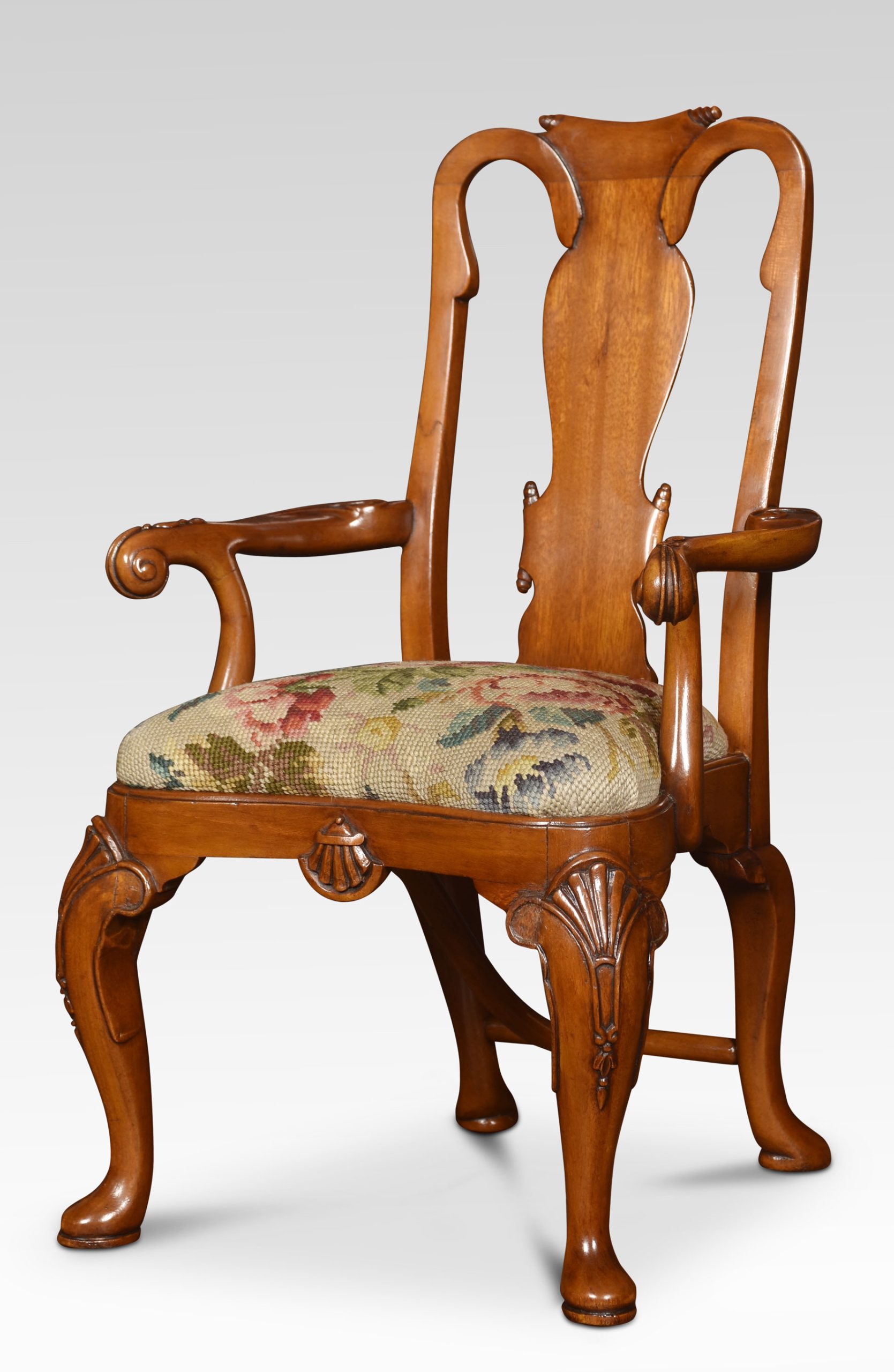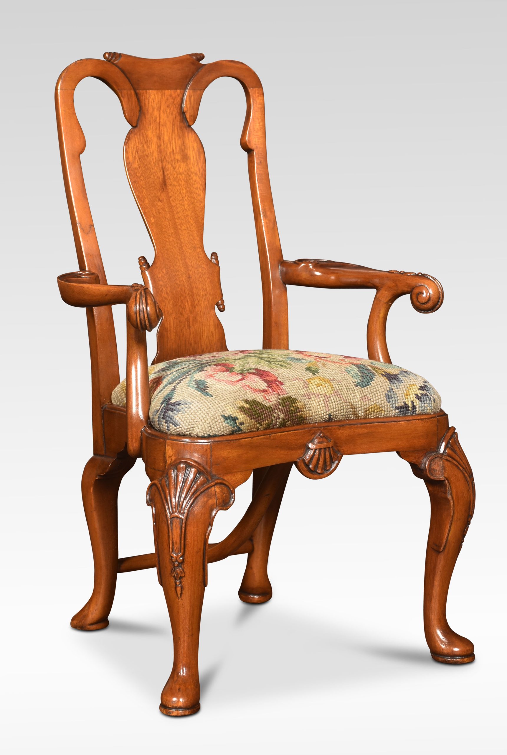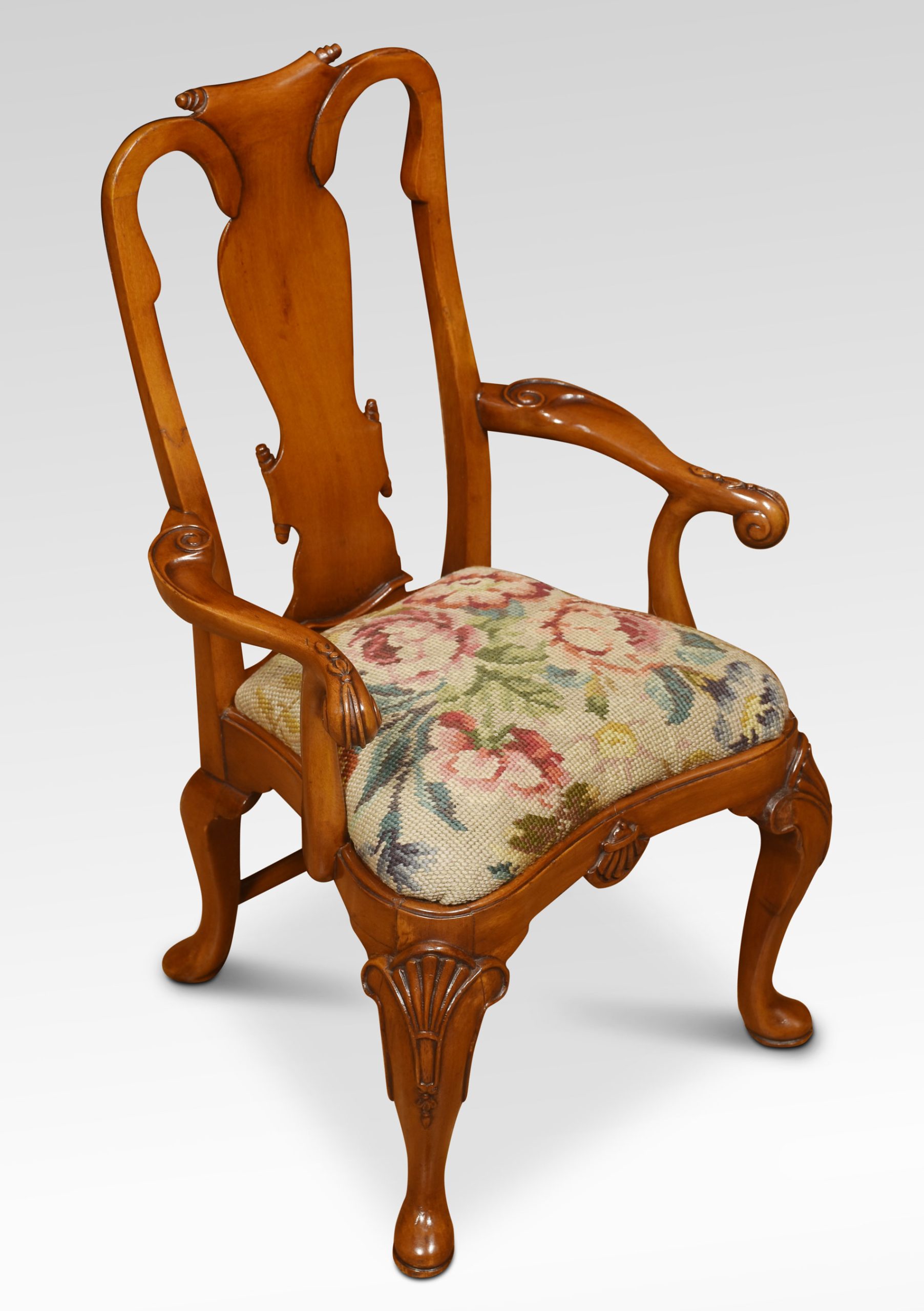 19th-century walnut child’s armchair the shaped back with a central splat to the needlepoint removable seat cushion, enclosed by outswept arms. All raised up on shell-capped carved cabriole legs terminating in pad feet.