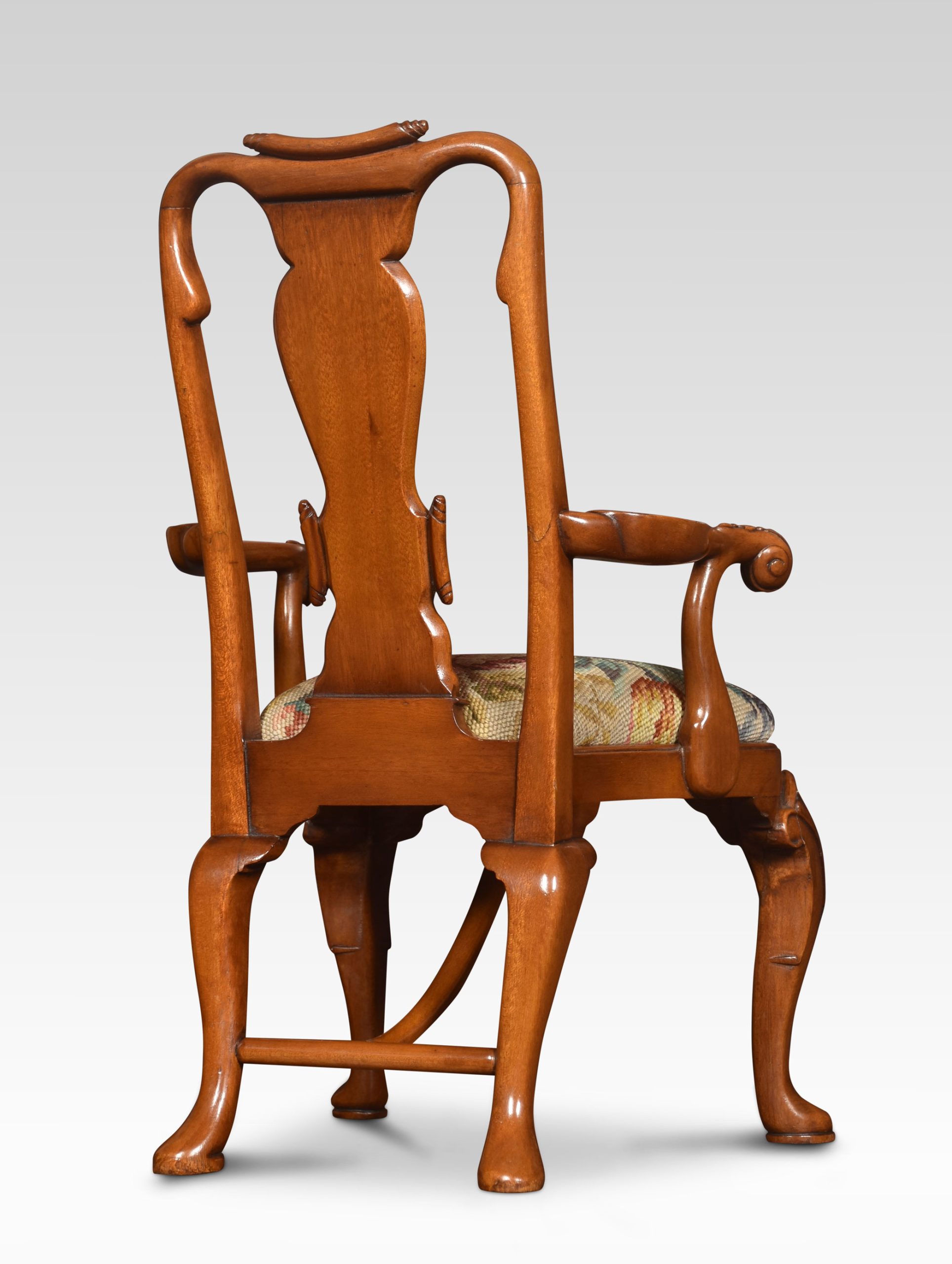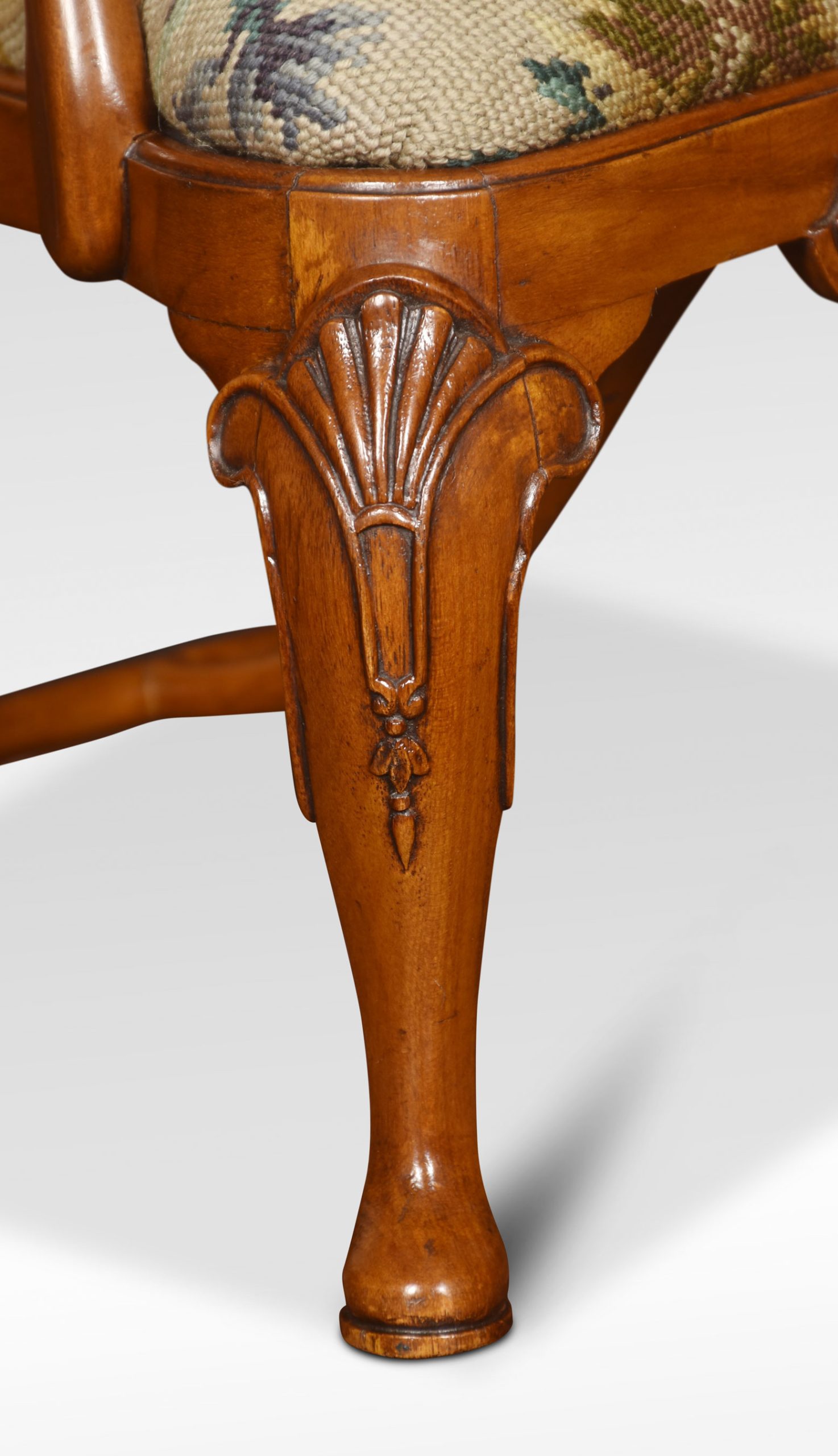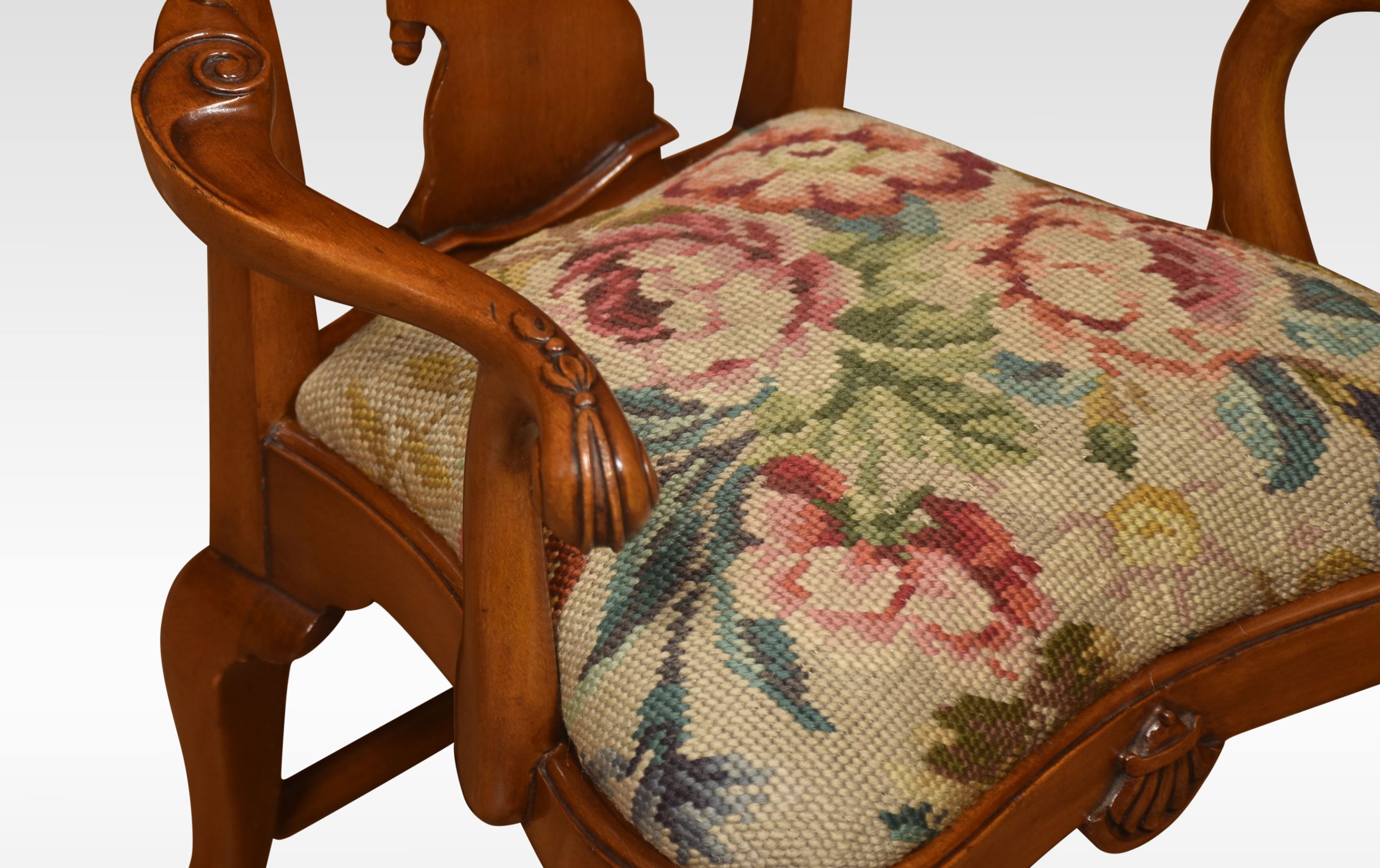 19th-century walnut child’s armchair the shaped back with a central splat to the needlepoint removable seat cushion, enclosed by outswept arms. All raised up on shell-capped carved cabriole legs terminating in pad feet.