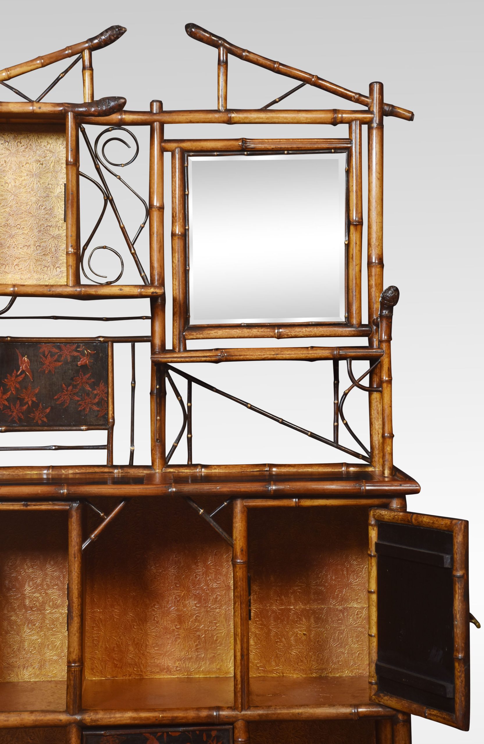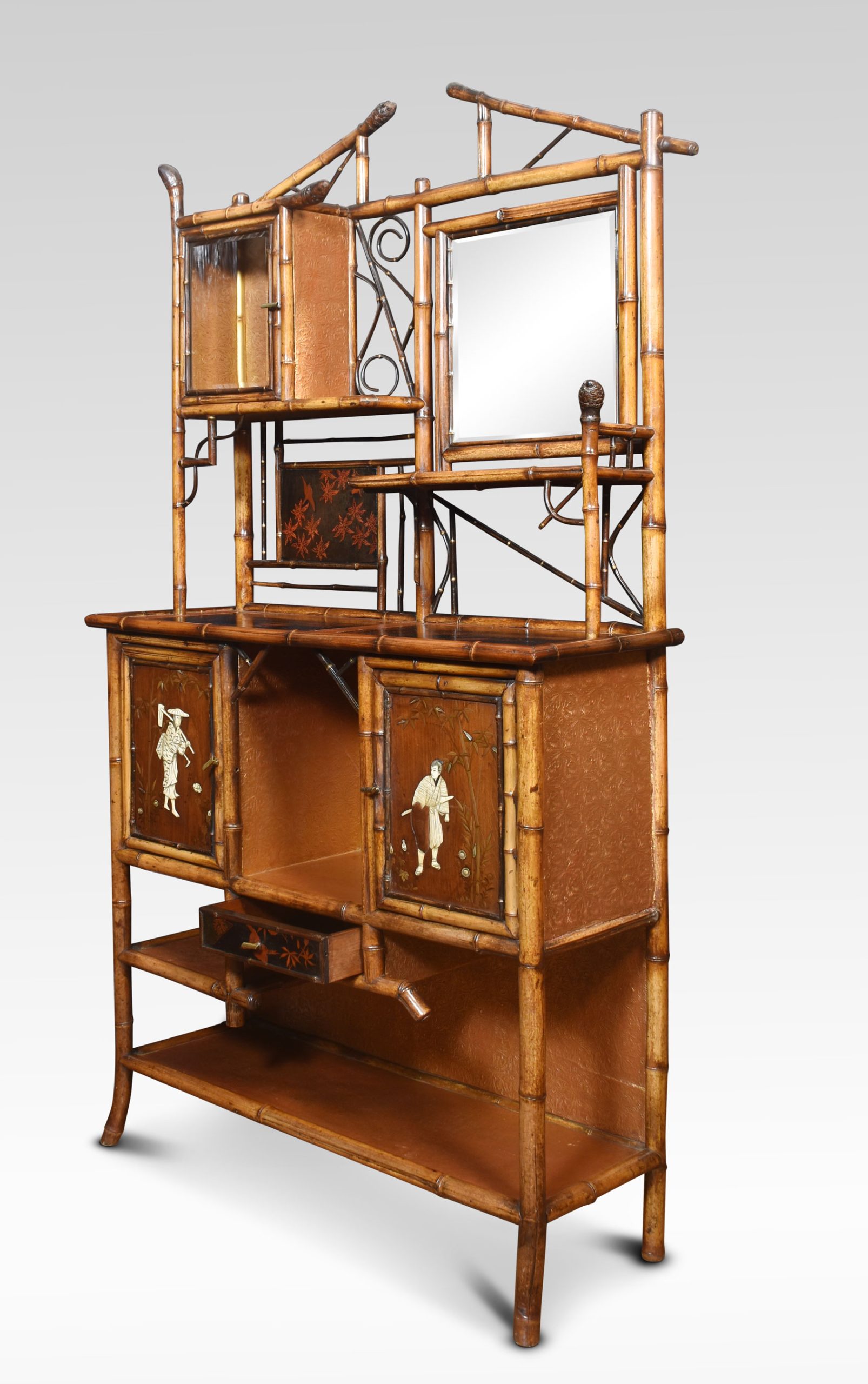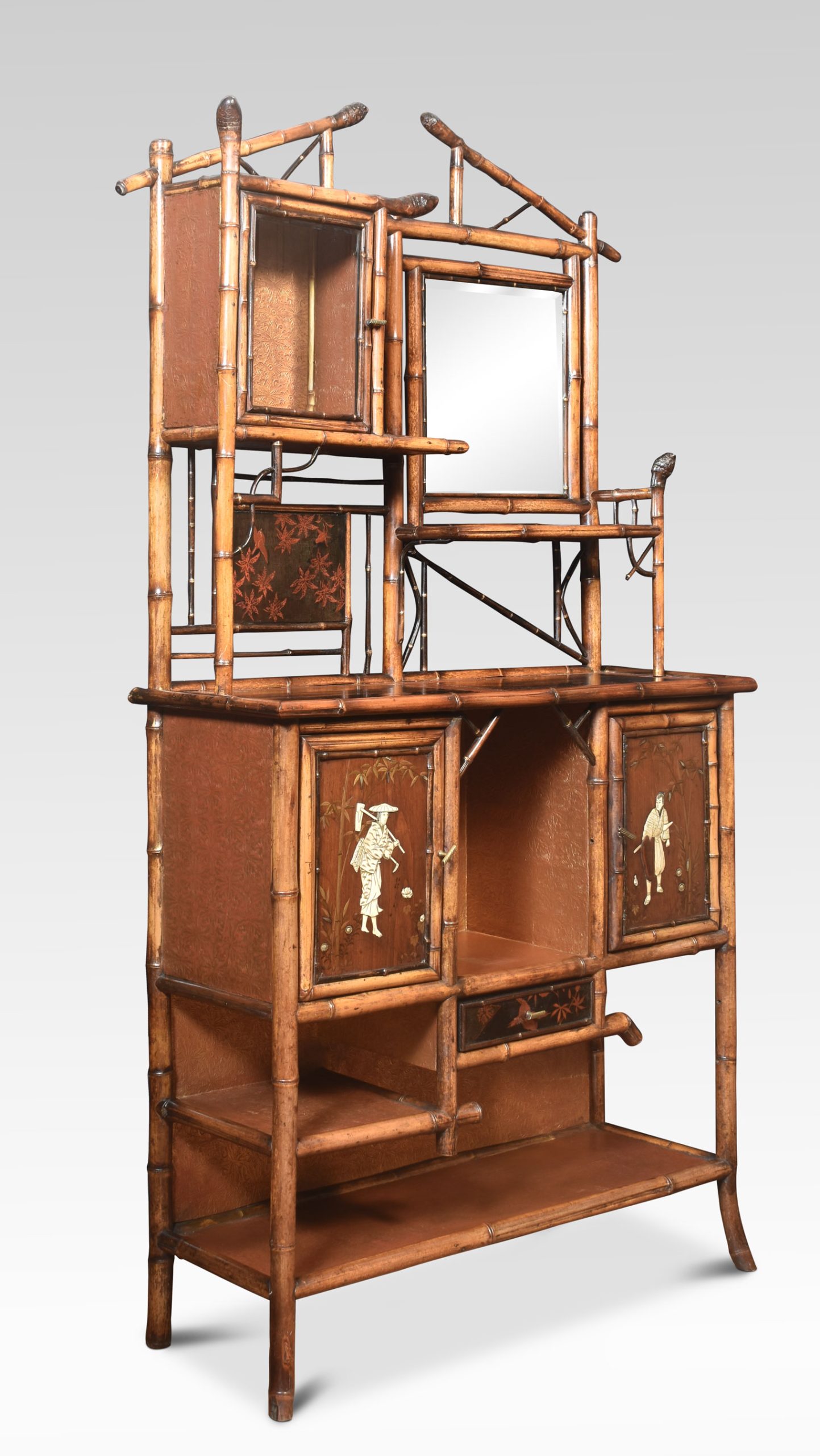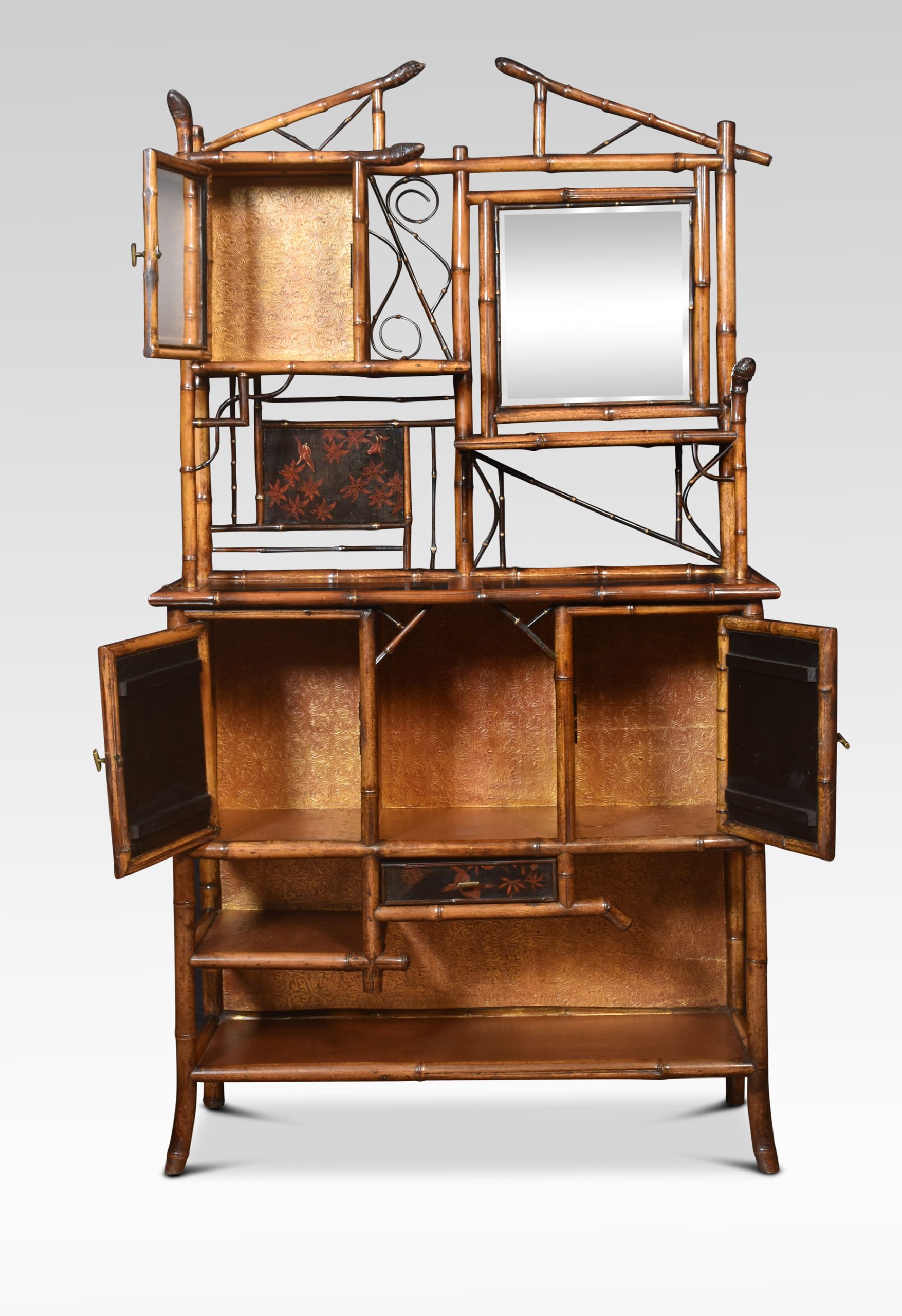 Aesthetic movement bamboo and lacquer cabinet having an openwork architectural pediment above a bevelled glass door flanked by a mirror plate.To the lower section with rectangular top and lacquered panels over a pair of frieze bone inlaid panelled doors centring an open cupboard with a shelf below. All raised up on stylised legs.