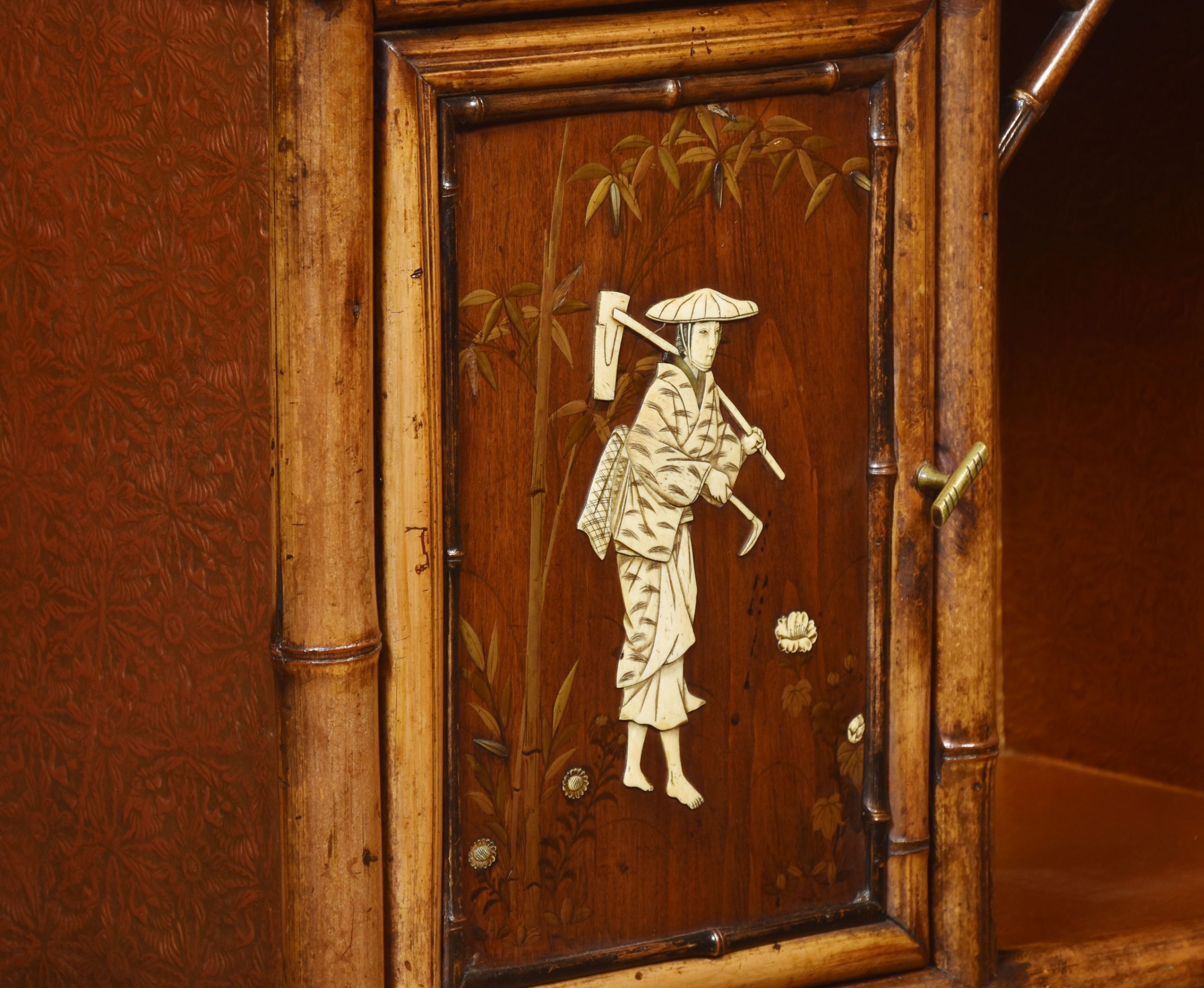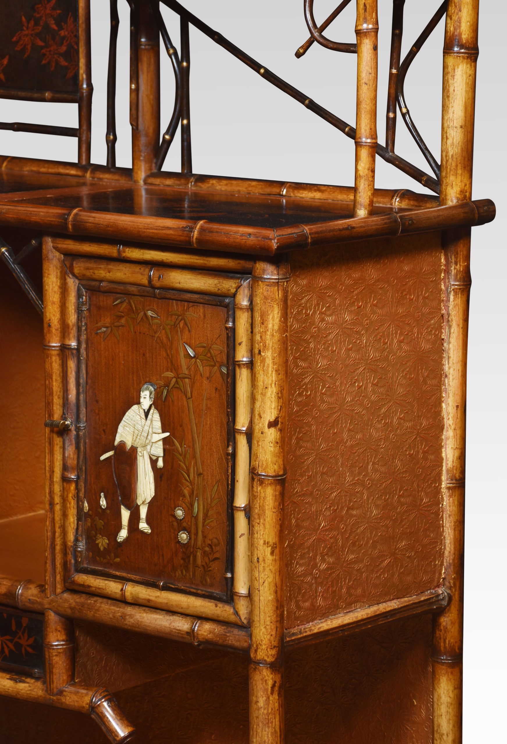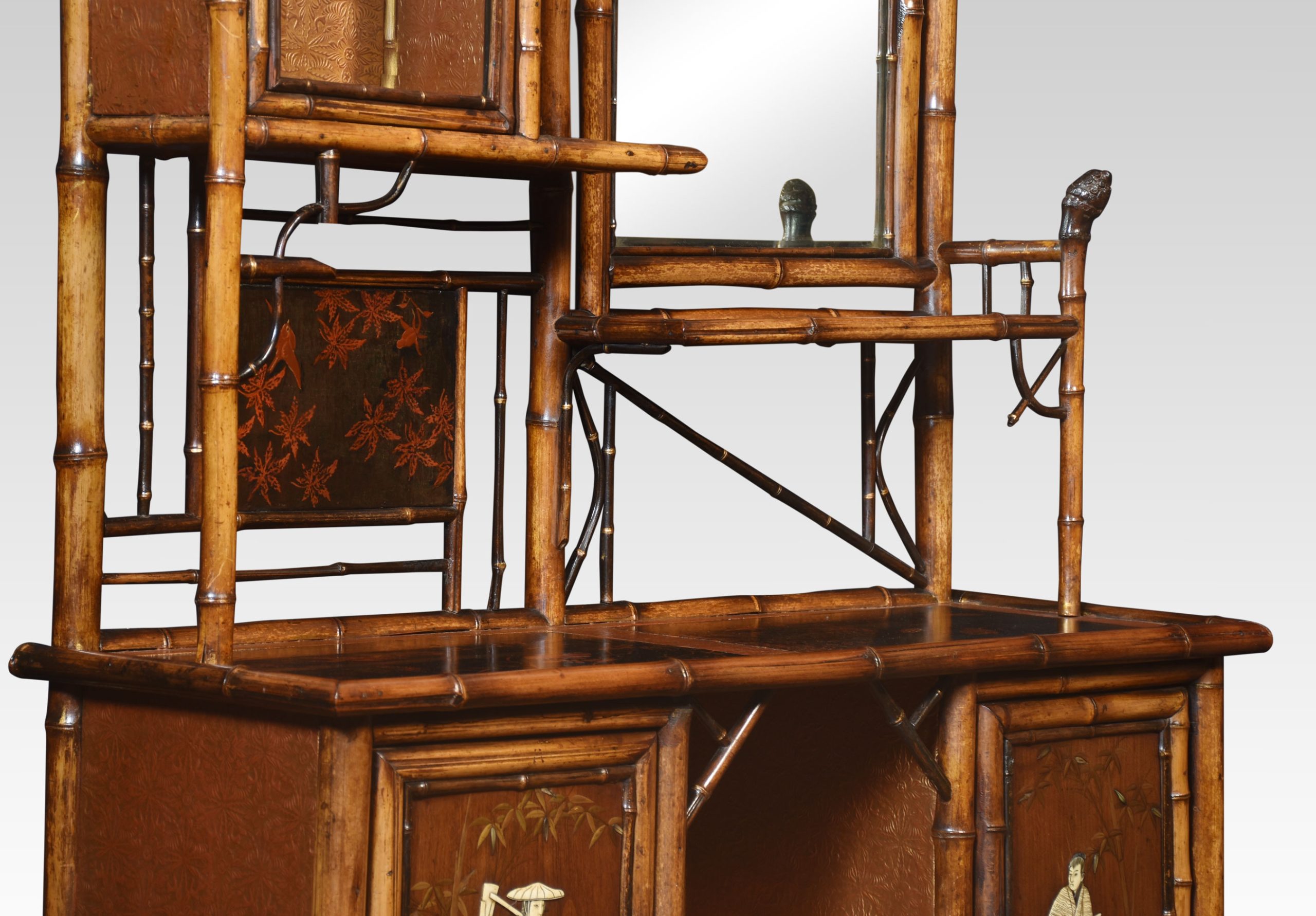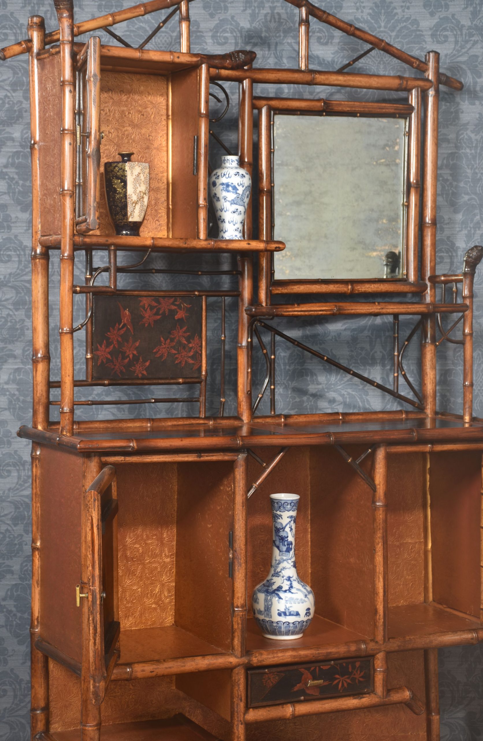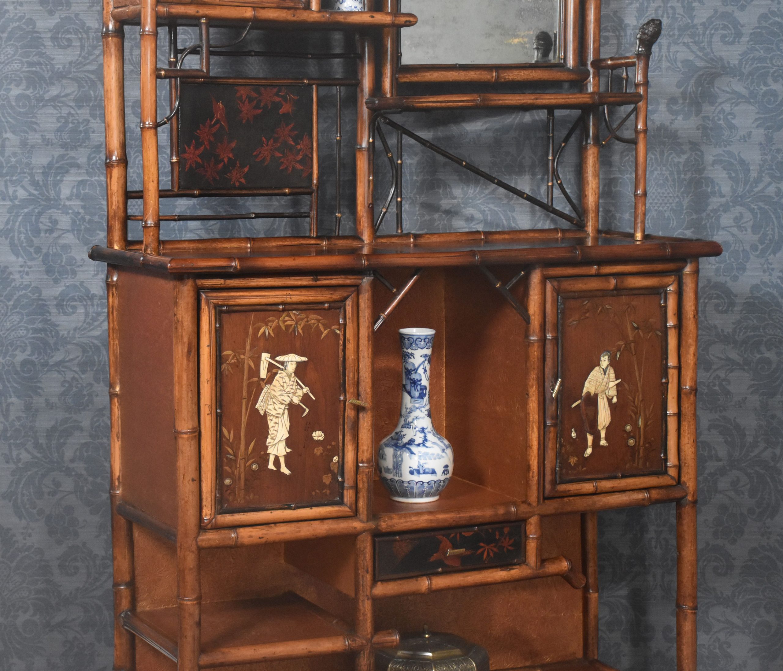 Aesthetic movement bamboo and lacquer cabinet having an openwork architectural pediment above a bevelled glass door flanked by a mirror plate.To the lower section with rectangular top and lacquered panels over a pair of frieze bone inlaid panelled doors centring an open cupboard with a shelf below. All raised up on stylised legs.