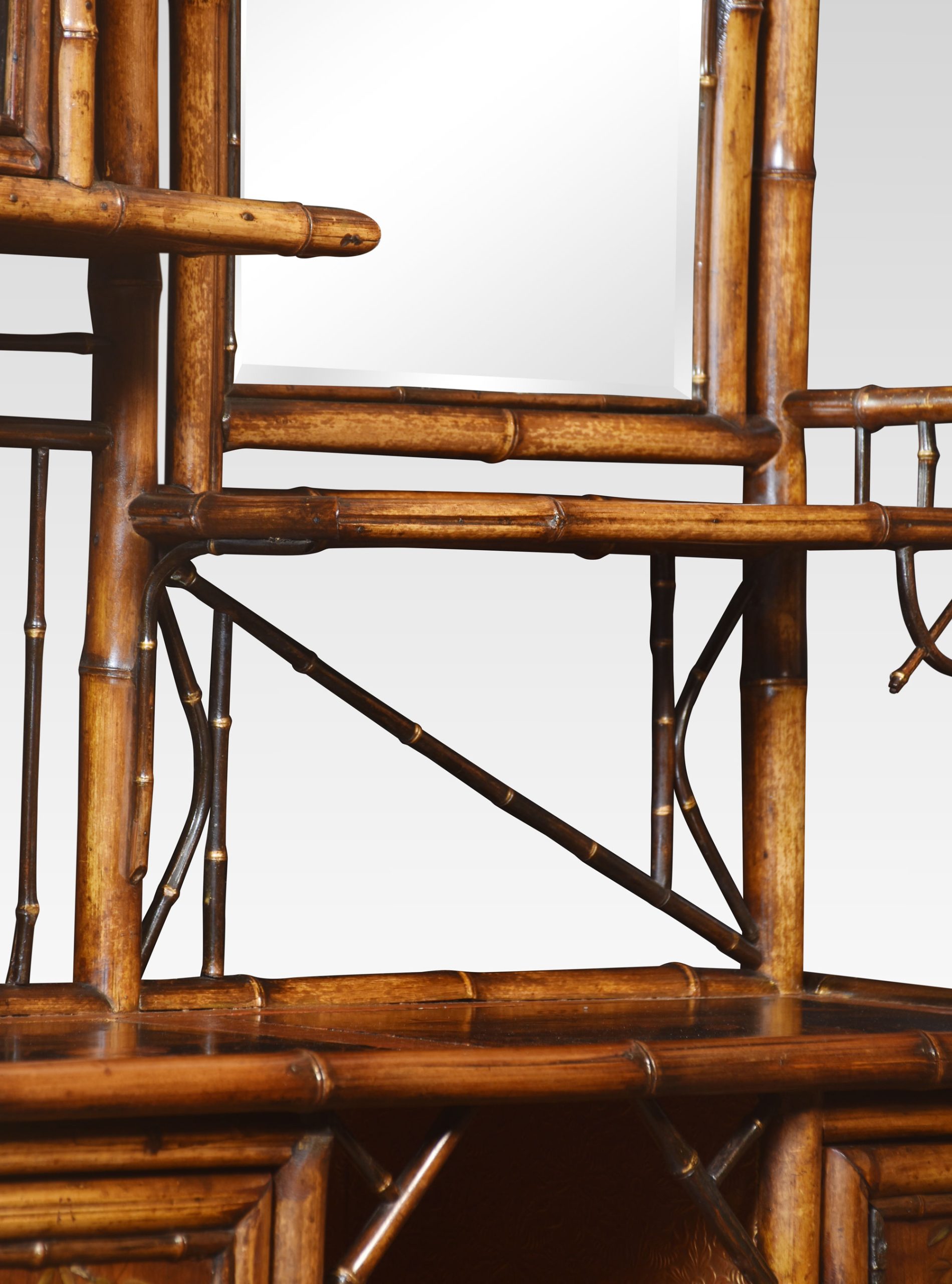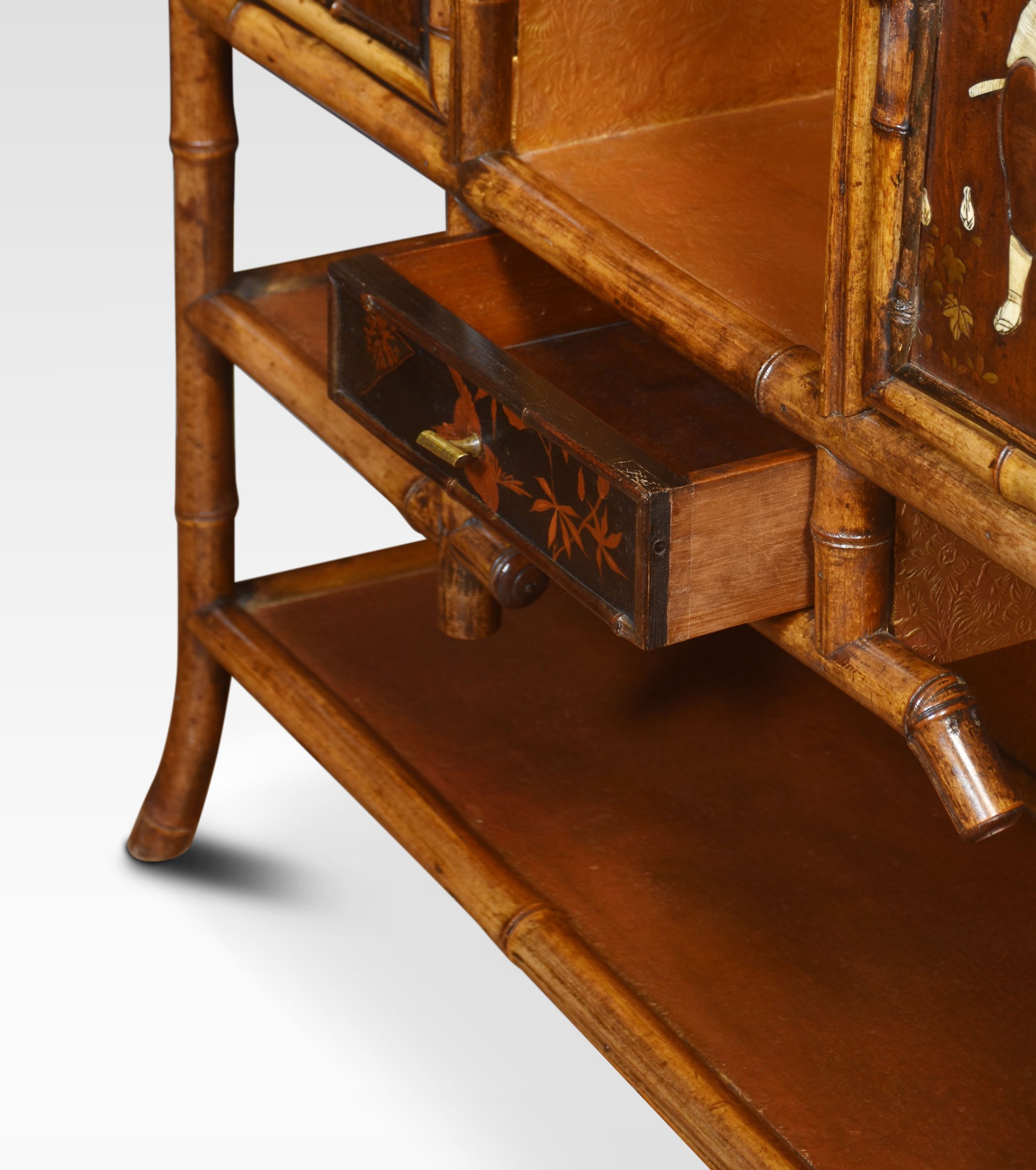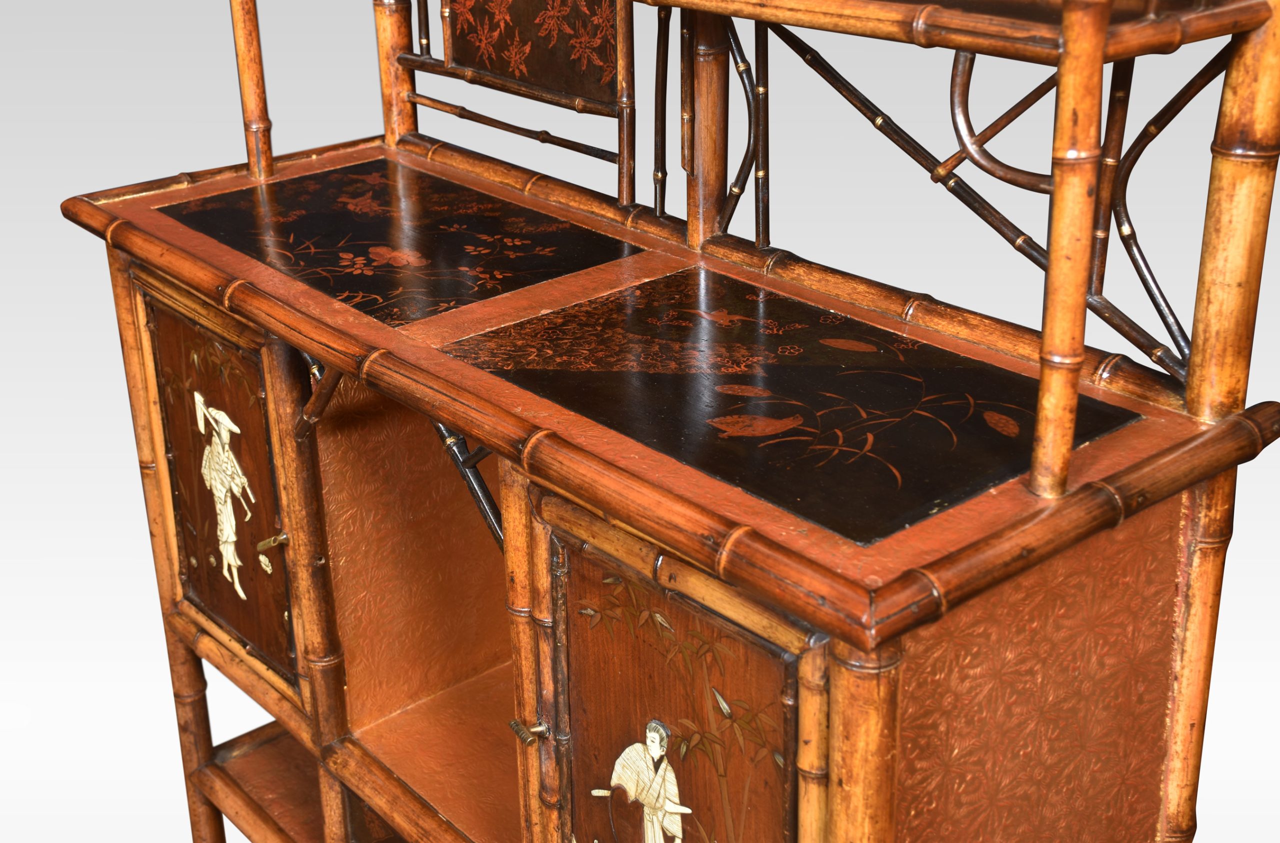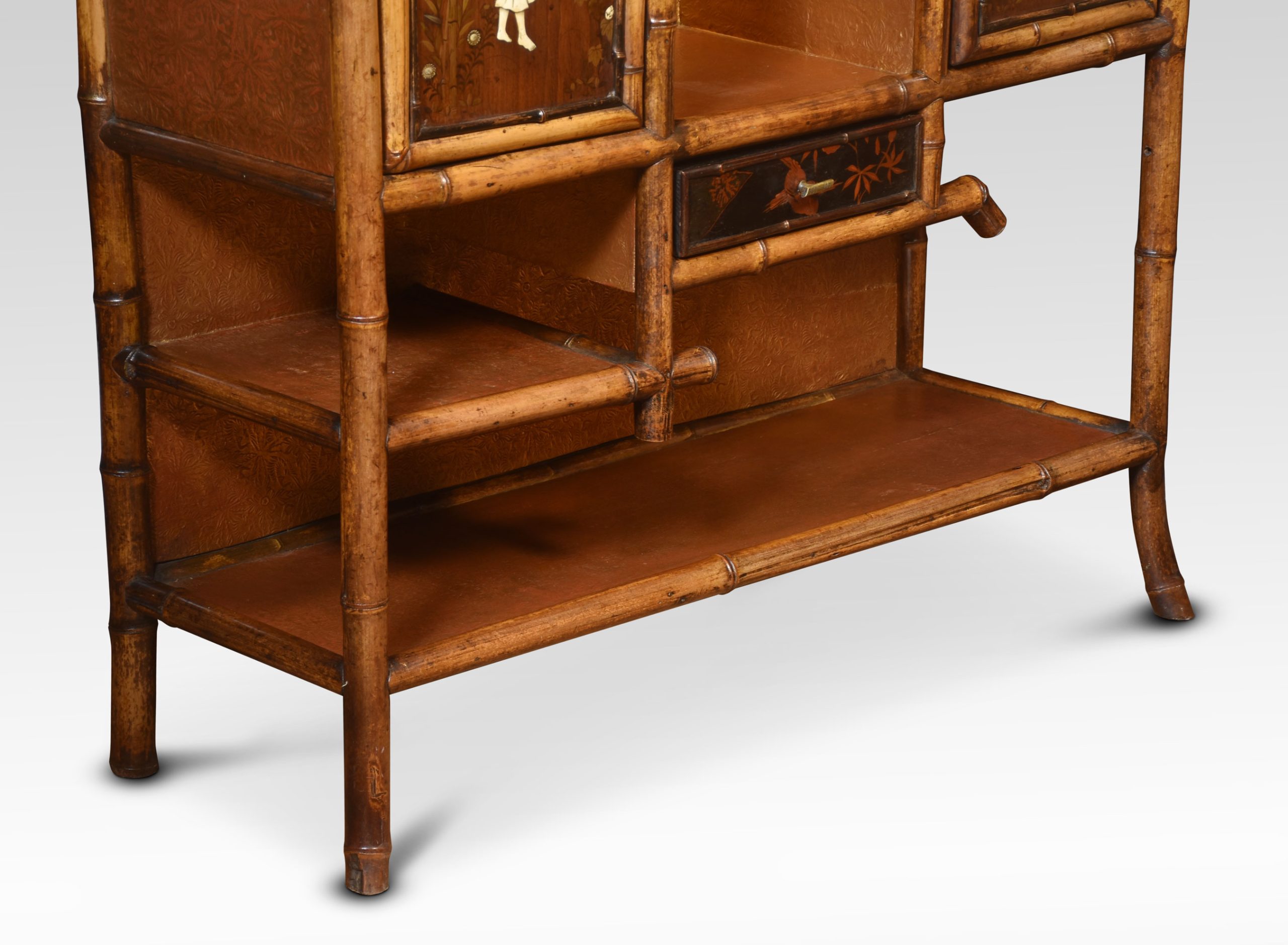 Aesthetic movement bamboo and lacquer cabinet having an openwork architectural pediment above a bevelled glass door flanked by a mirror plate.To the lower section with rectangular top and lacquered panels over a pair of frieze bone inlaid panelled doors centring an open cupboard with a shelf below. All raised up on stylised legs.