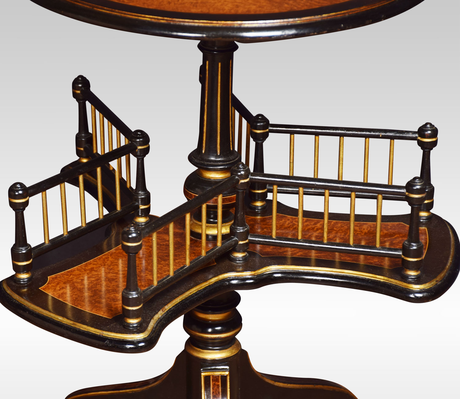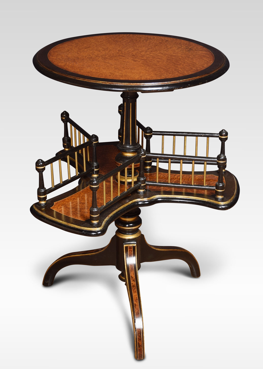 19th century amboyna book table, the round top with ebony moulded edge above a shaped under tier with a gilded spindle gallery. All raised up on a down swept legs.