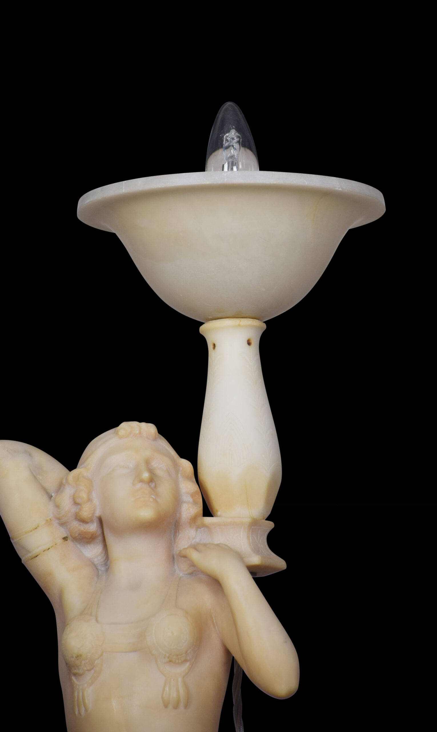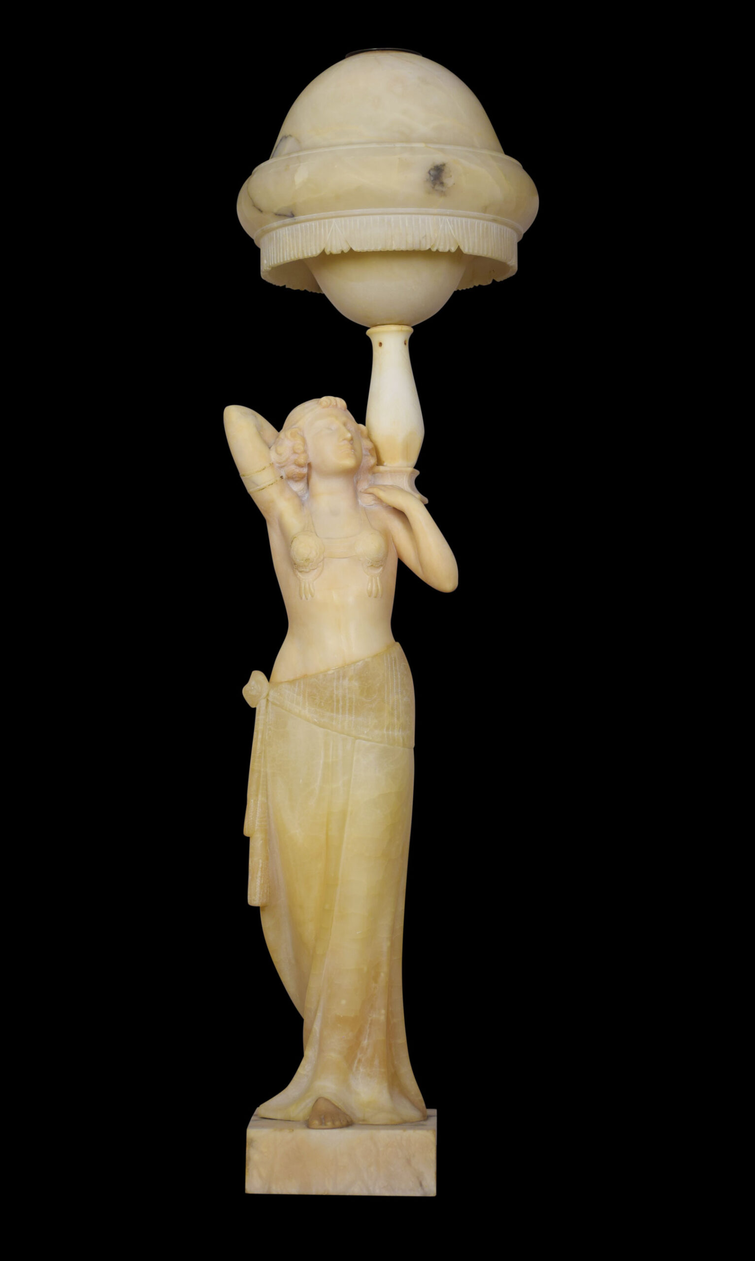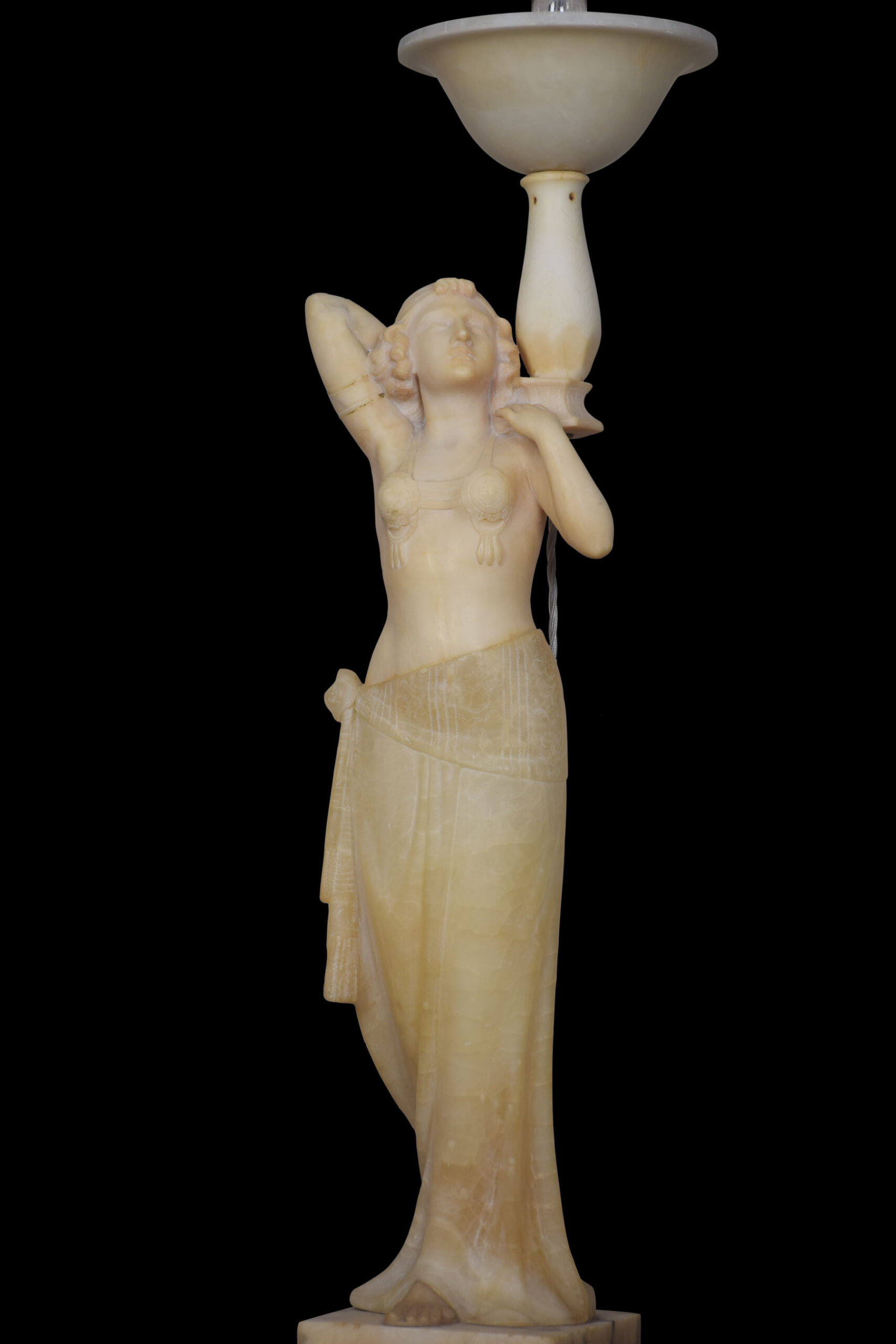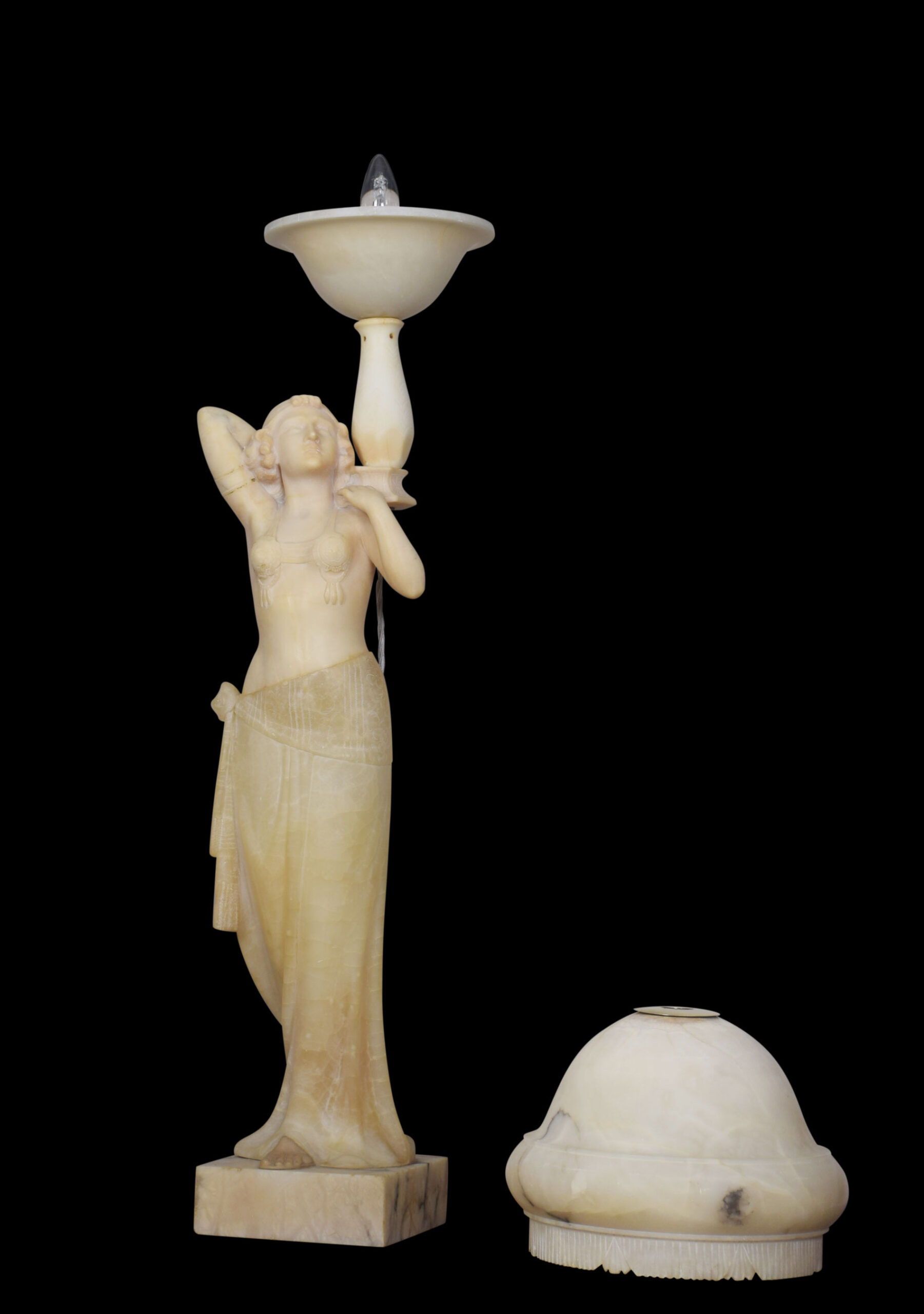 Art Deco alabaster figural lamp modelled as an Egyptian revival dancing girl having arms raised below the bowl-shaped shade. The lamp has been rewired.