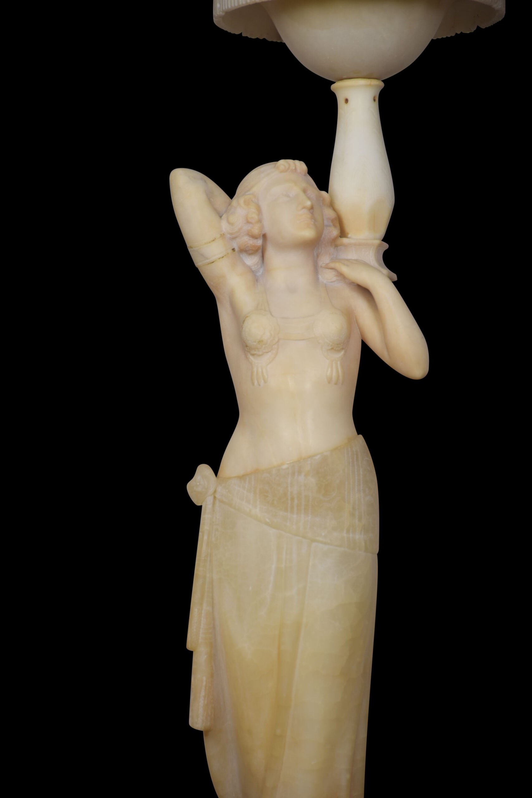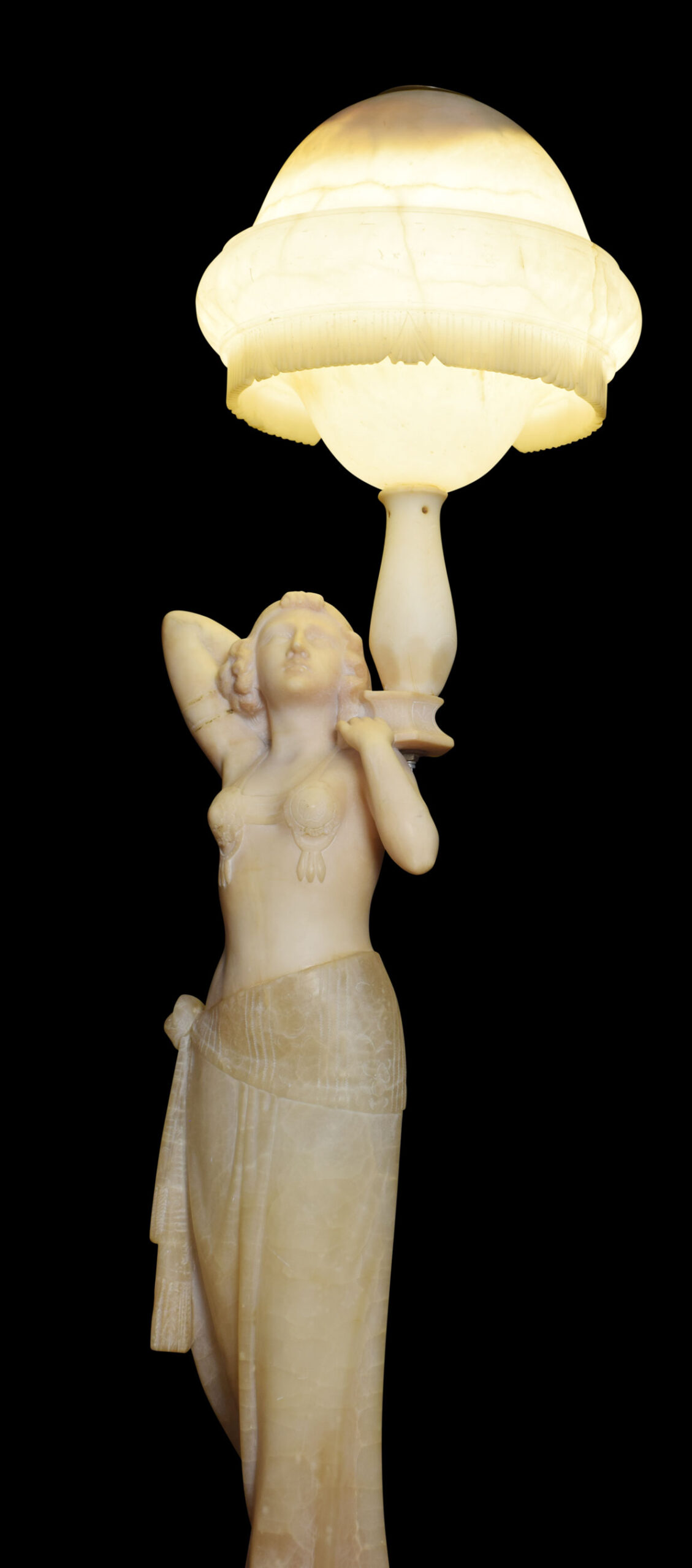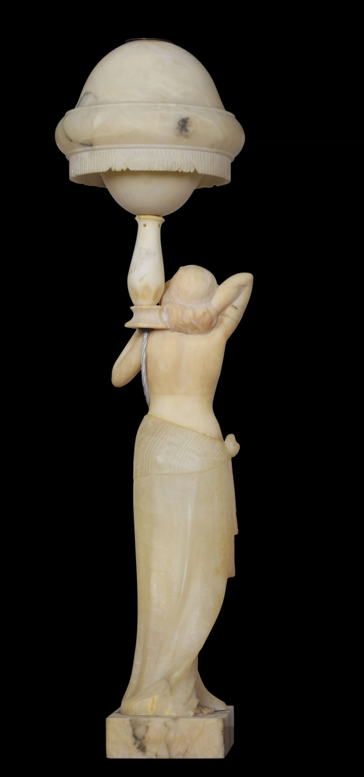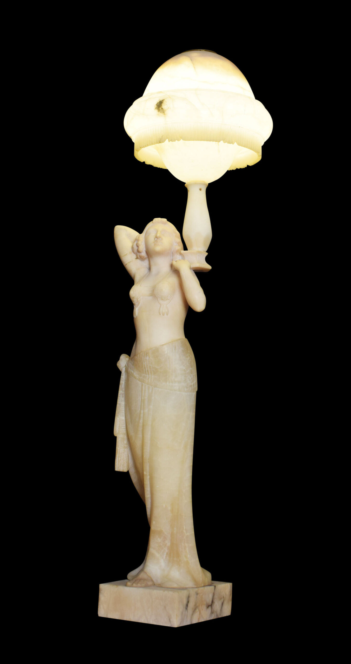 Art Deco alabaster figural lamp modelled as an Egyptian revival dancing girl having arms raised below the bowl-shaped shade. The lamp has been rewired.